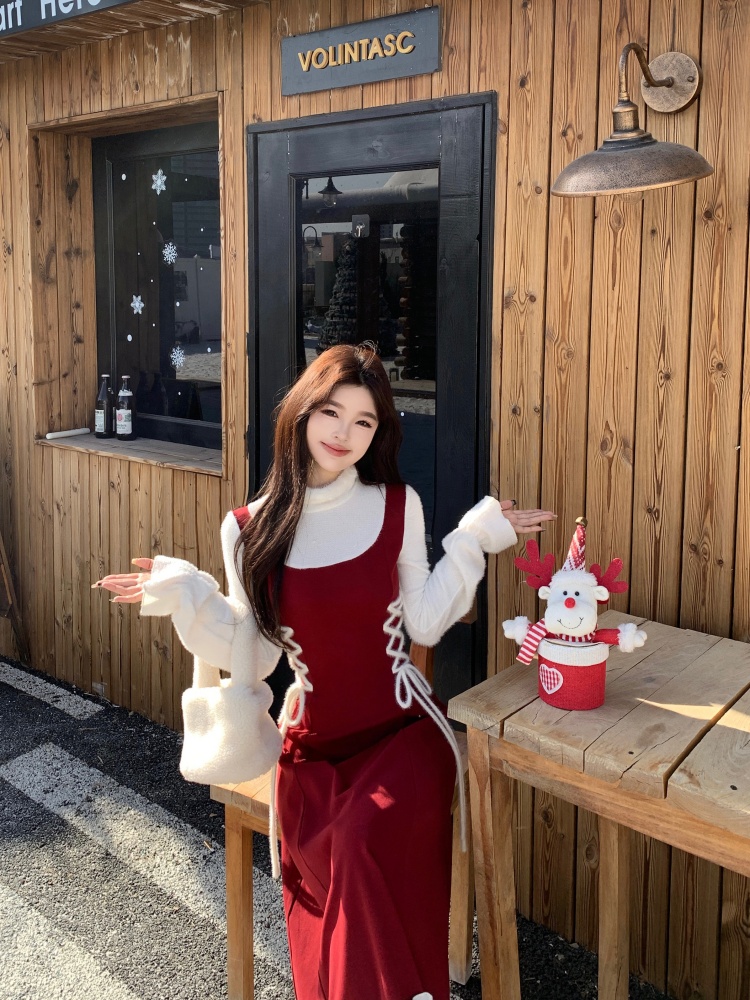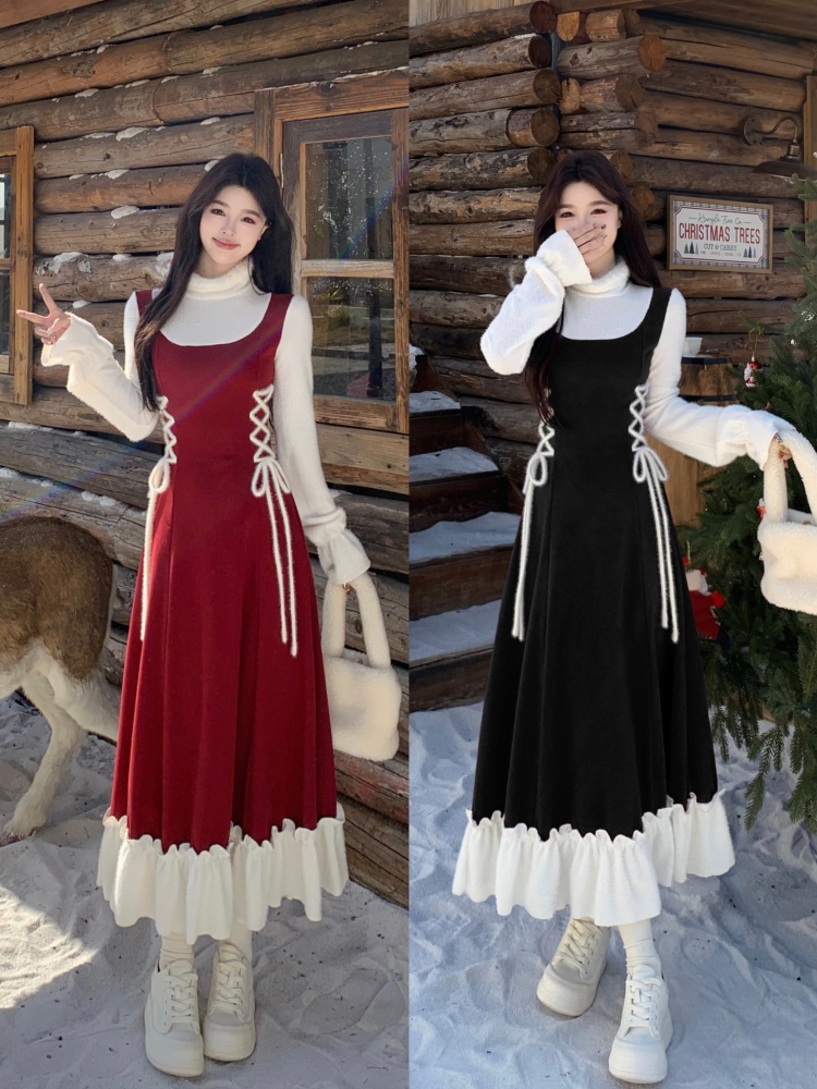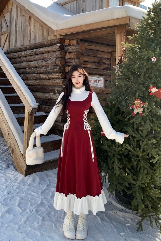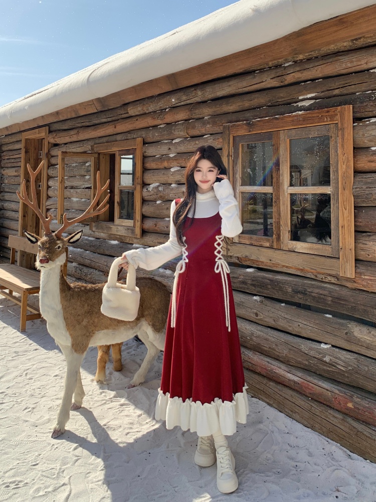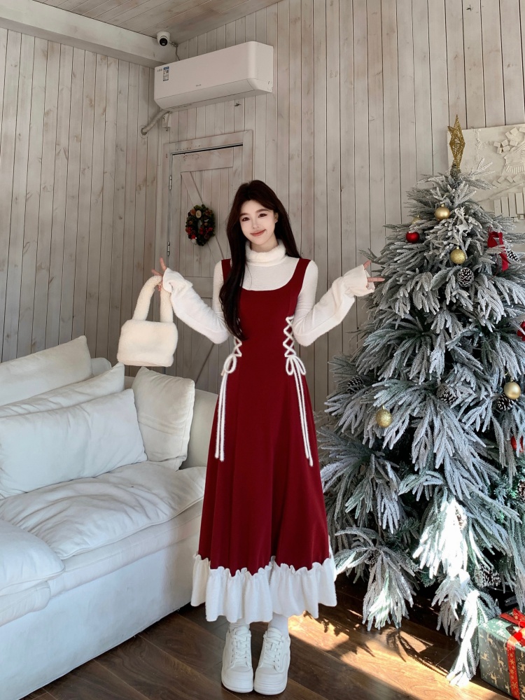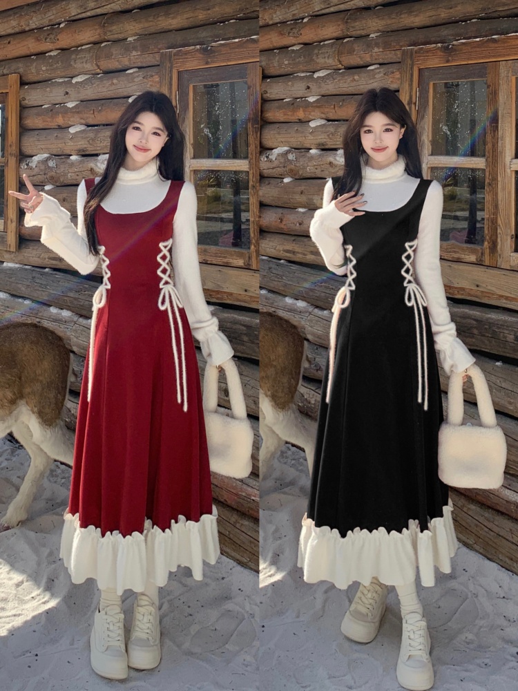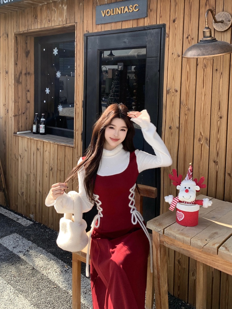 MY16030# 学院风红白撞色新款长袖连衣裙磨毛针织弹力收腰显瘦裙子女裝貨源服裝批發
