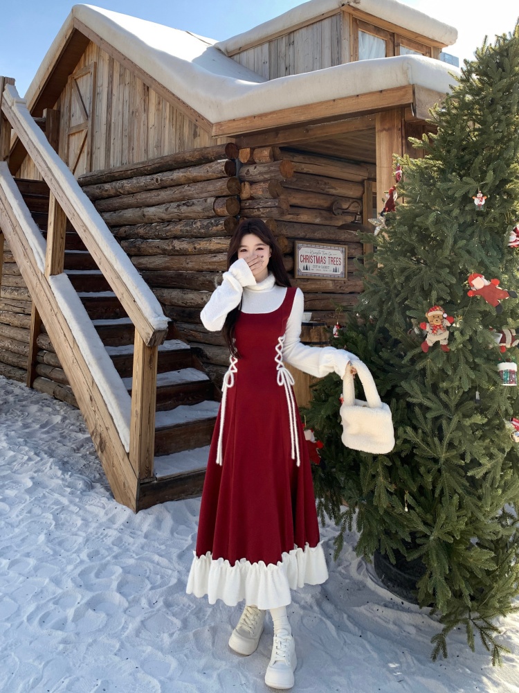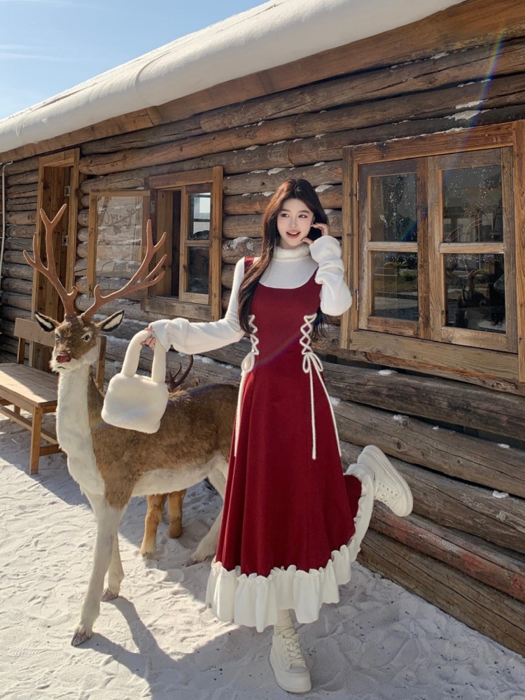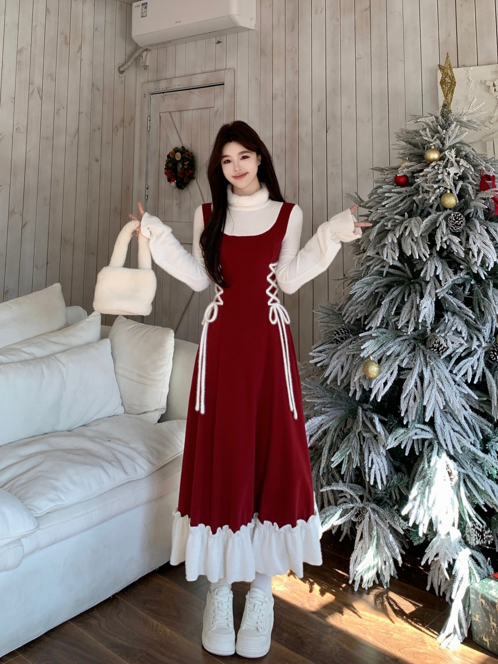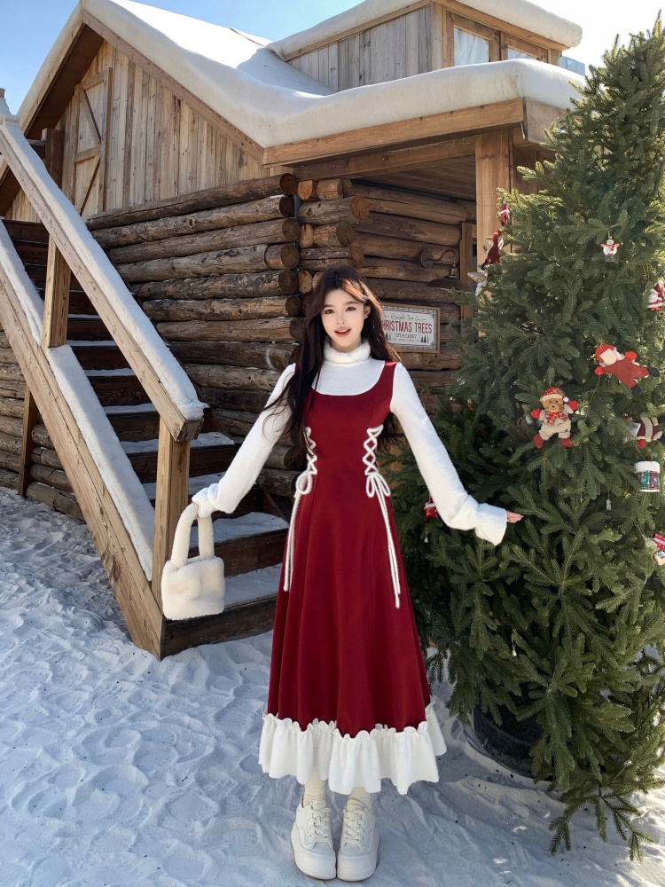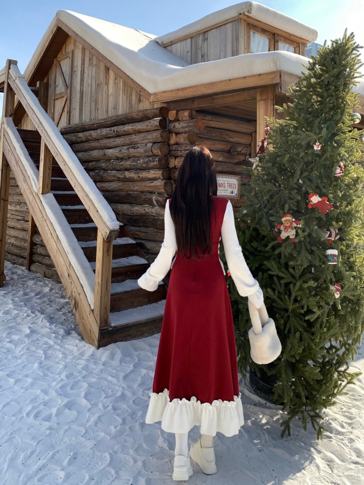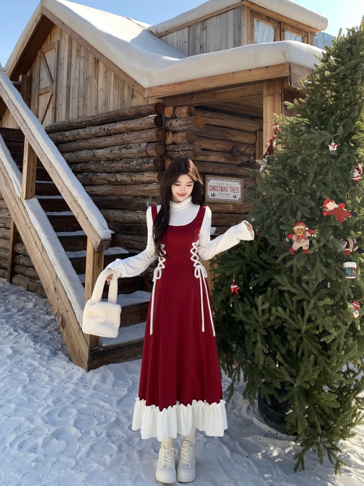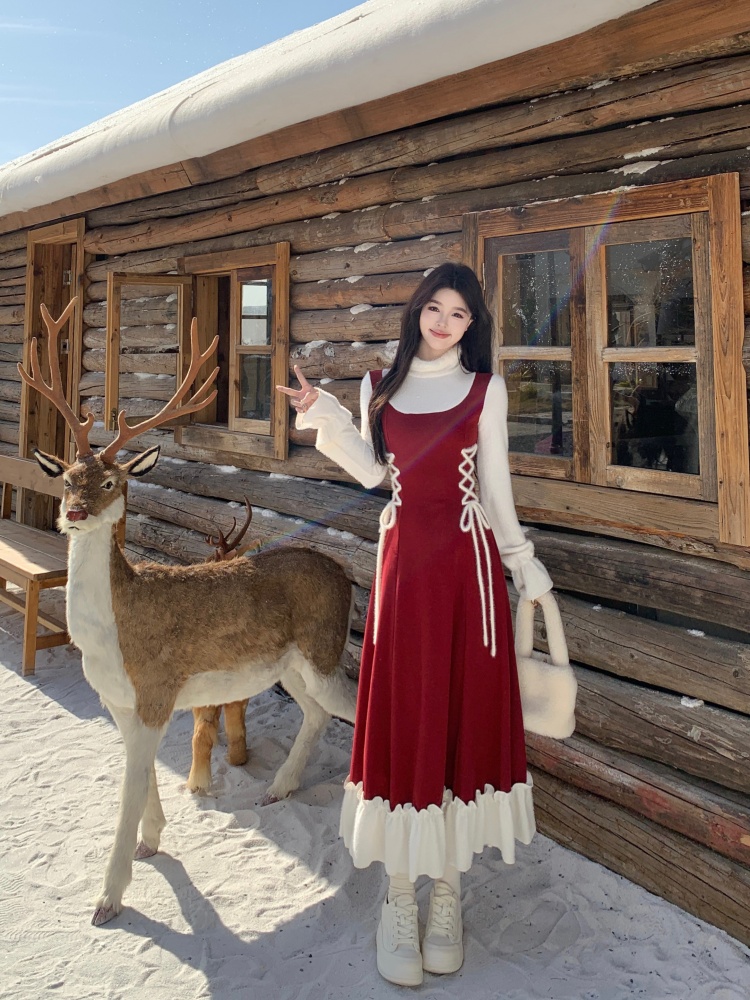 MY16030# 学院风红白撞色新款长袖连衣裙磨毛针织弹力收腰显瘦裙子女裝貨源服裝批發