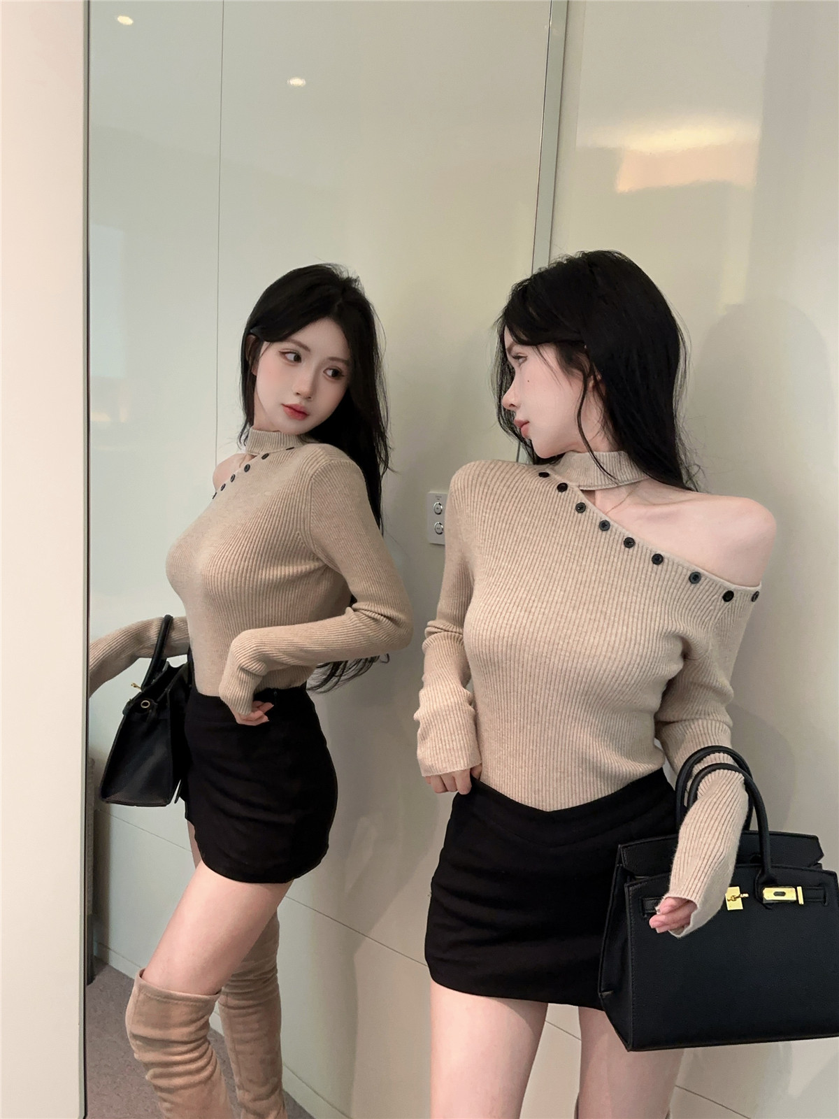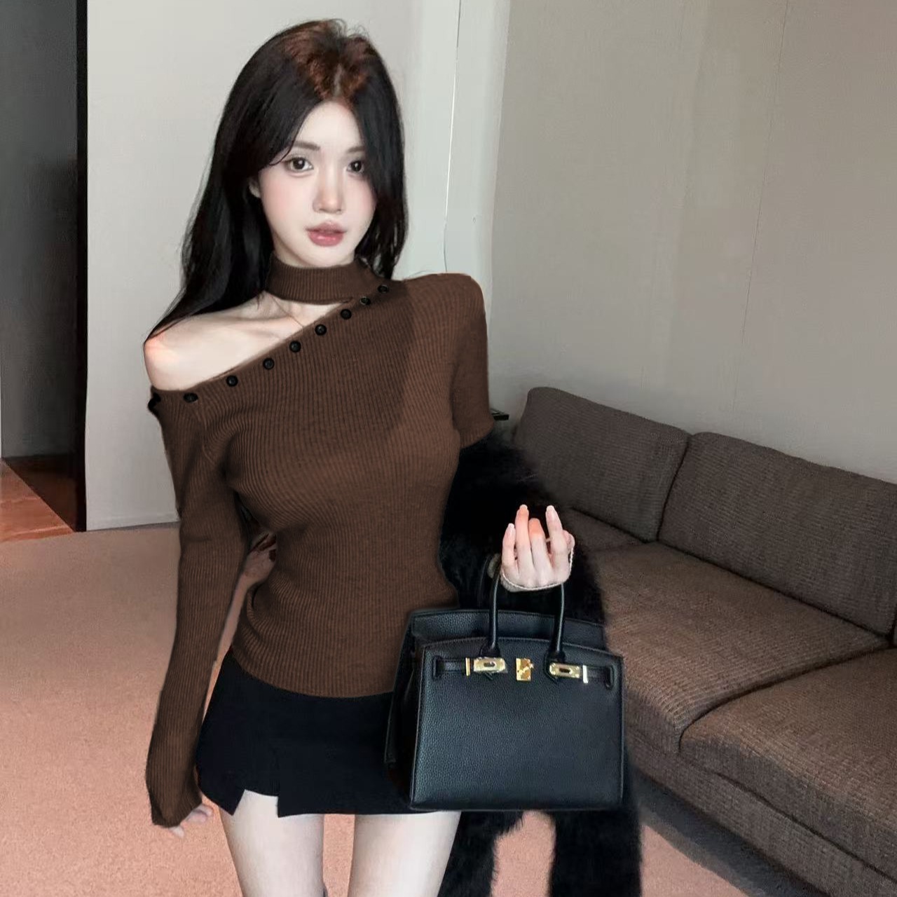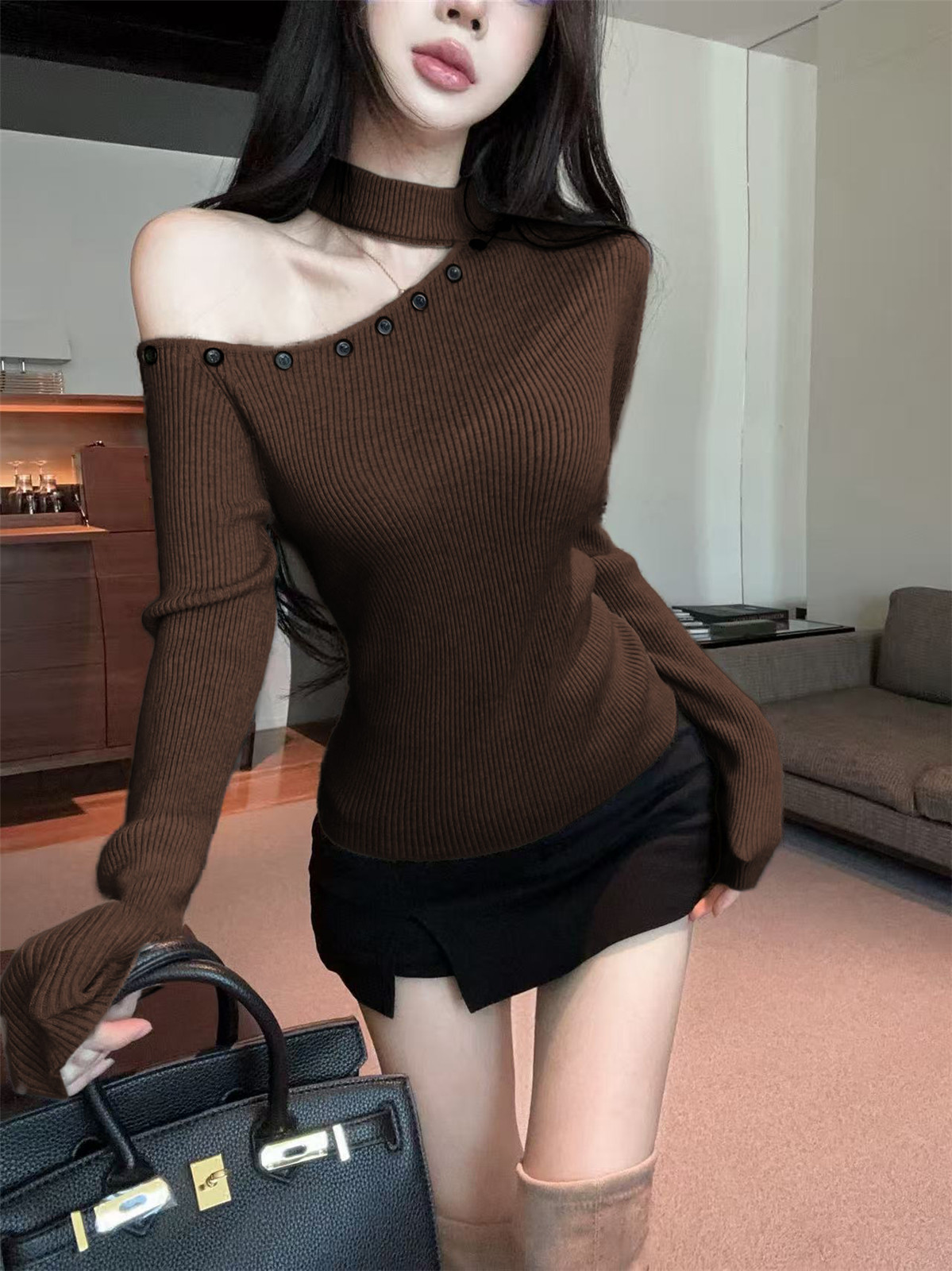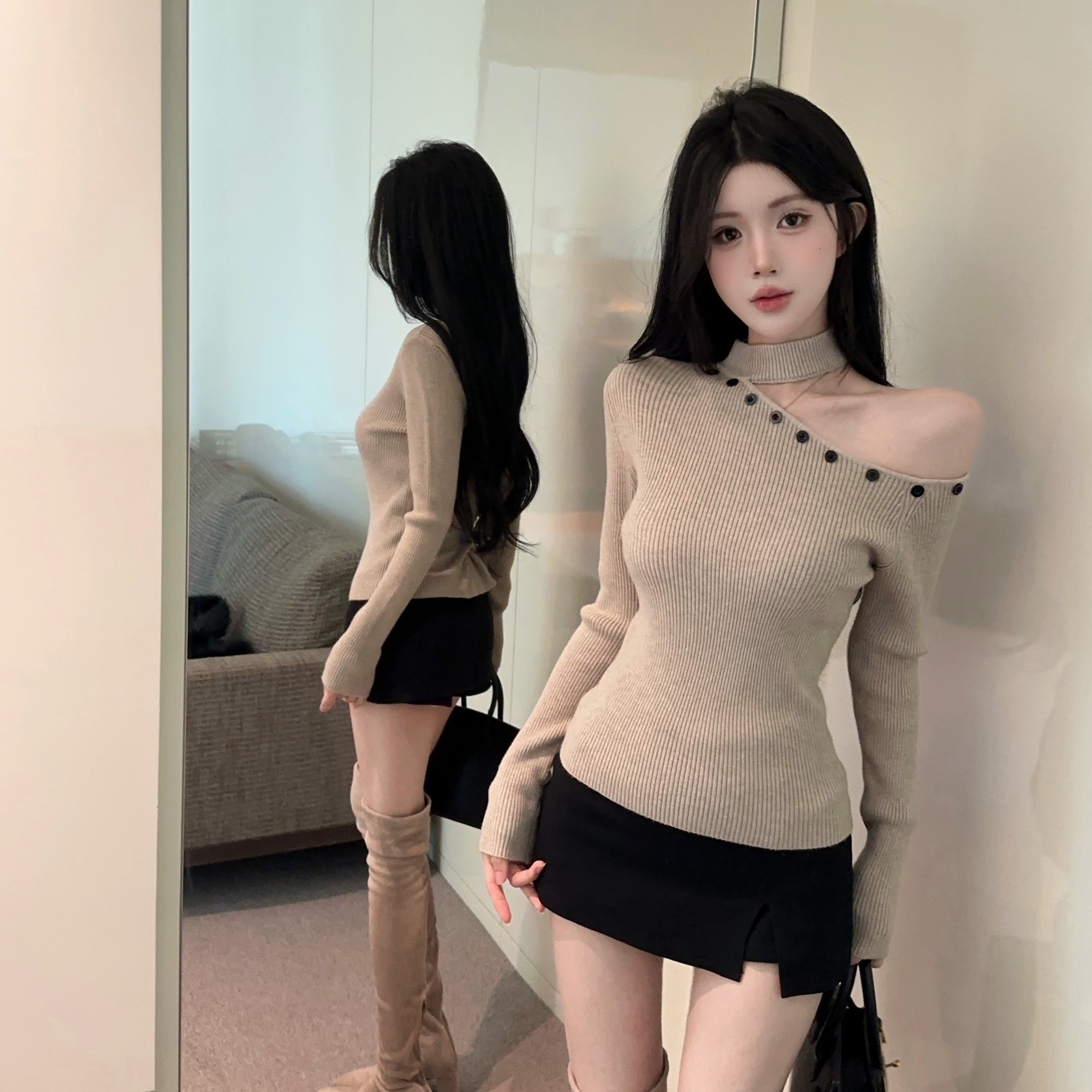 MY16032# 设计感挂脖镂空针织衫斜肩修身长袖上衣别致半高领打底衫女裝貨源服裝批發