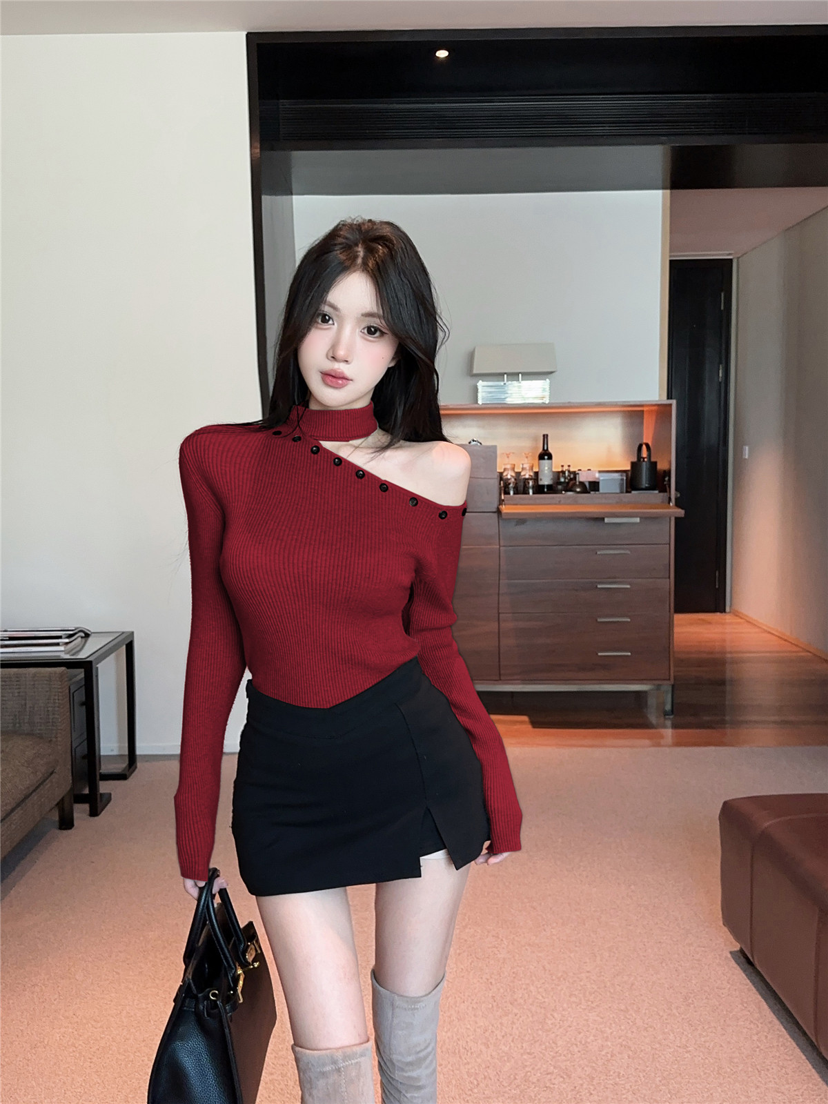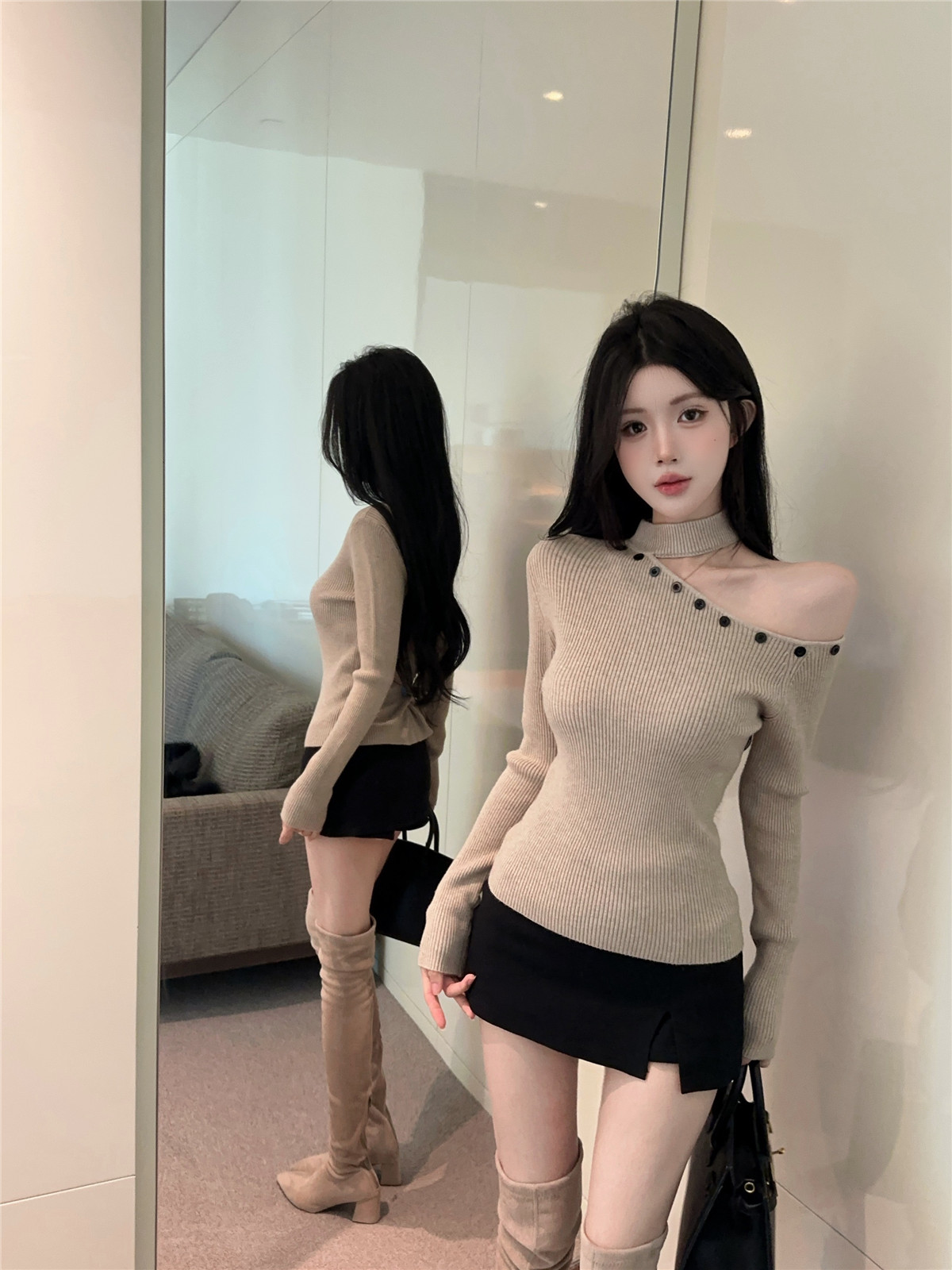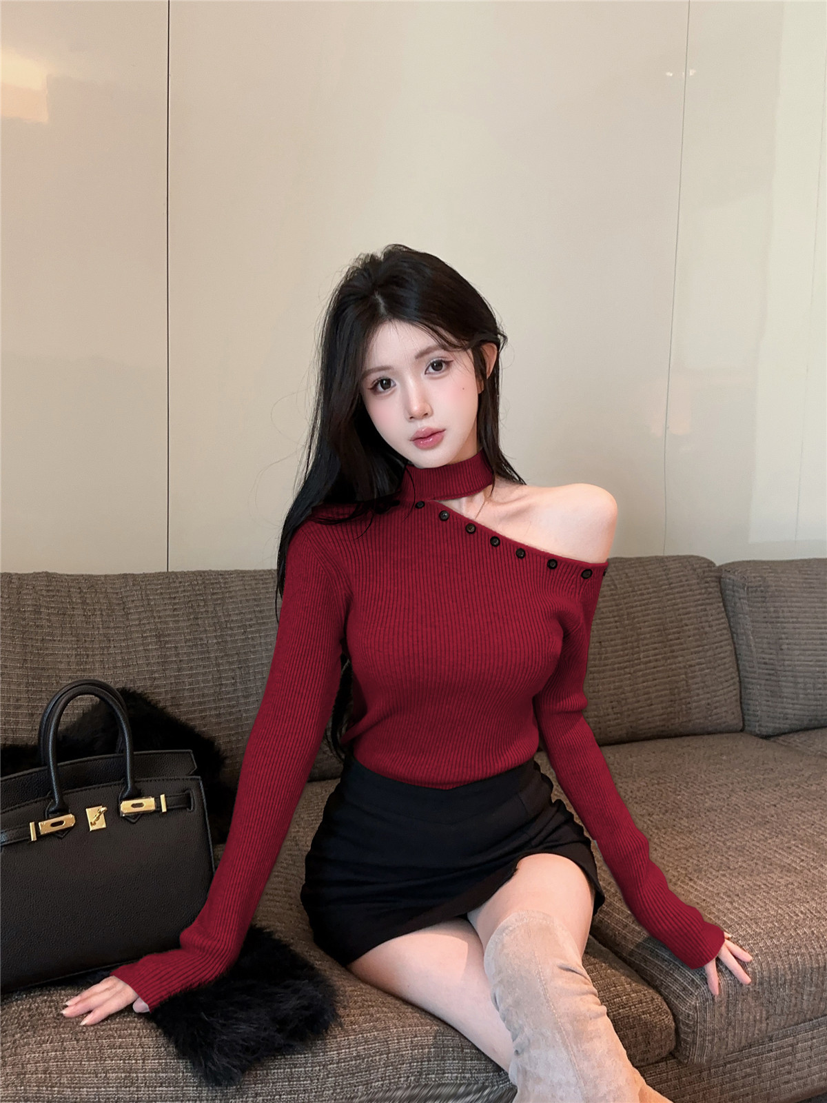 MY16032# 设计感挂脖镂空针织衫斜肩修身长袖上衣别致半高领打底衫女裝貨源服裝批發
