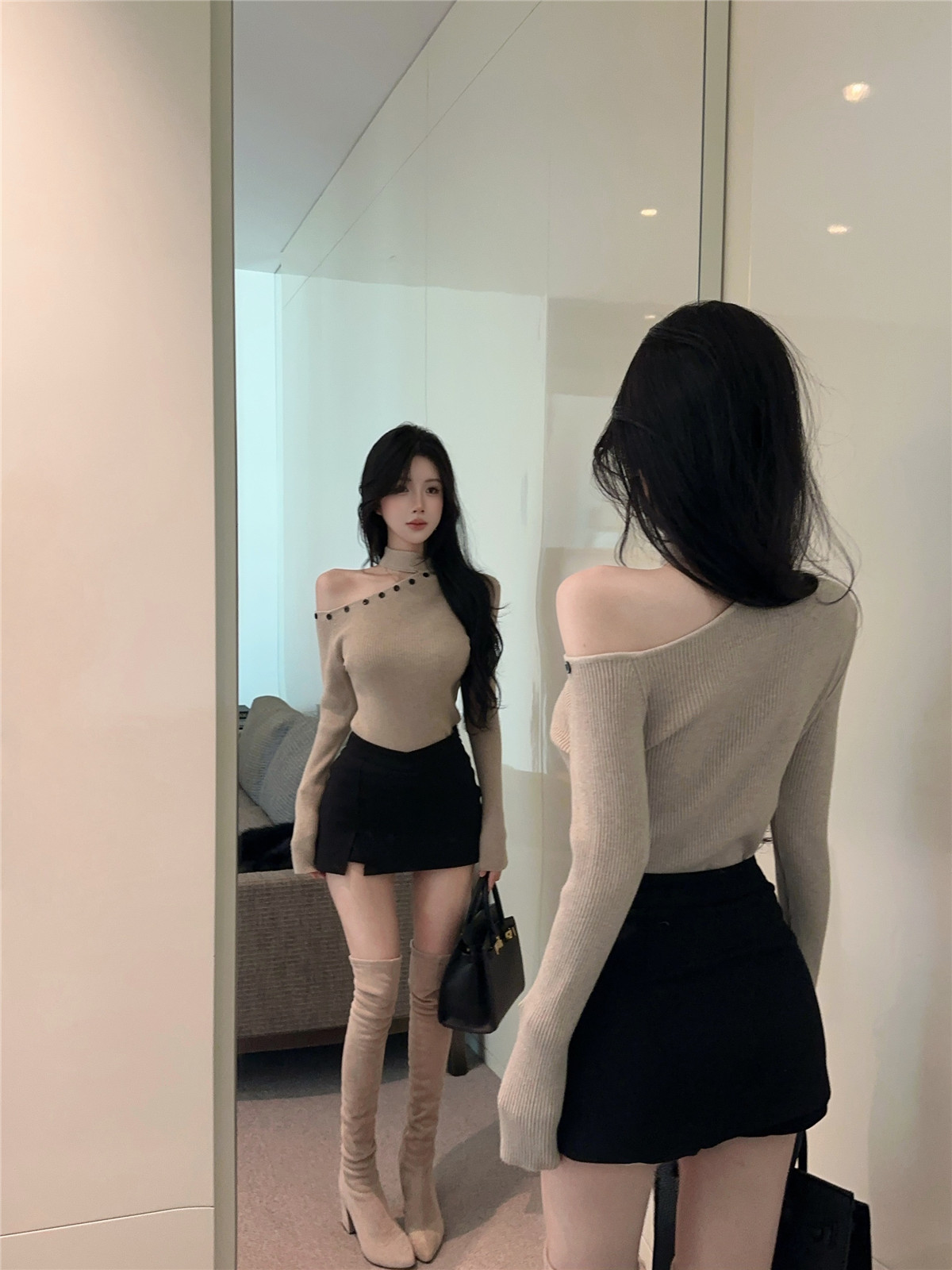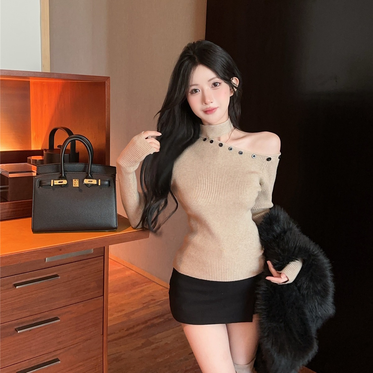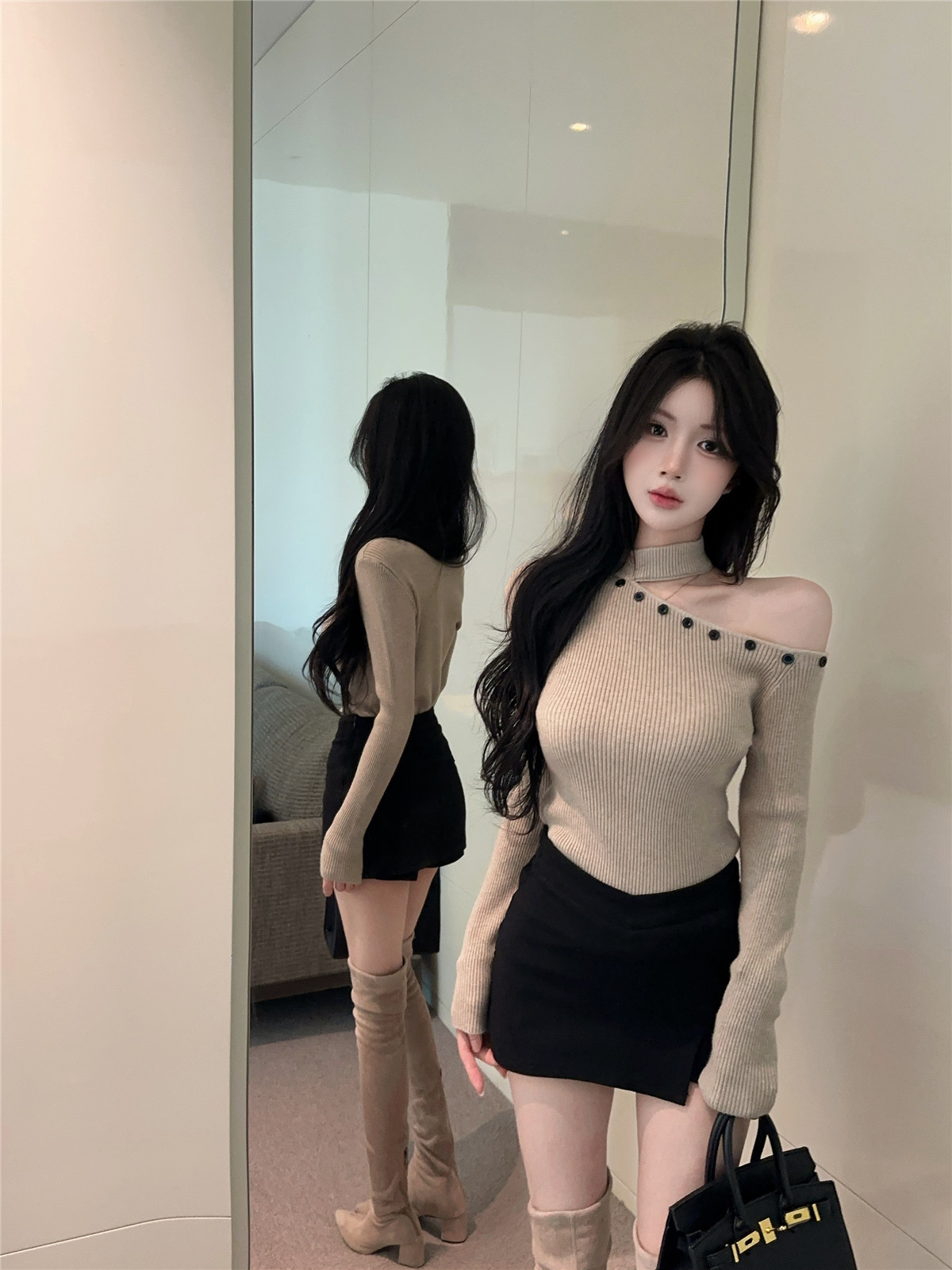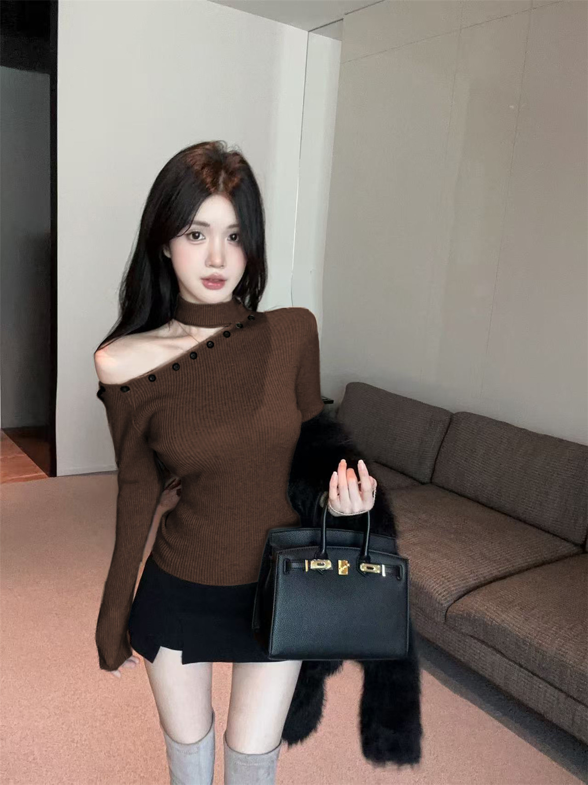 MY16032# 设计感挂脖镂空针织衫斜肩修身长袖上衣别致半高领打底衫女裝貨源服裝批發
