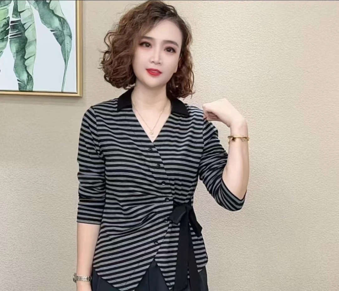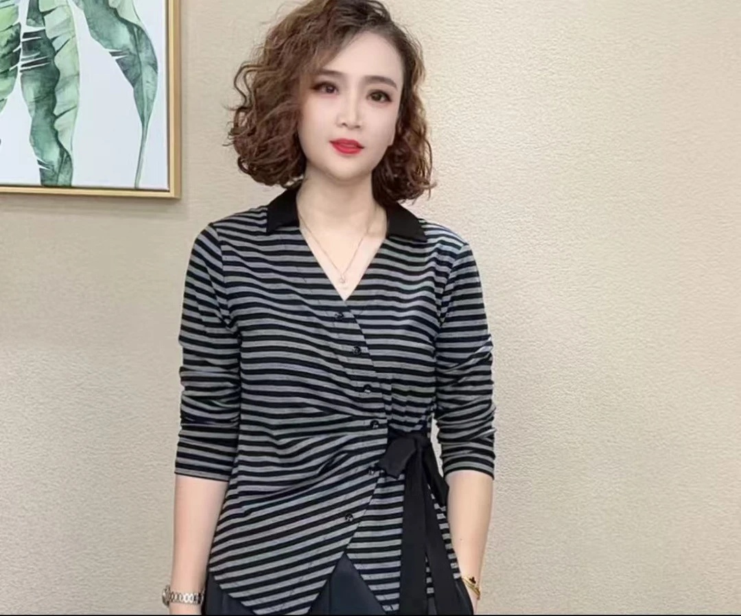 MY16071#时尚洋气百搭减龄显瘦秋款长袖条纹女气质上衣女裝貨源服裝批發