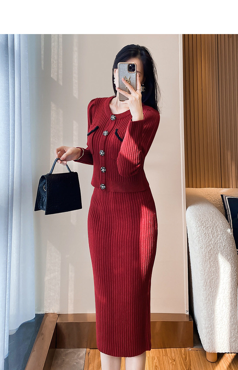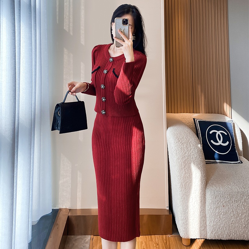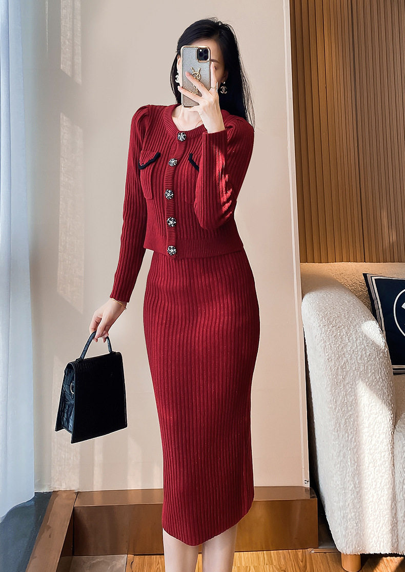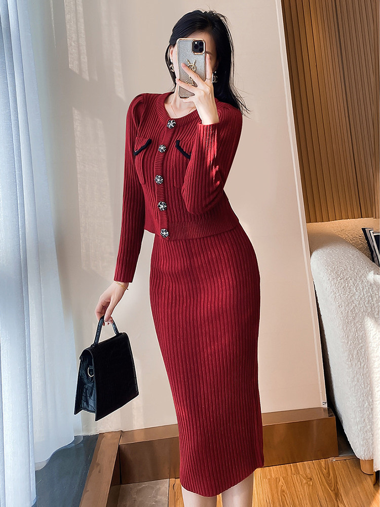 MY16076# 韩国回门敬酒红色毛衣两件套外穿打底针织开衫包裙半身裙套装女裝貨源服裝批發