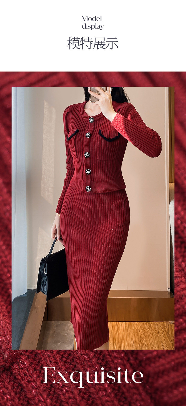 红色两件套:长袖开衫+半身裙