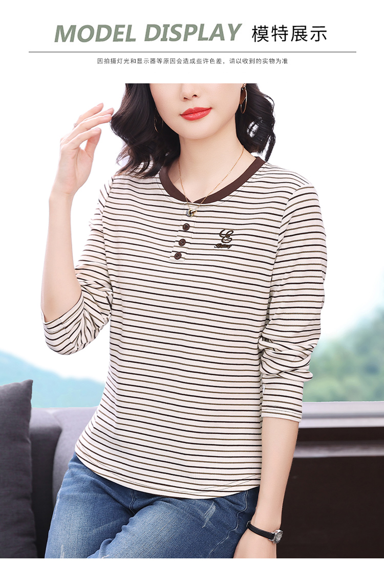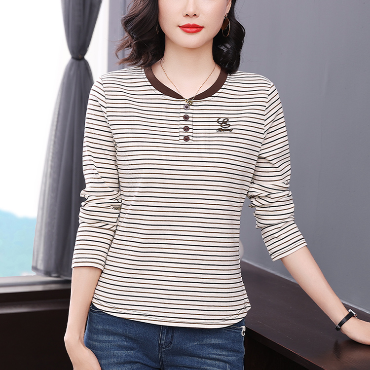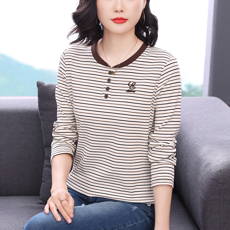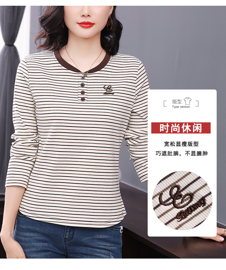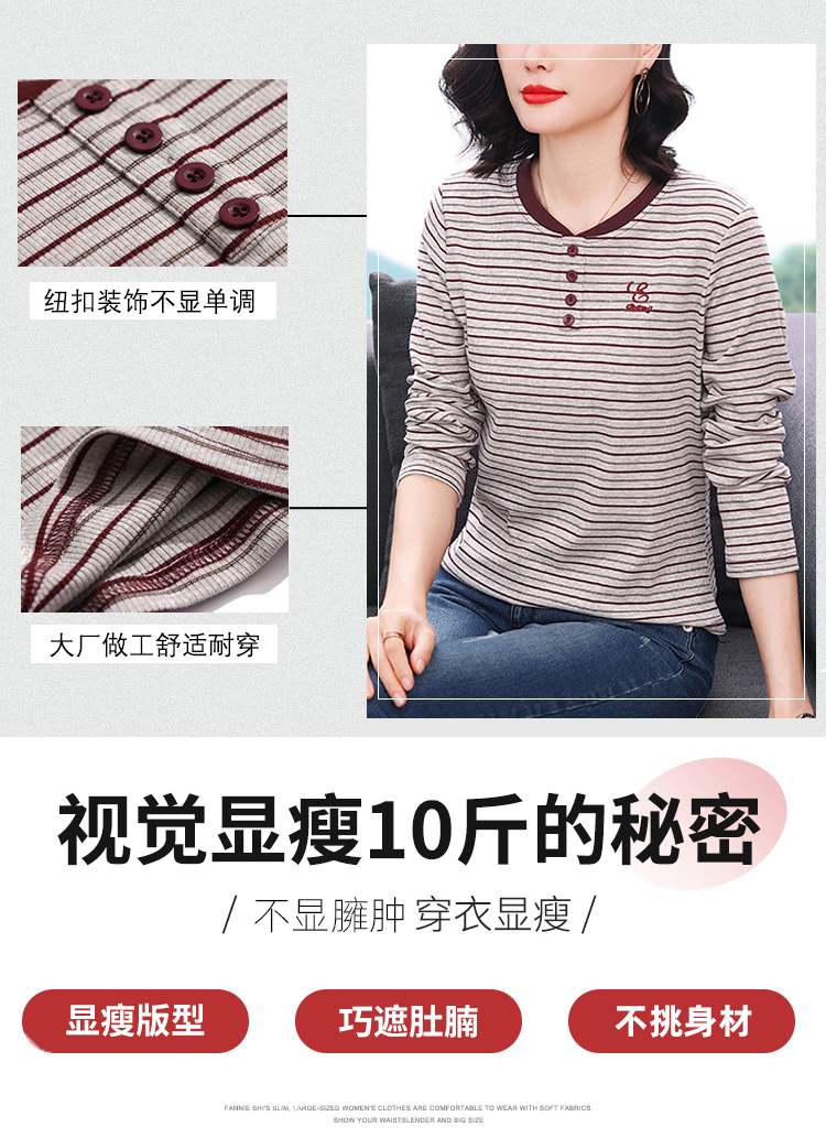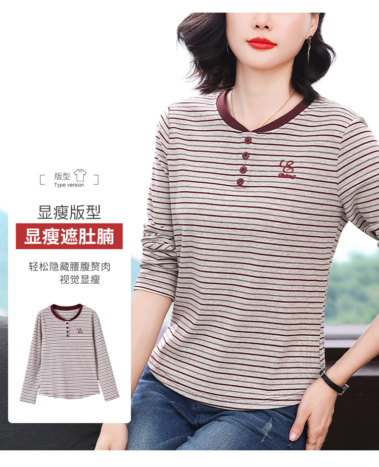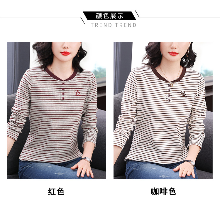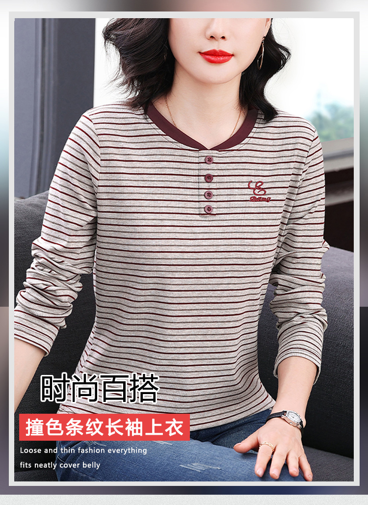 MY16097# 新款女士中年长袖休闲纯棉洋气拼接刺绣时尚撞色条纹T恤女裝貨源服裝批發