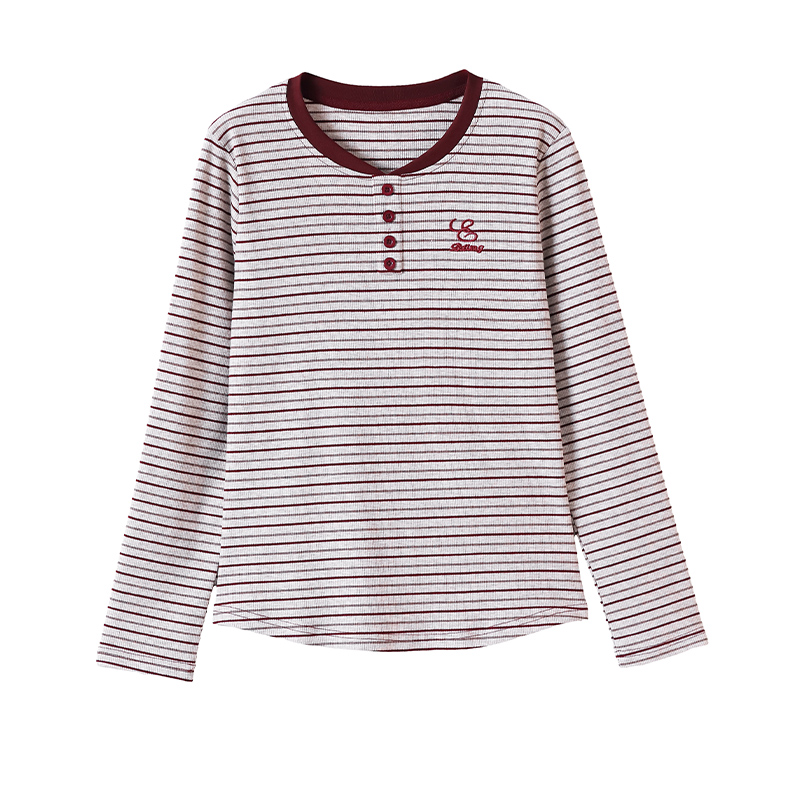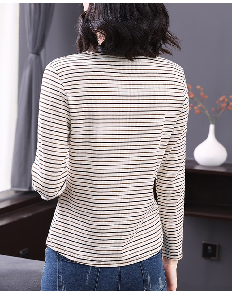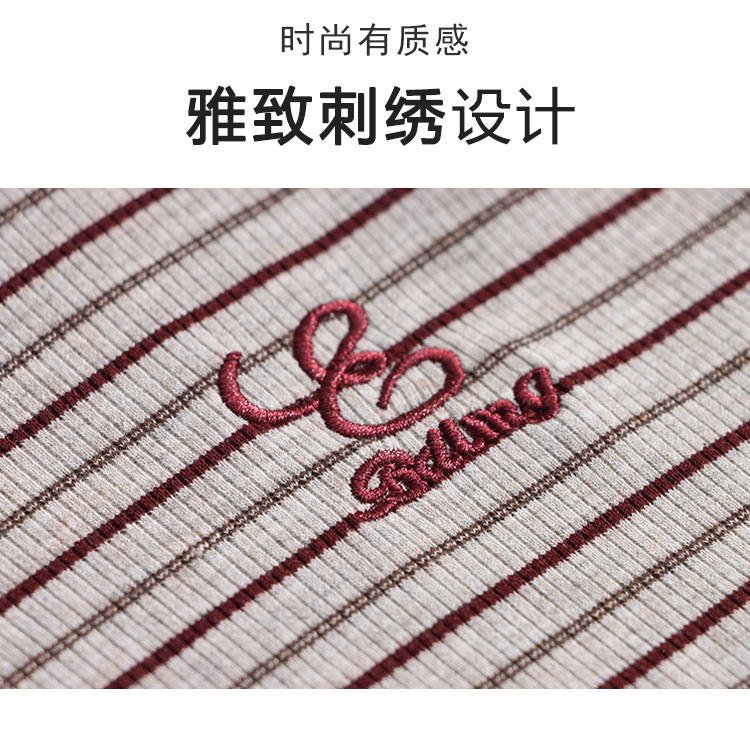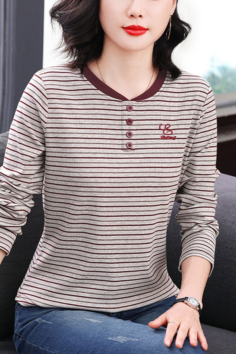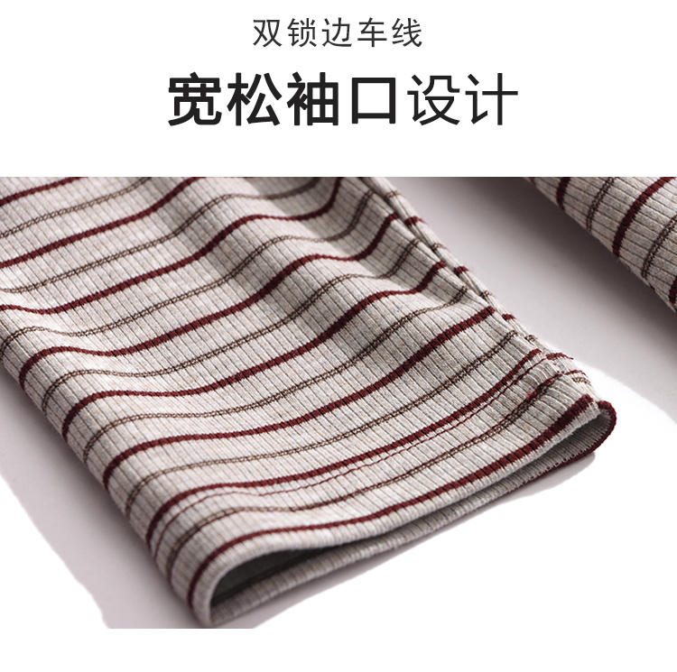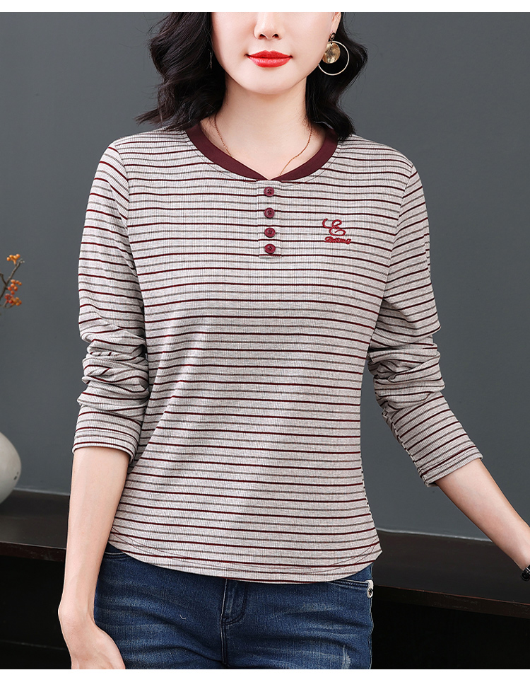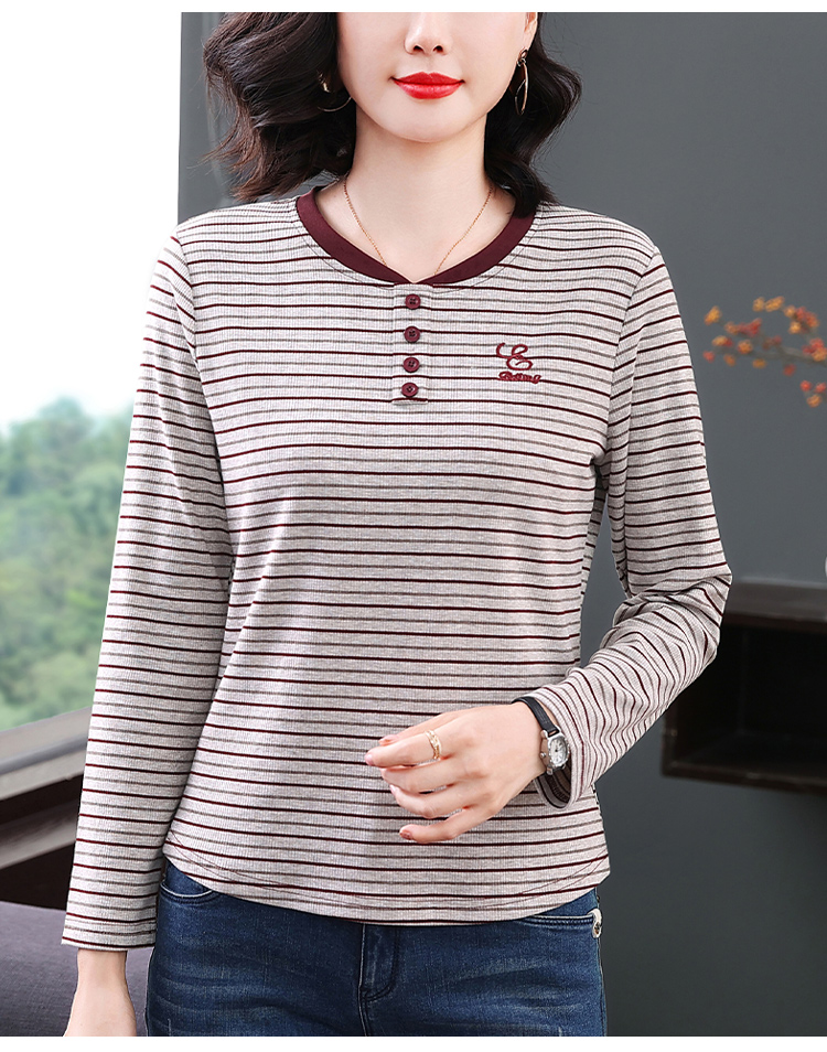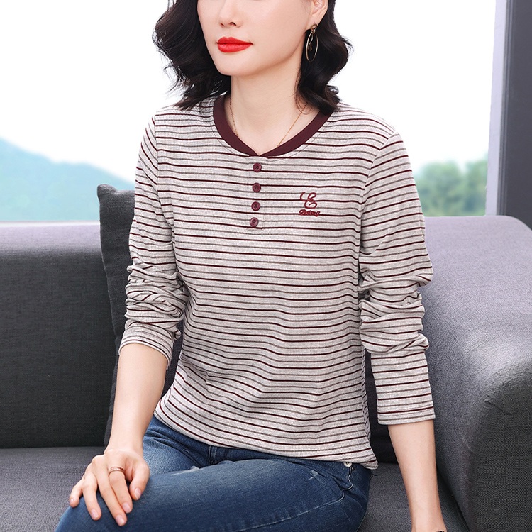 MY16097# 新款女士中年长袖休闲纯棉洋气拼接刺绣时尚撞色条纹T恤女裝貨源服裝批發