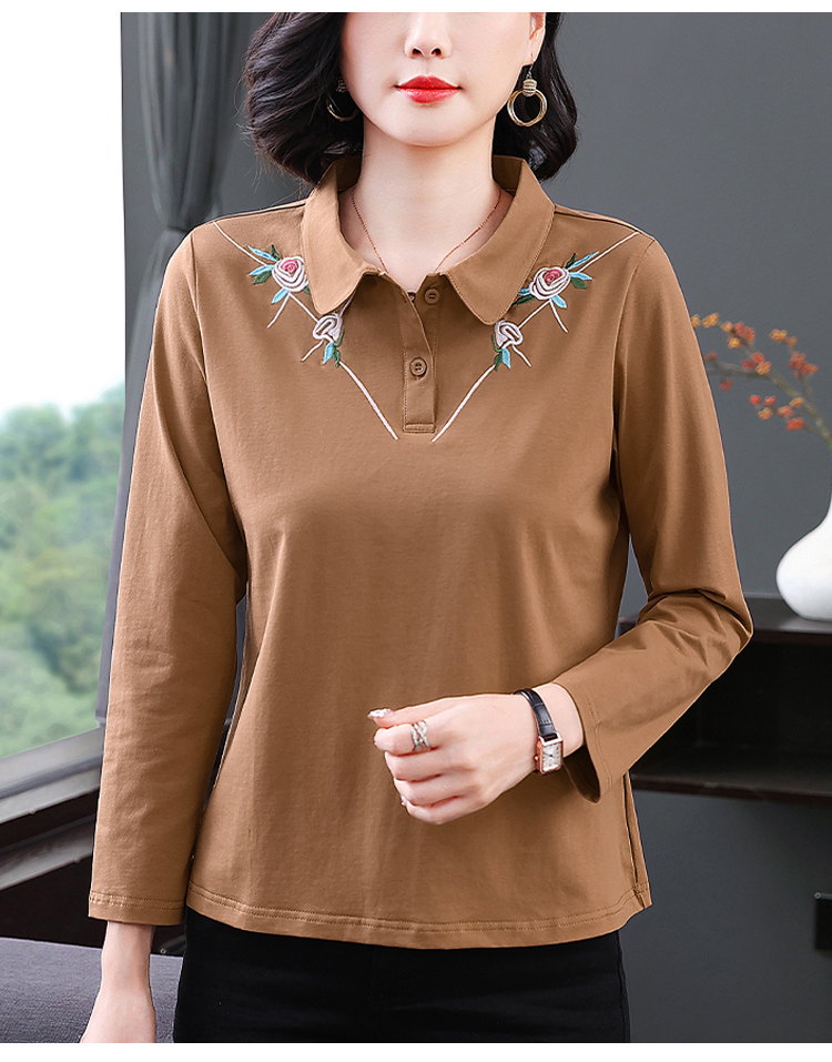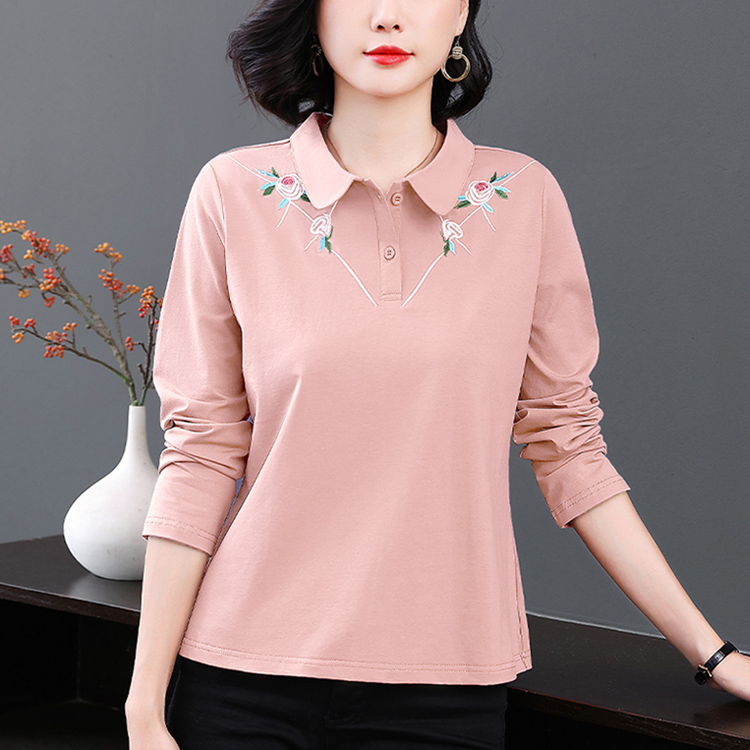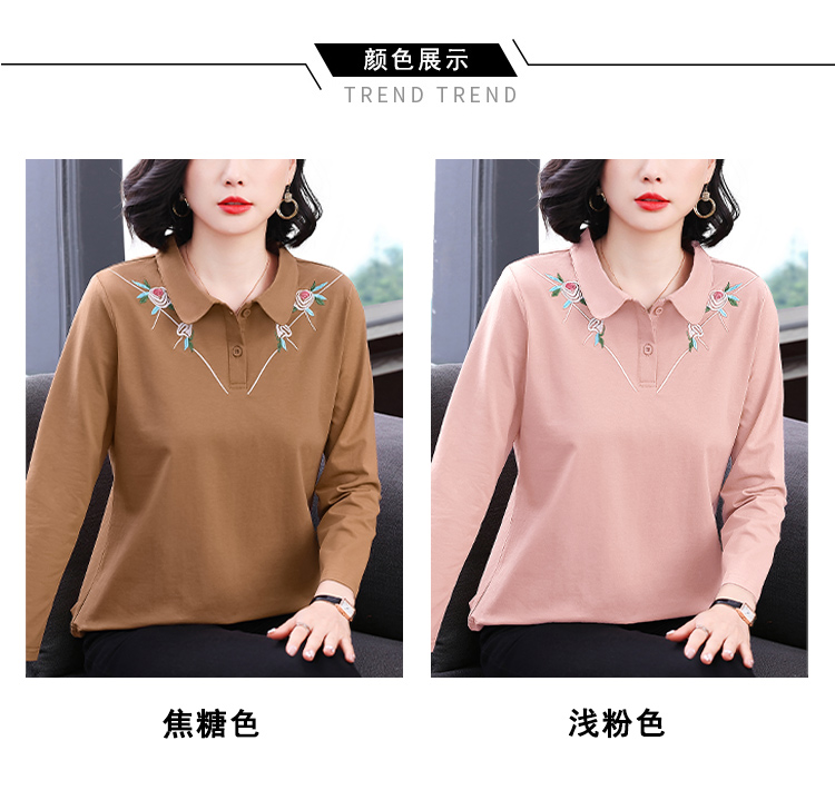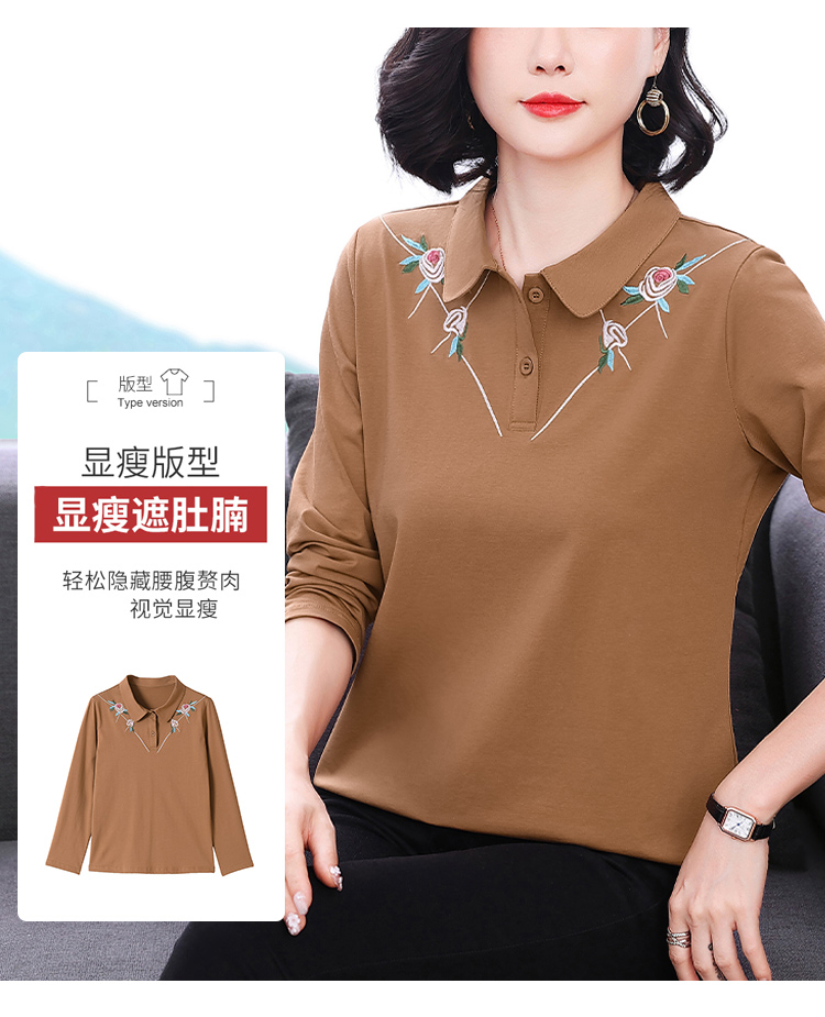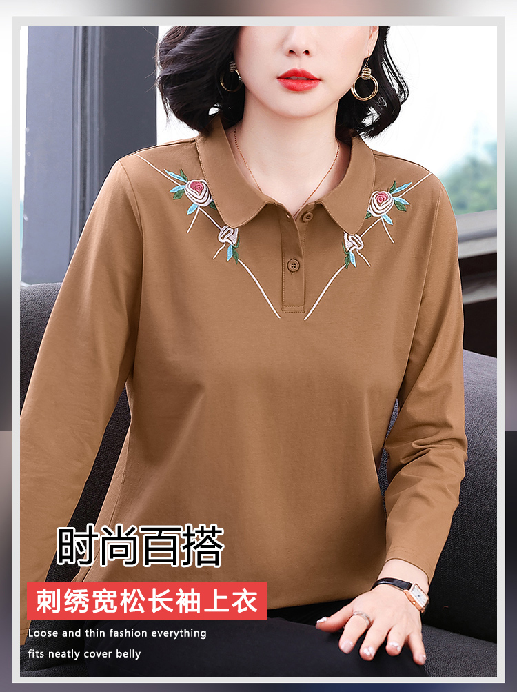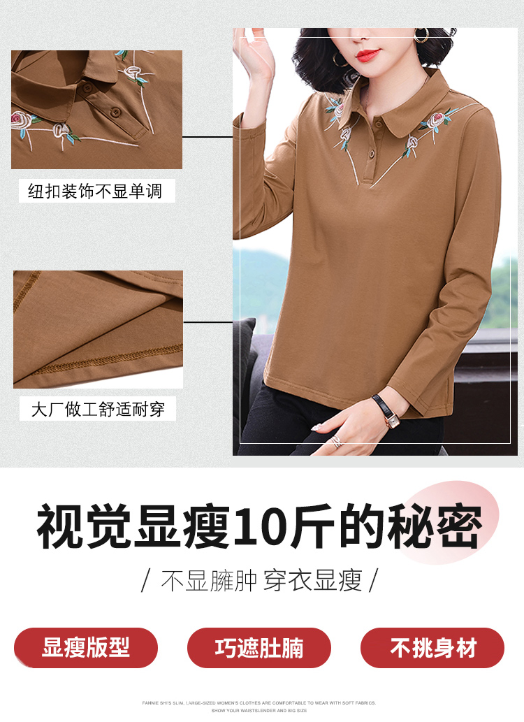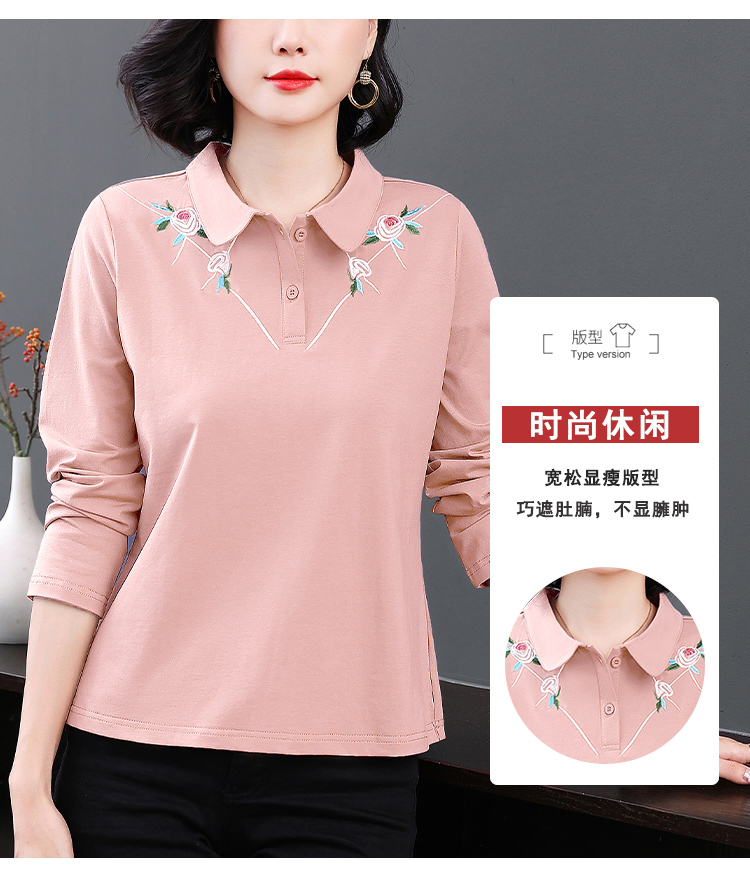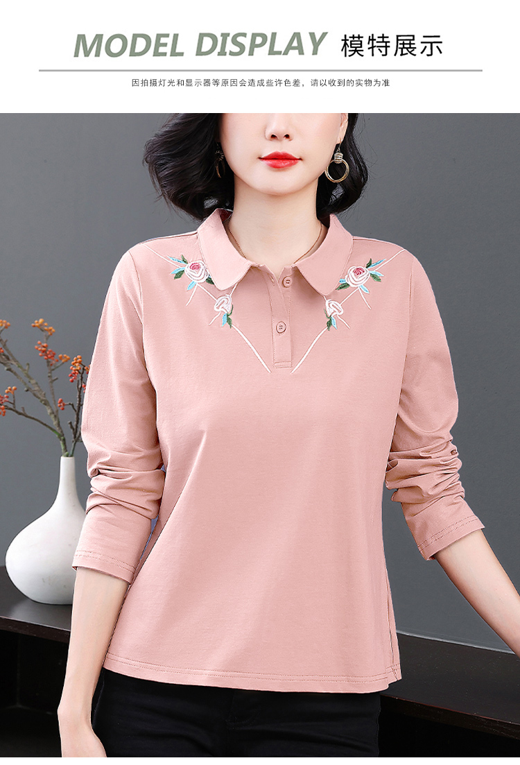 MY16104#新款纯棉翻领长袖T恤刺绣休闲宽松遮肚打底外穿上衣女裝貨源服裝批發