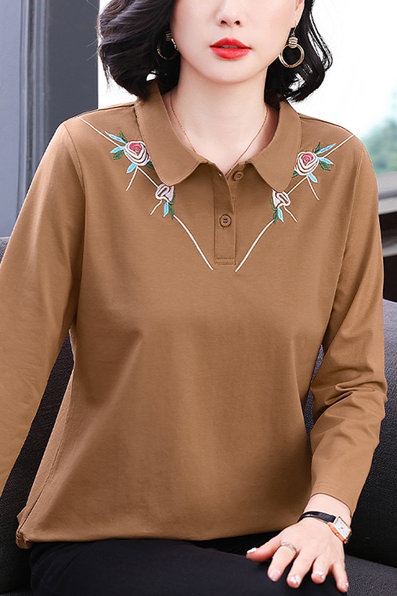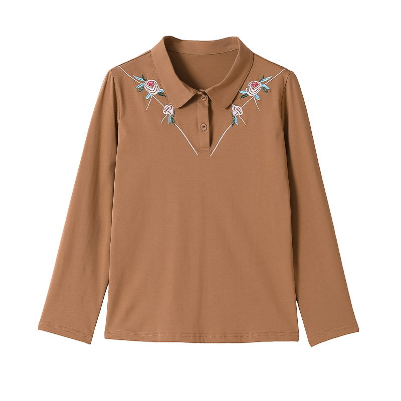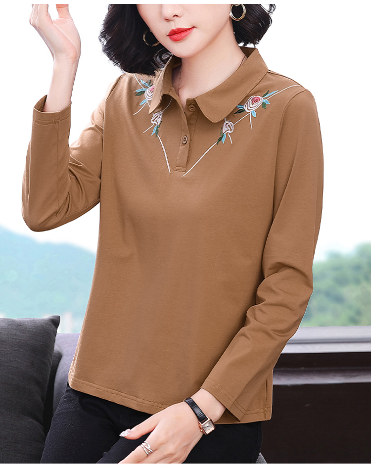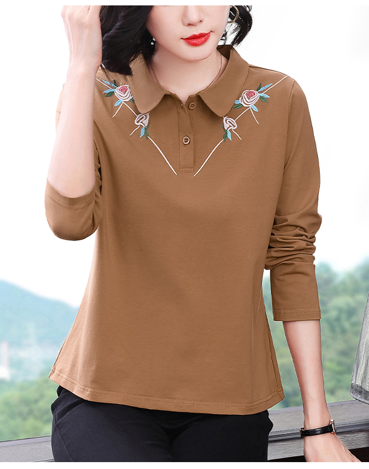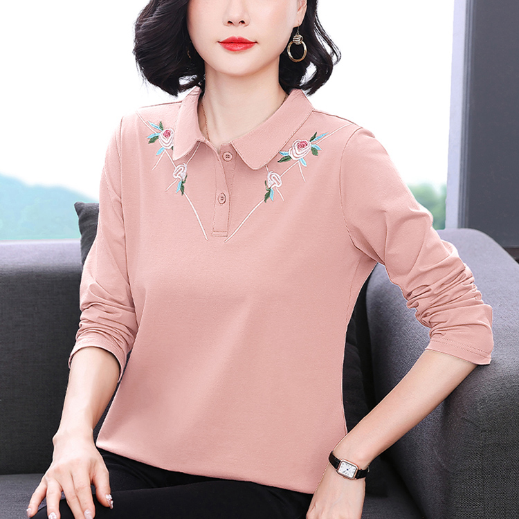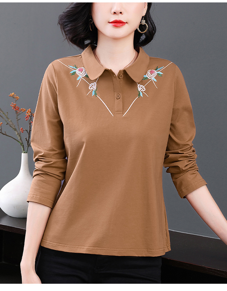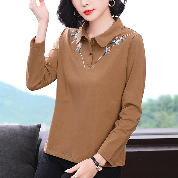 MY16104#新款纯棉翻领长袖T恤刺绣休闲宽松遮肚打底外穿上衣女裝貨源服裝批發