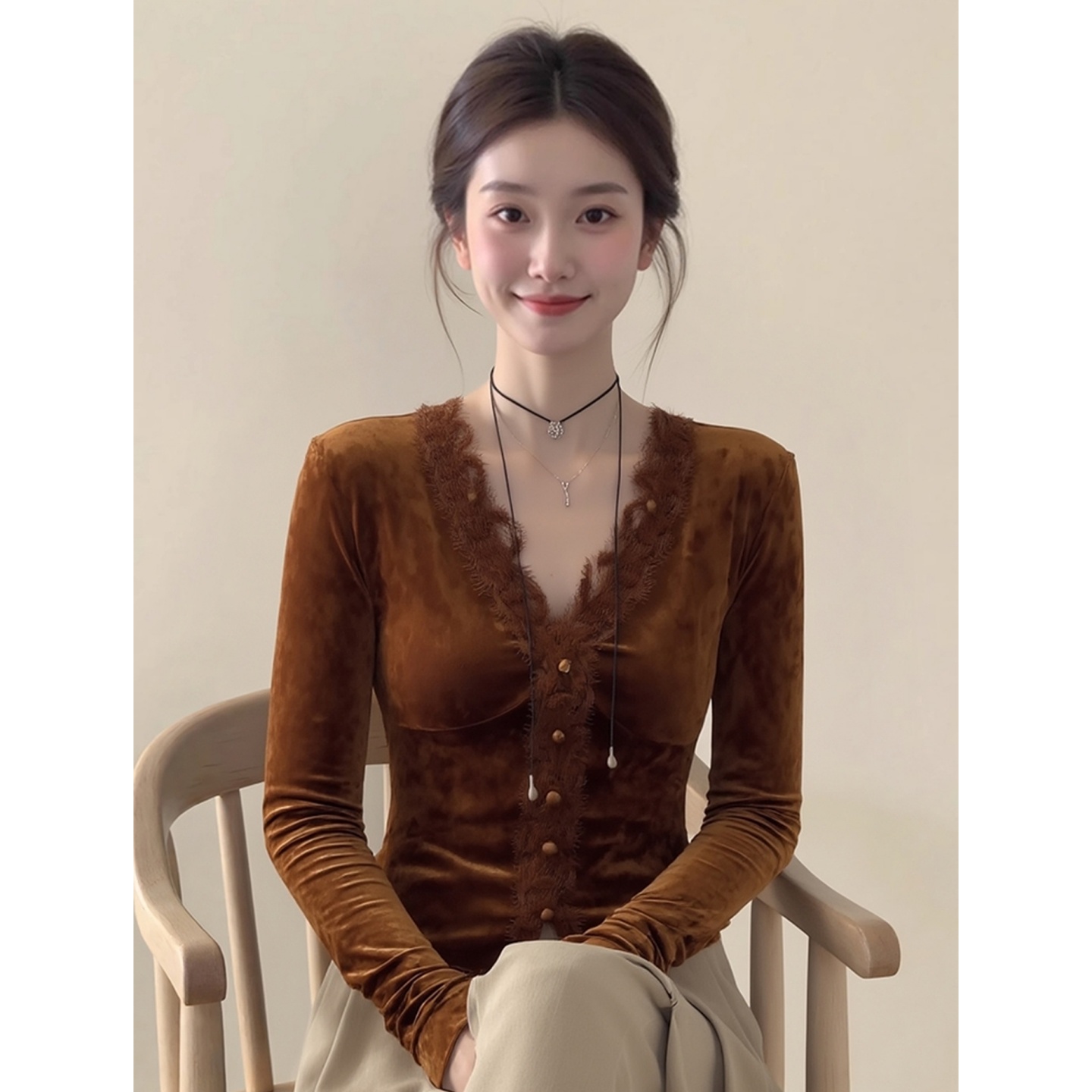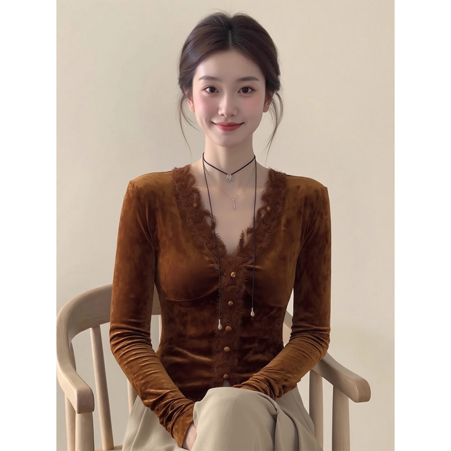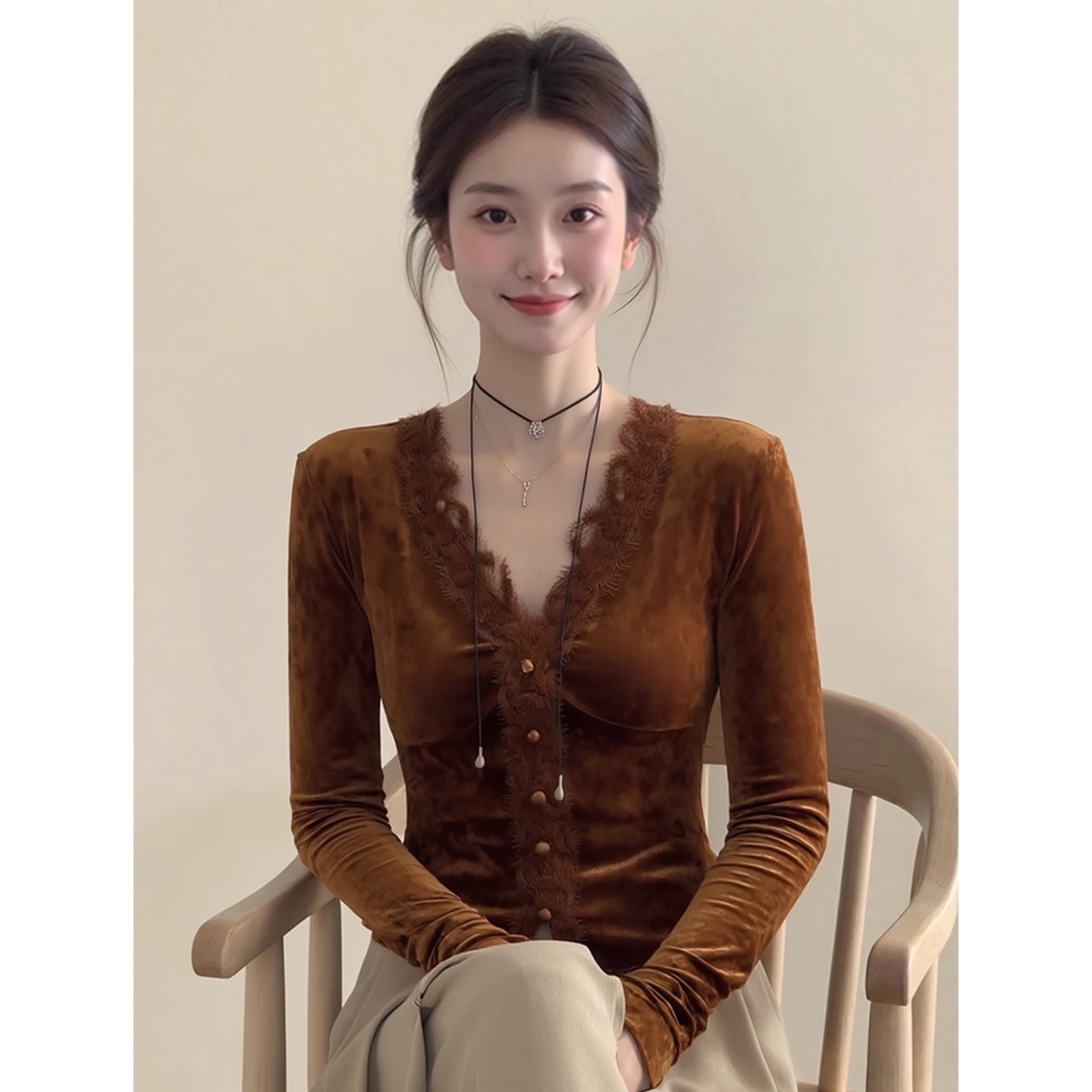 MY16110#美拉德咖色v领蕾丝花边丝绒上衣气质轻奢高级感内搭小衫女裝貨源服裝批發