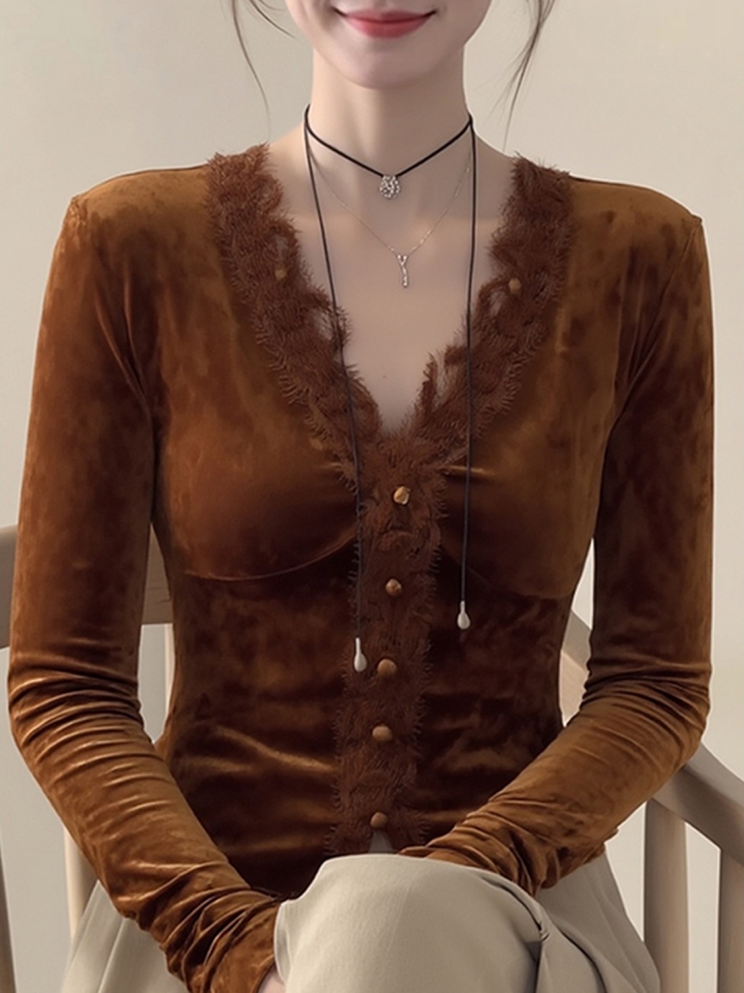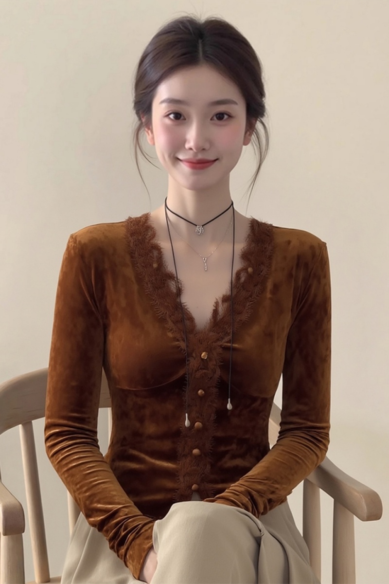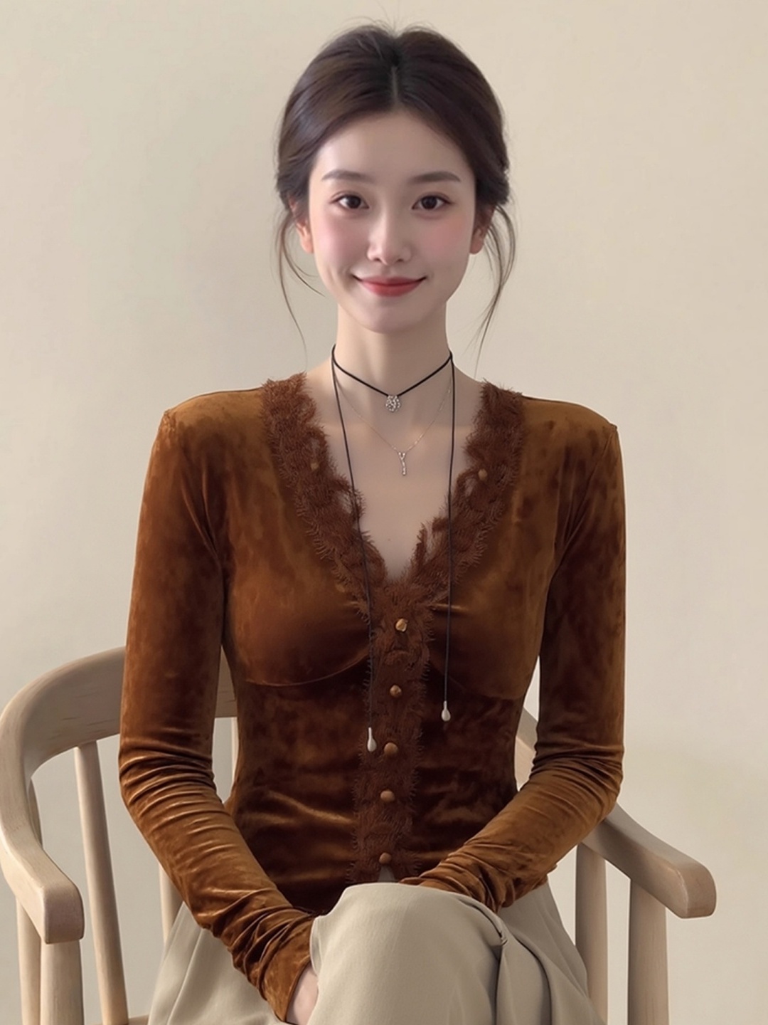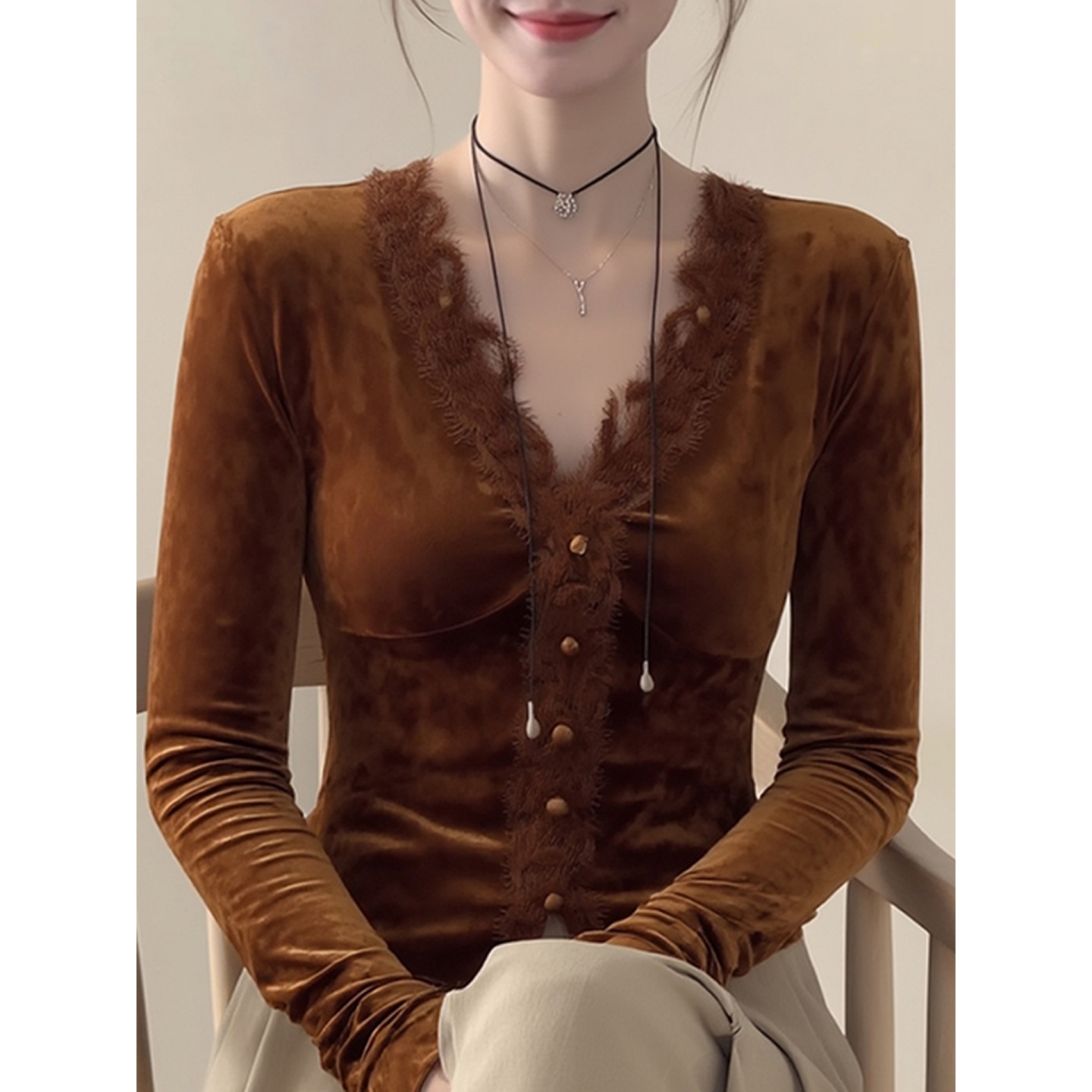 MY16110#美拉德咖色v领蕾丝花边丝绒上衣气质轻奢高级感内搭小衫女裝貨源服裝批發