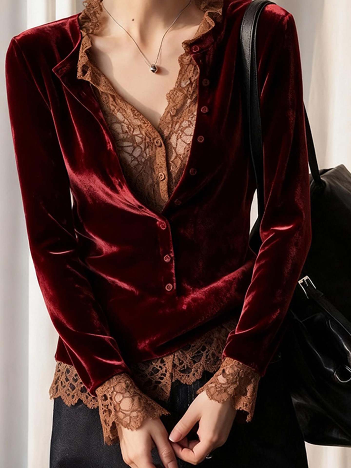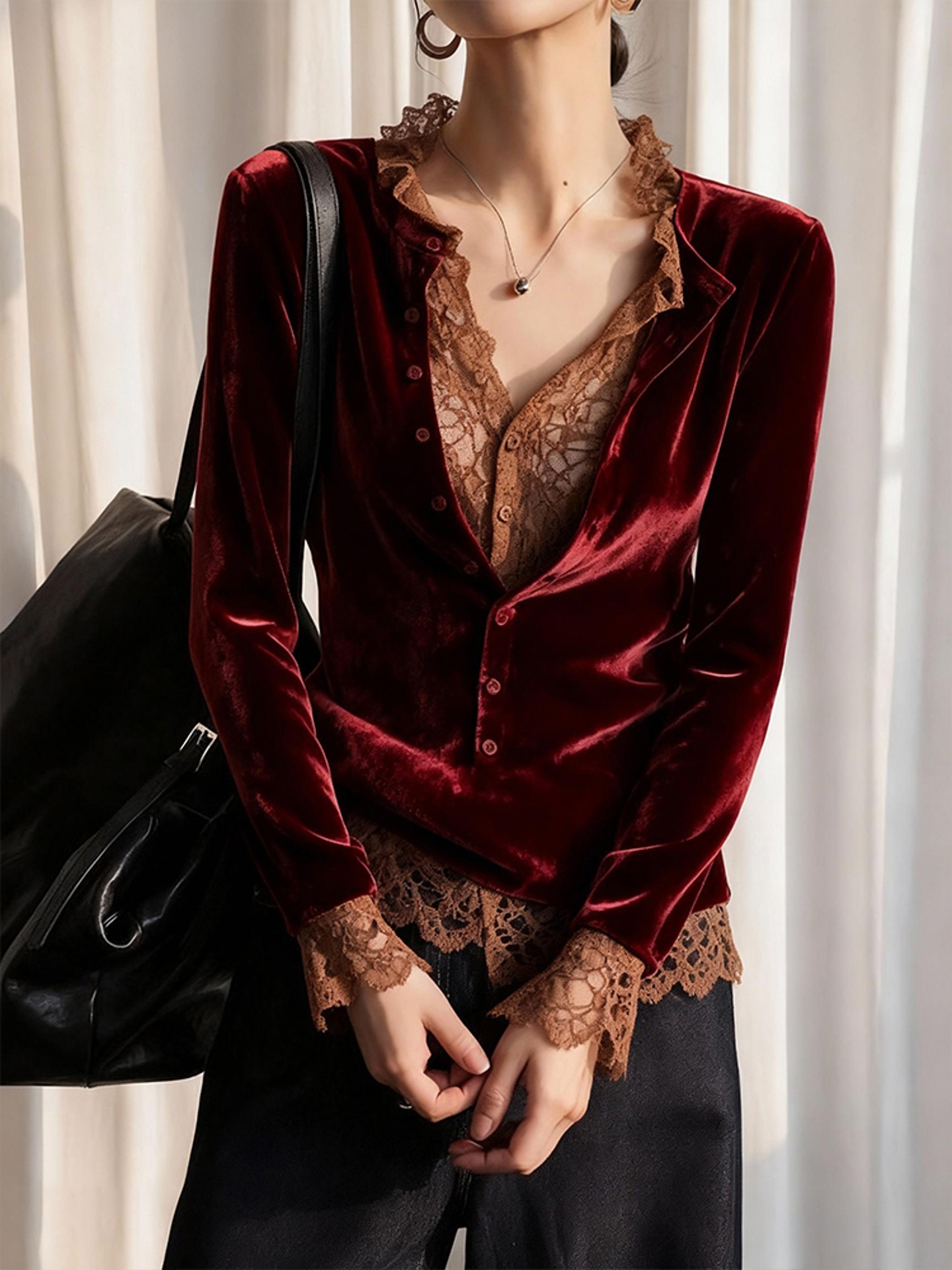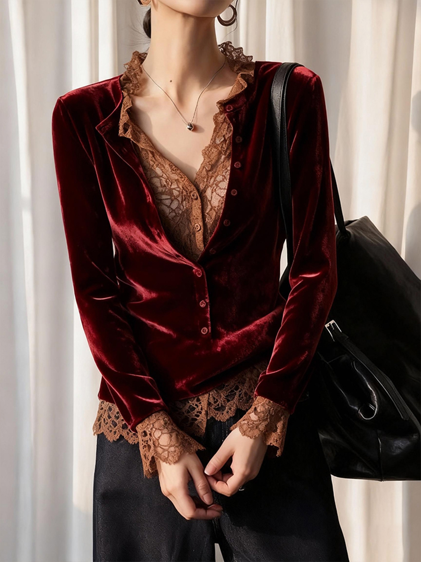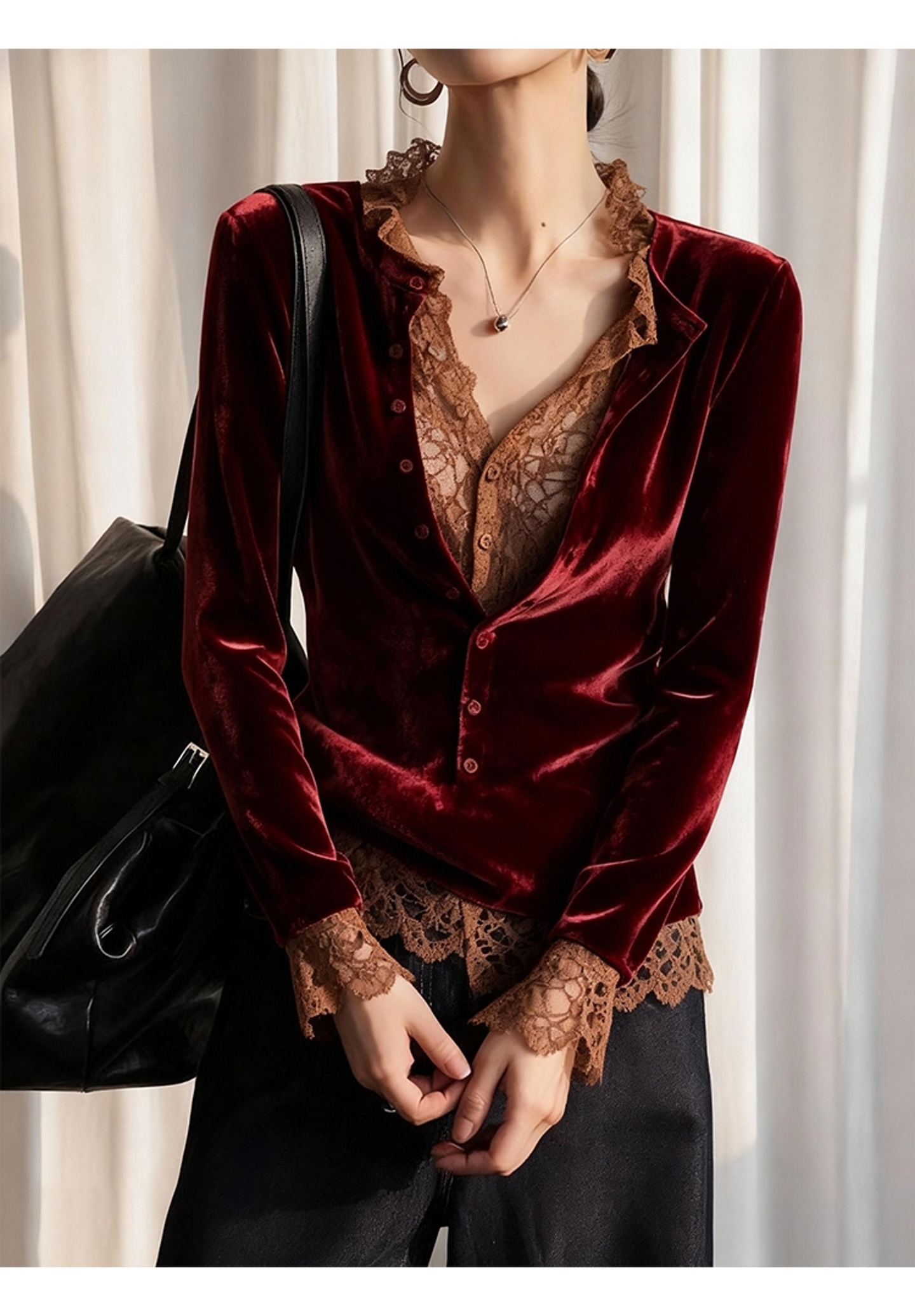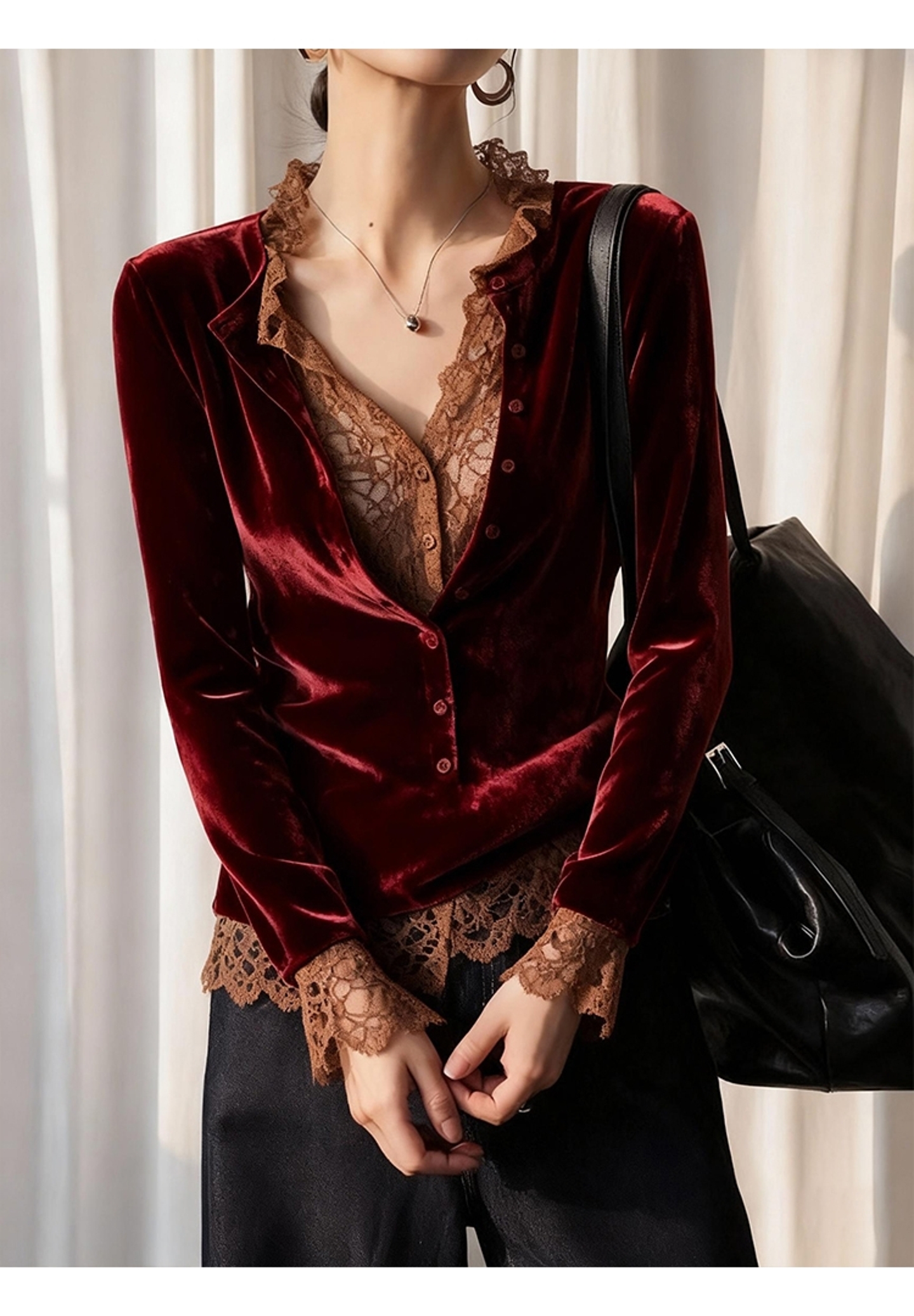 MY16111#超火减龄酒红色撞色蕾丝拼接丝绒衬衫女秋假两件气质内搭上衣女裝貨源服裝批發
