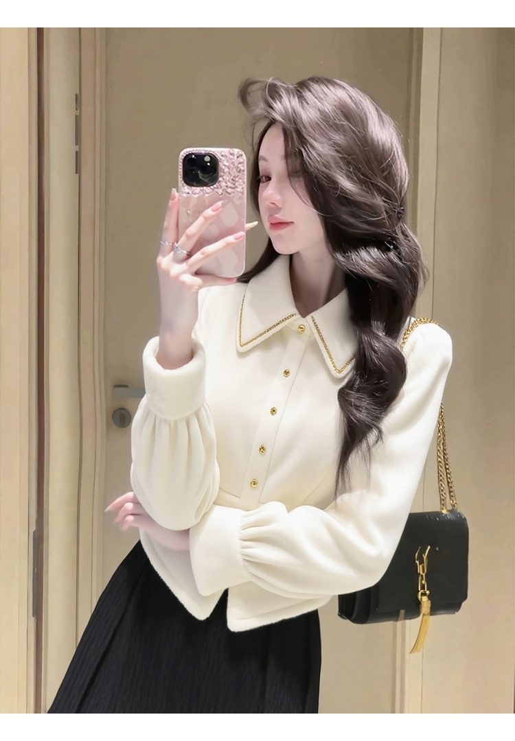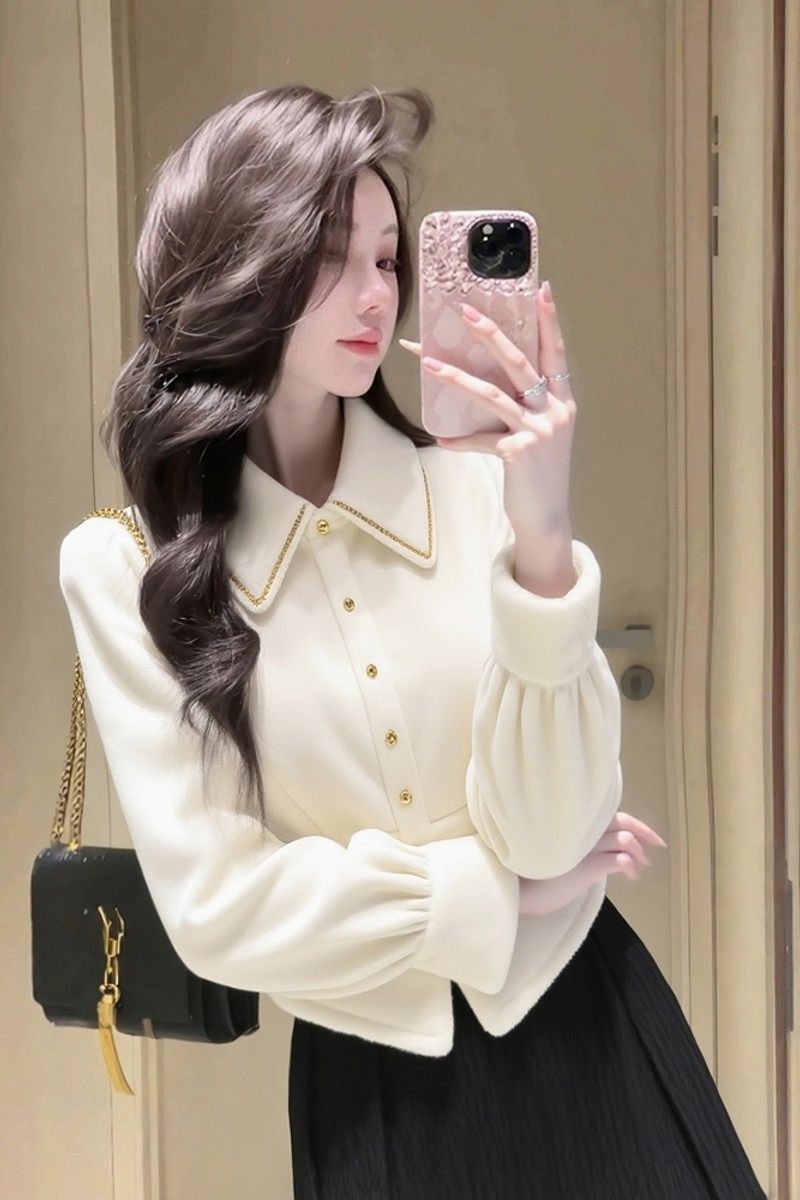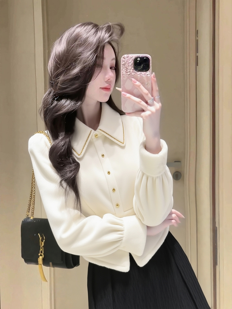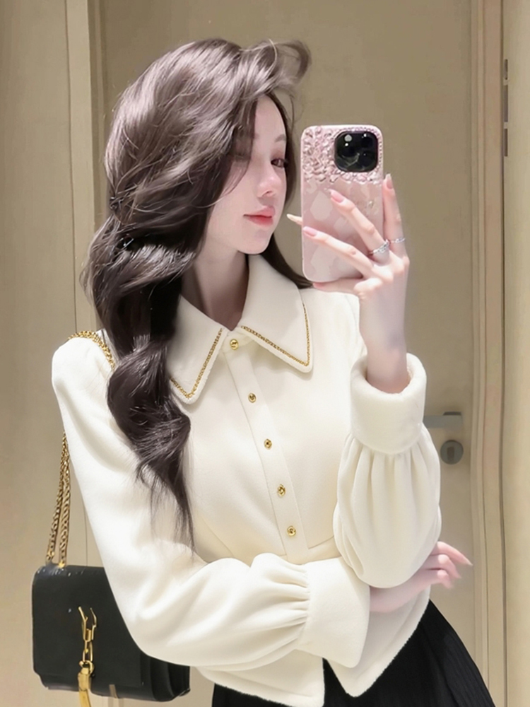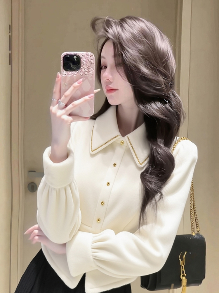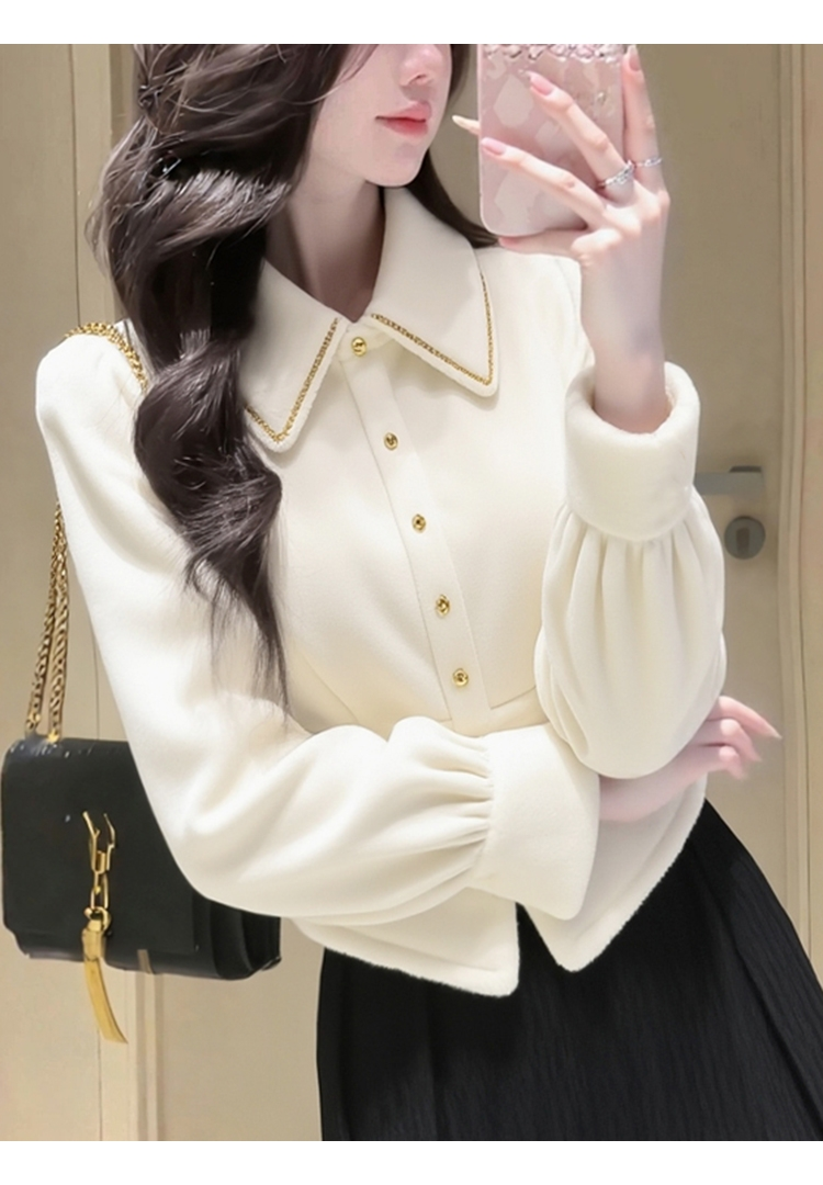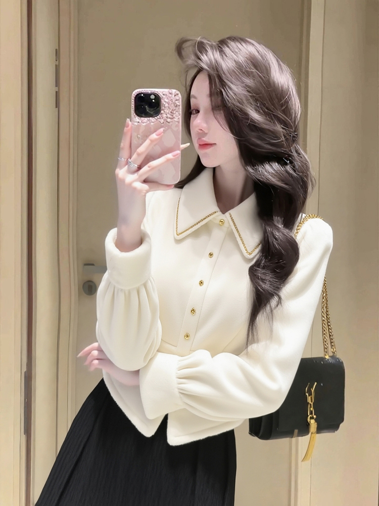 MY16113#法式时尚洋气减龄设计感通勤内搭上衣高级感气质白色丝绒衬衫女冬女裝貨源服裝批發
