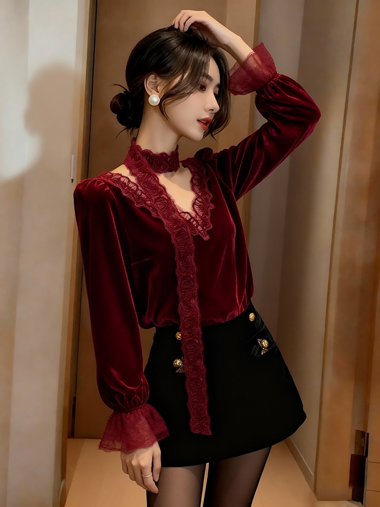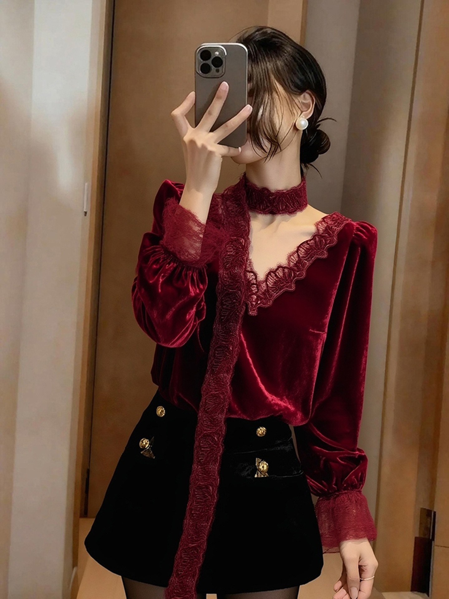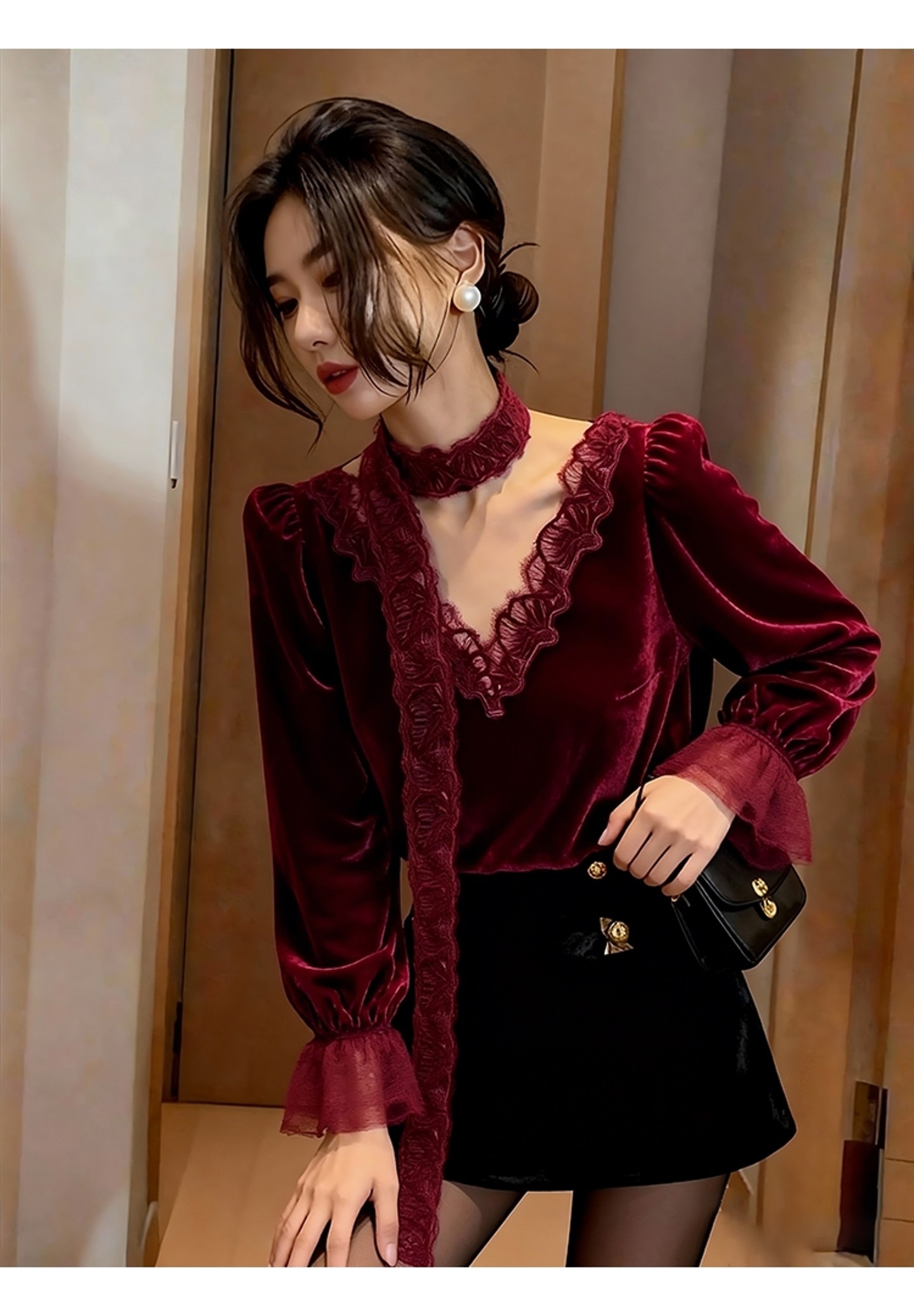 MY16114#法式独特精致上衣高级感轻奢减龄小香风圣诞红色丝绒衬衫女女裝貨源服裝批發