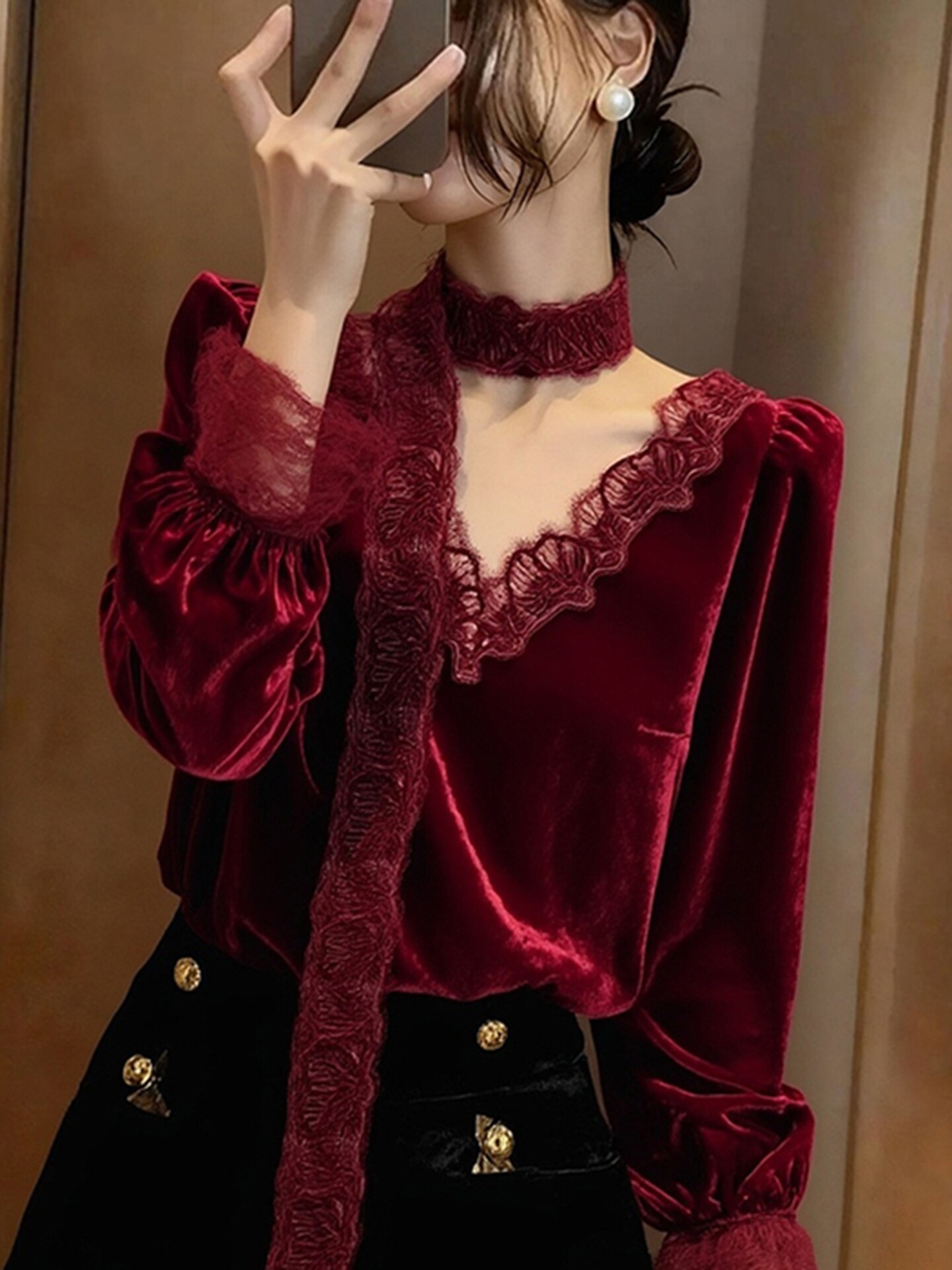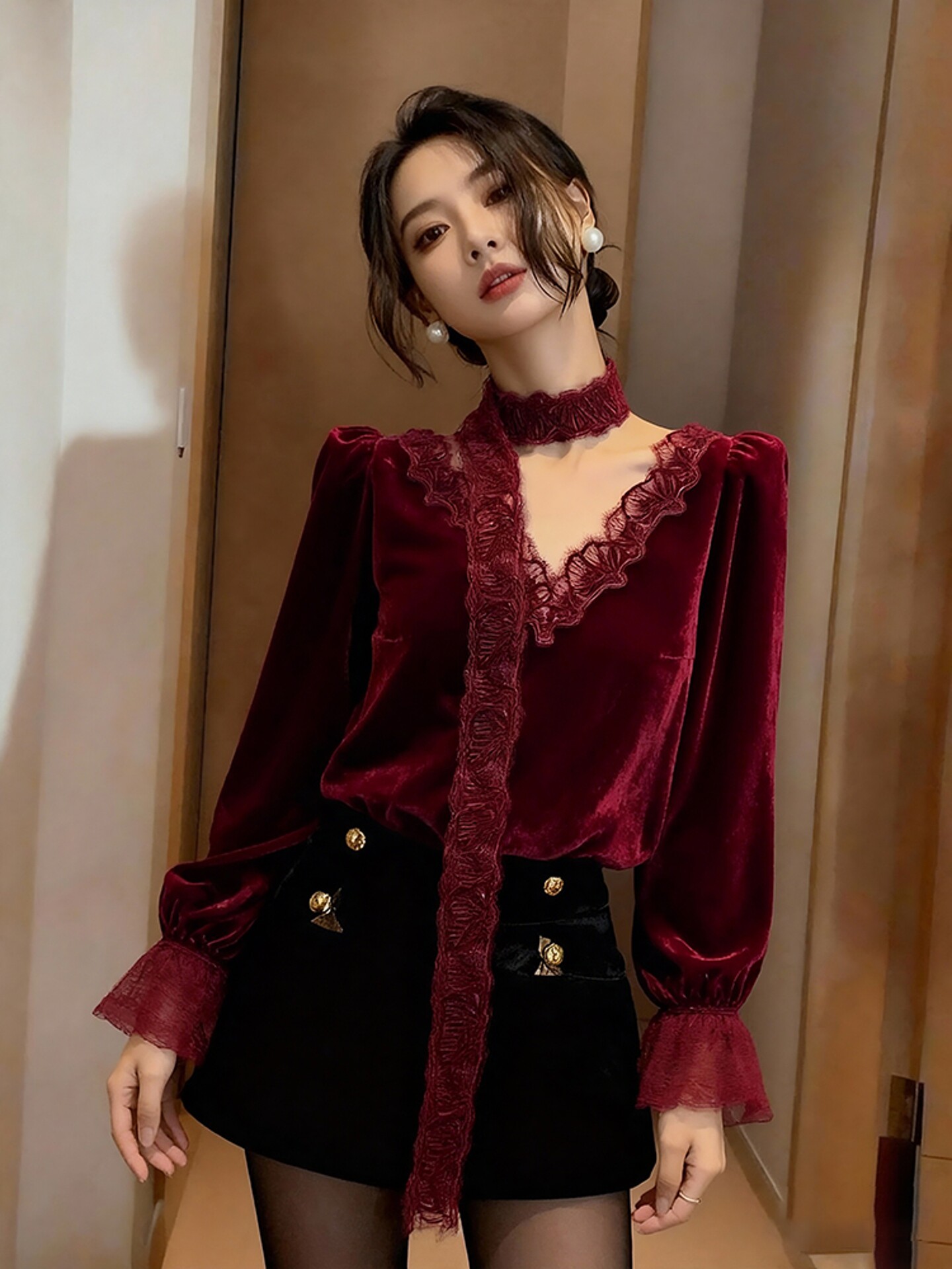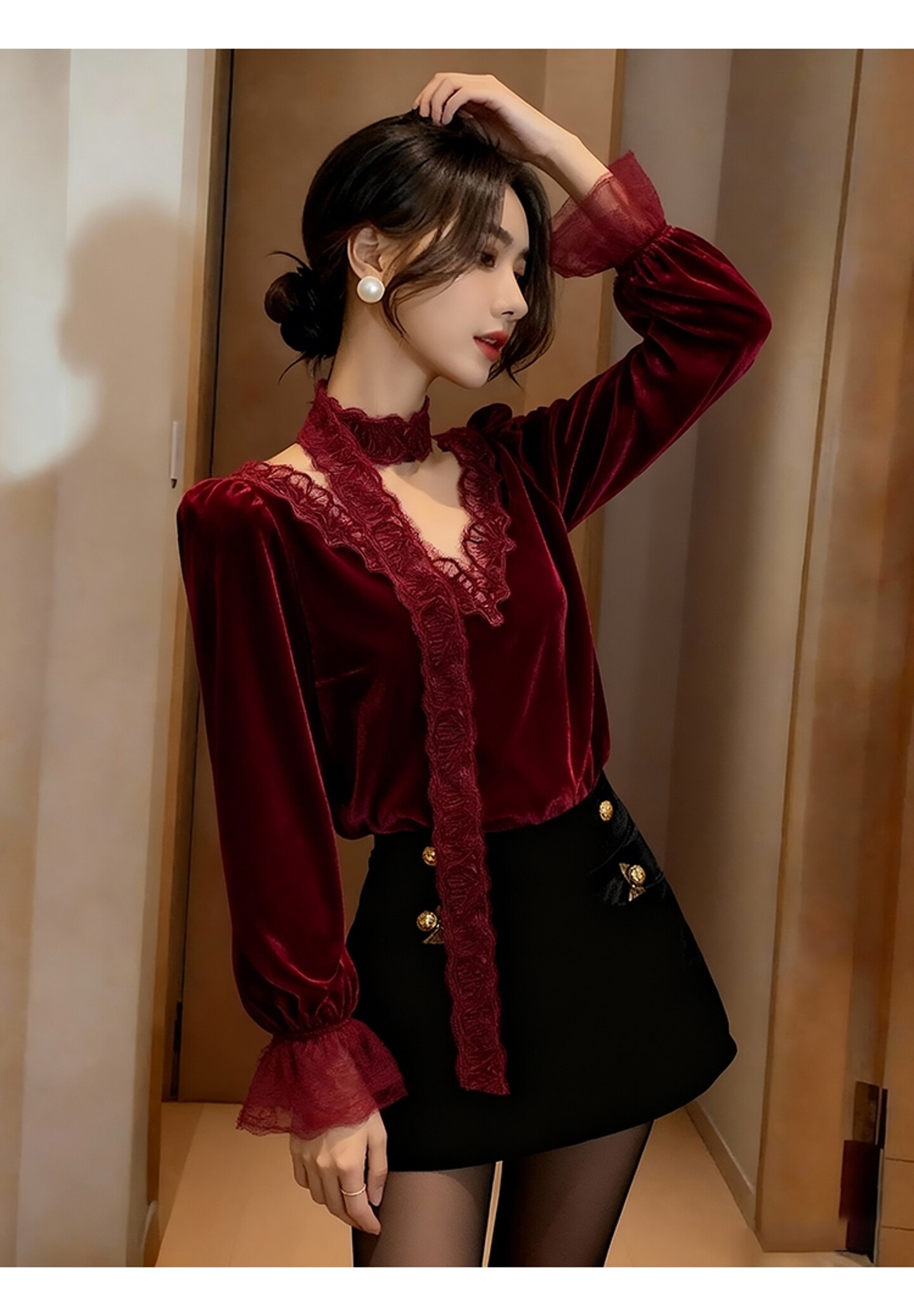MY16114#法式独特精致上衣高级感轻奢减龄小香风圣诞红色丝绒衬衫女女裝貨源服裝批發