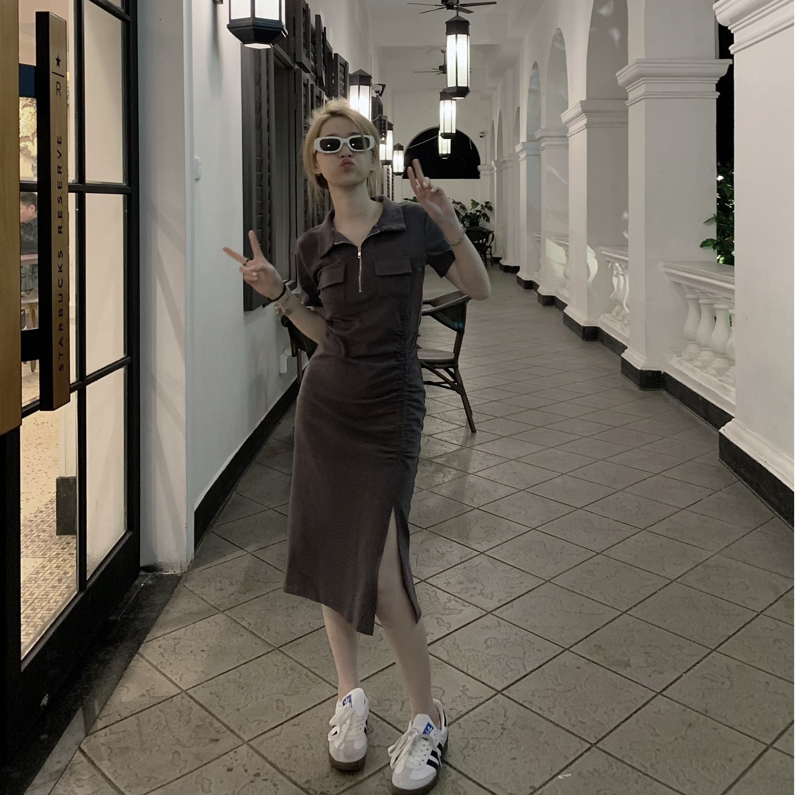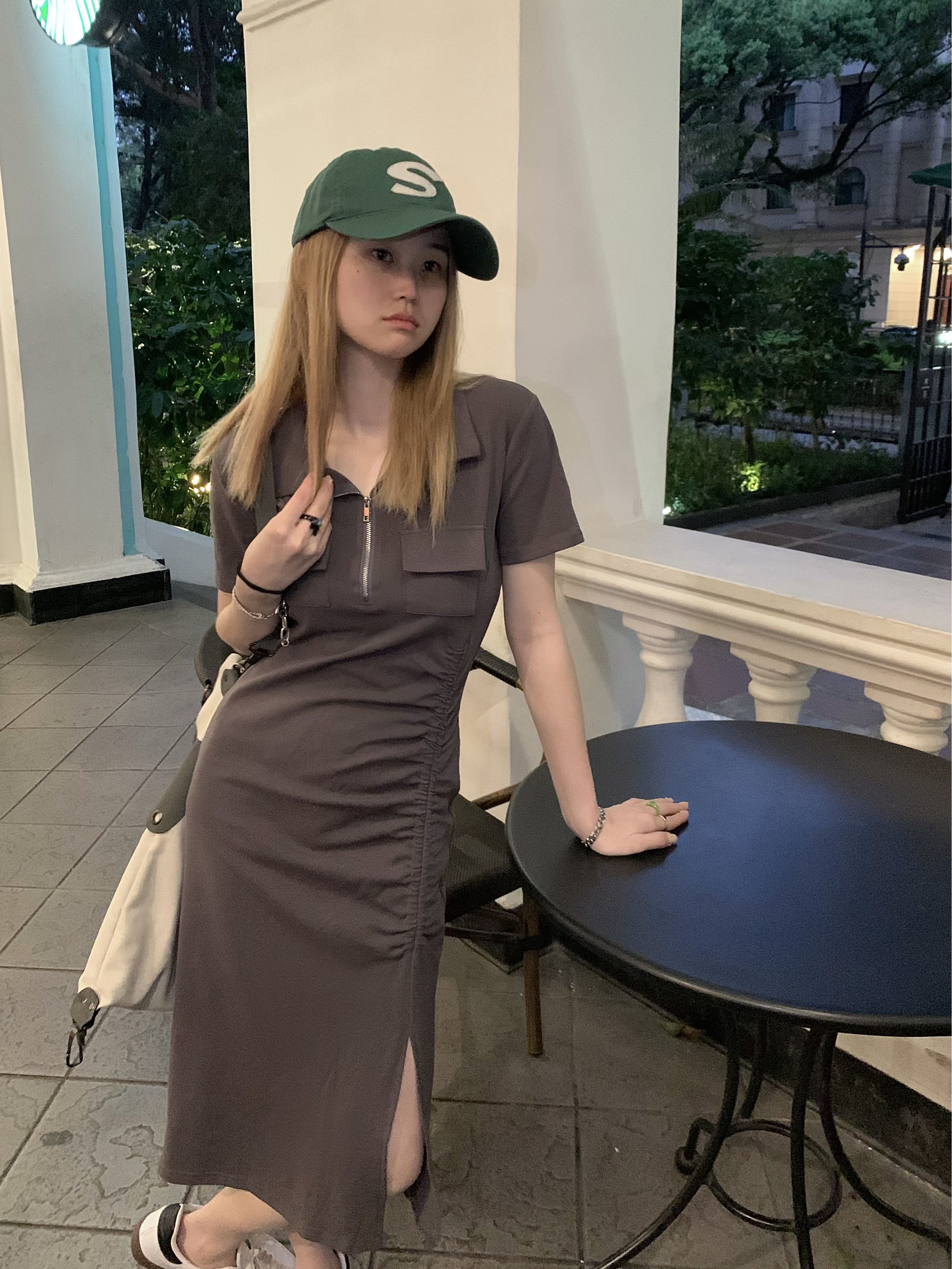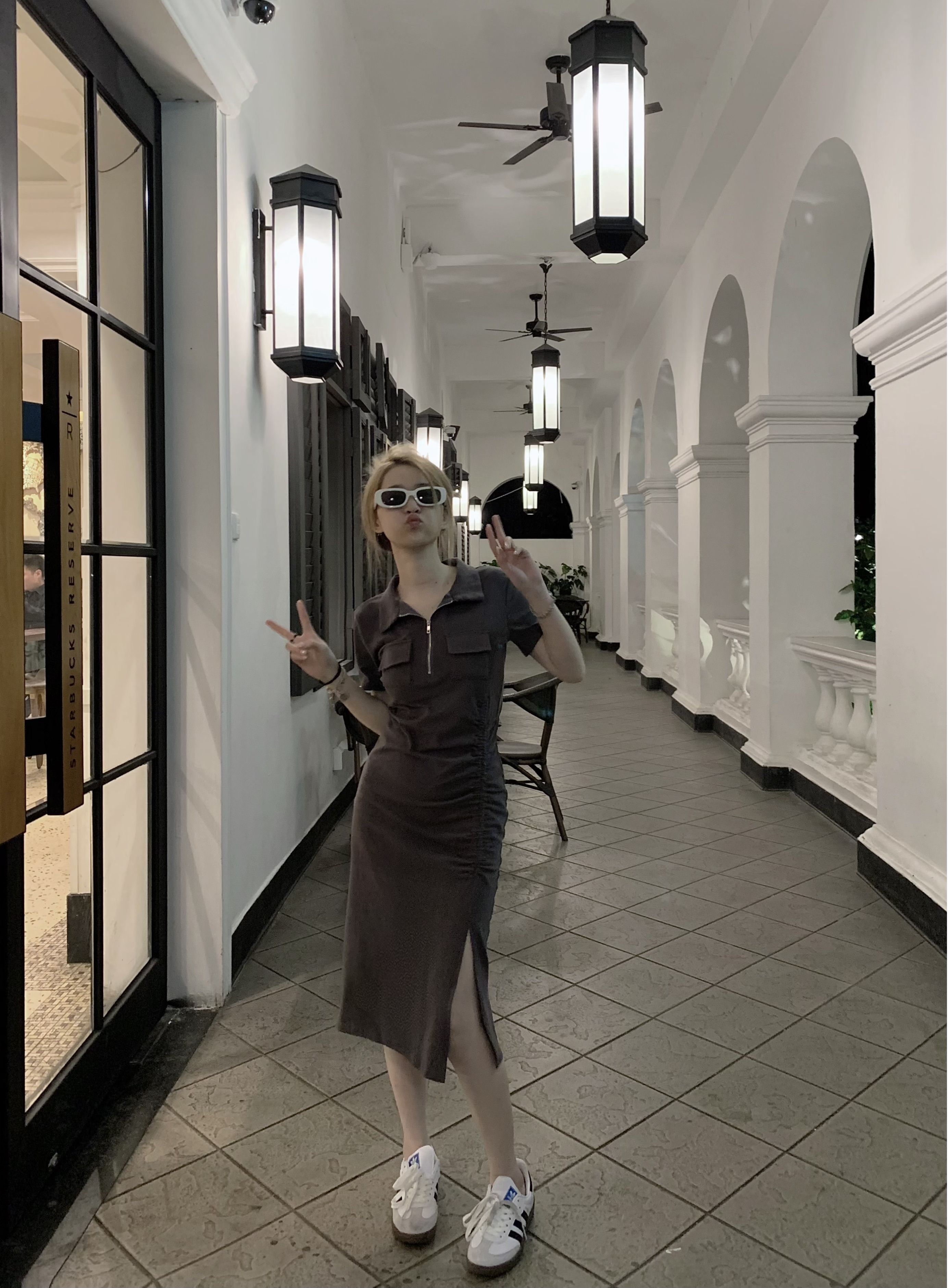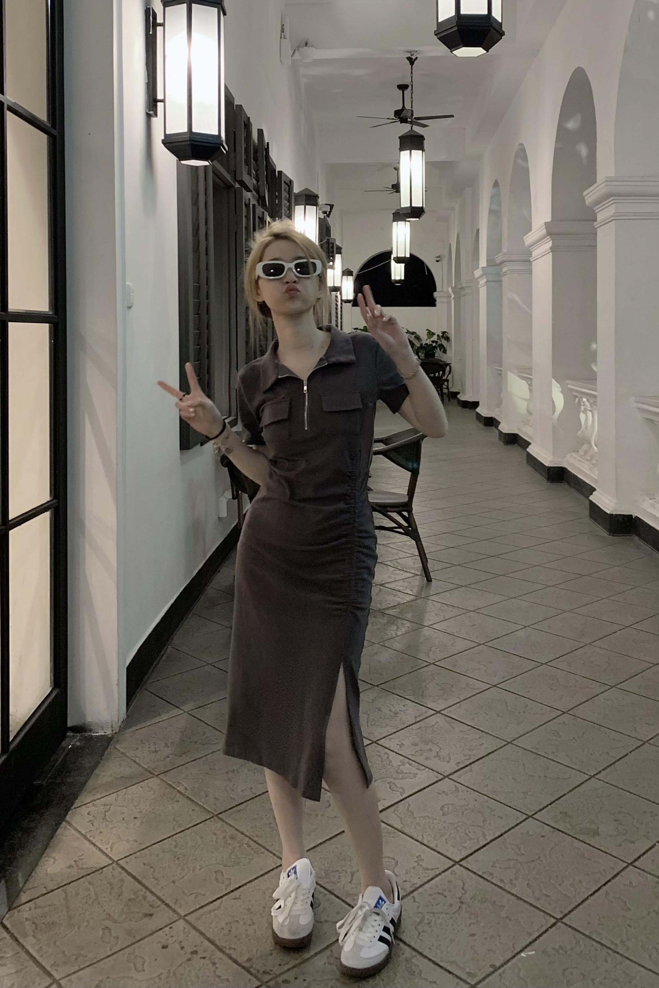 MY16117#大码半拉链Polo领抽绳收腰显瘦连衣裙女复古风休闲简约包臀中长裙女裝貨源服裝批發