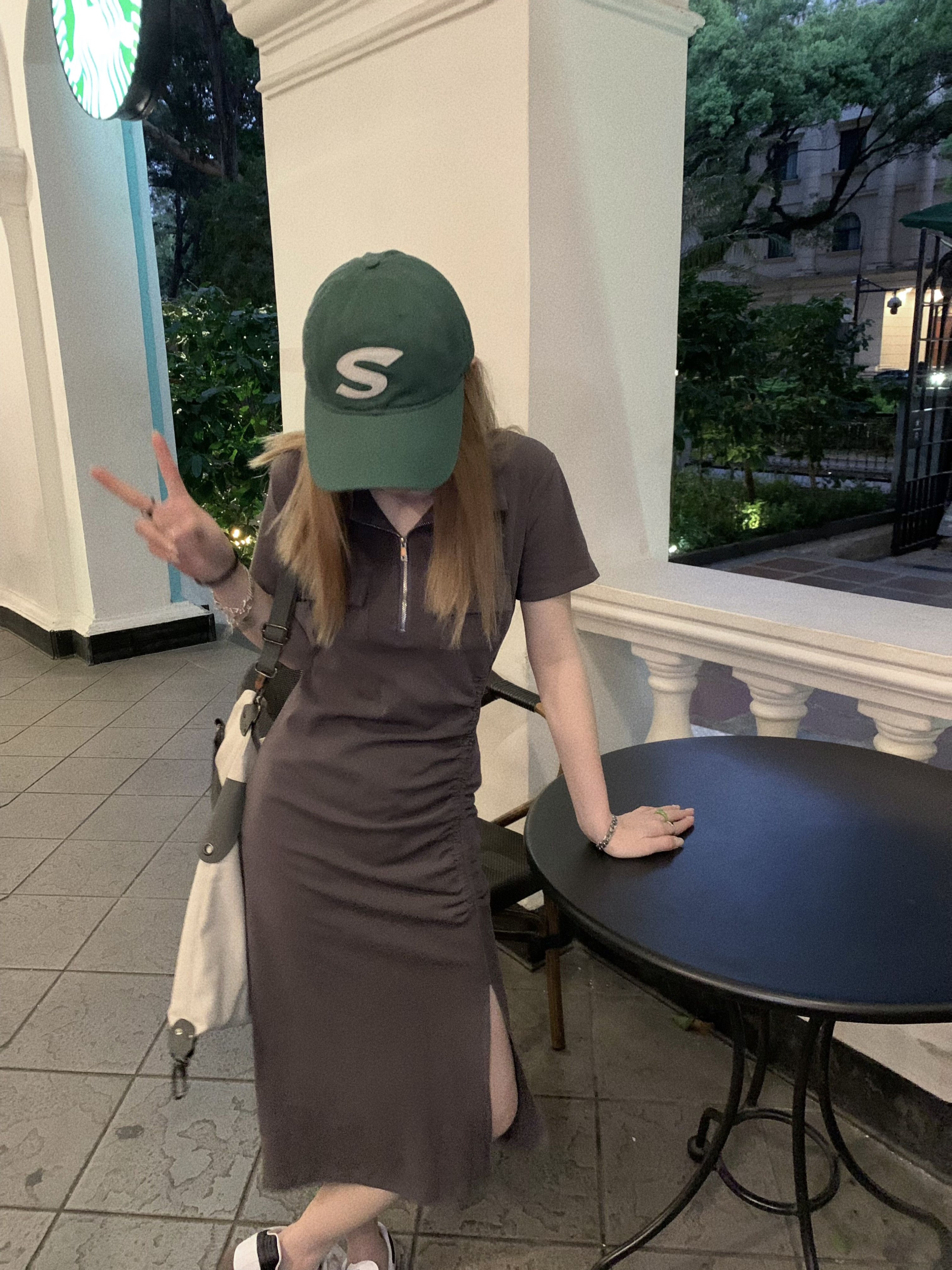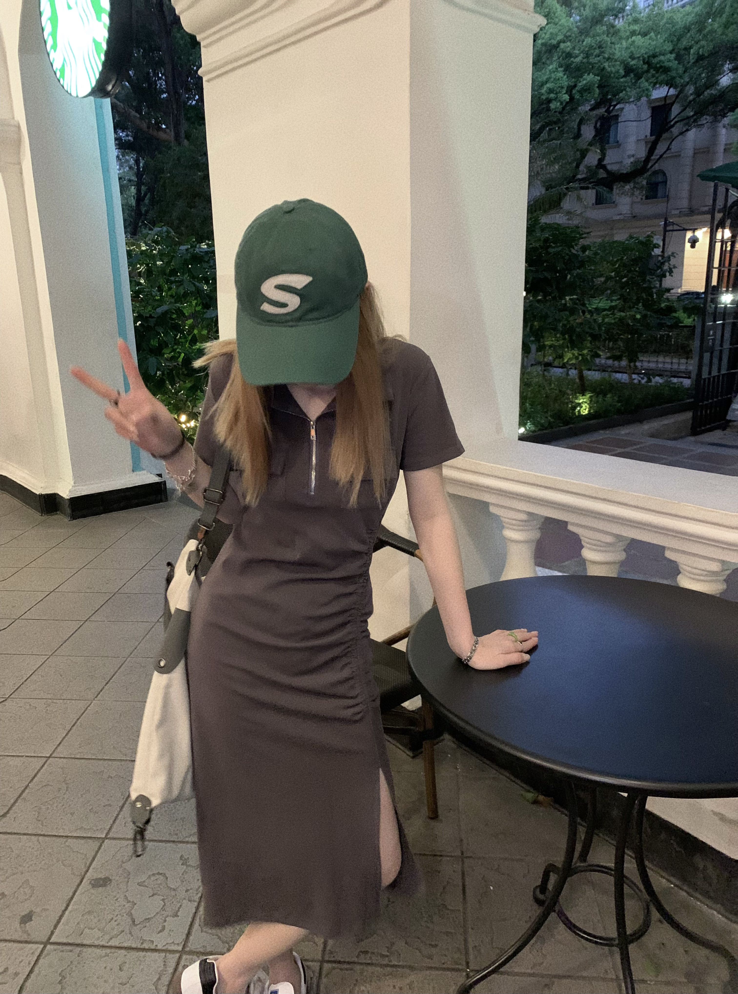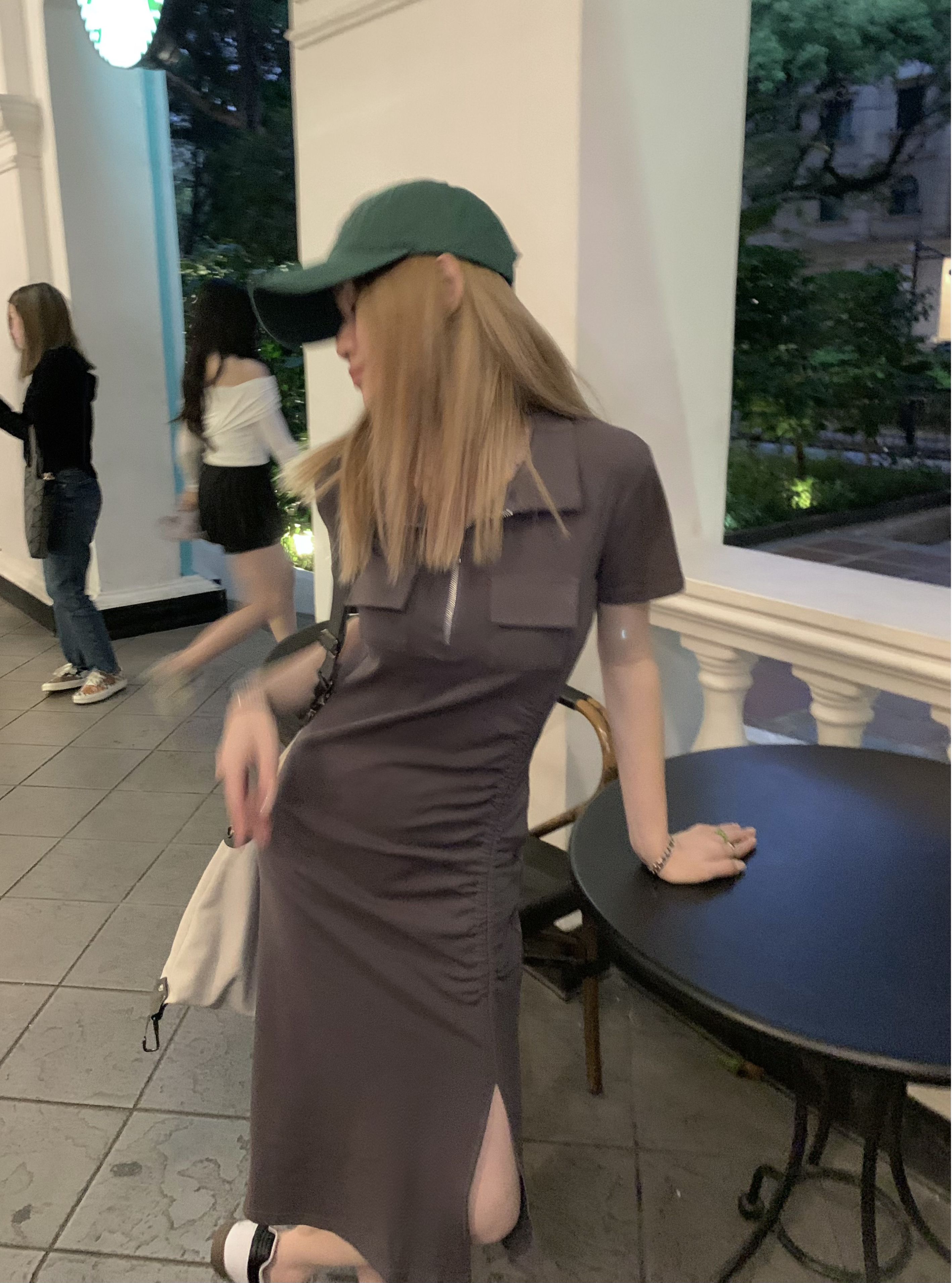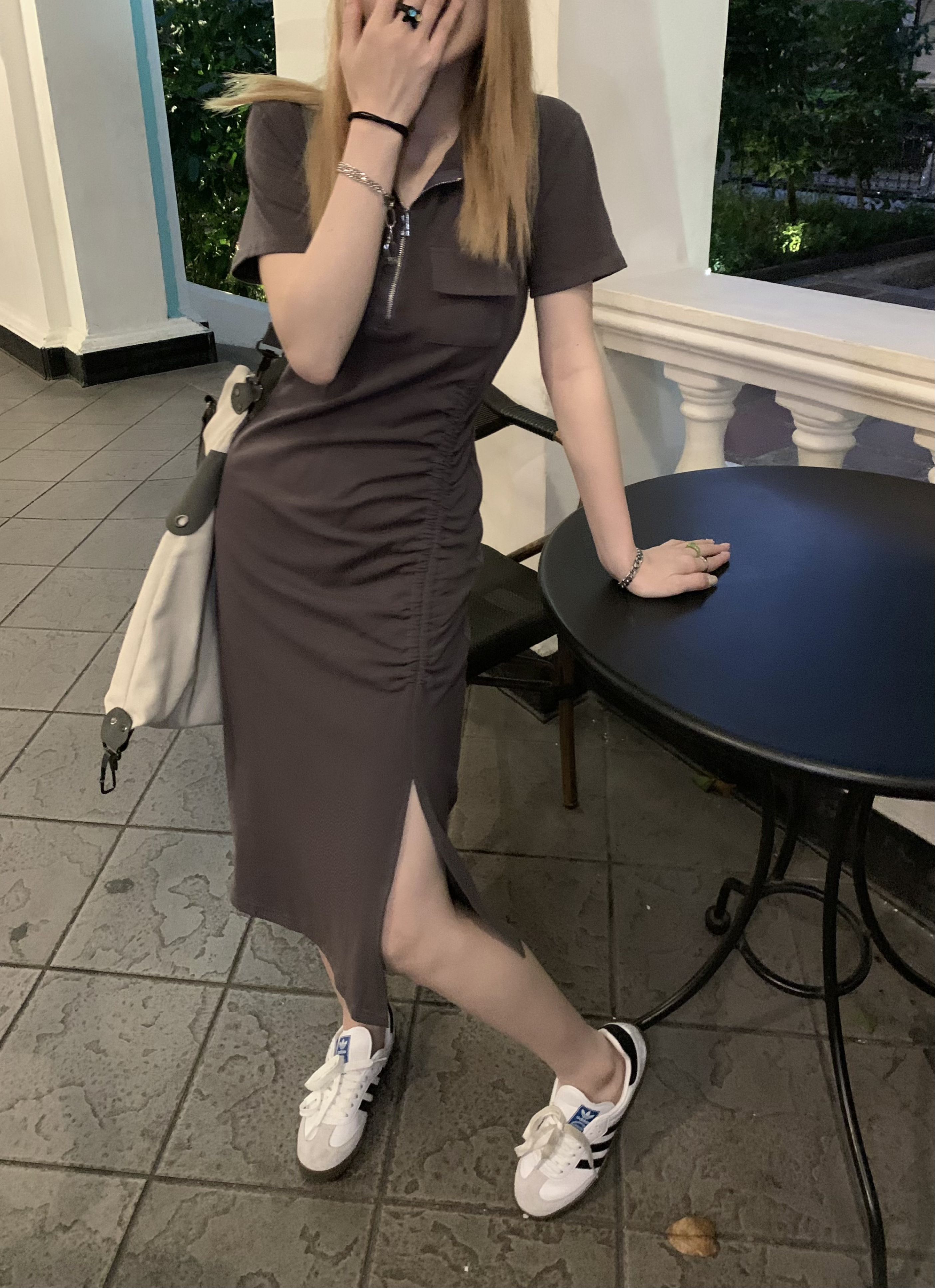 MY16117#大码半拉链Polo领抽绳收腰显瘦连衣裙女复古风休闲简约包臀中长裙女裝貨源服裝批發