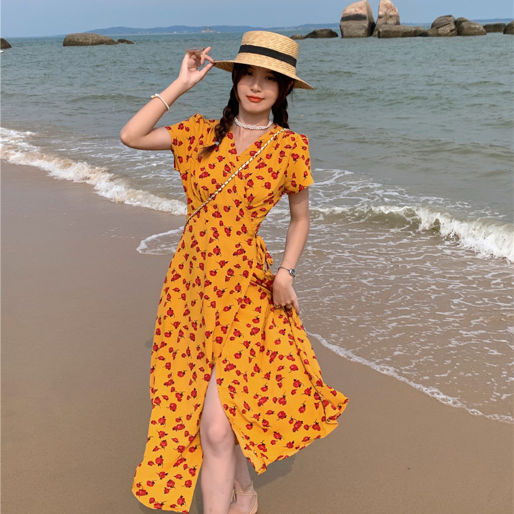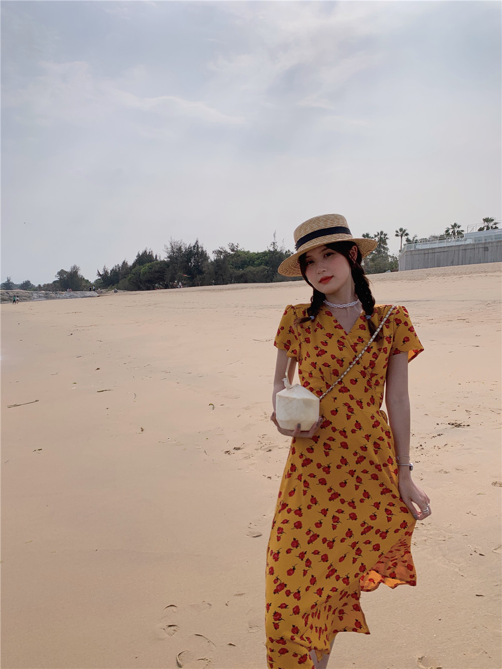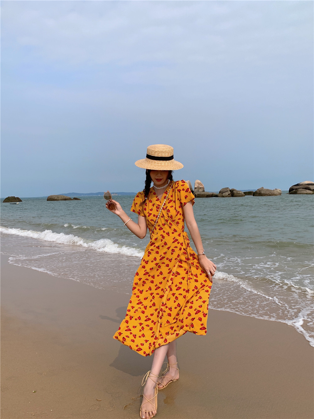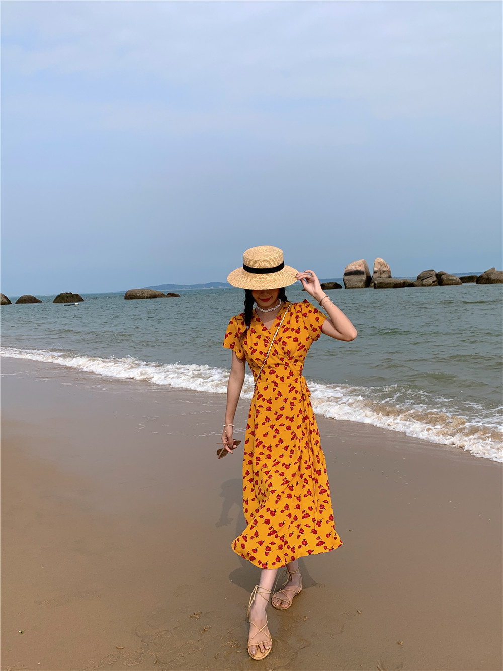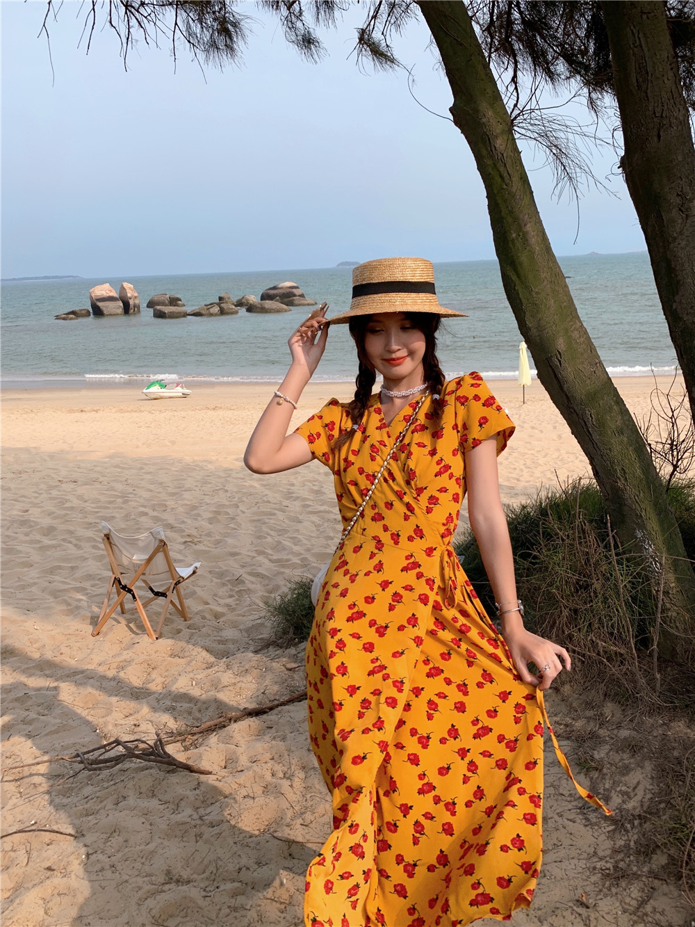 MY16121#大码法式一片式裹胸收腰显瘦黄碎花桔梗裙气质海边旅游度假沙滩裙女裝貨源服裝批發