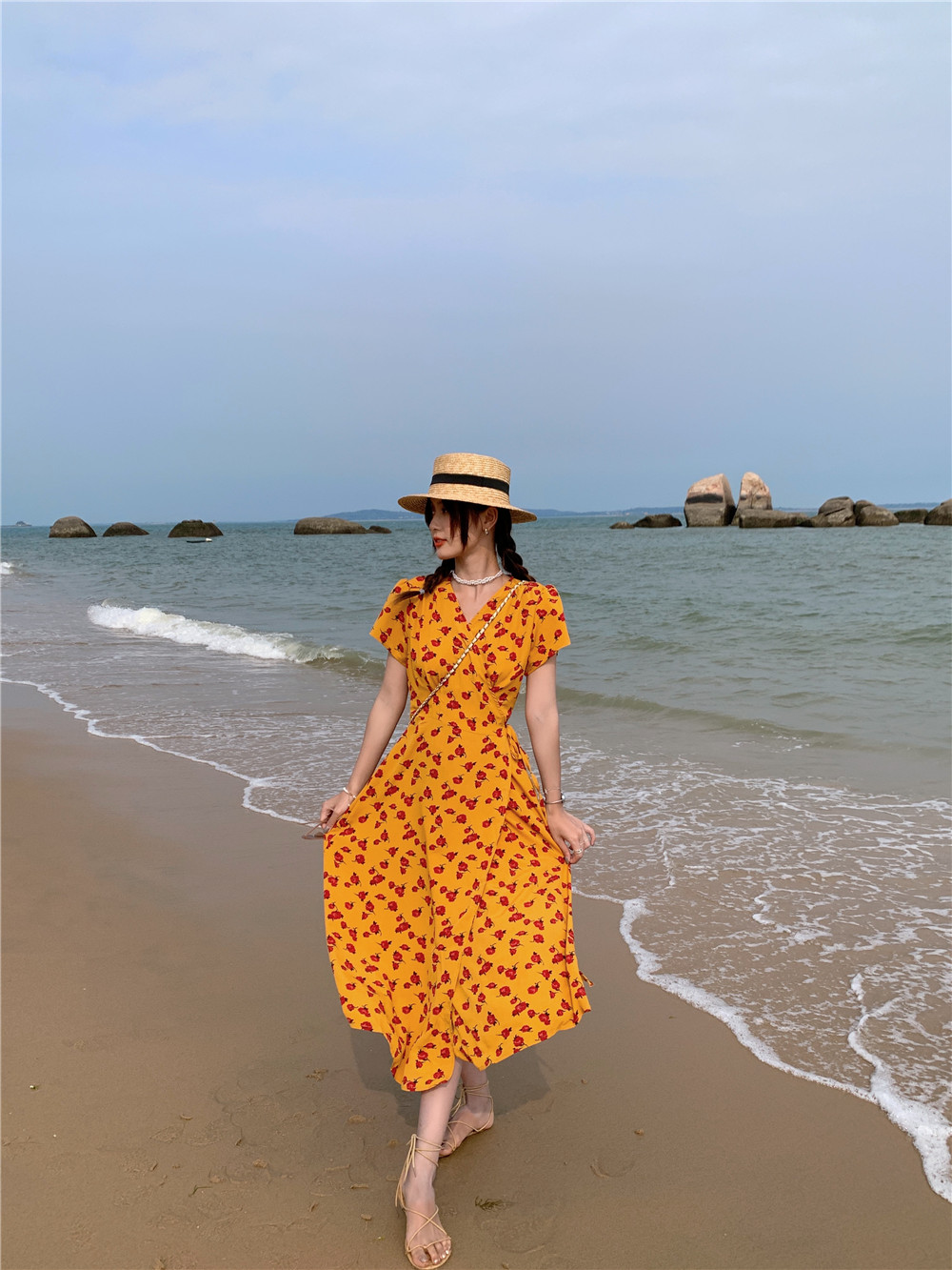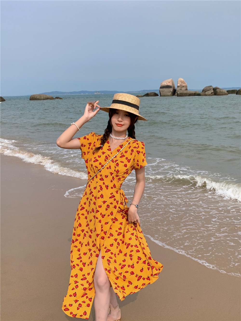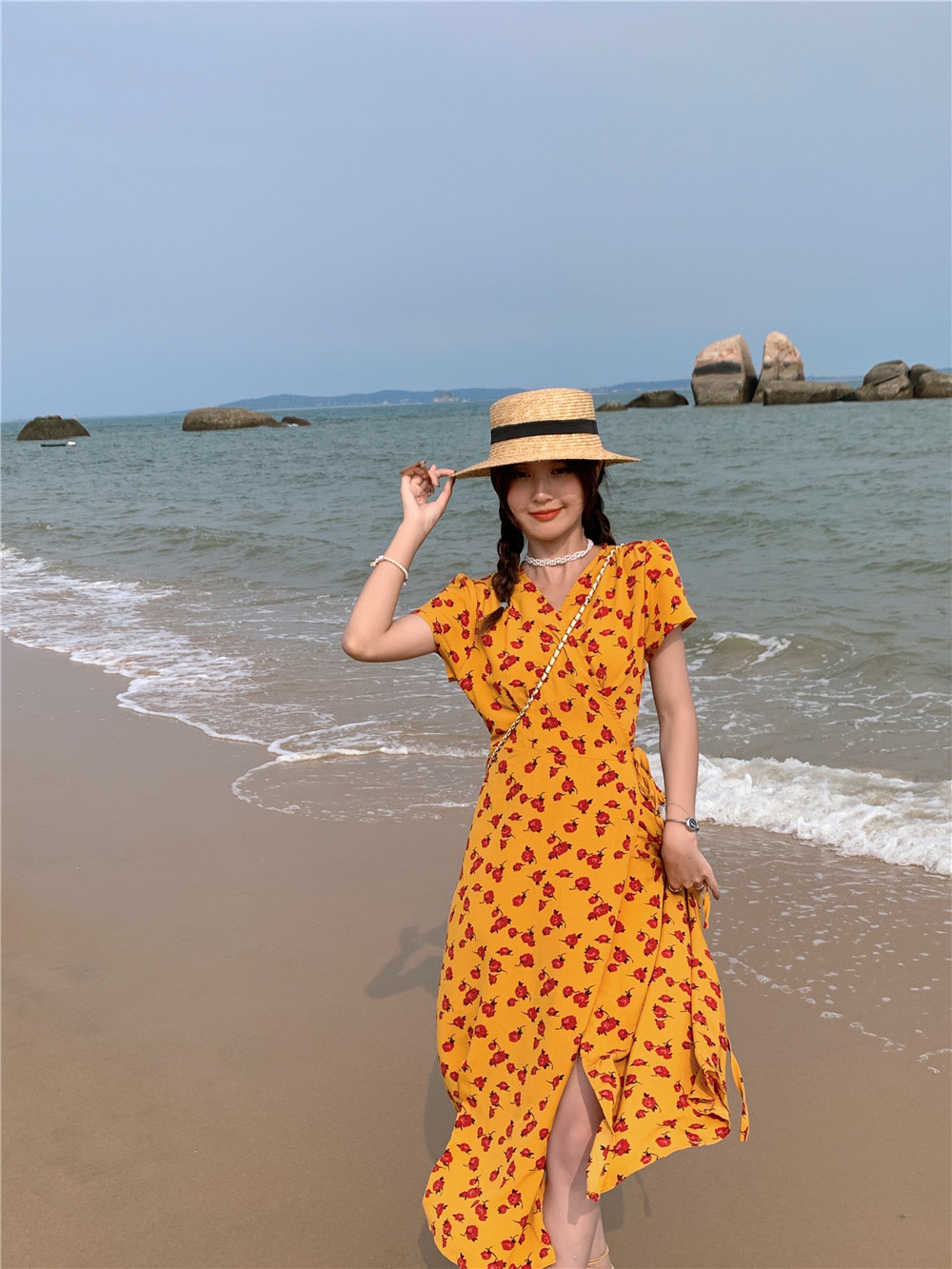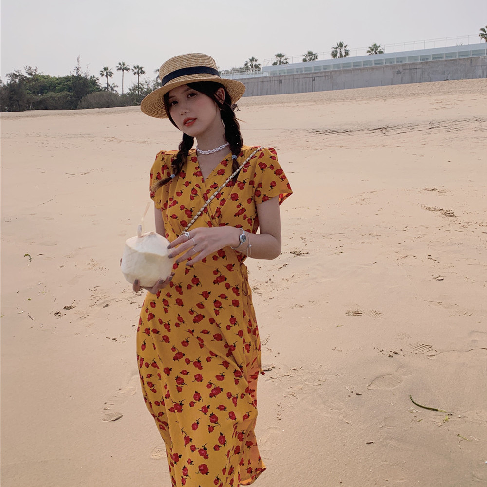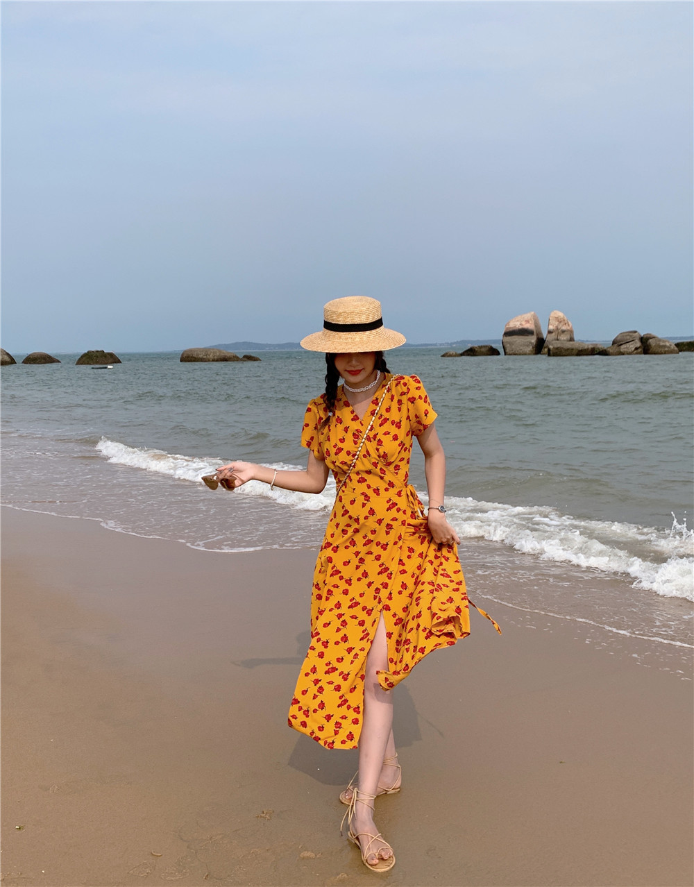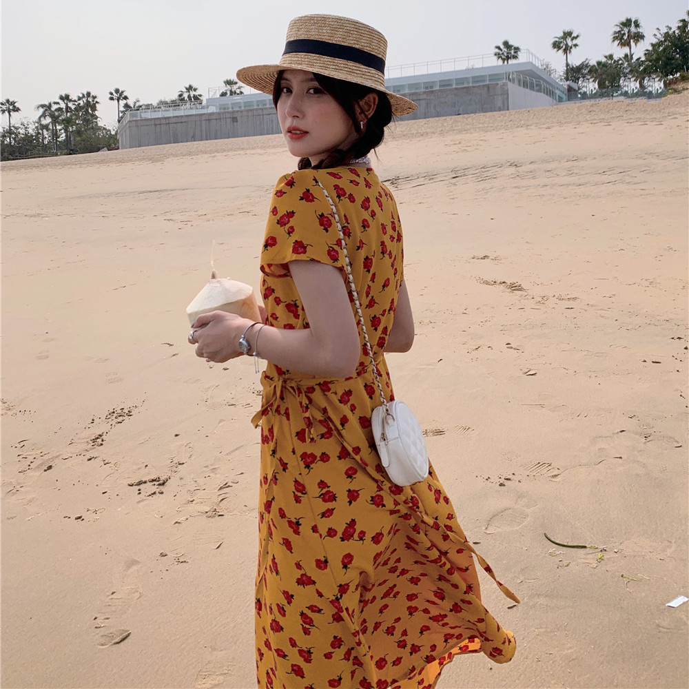 MY16121#大码法式一片式裹胸收腰显瘦黄碎花桔梗裙气质海边旅游度假沙滩裙女裝貨源服裝批發