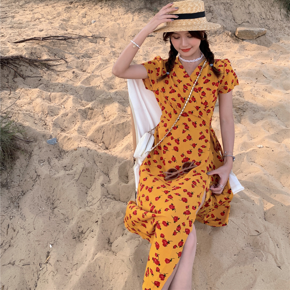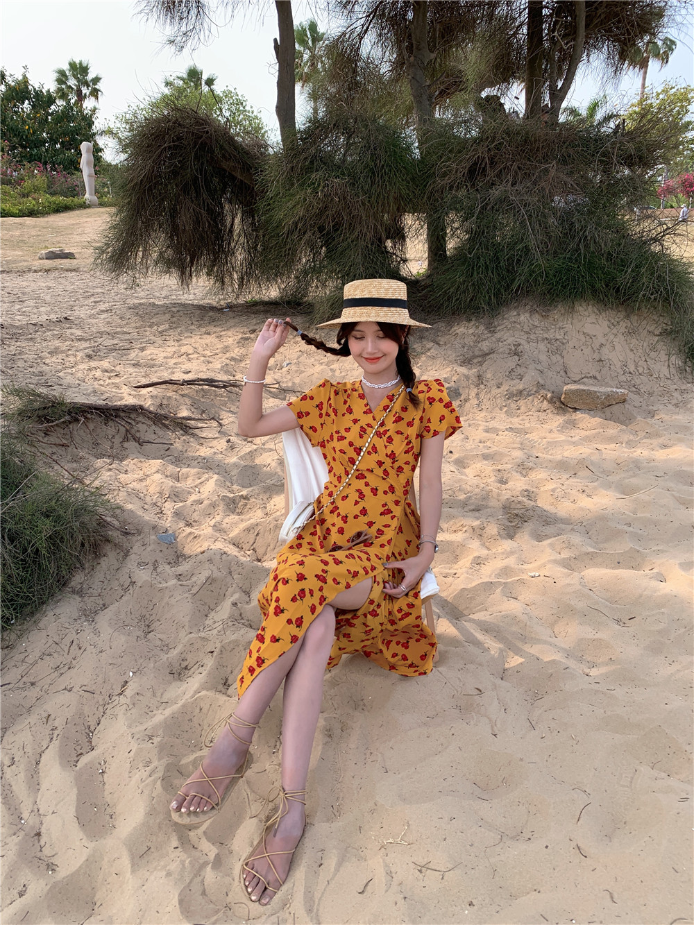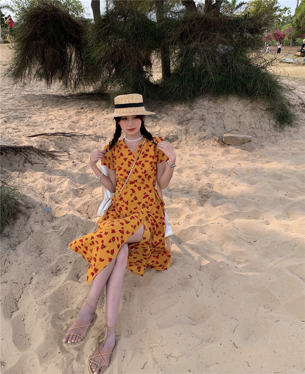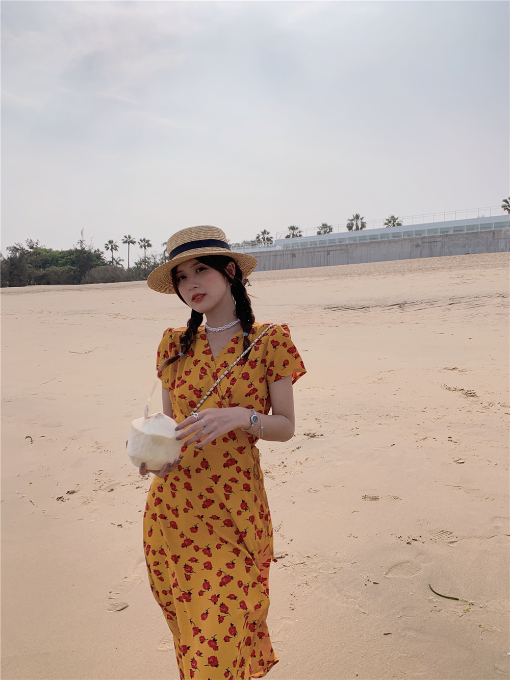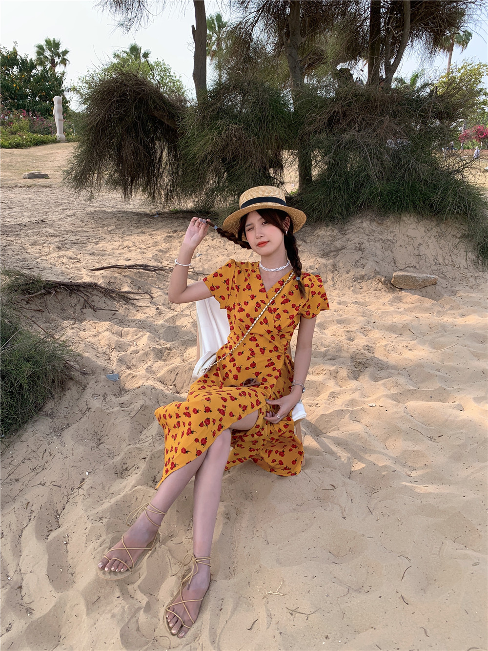 MY16121#大码法式一片式裹胸收腰显瘦黄碎花桔梗裙气质海边旅游度假沙滩裙女裝貨源服裝批發