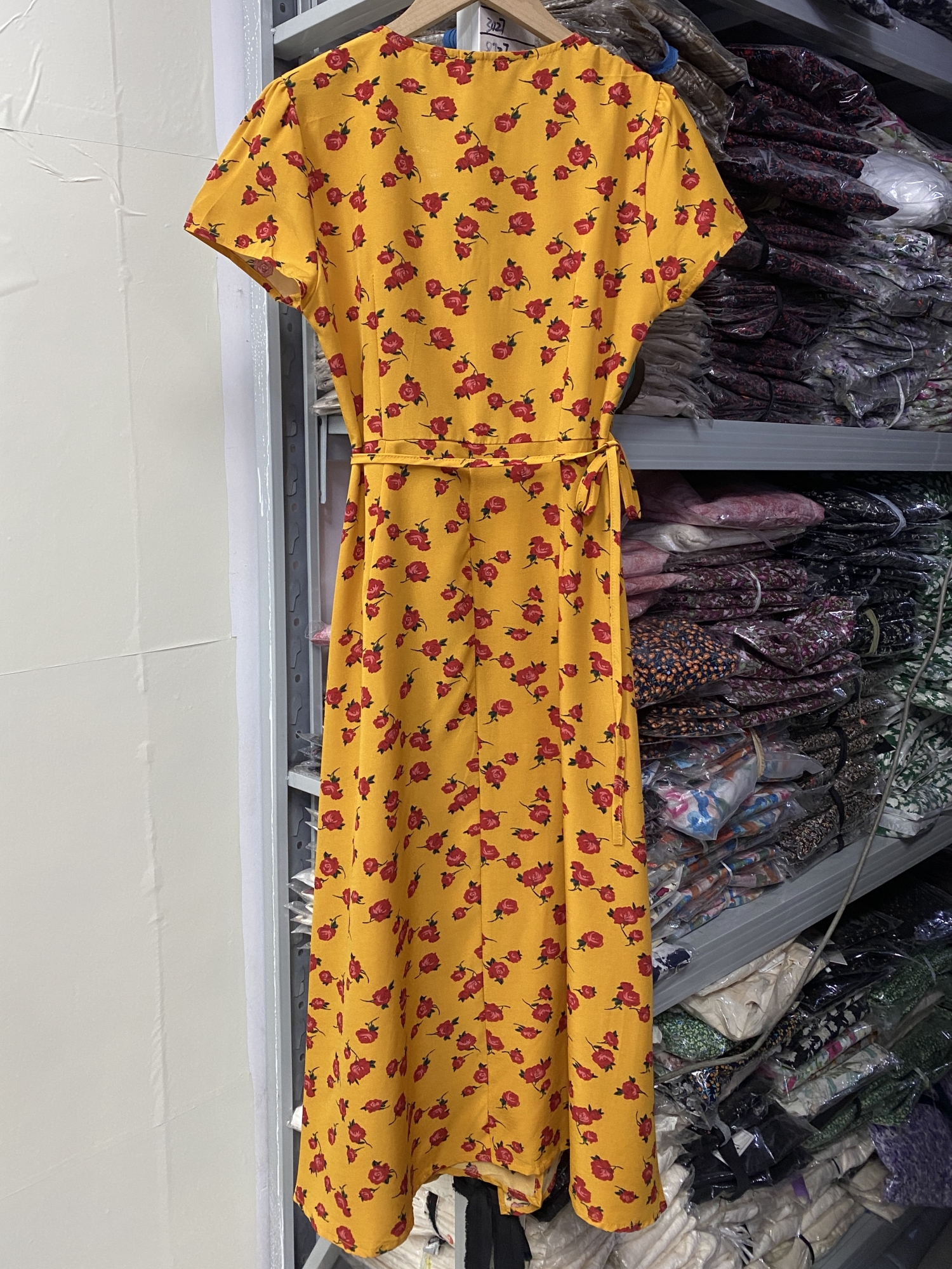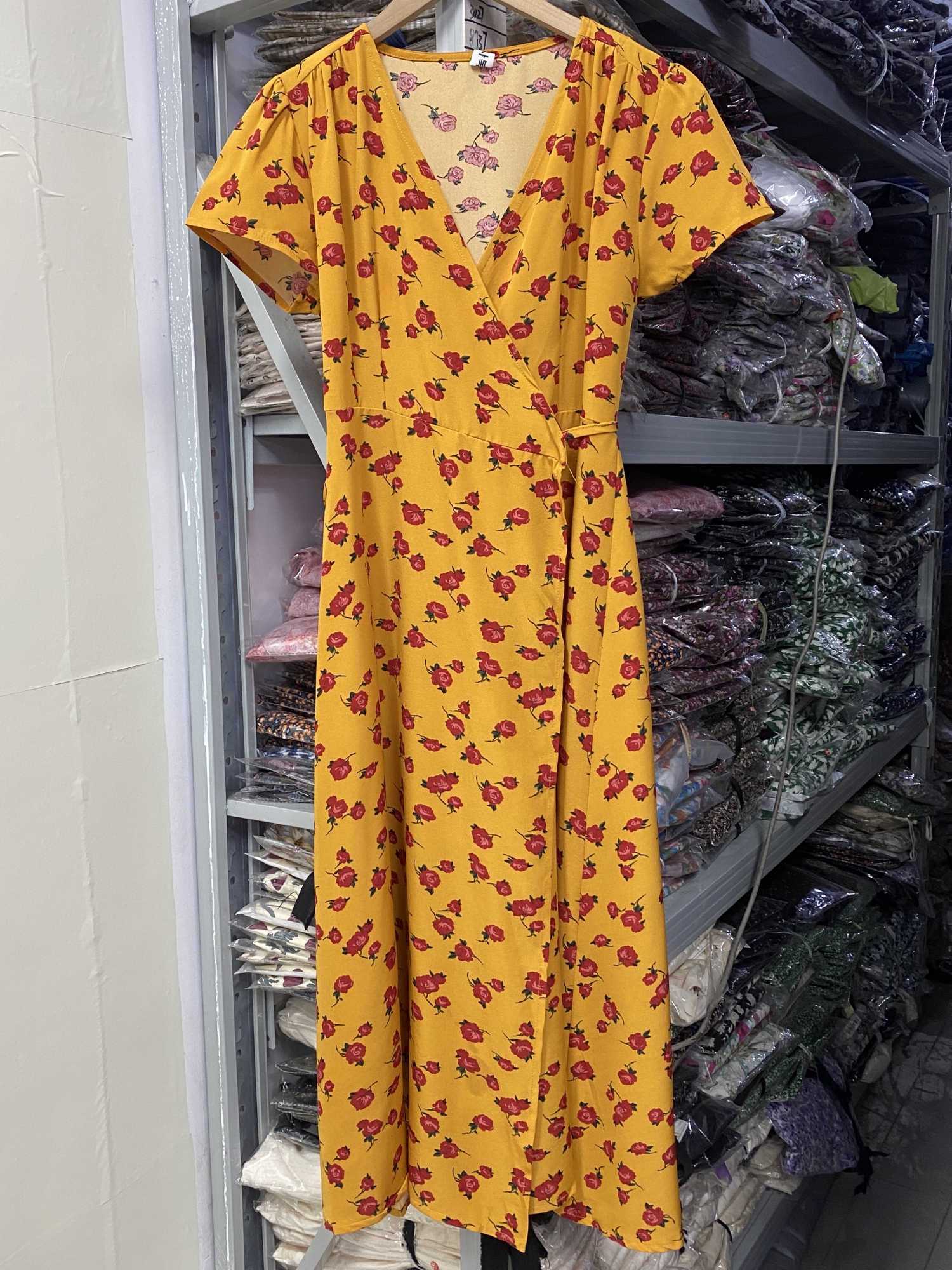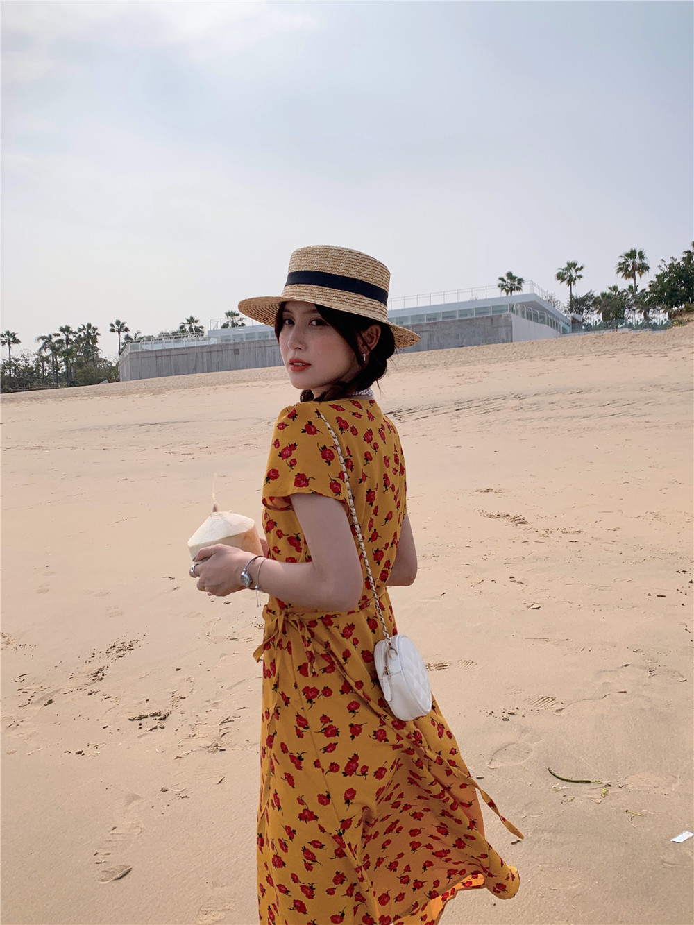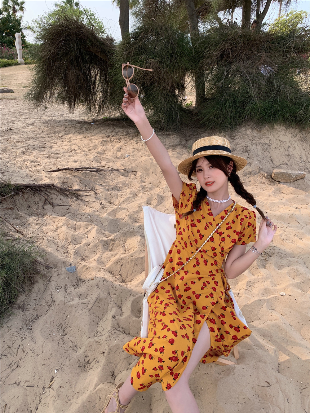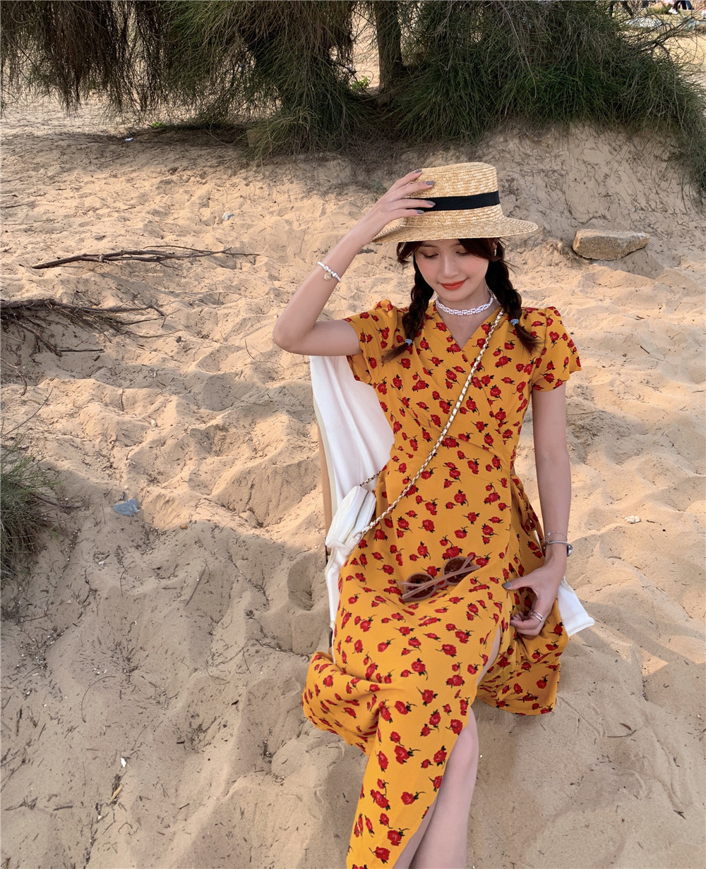 MY16121#大码法式一片式裹胸收腰显瘦黄碎花桔梗裙气质海边旅游度假沙滩裙女裝貨源服裝批發