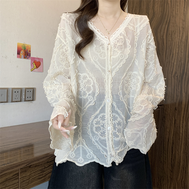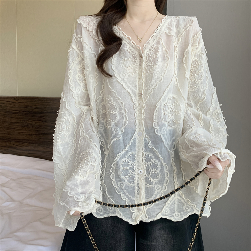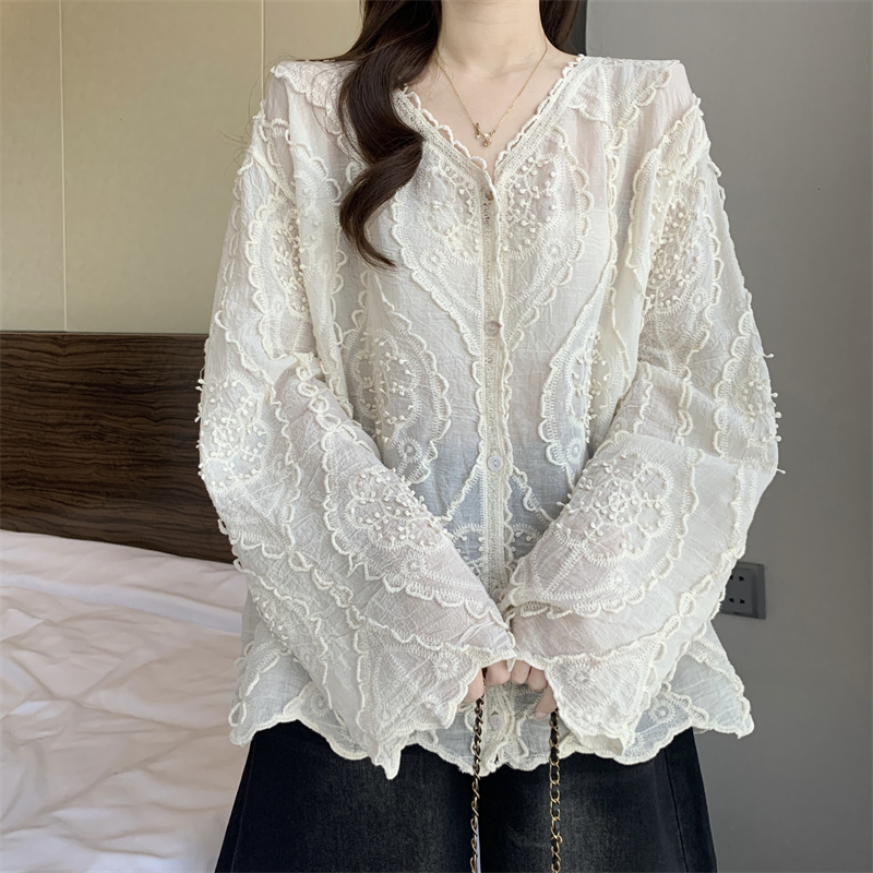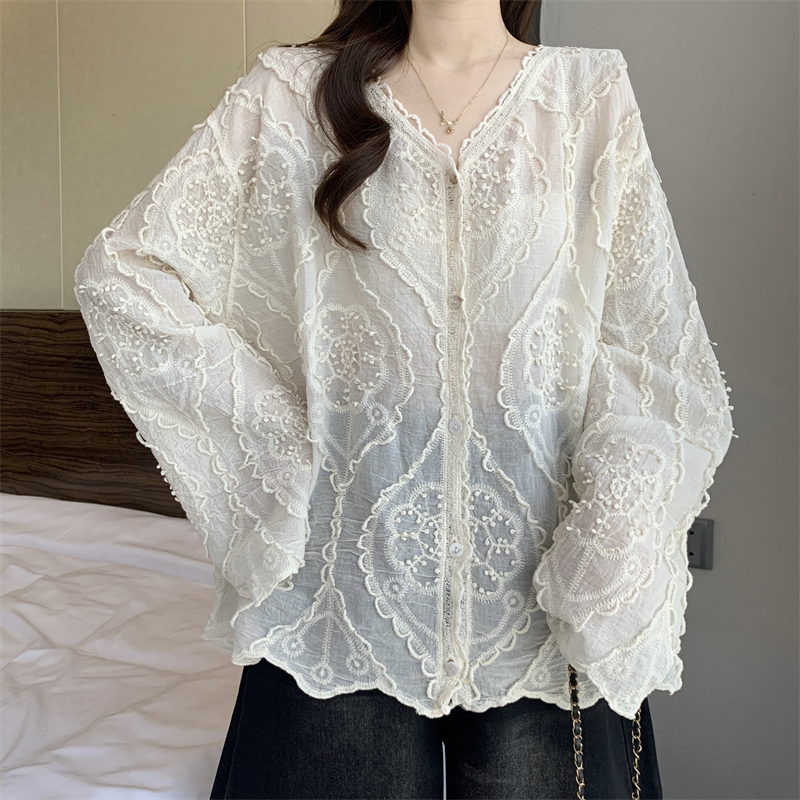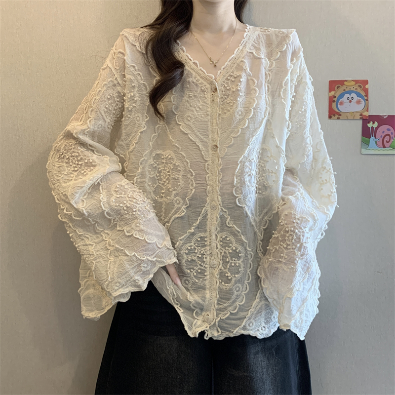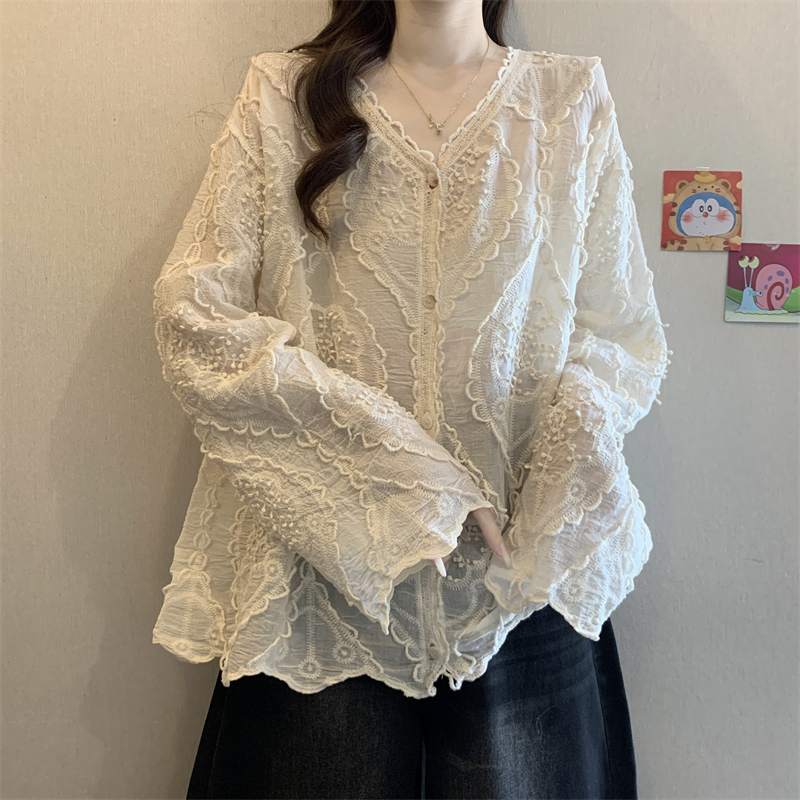 MY16127#大码法式设计感蕾丝刺绣V领衬衫女早春遮肚防晒气质上衣女裝貨源服裝批發