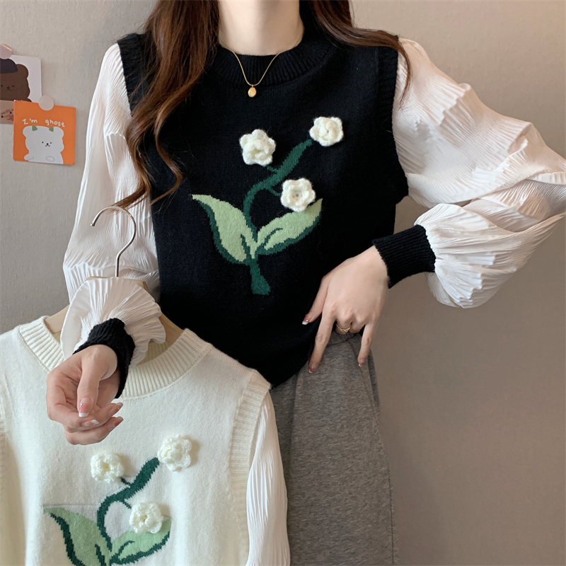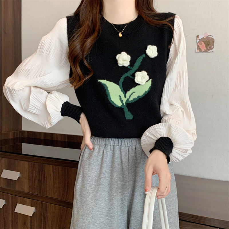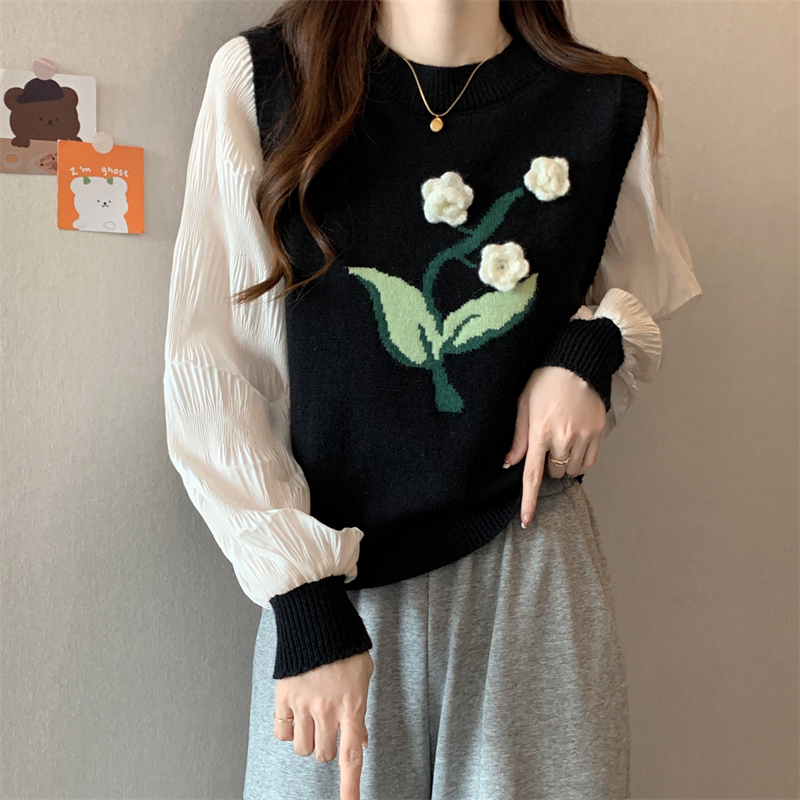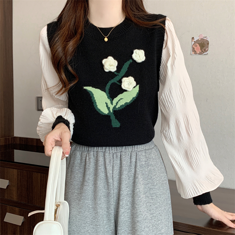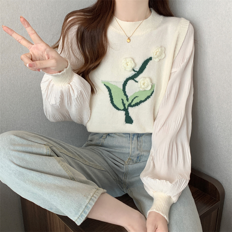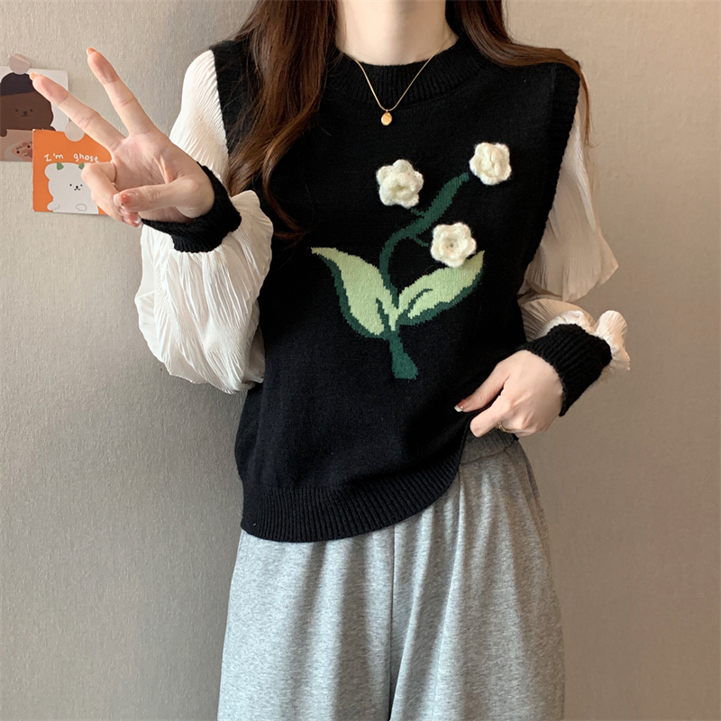 MY16129#大码法式假两件长袖毛衣新款遮肚显瘦针织衫上衣女裝貨源服裝批發