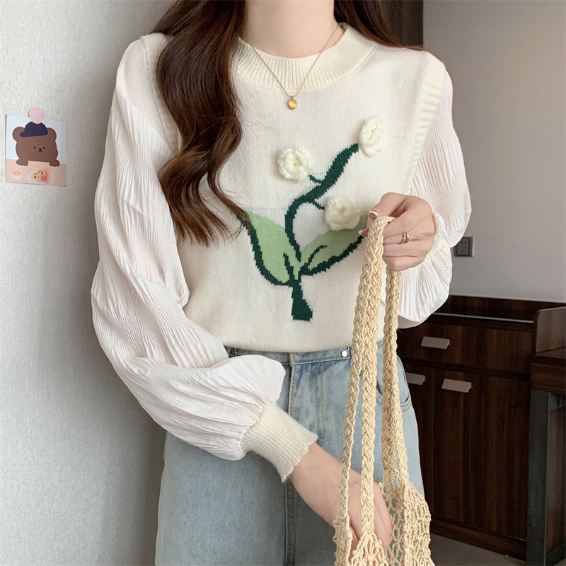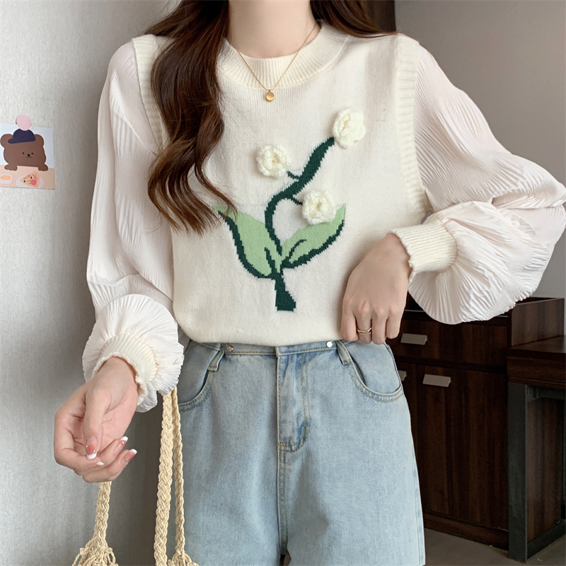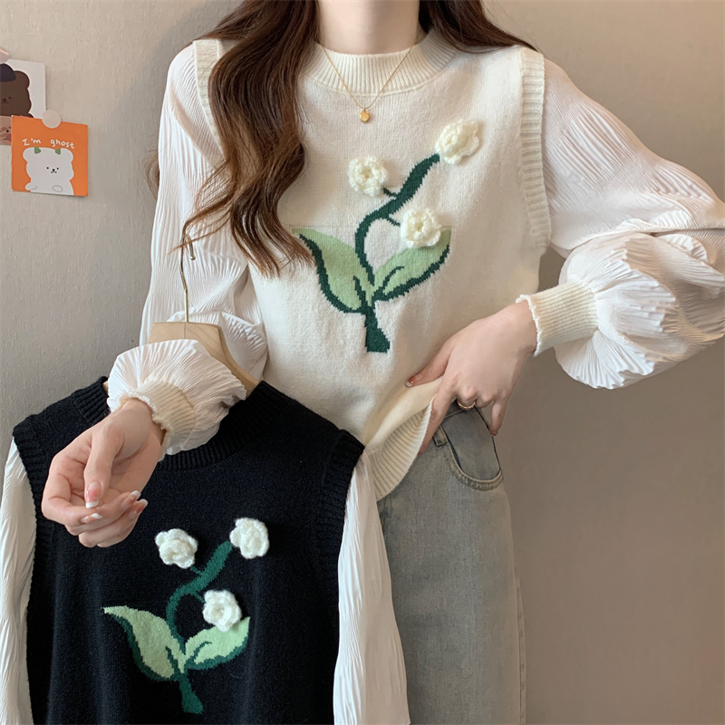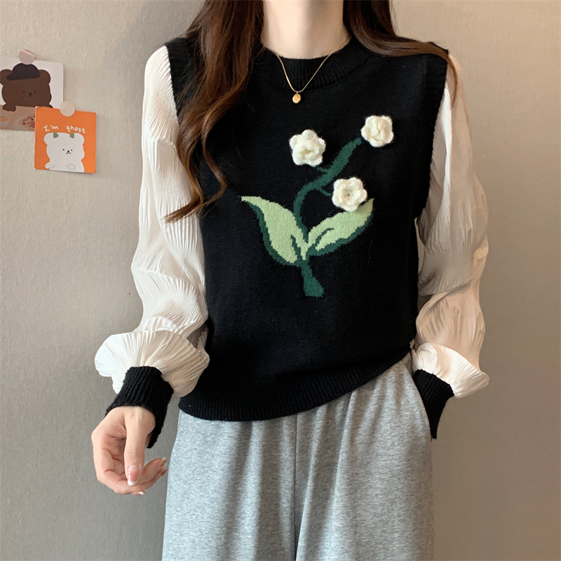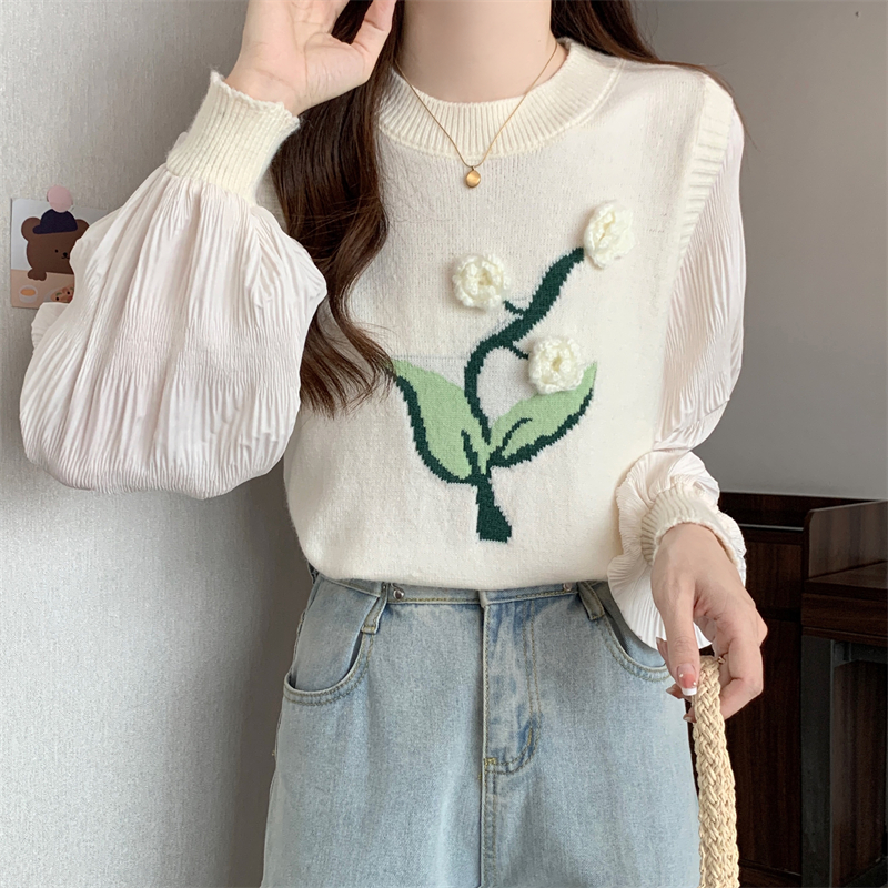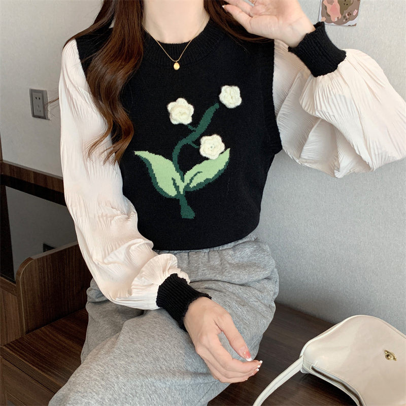 MY16129#大码法式假两件长袖毛衣新款遮肚显瘦针织衫上衣女裝貨源服裝批發