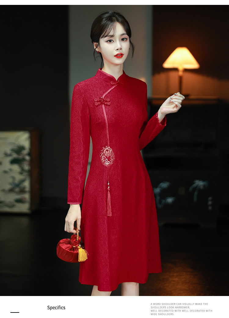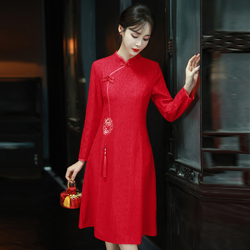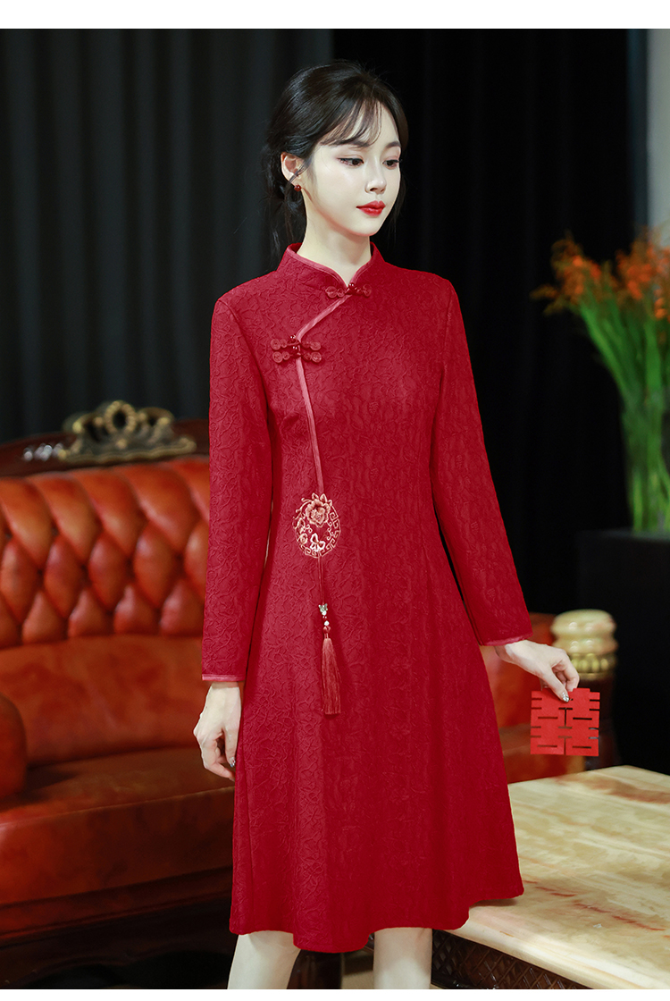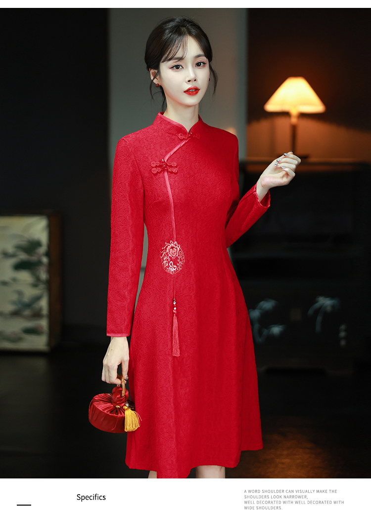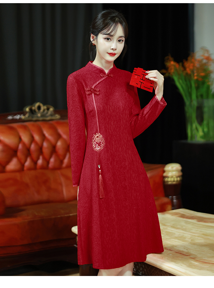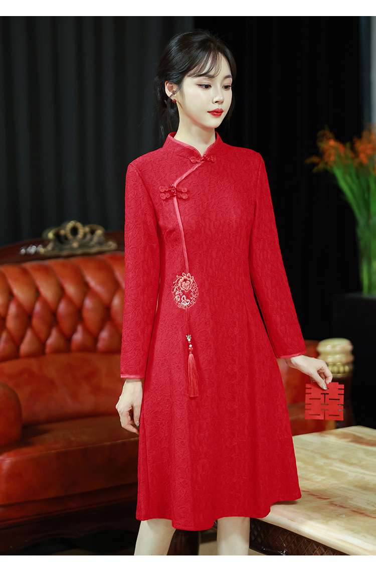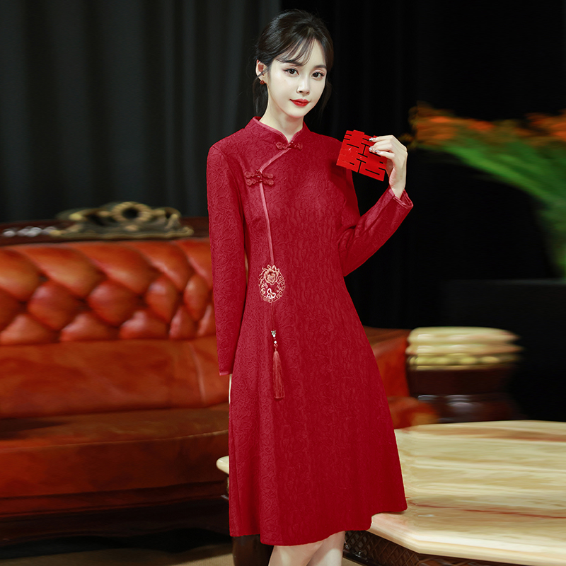 MY16137#新款国风红色大码旗袍新娘敬酒服回门复古高级感连衣裙长袖女裝貨源服裝批發