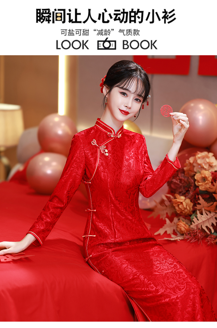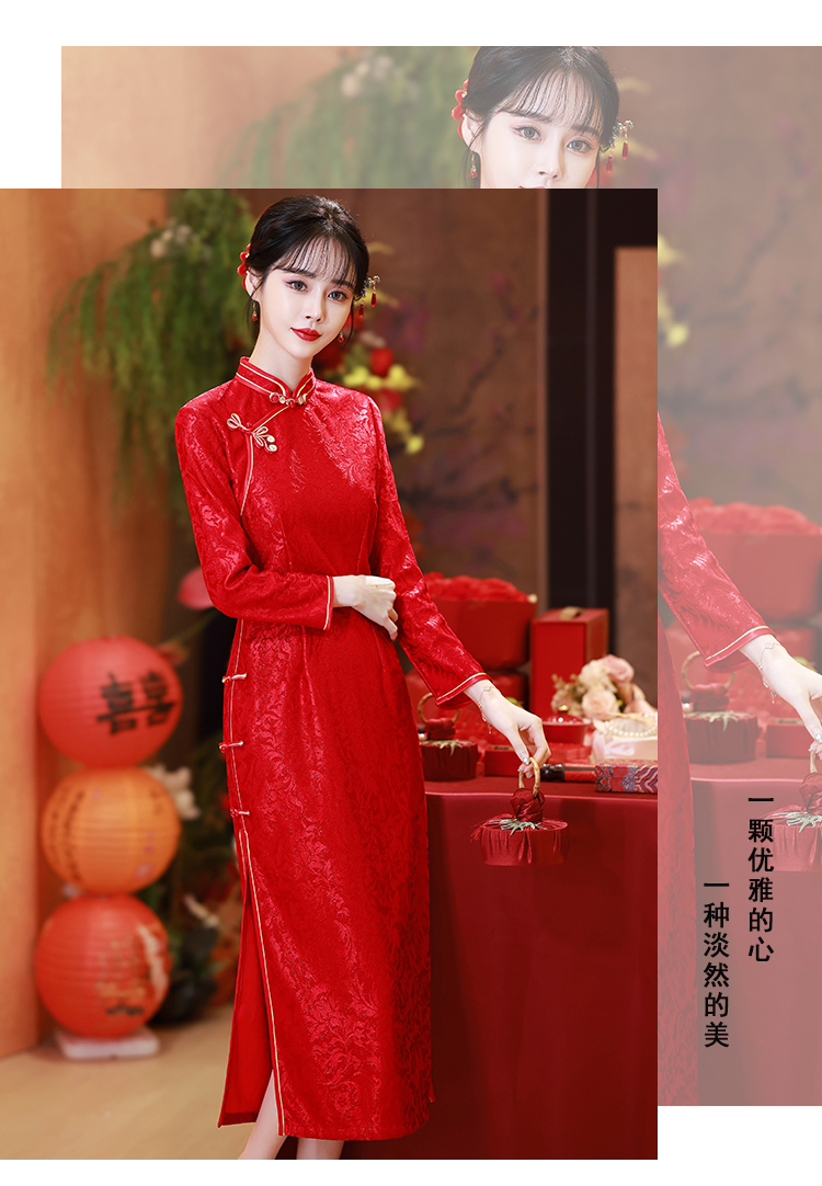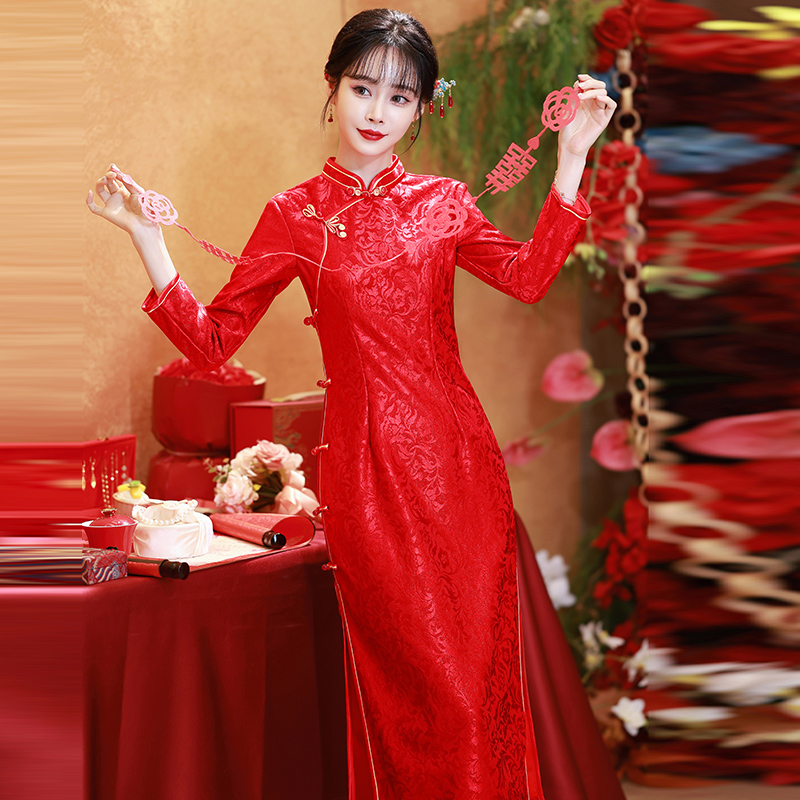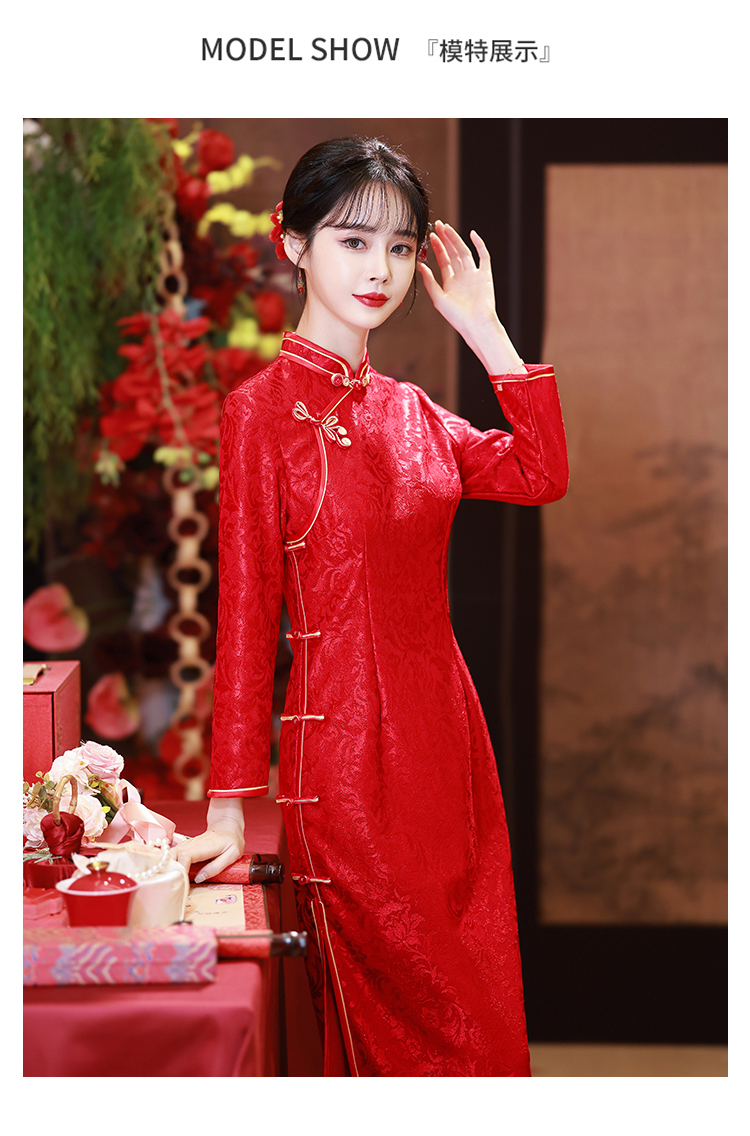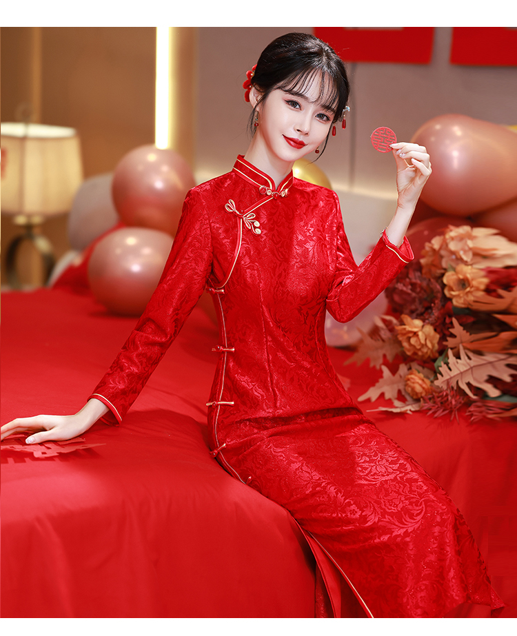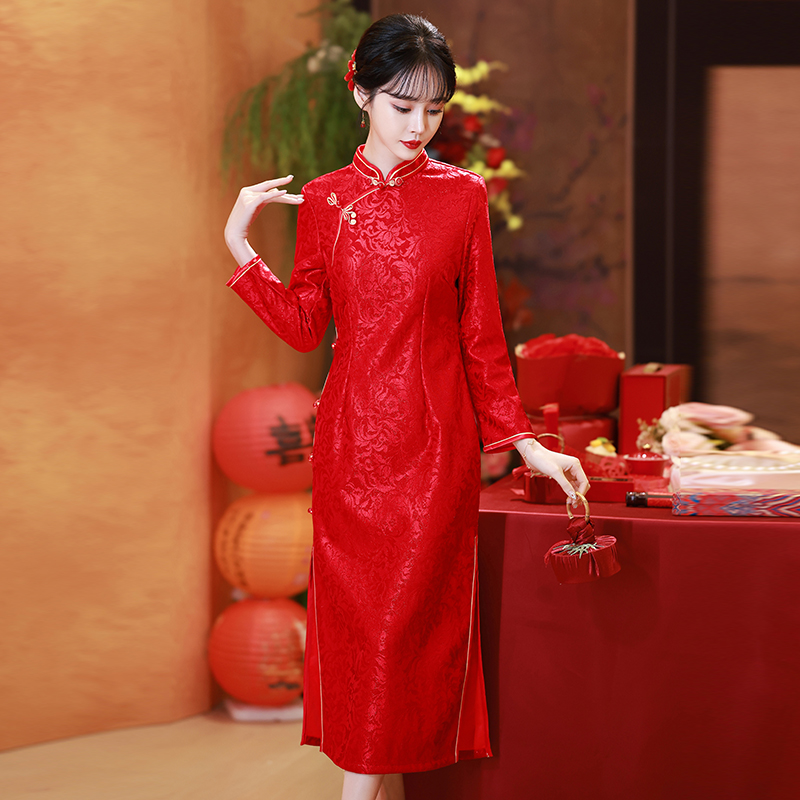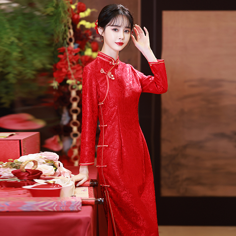 MY16138#新款改良旗袍敬酒服回娘家红色结婚订婚新中式礼服长袖女裝貨源服裝批發