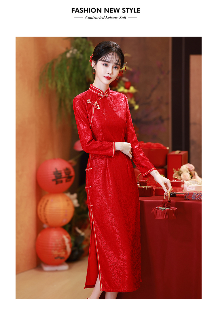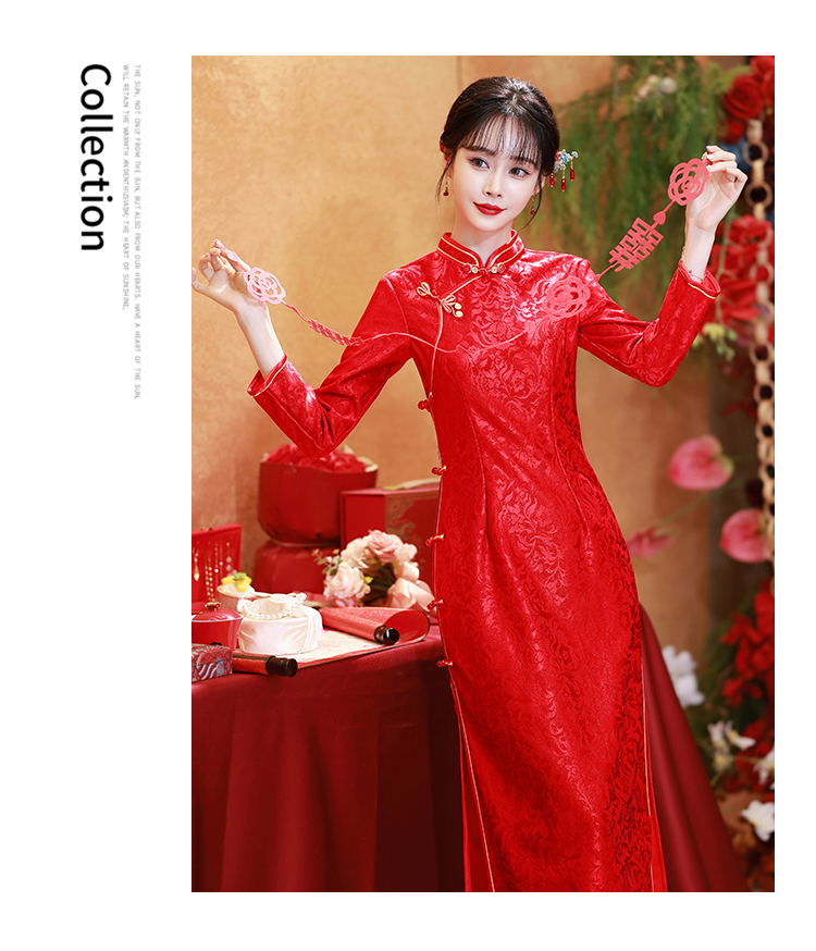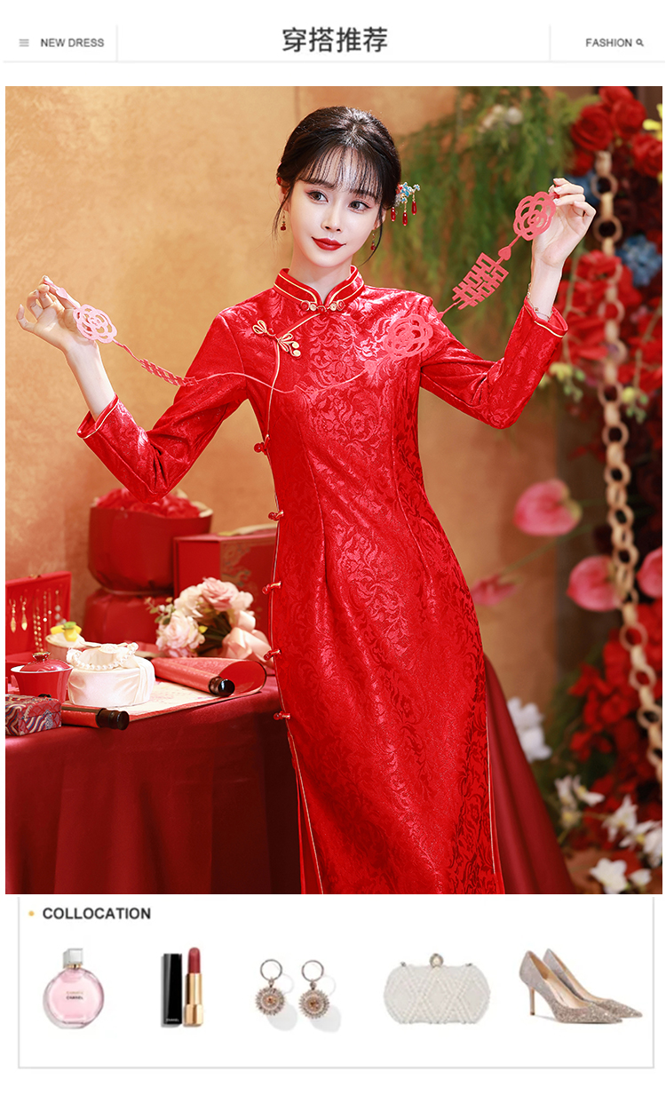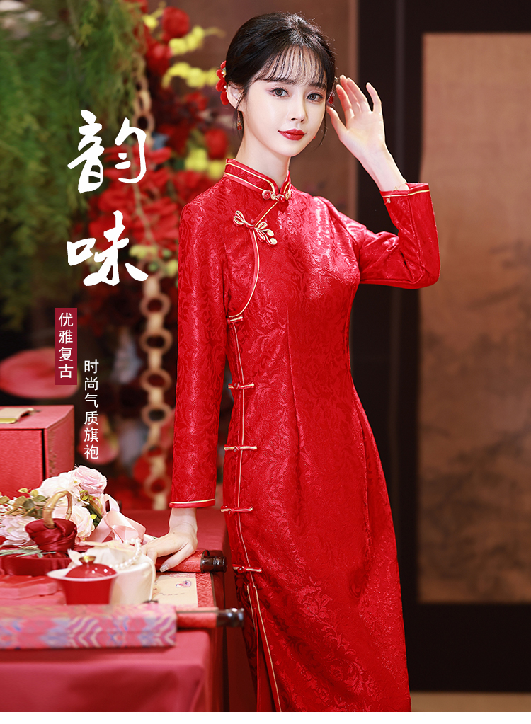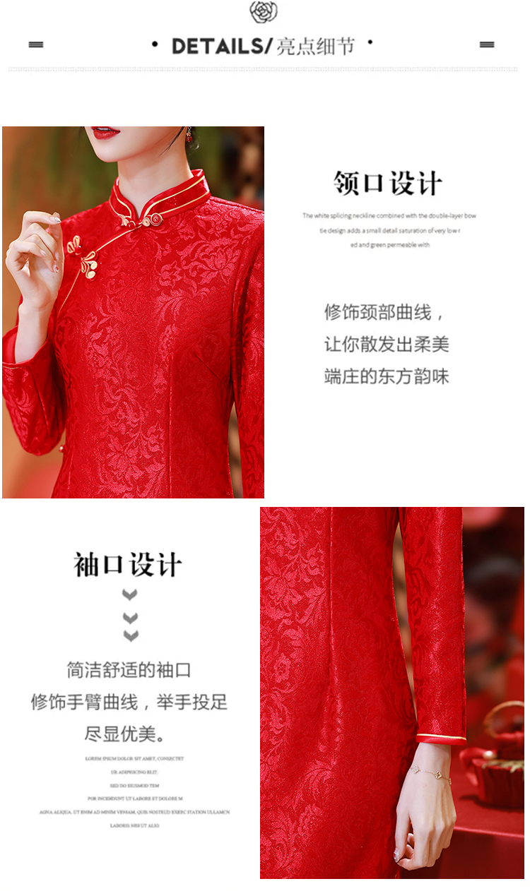 MY16138#新款改良旗袍敬酒服回娘家红色结婚订婚新中式礼服长袖女裝貨源服裝批發