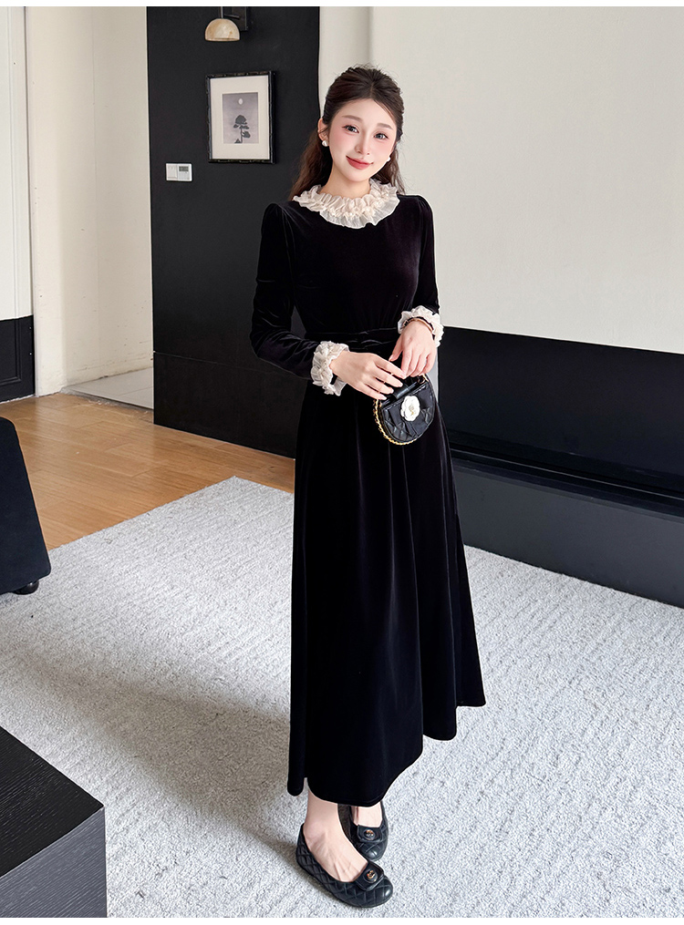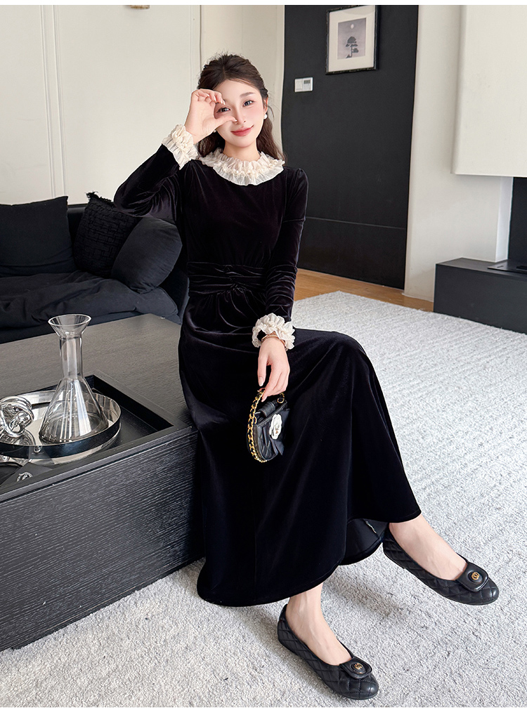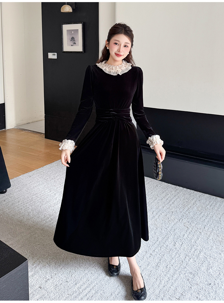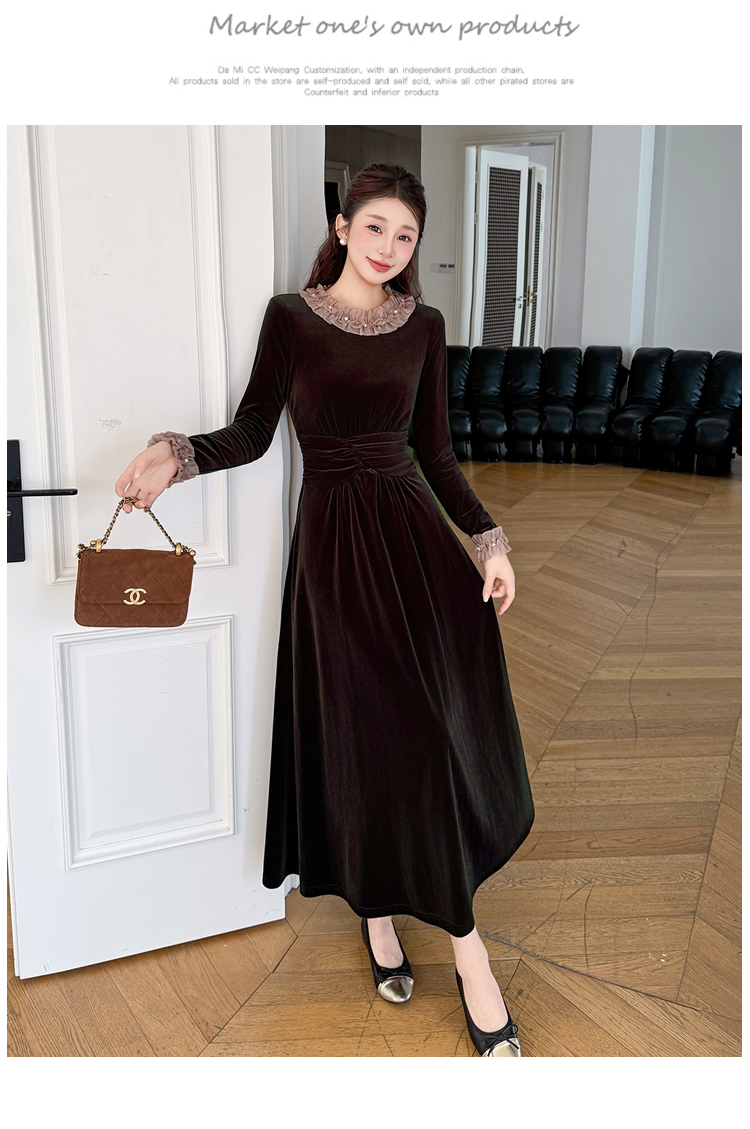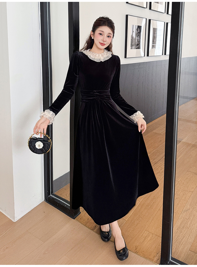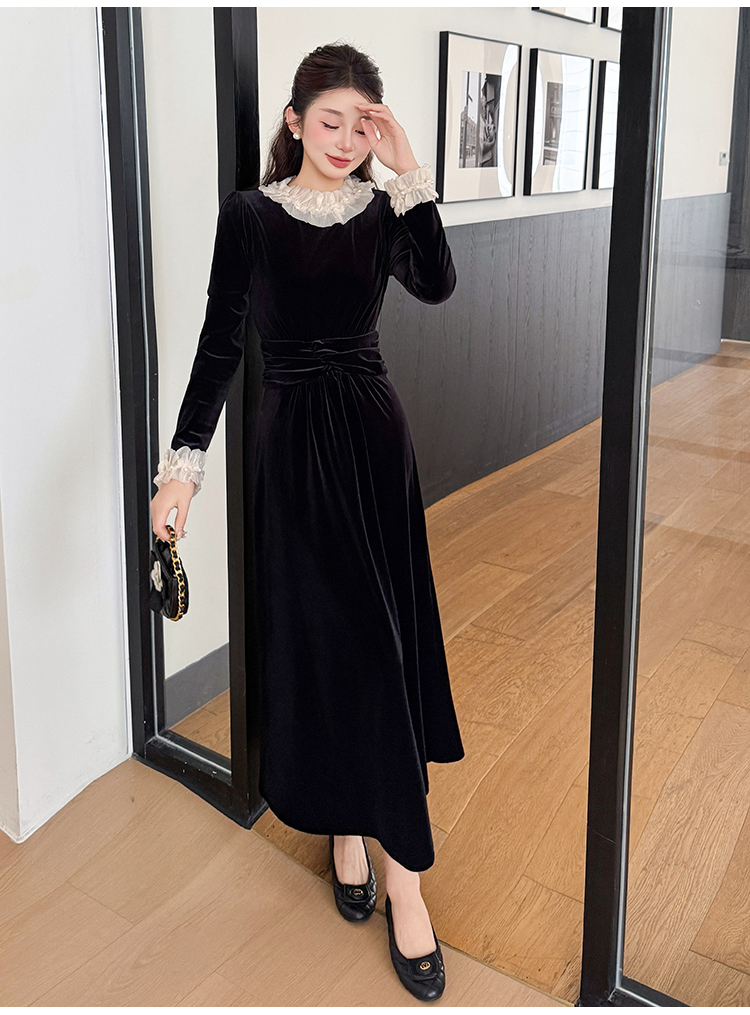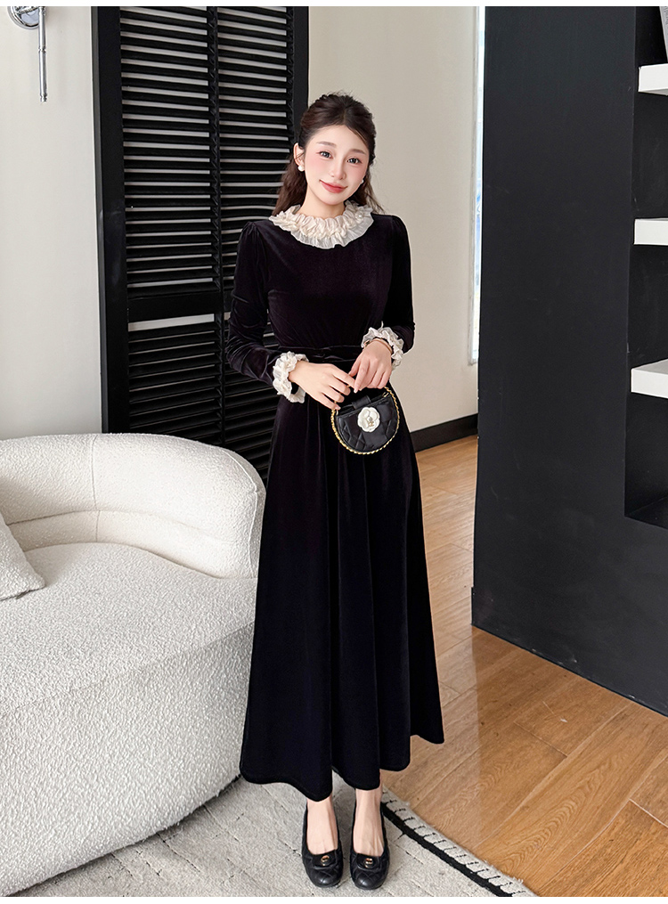MY16142#固色丝绒法式气质复古收腰显瘦优雅木耳边拼接大摆连衣裙女裝貨源服裝批發