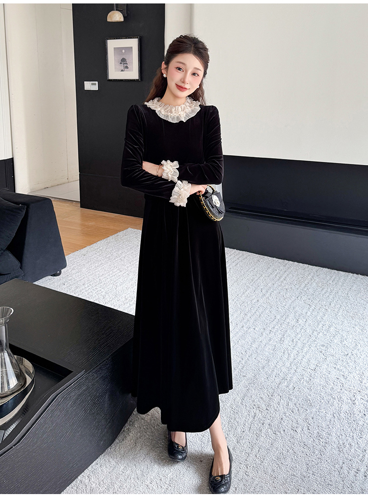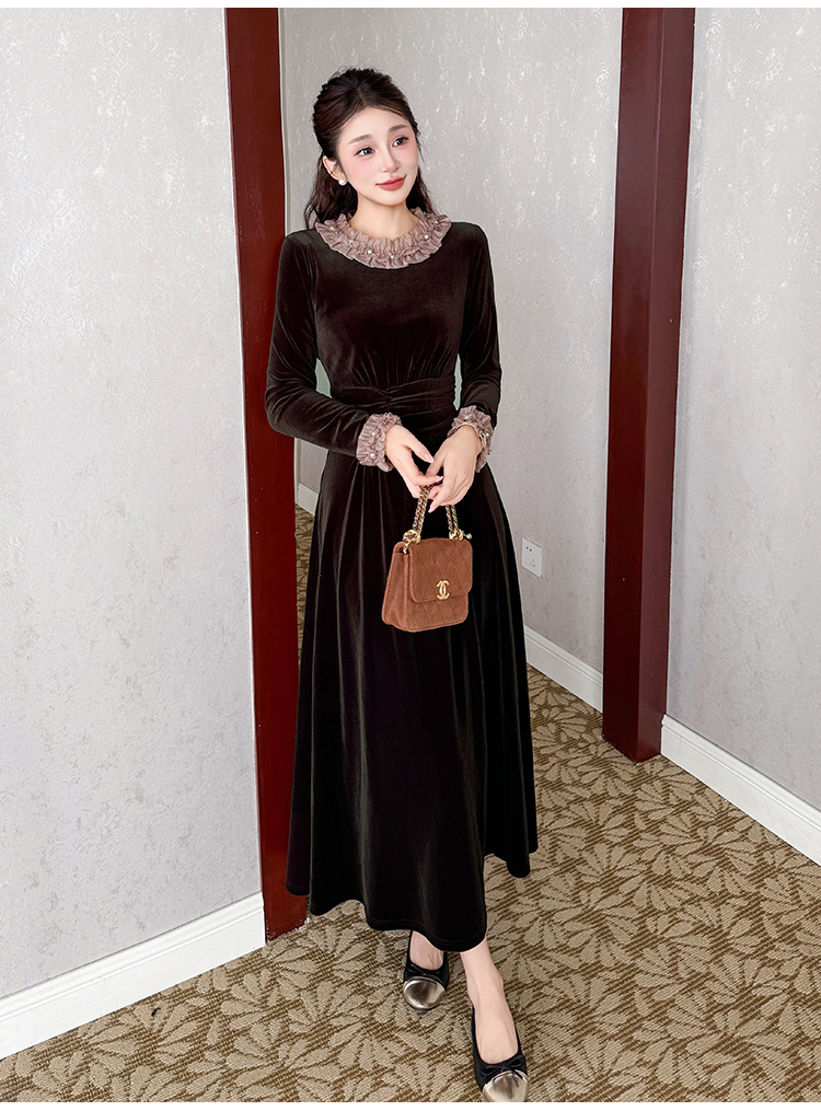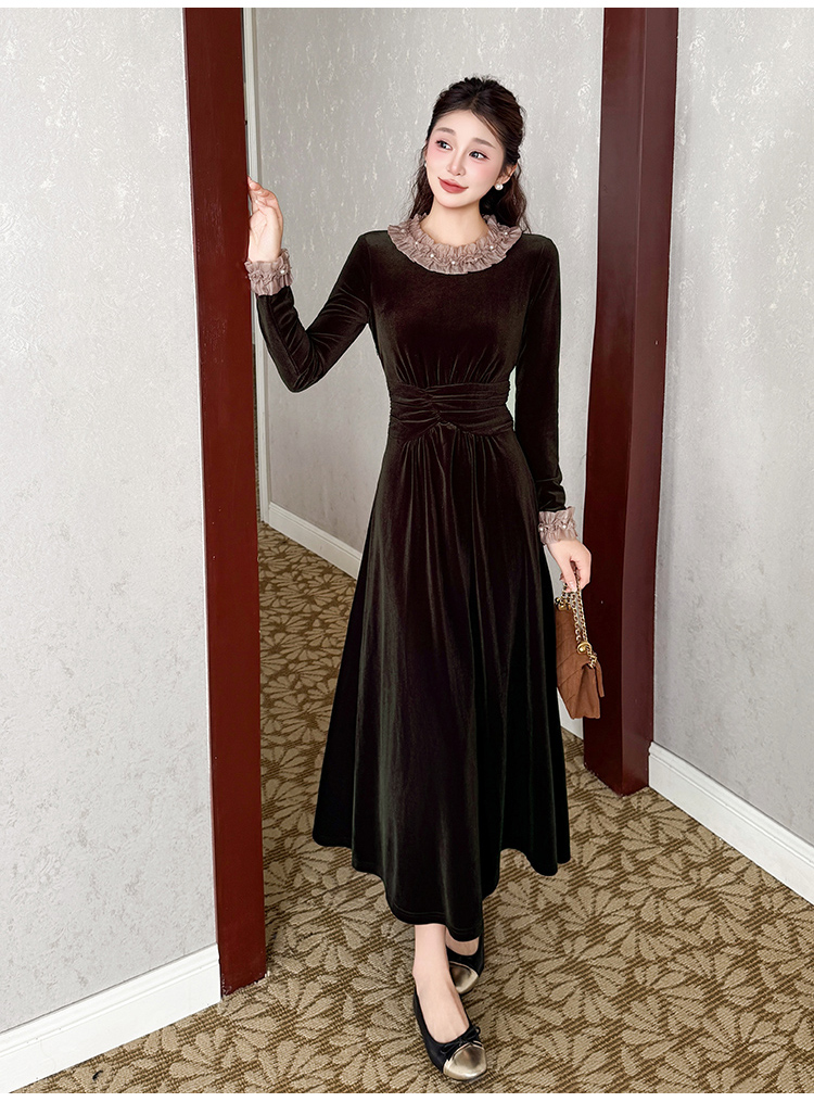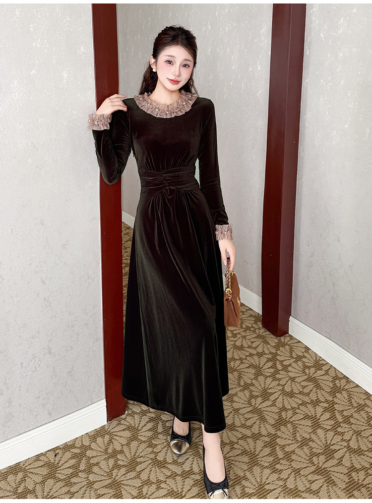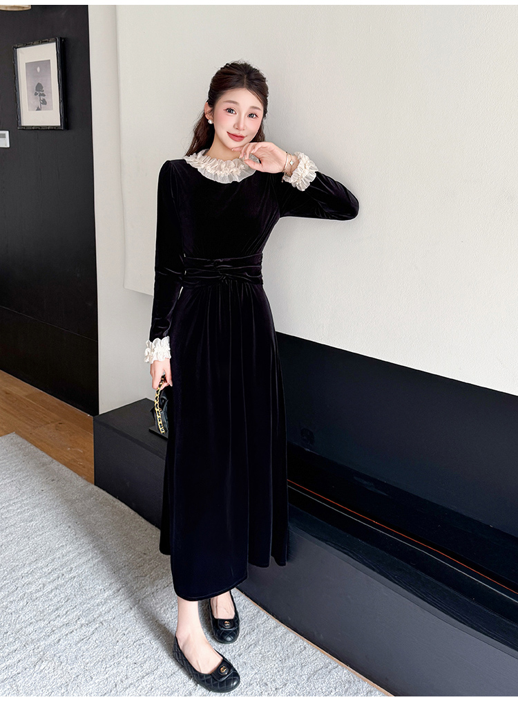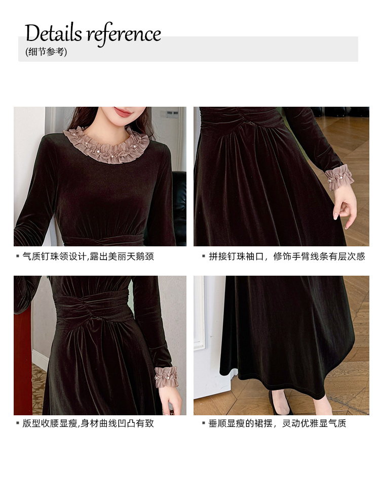 MY16142#固色丝绒法式气质复古收腰显瘦优雅木耳边拼接大摆连衣裙女裝貨源服裝批發
