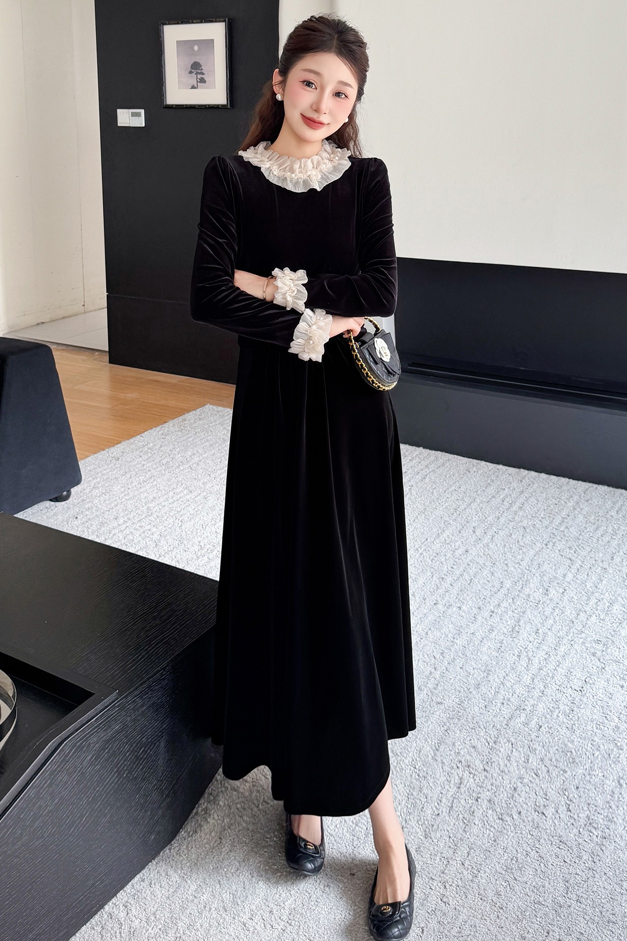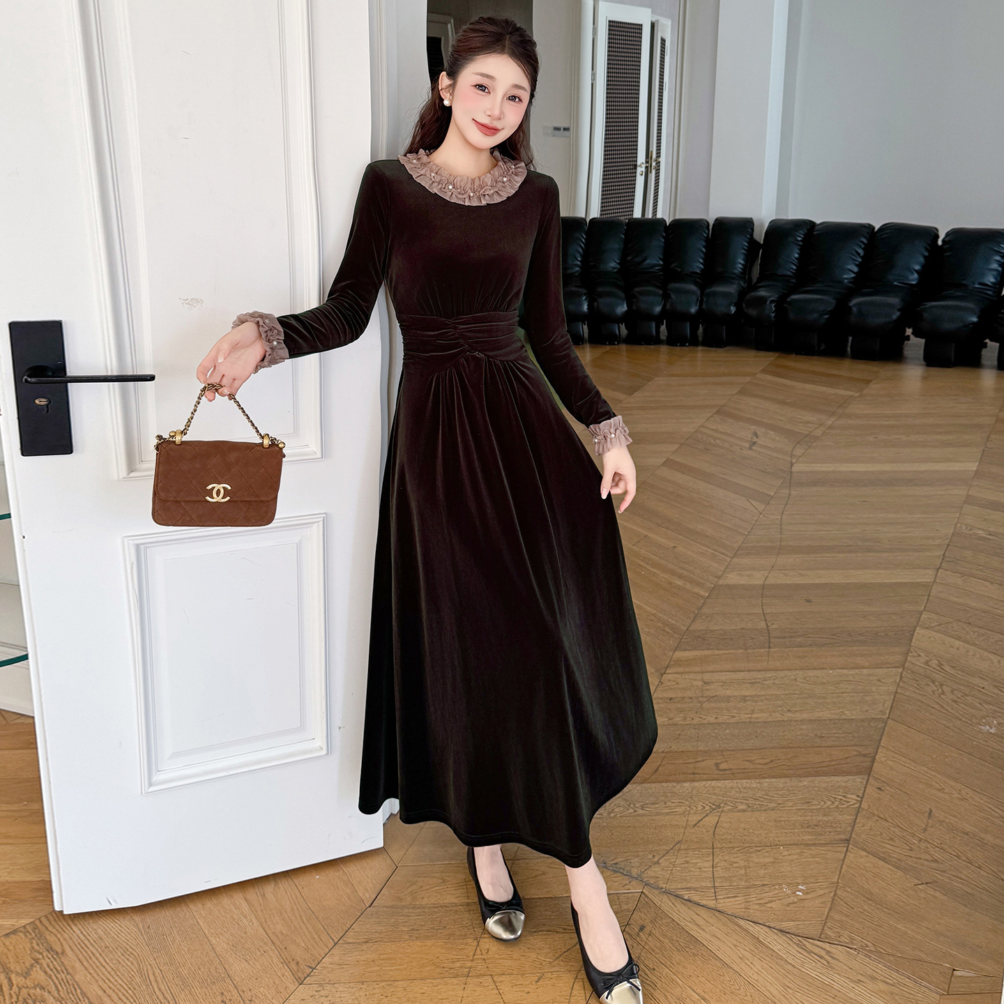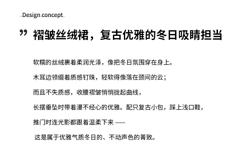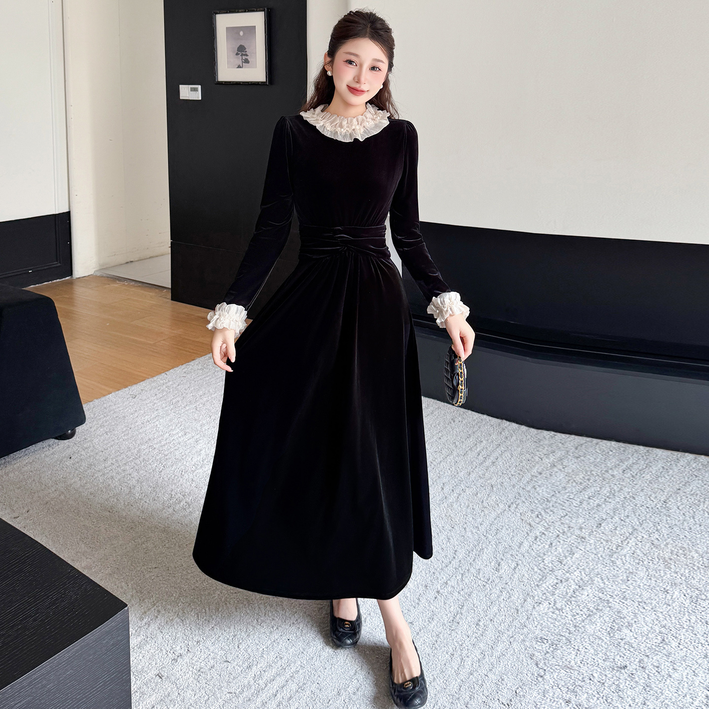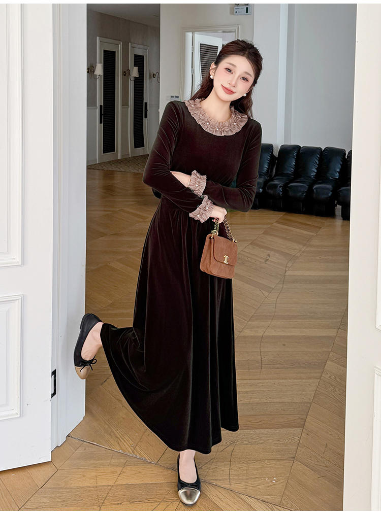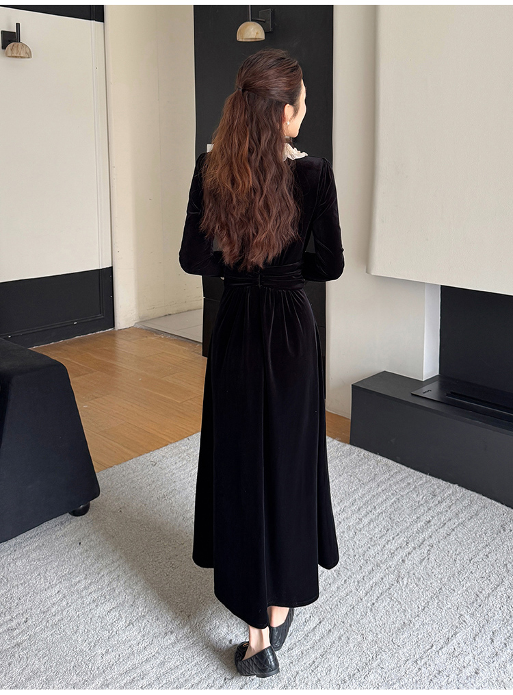 MY16142#固色丝绒法式气质复古收腰显瘦优雅木耳边拼接大摆连衣裙女裝貨源服裝批發