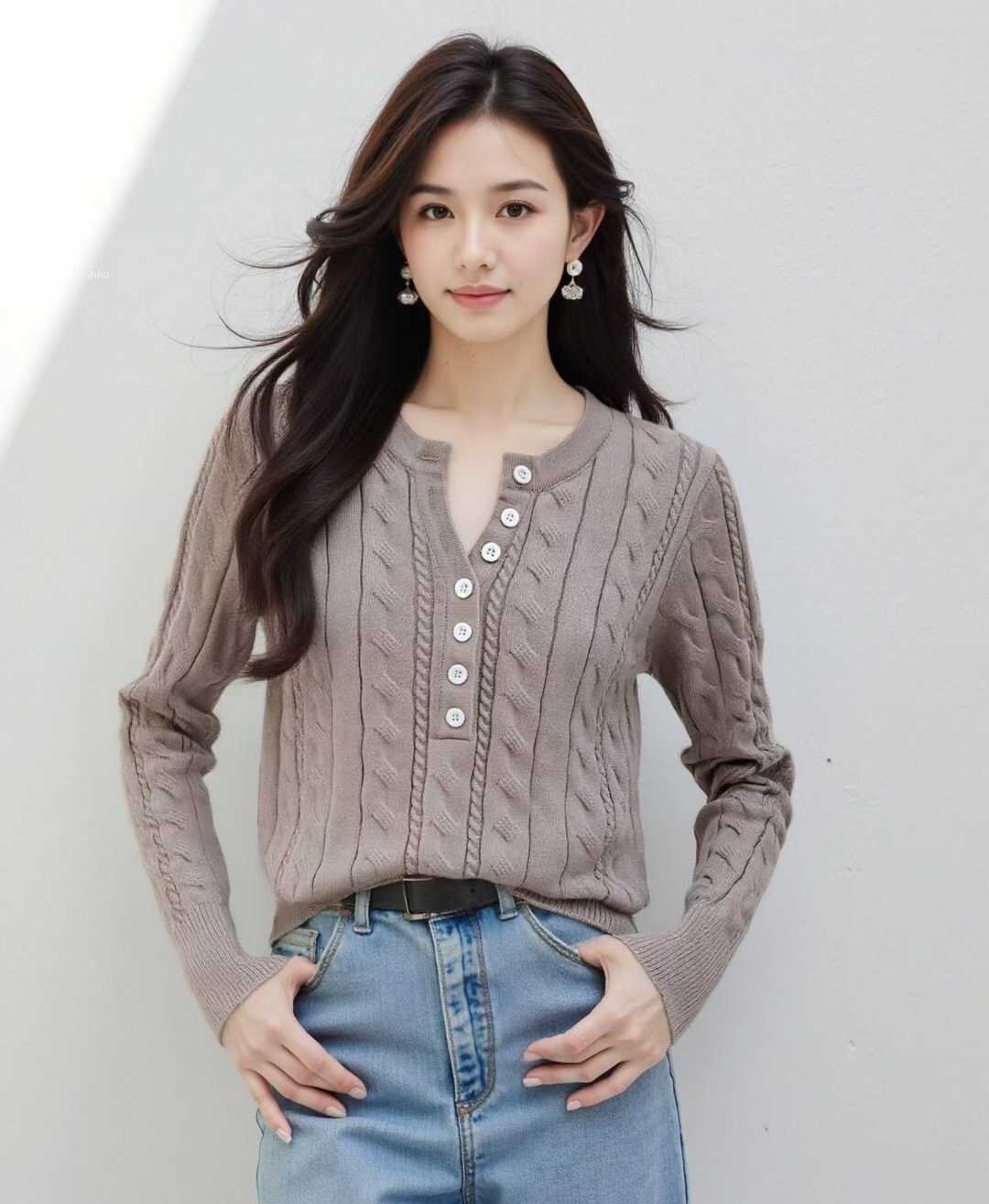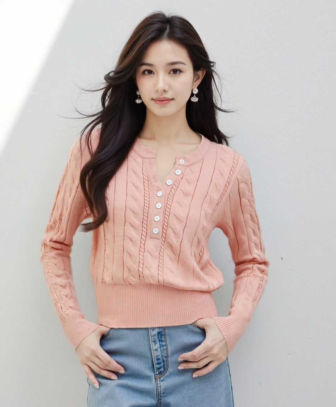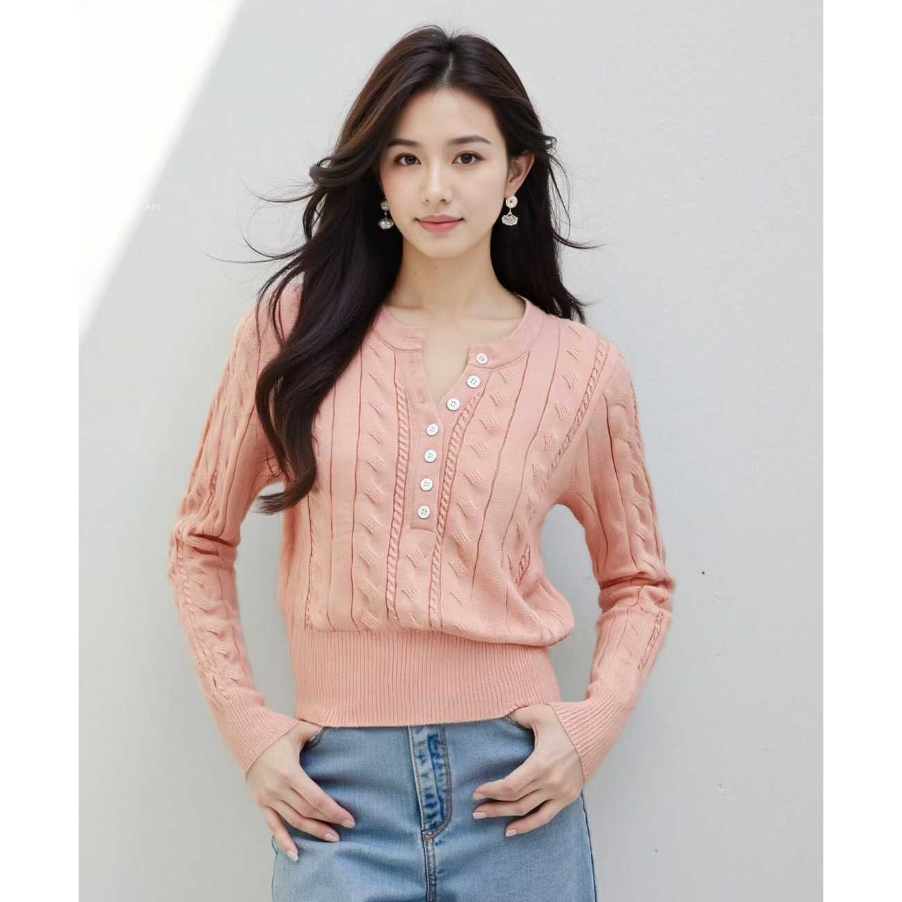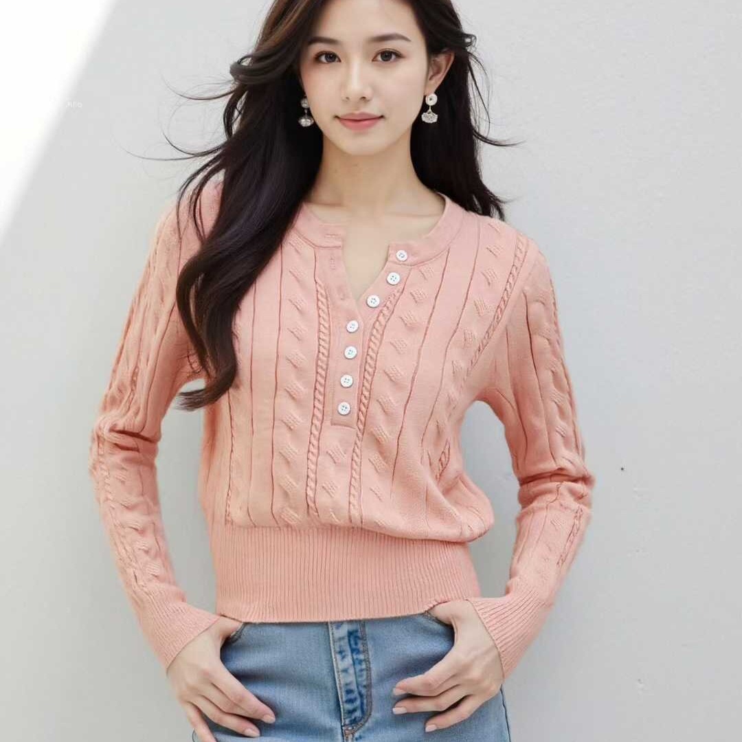 MY16148#法式温柔气质纽扣半开胸坑条显瘦百搭针织长袖女女裝貨源服裝批發