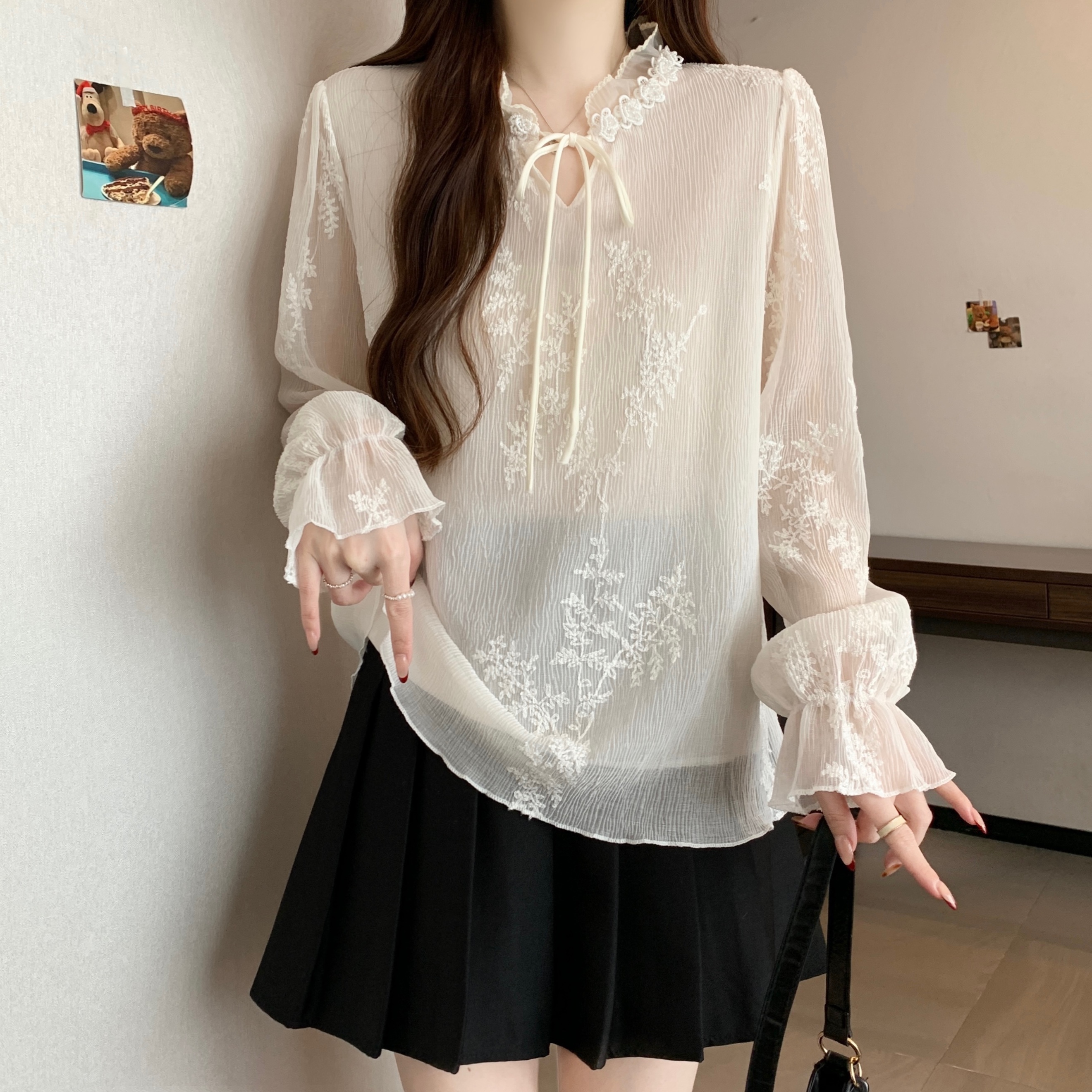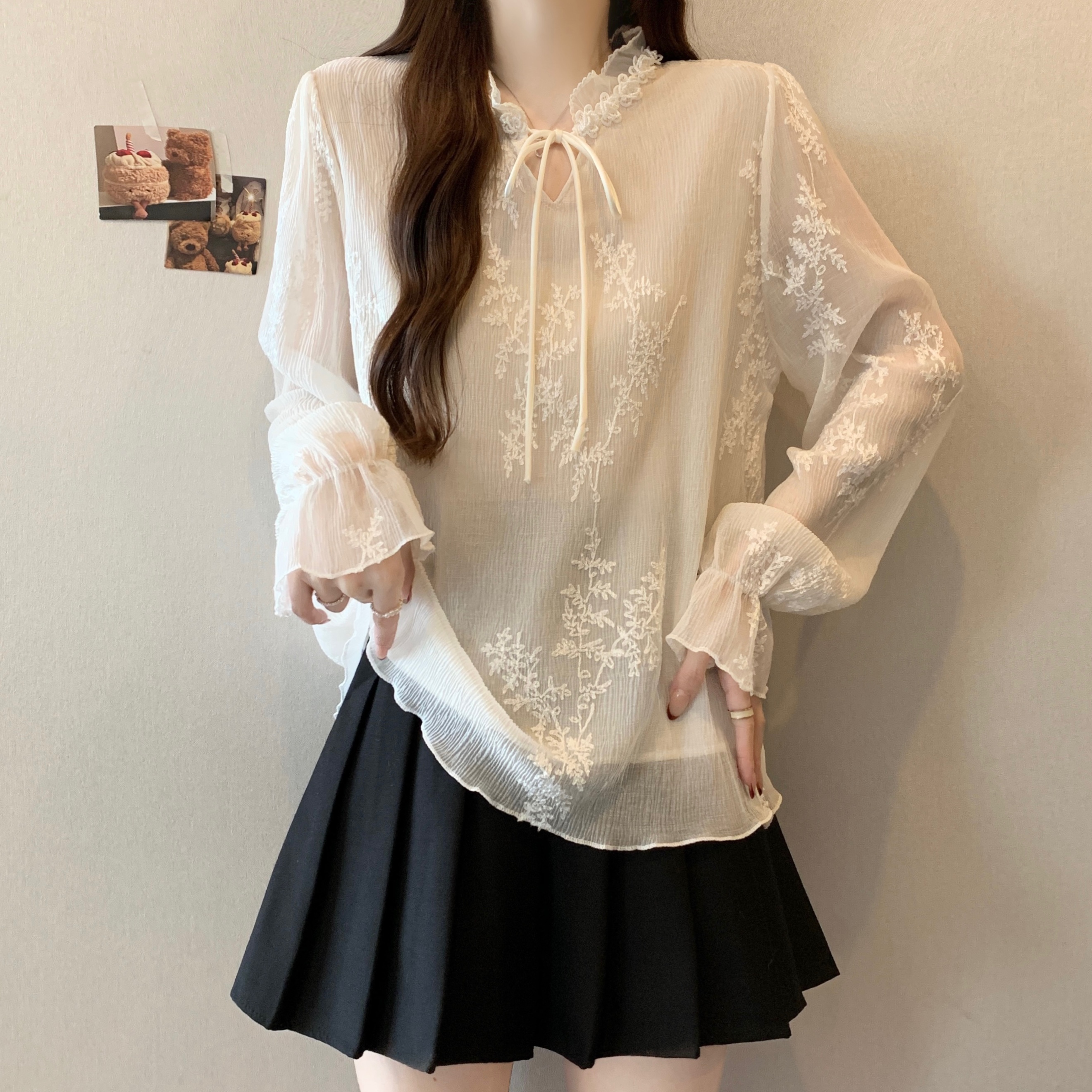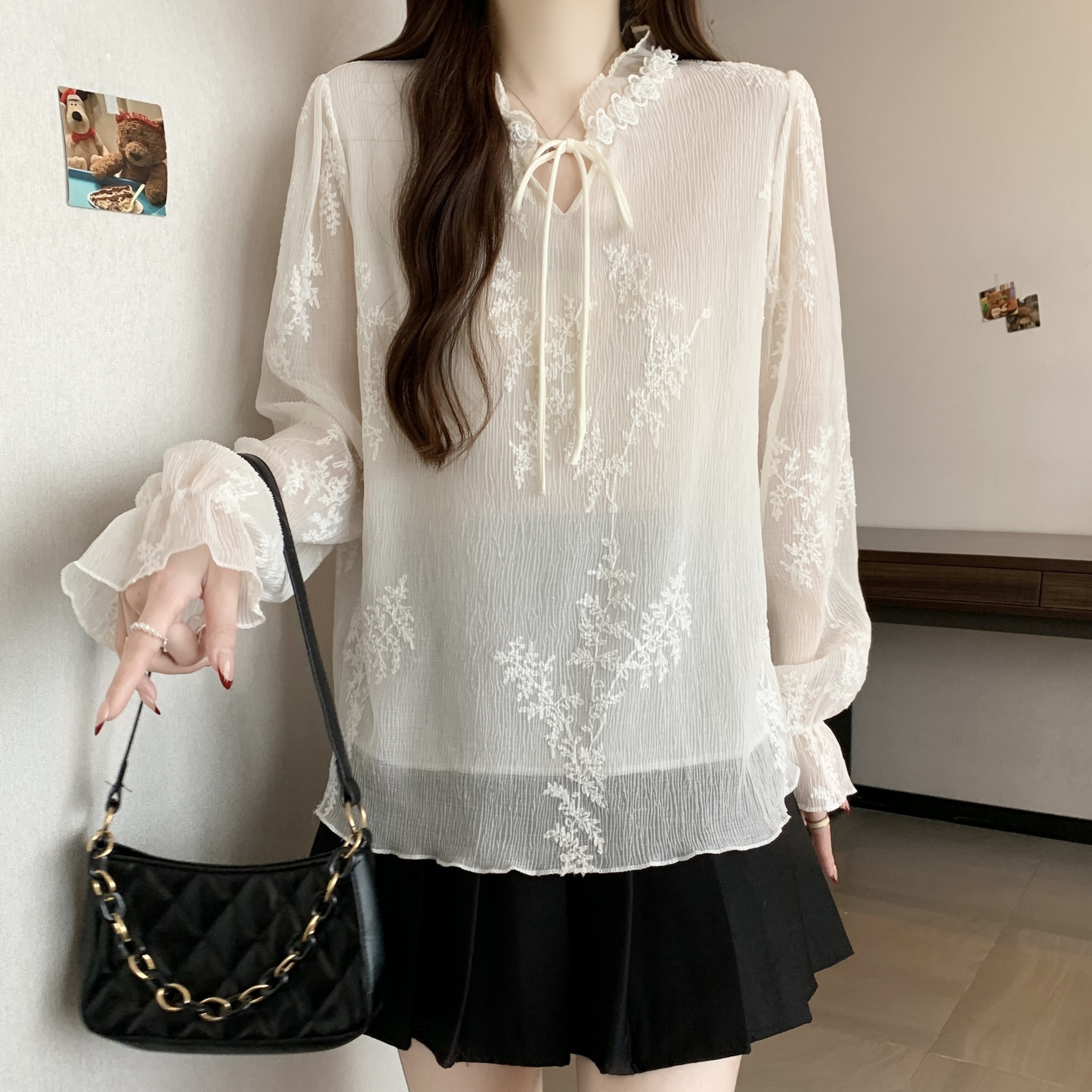 MY16149#大码女装新中式蕾丝刺绣重工钉珠系带V领长袖雪纺衫女裝貨源服裝批發