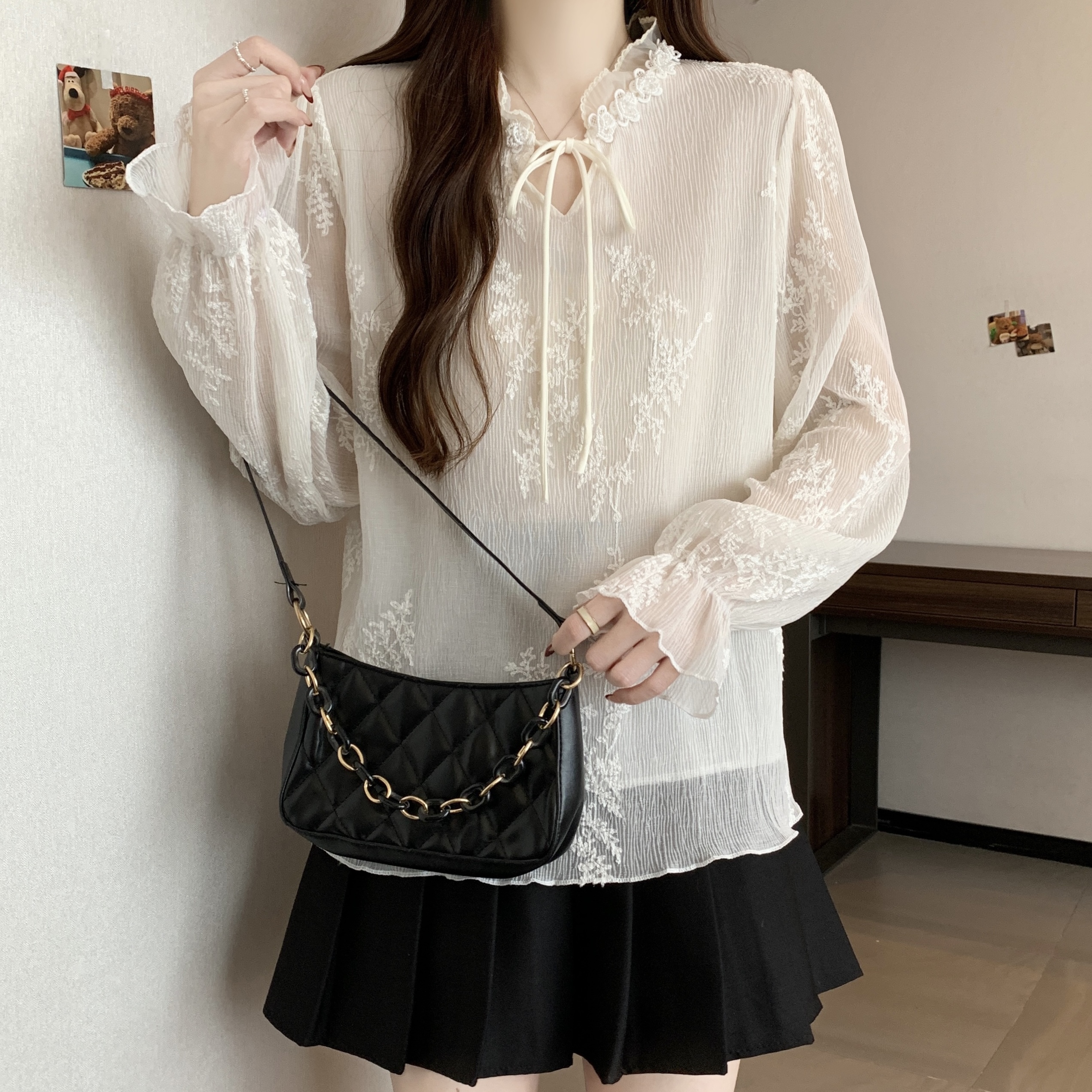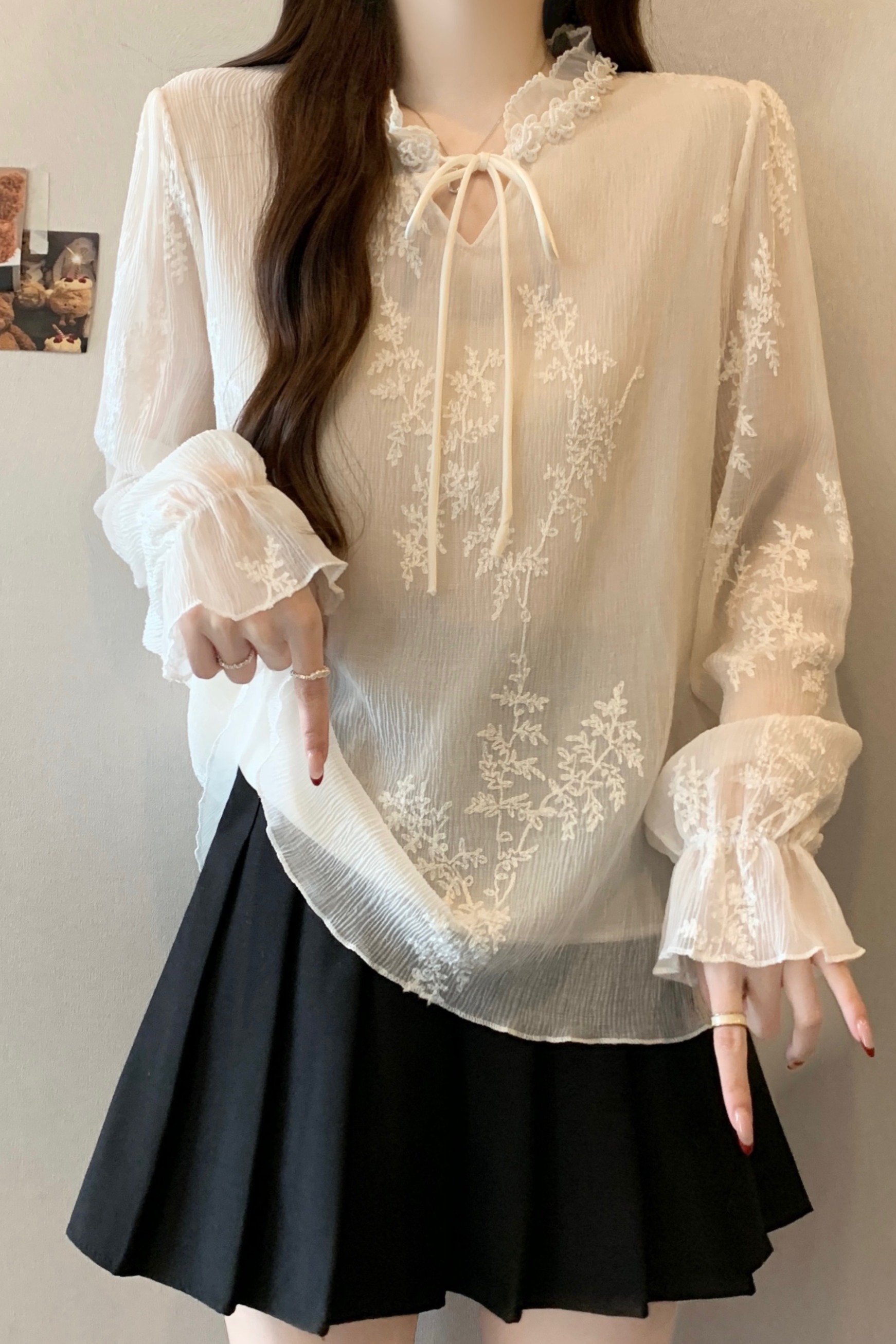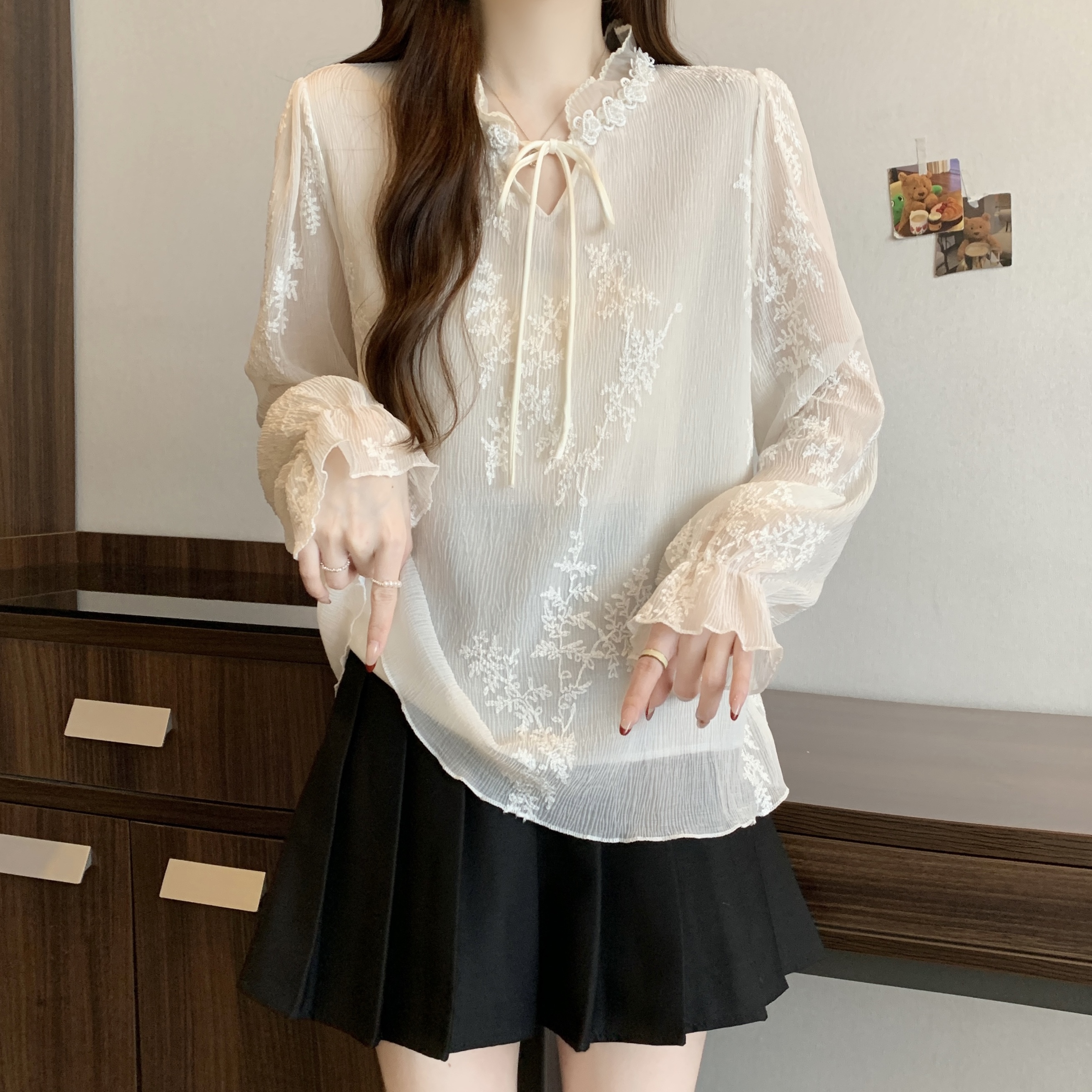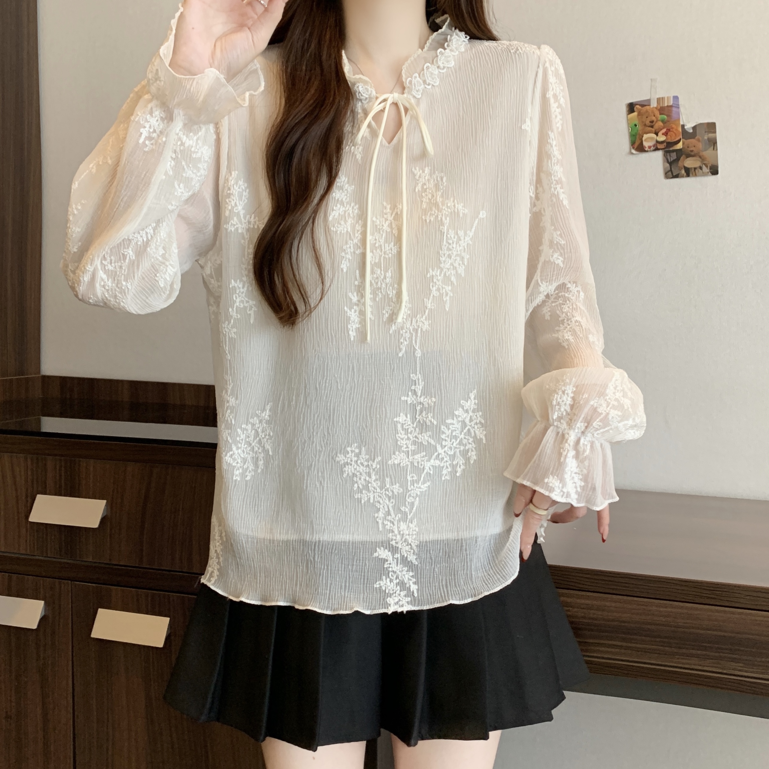 MY16149#大码女装新中式蕾丝刺绣重工钉珠系带V领长袖雪纺衫女裝貨源服裝批發