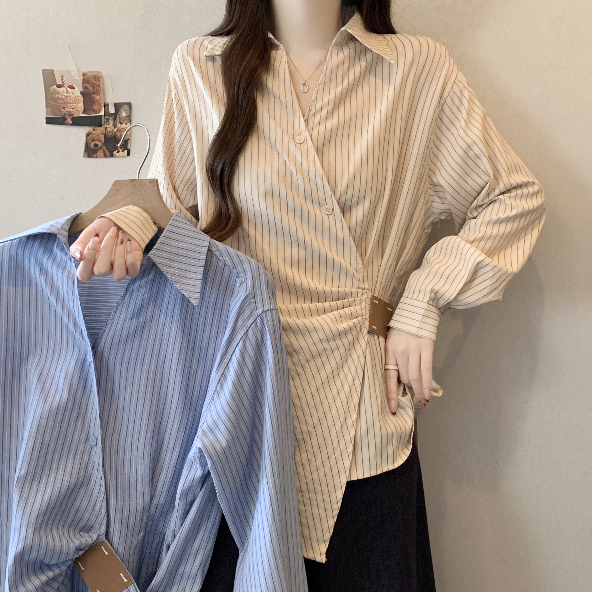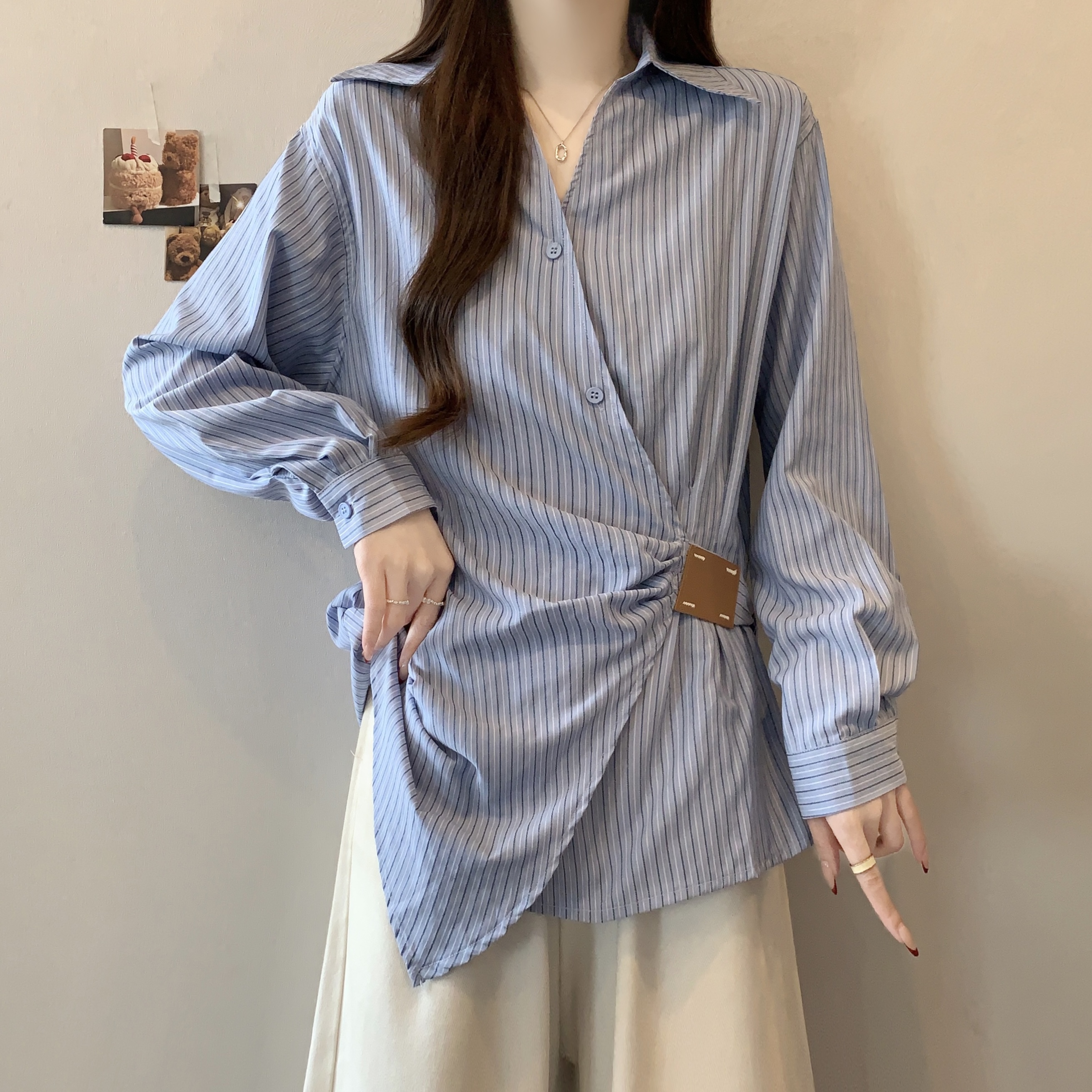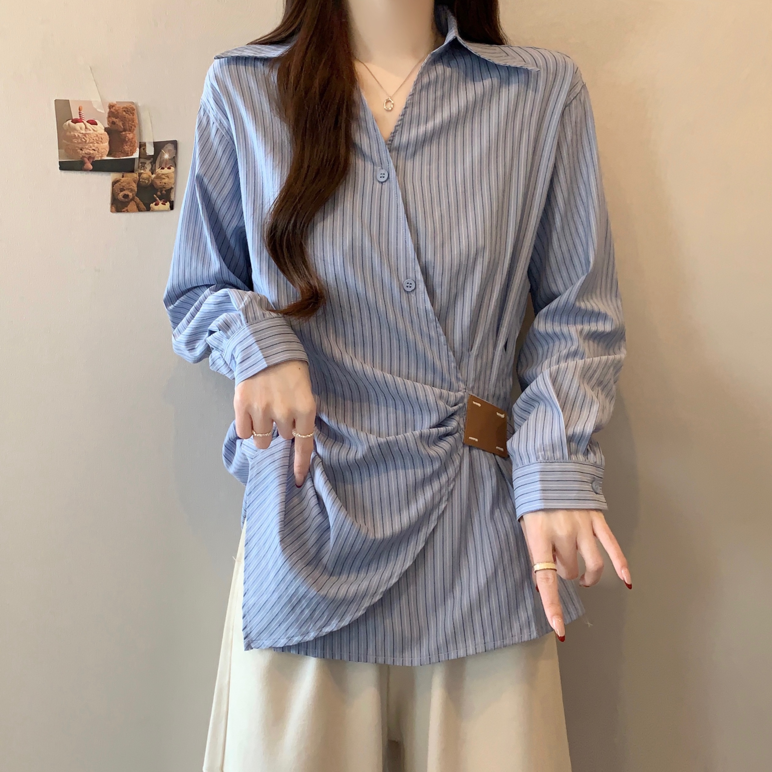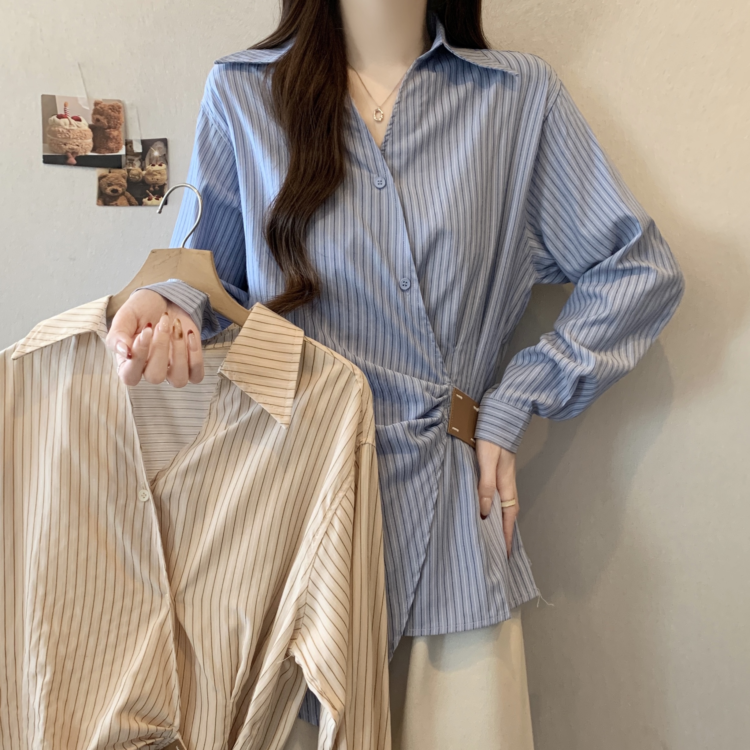 MY16150#大码女装新款不规则绑带收腰条纹衬衫设计感V领长袖上衣女裝貨源服裝批發