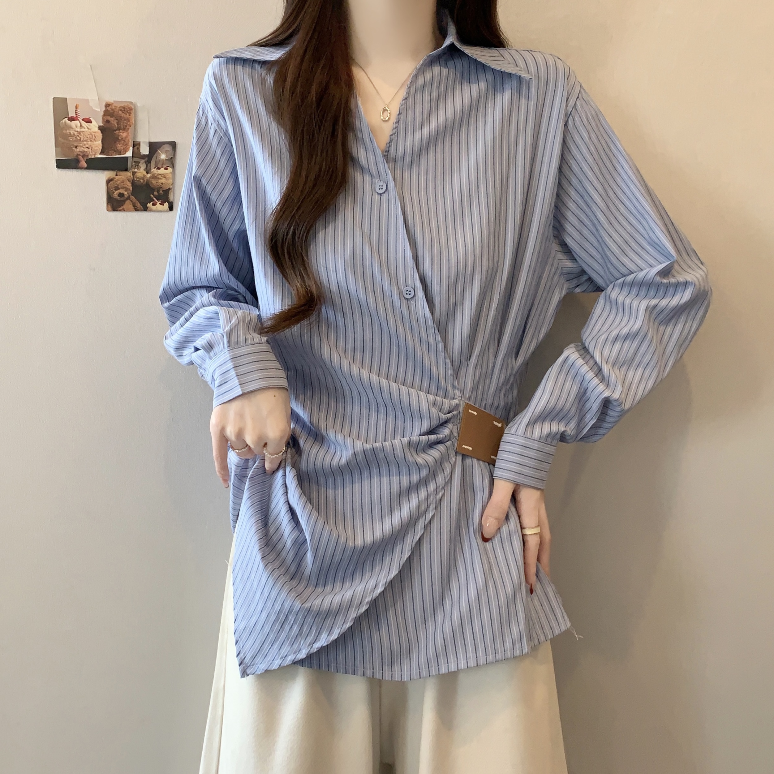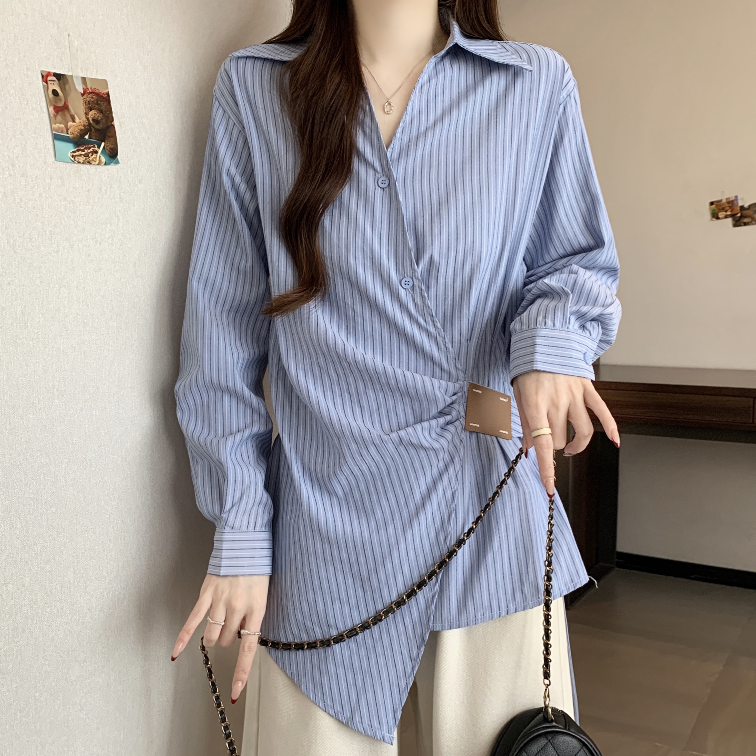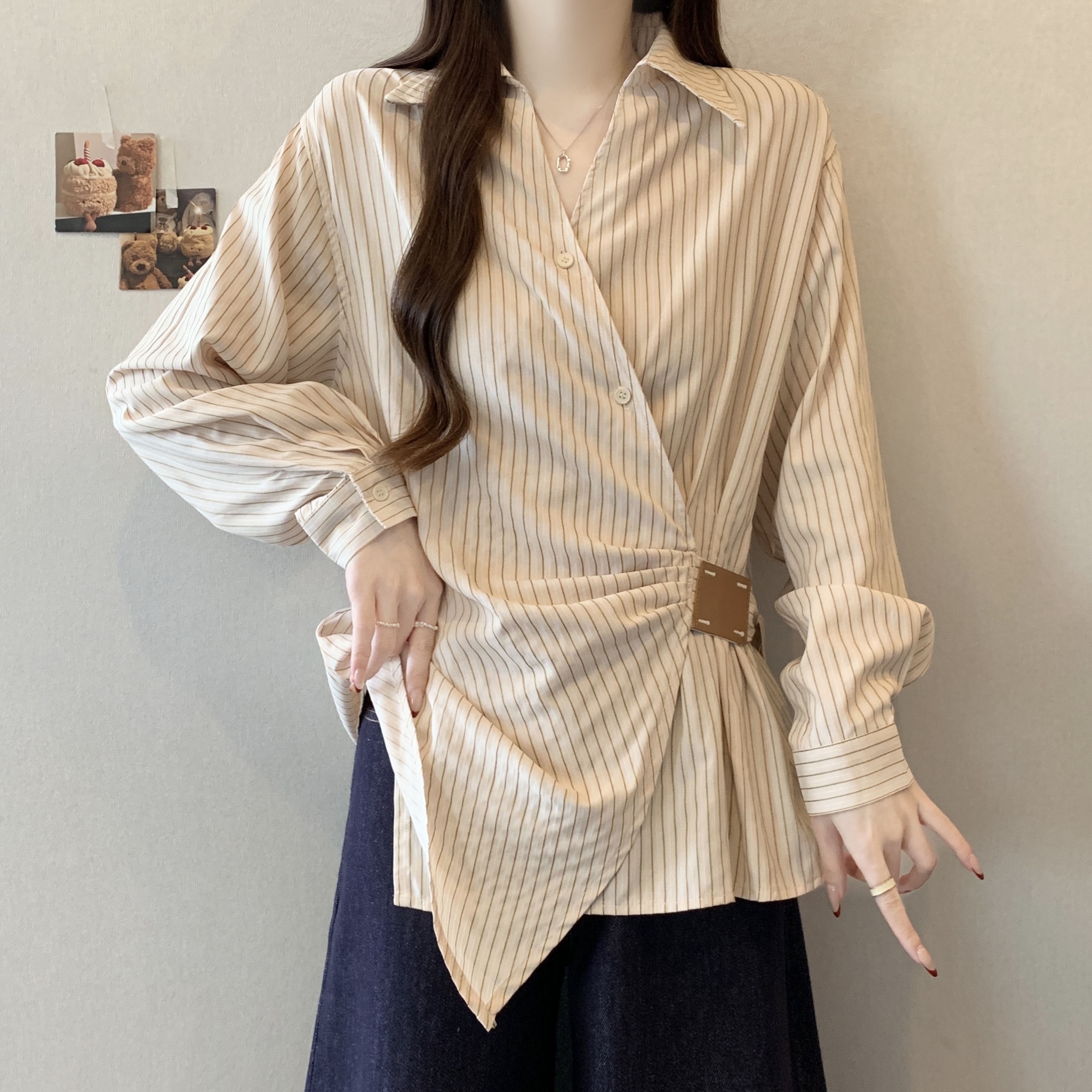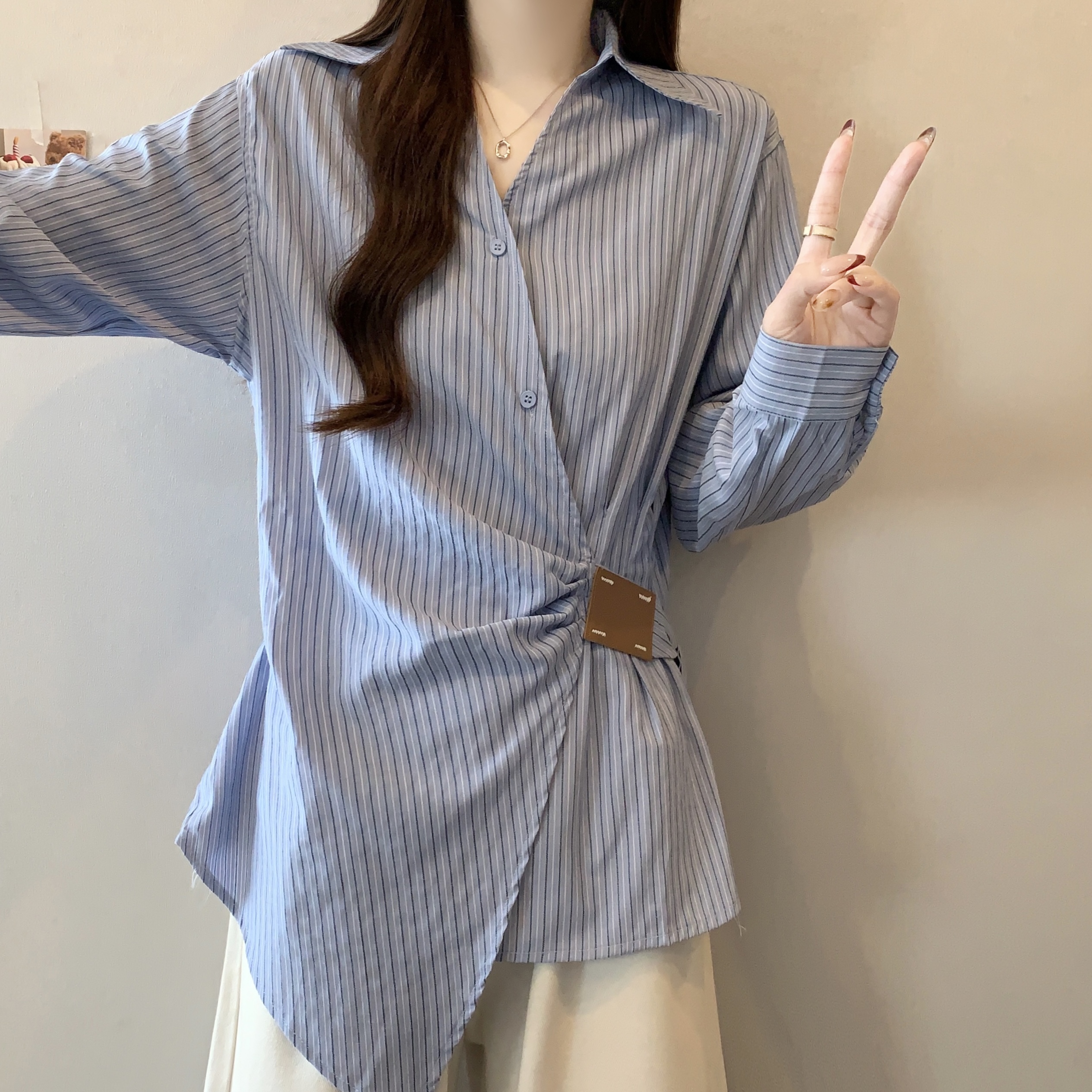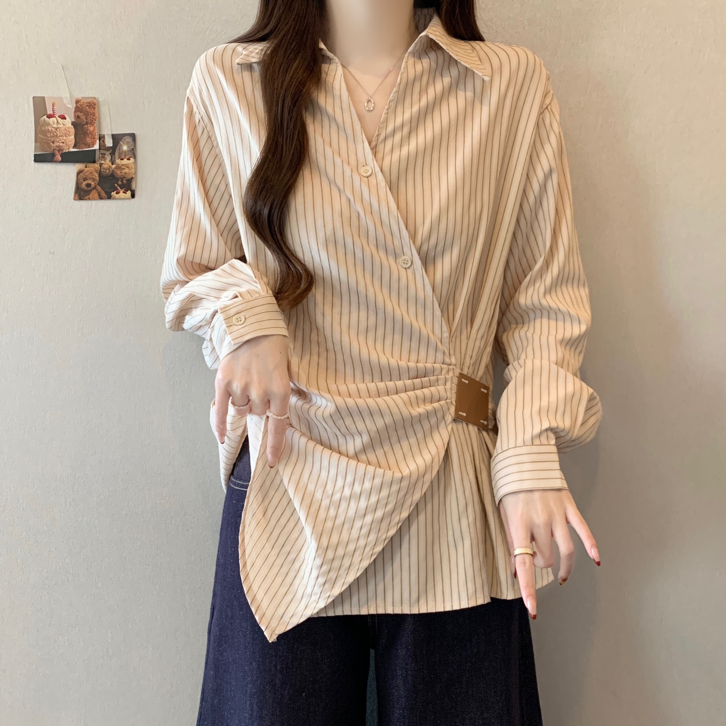 MY16150#大码女装新款不规则绑带收腰条纹衬衫设计感V领长袖上衣女裝貨源服裝批發