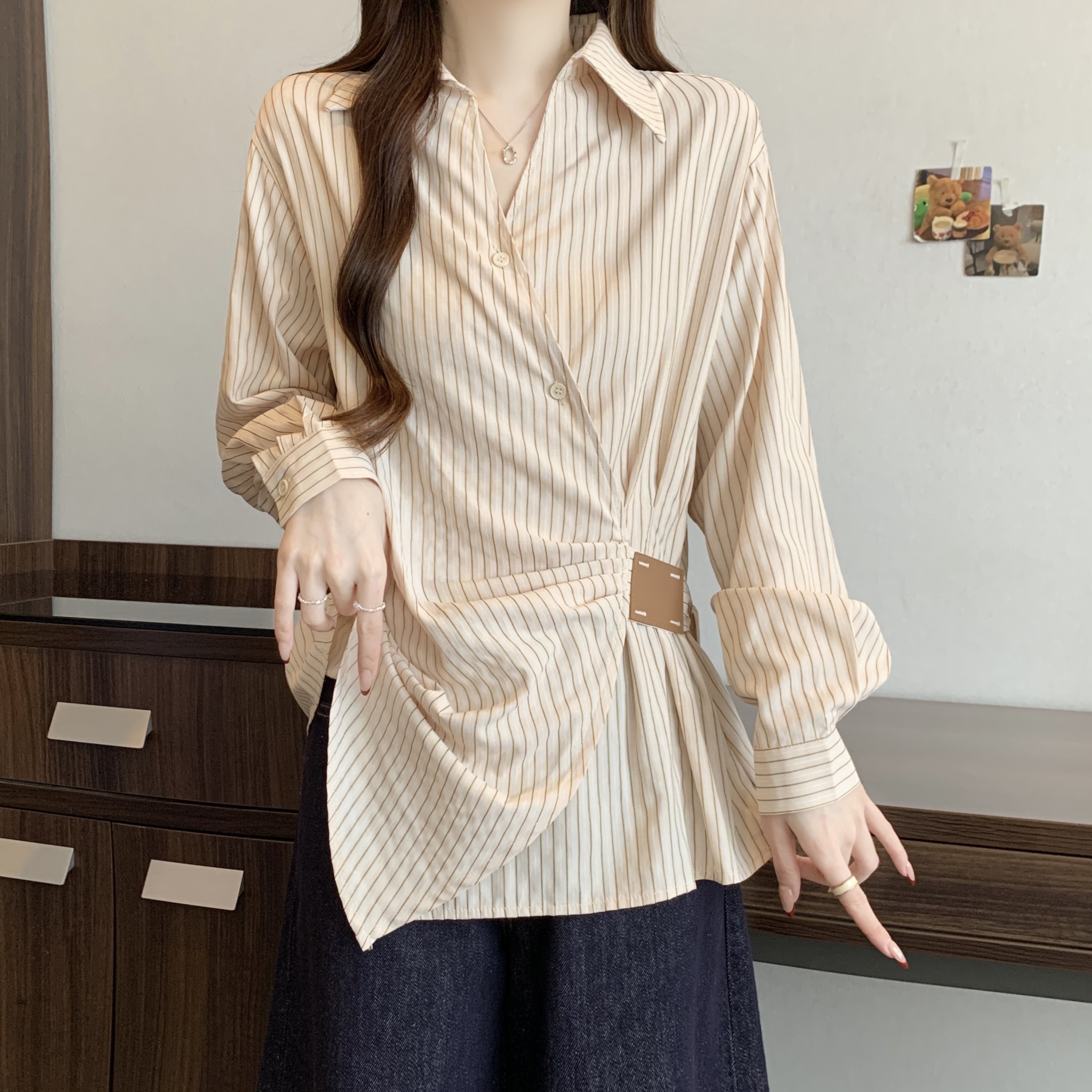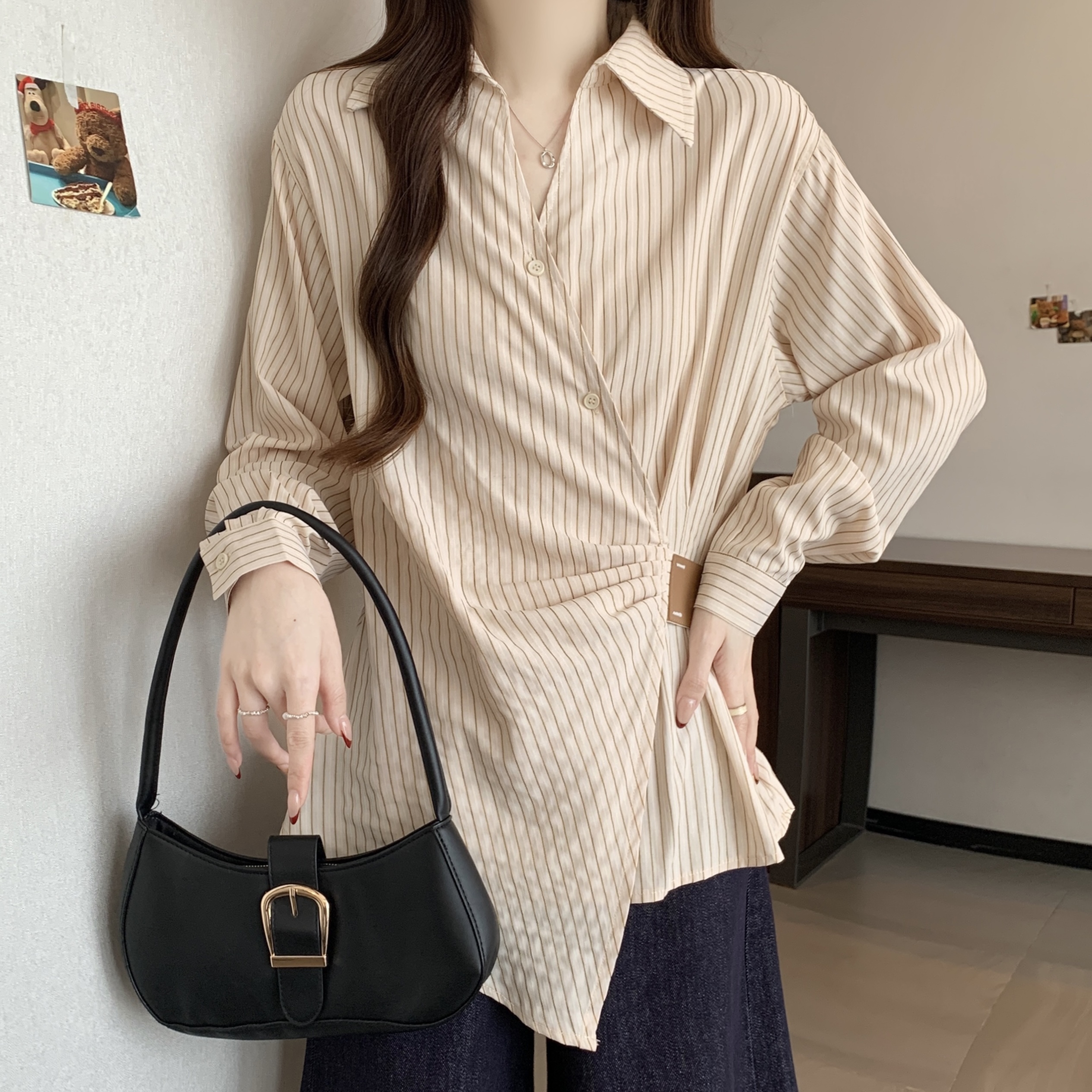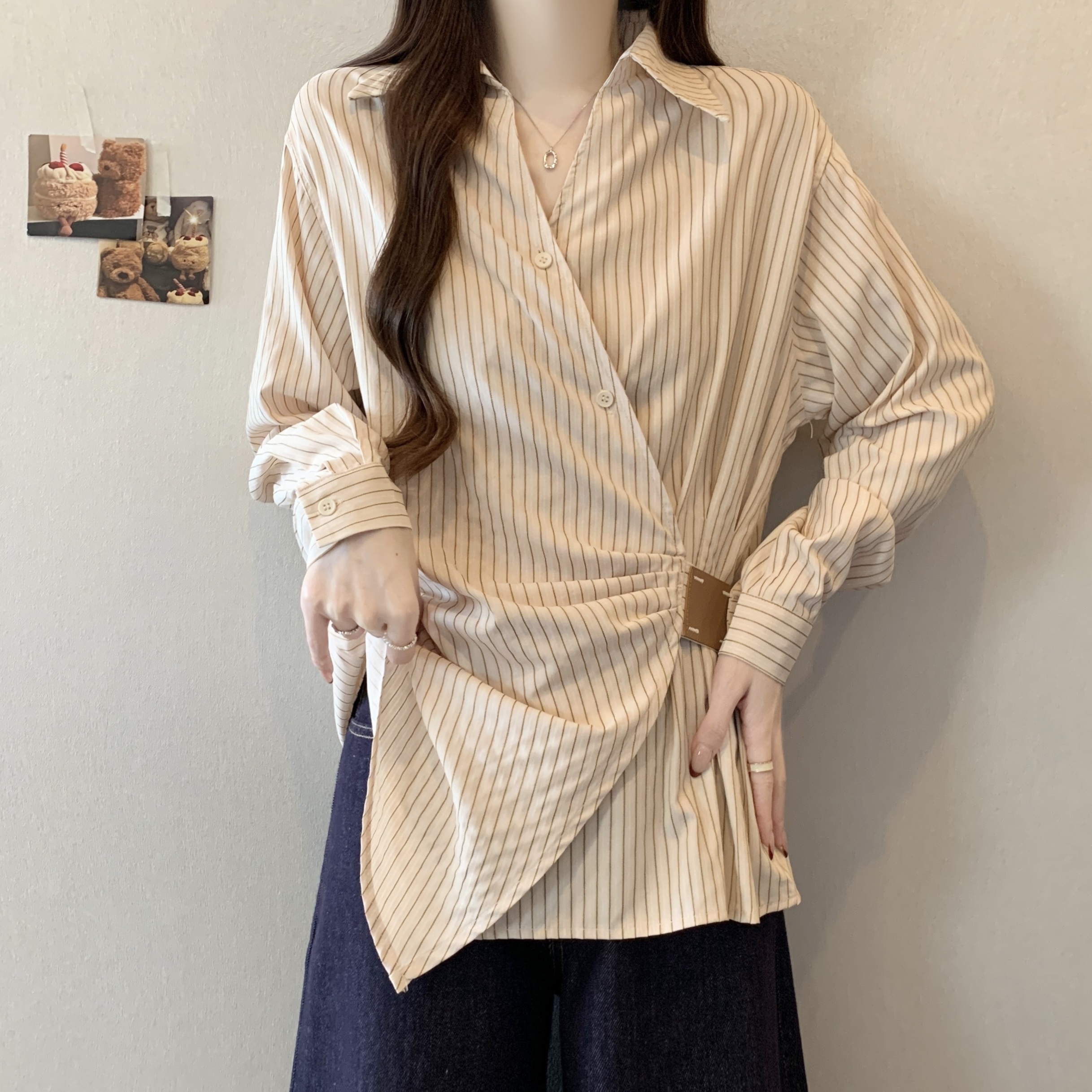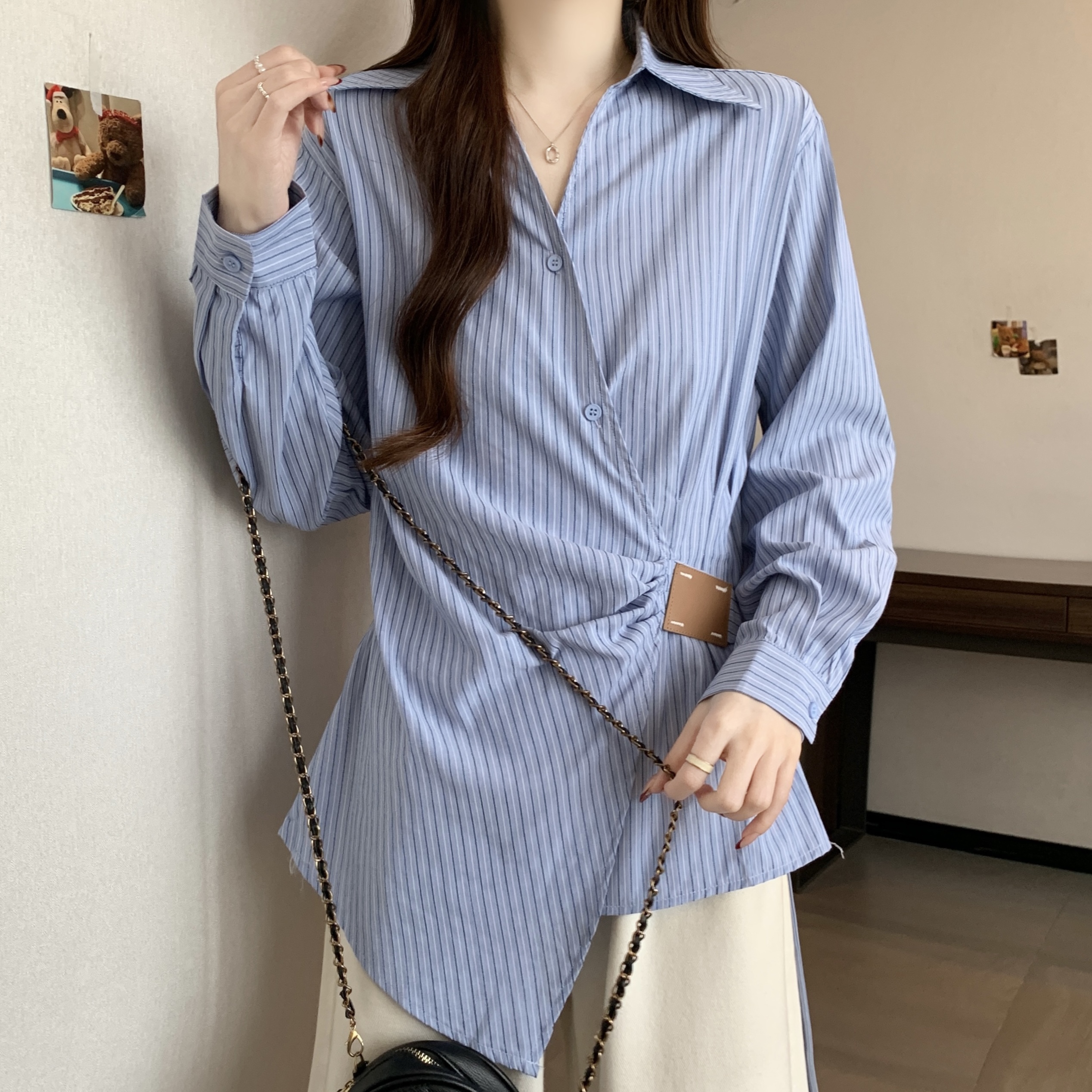 MY16150#大码女装新款不规则绑带收腰条纹衬衫设计感V领长袖上衣女裝貨源服裝批發