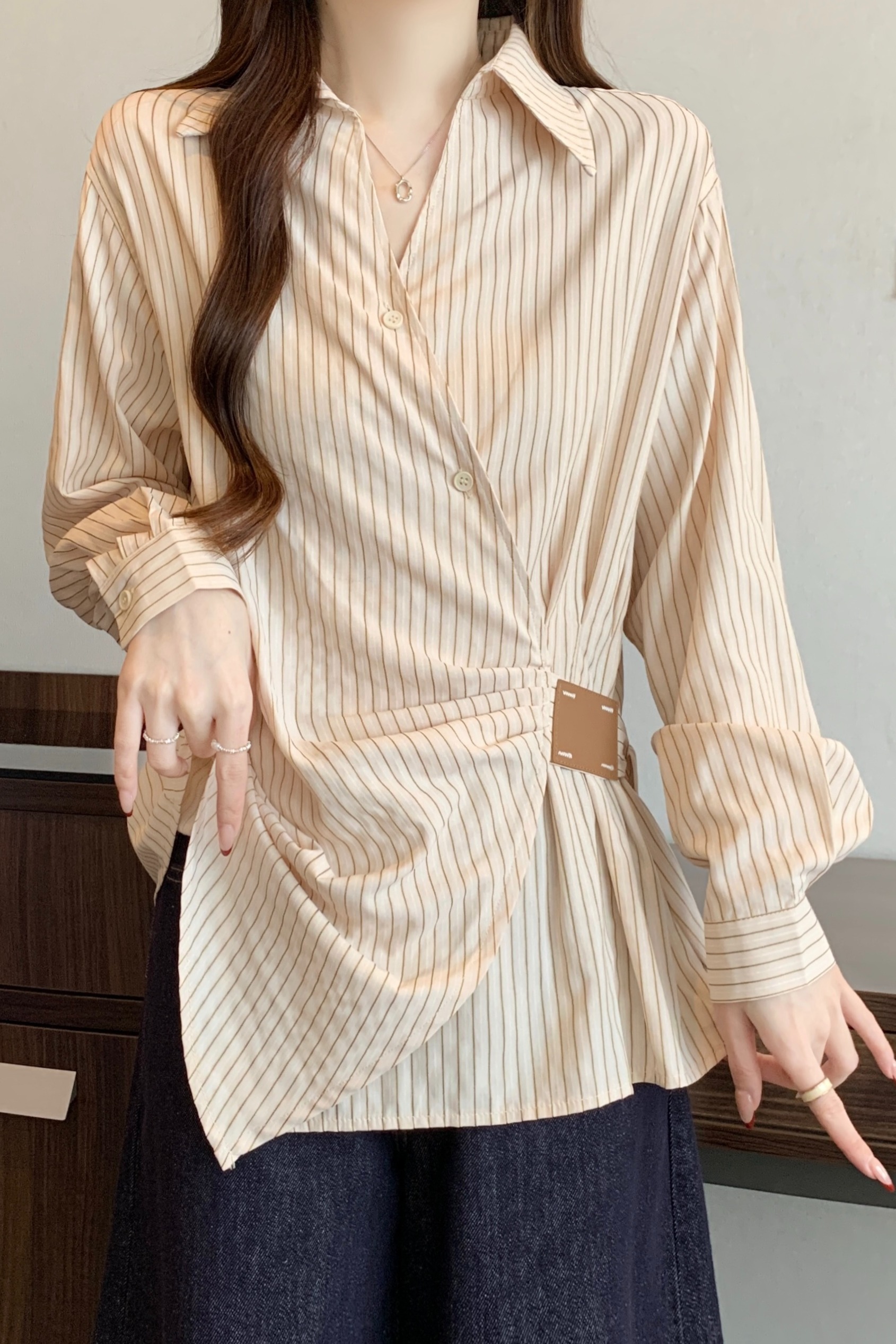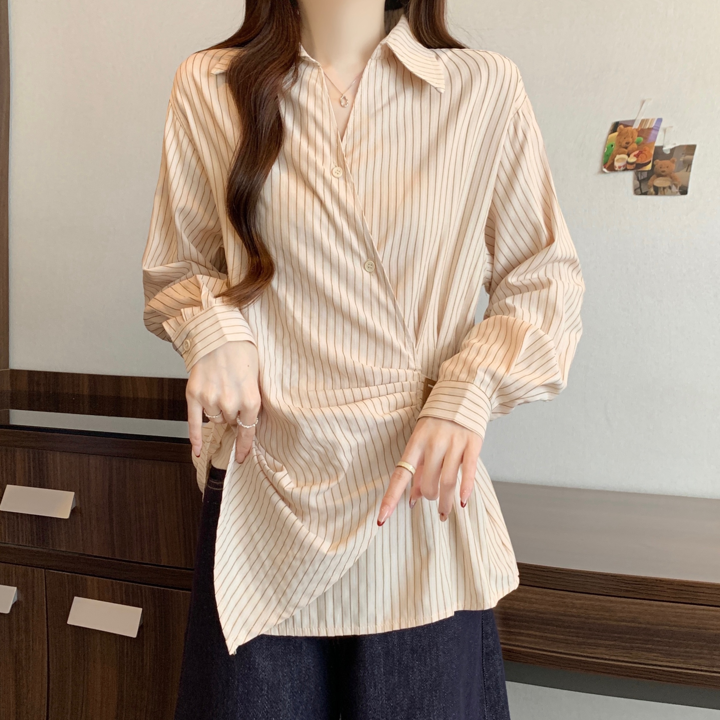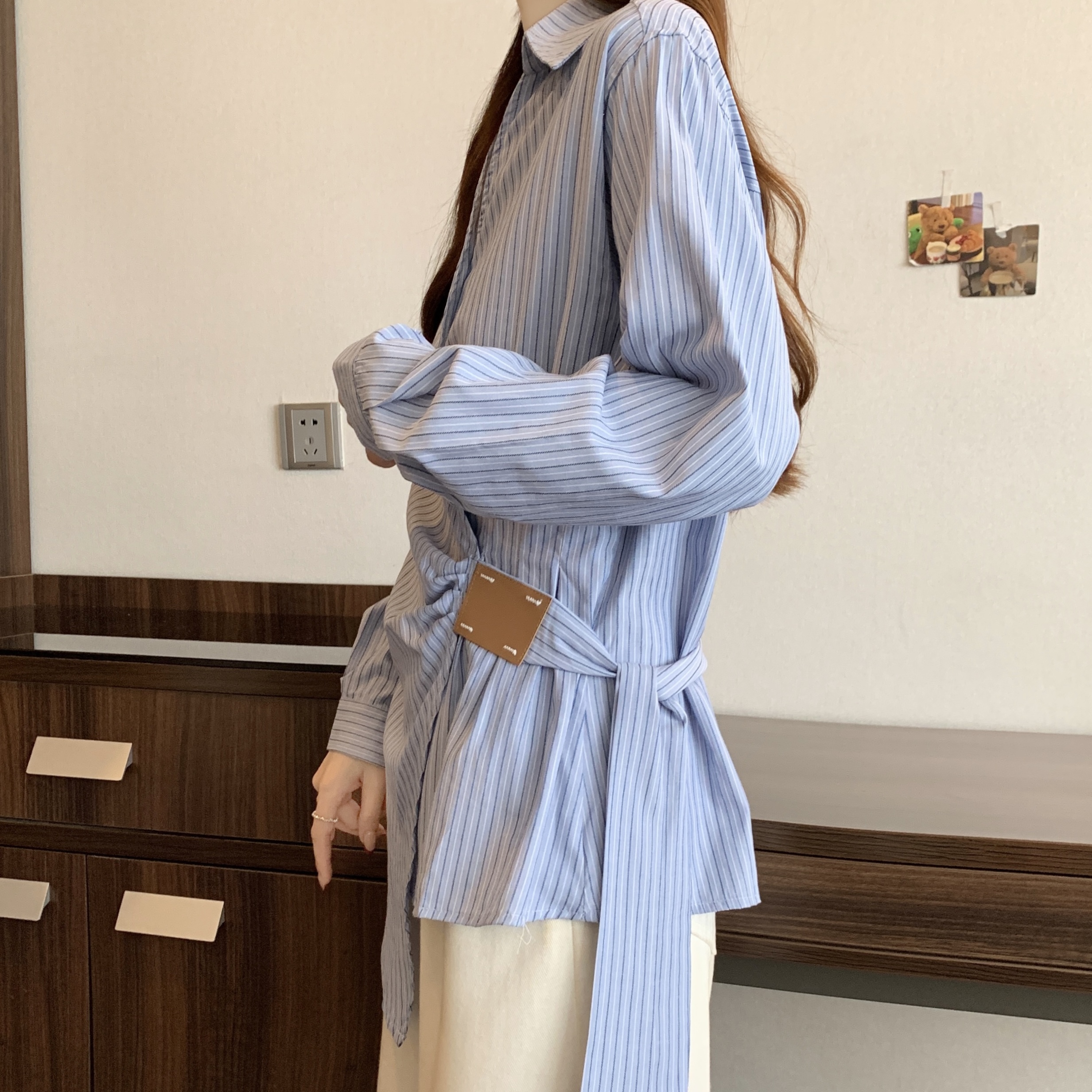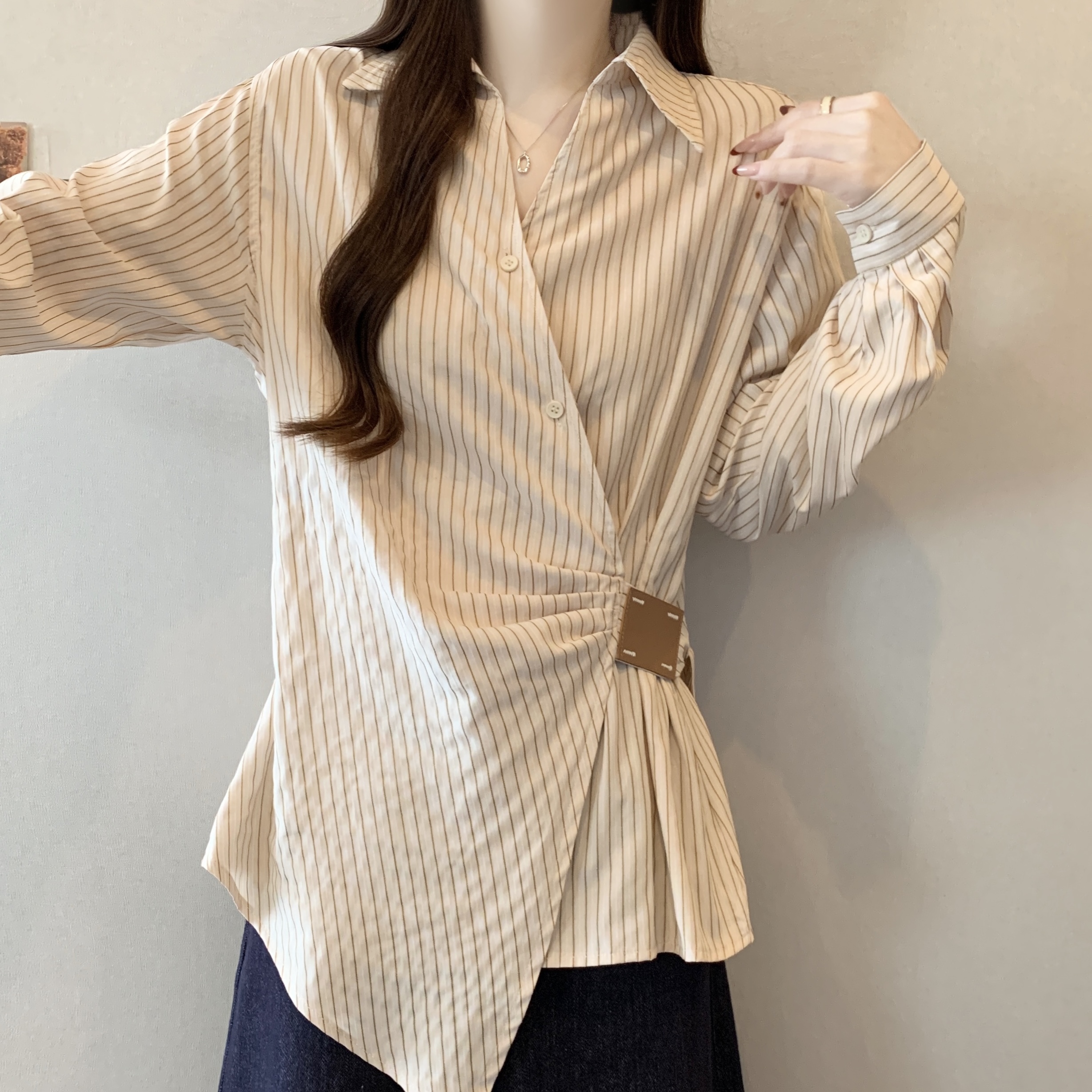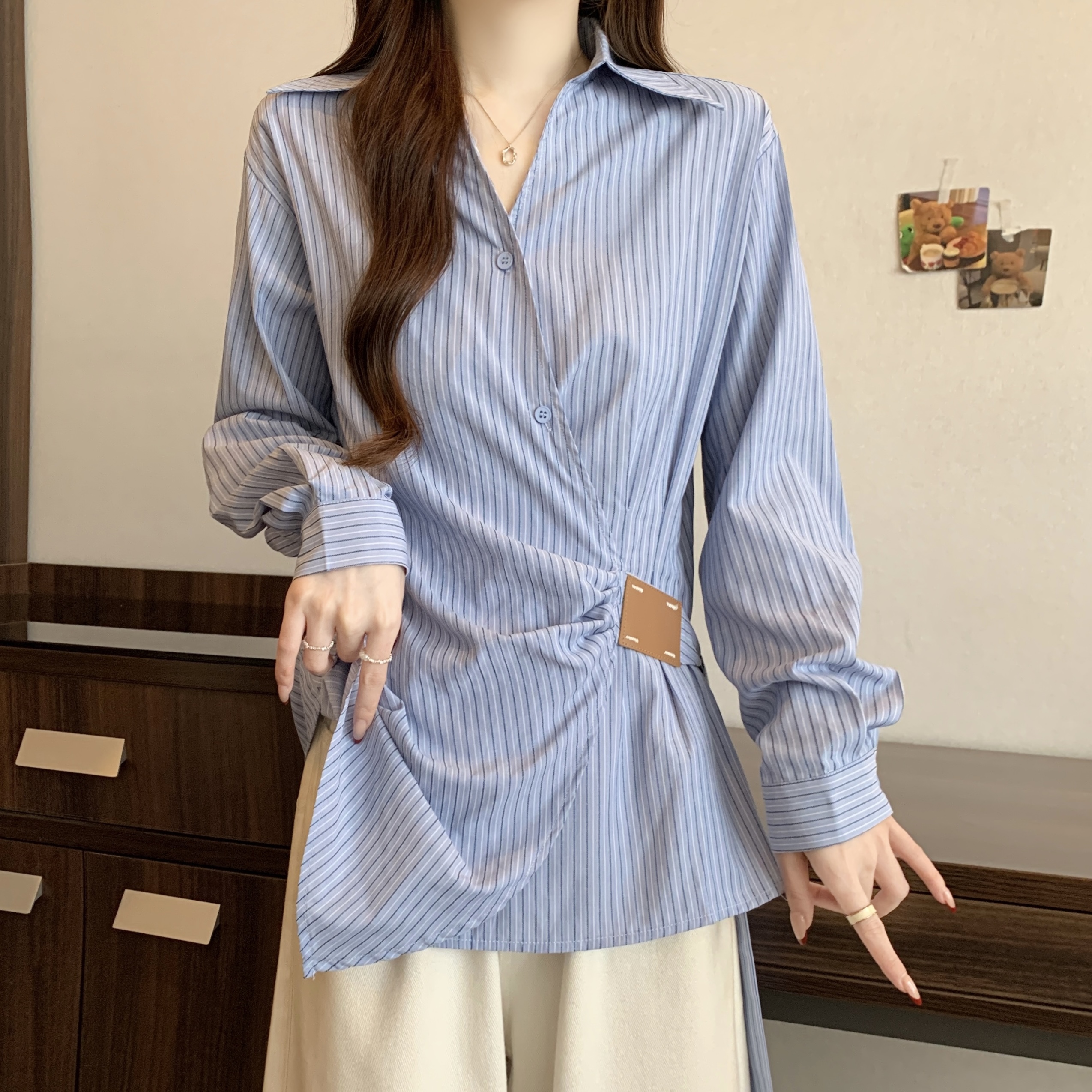 MY16150#大码女装新款不规则绑带收腰条纹衬衫设计感V领长袖上衣女裝貨源服裝批發