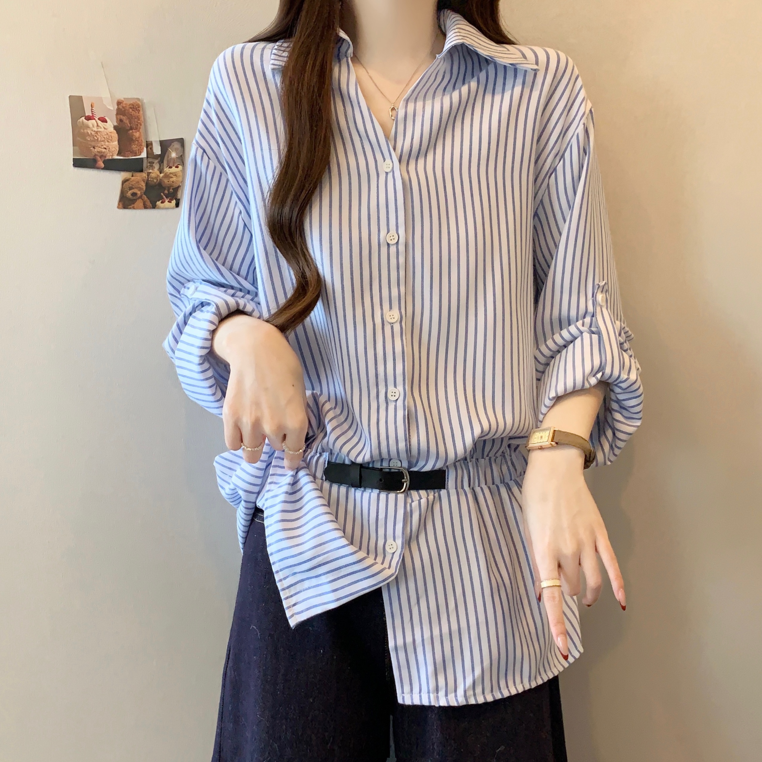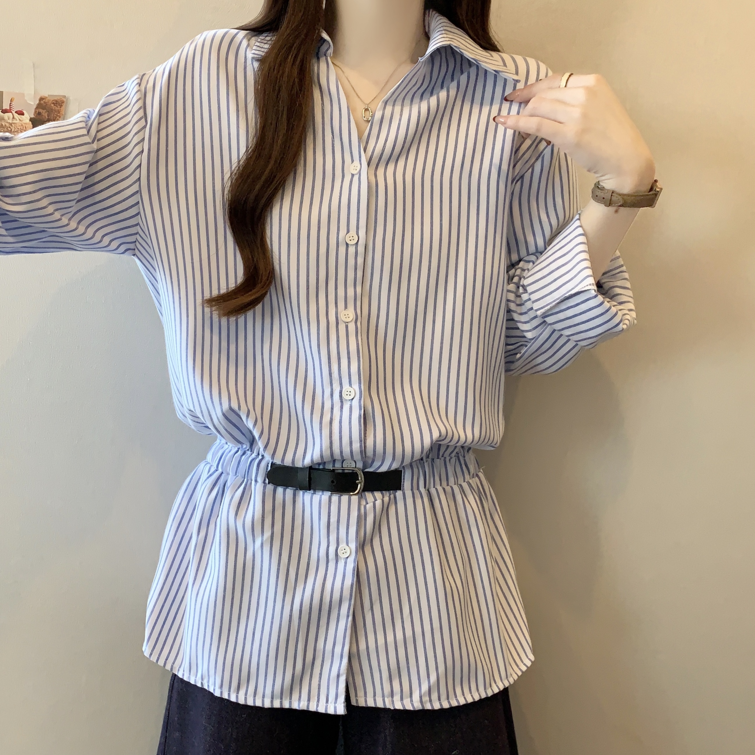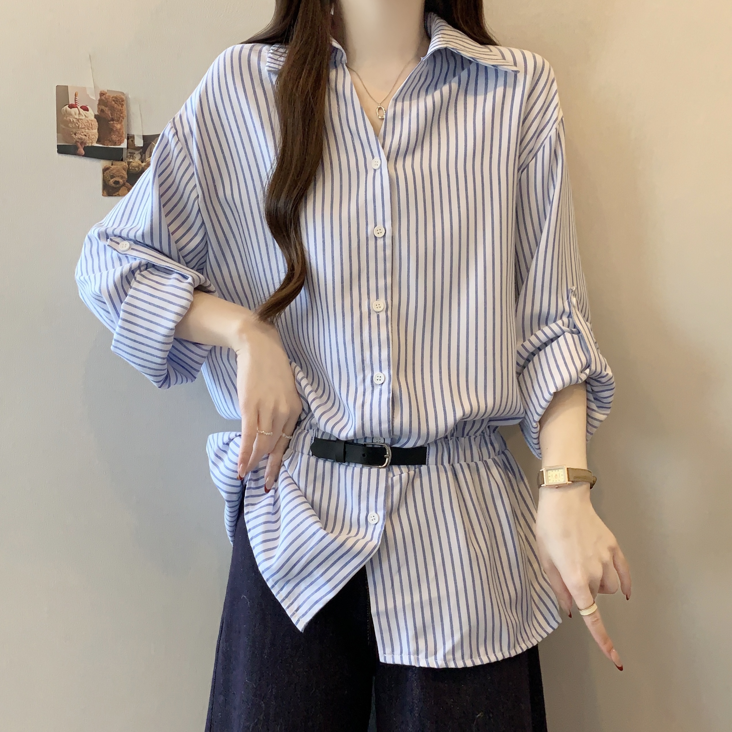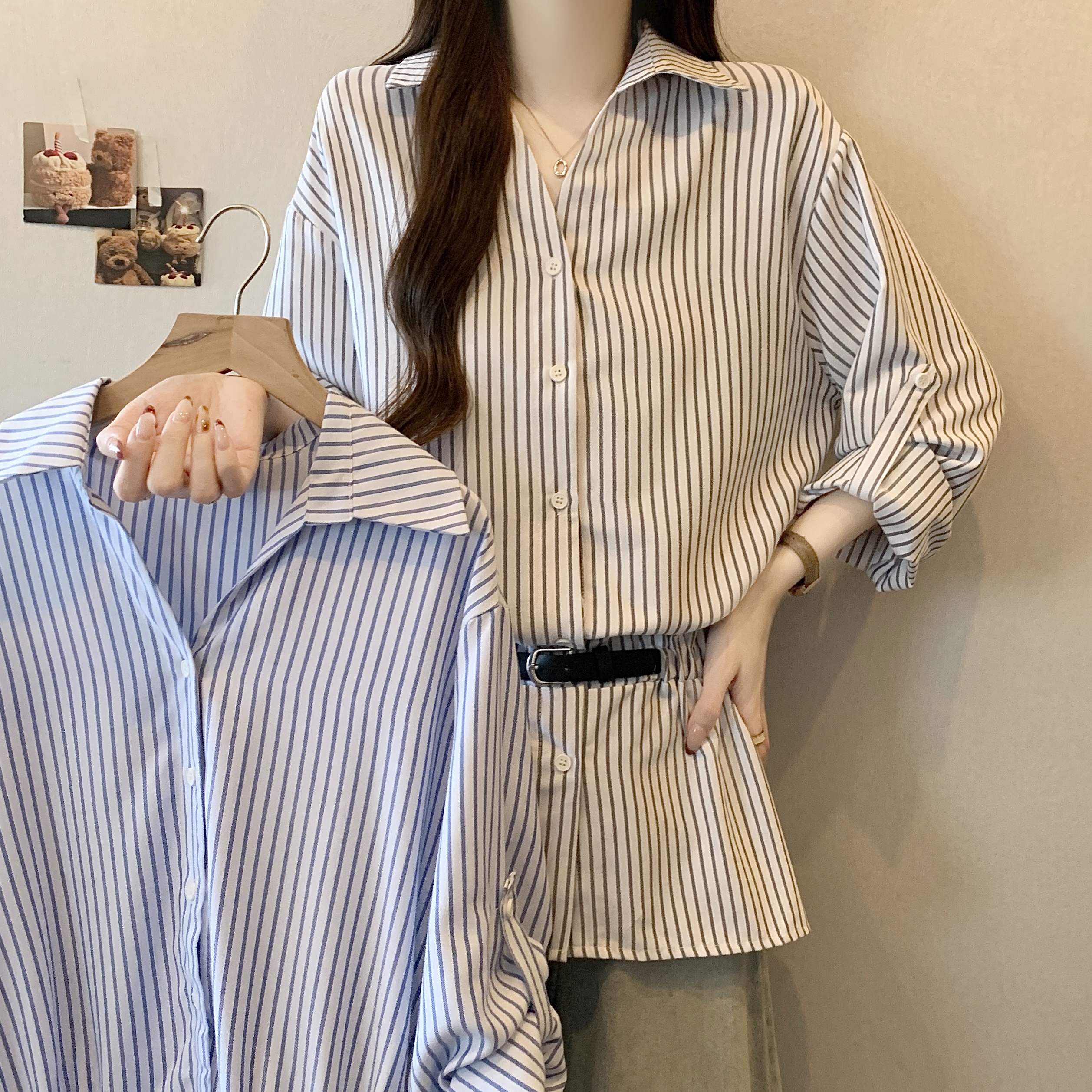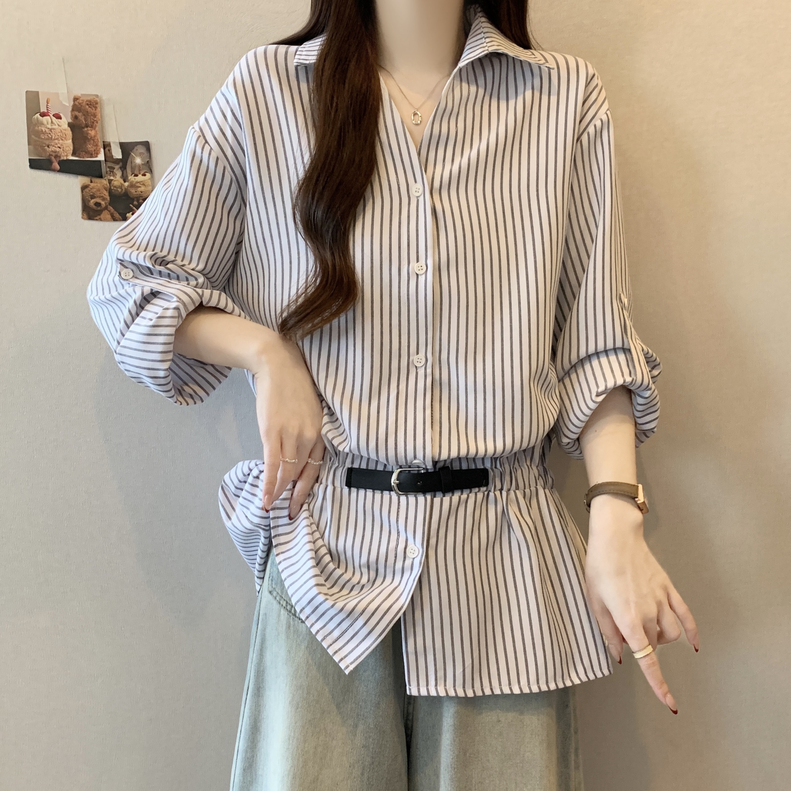 MY16151#大码女装新款韩系复古休闲百搭收腰显瘦条纹V领衬衫上衣女裝貨源服裝批發