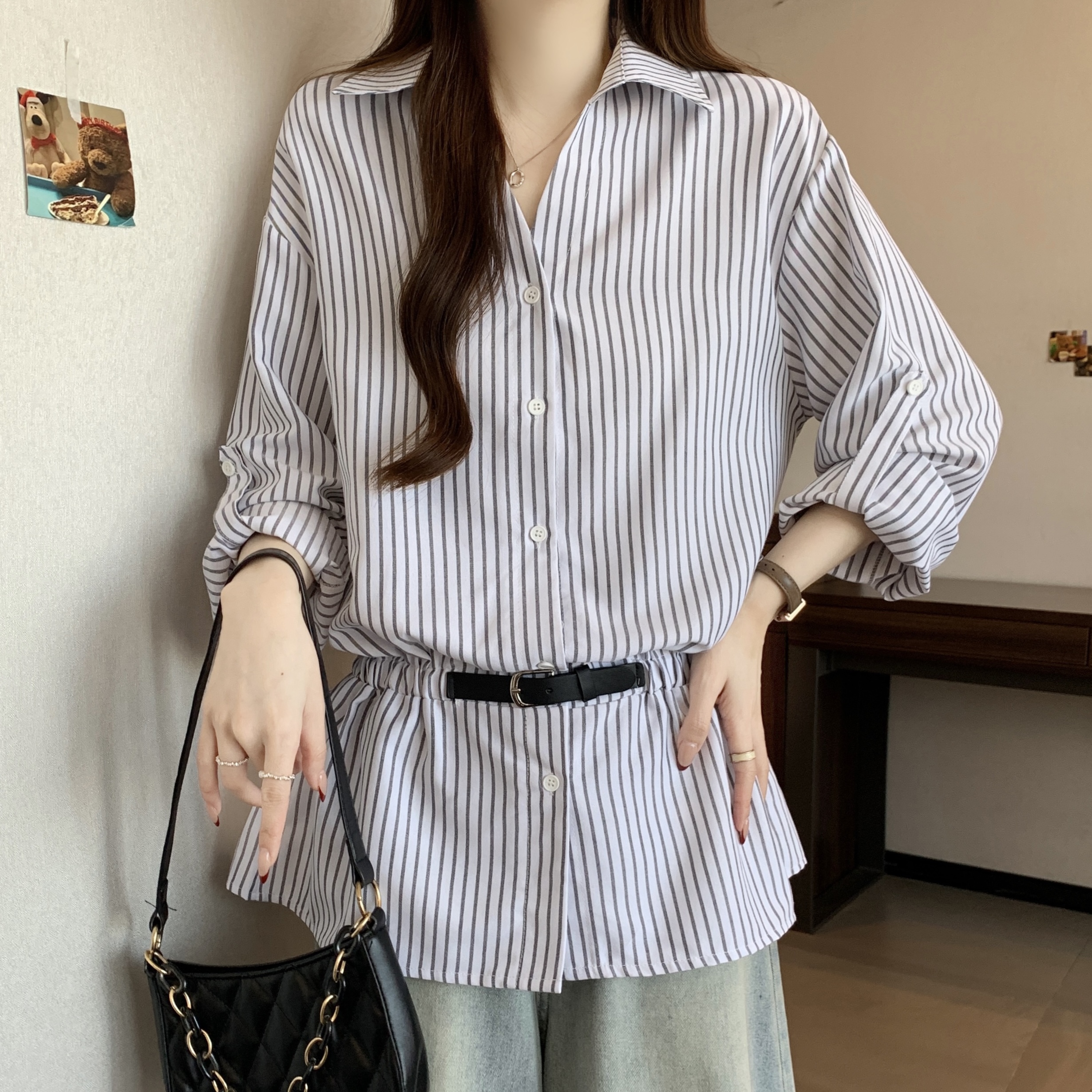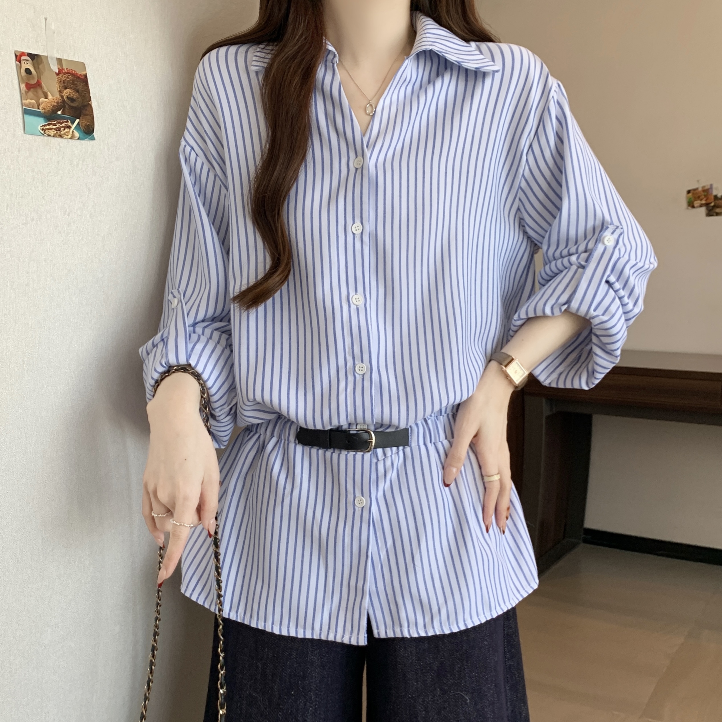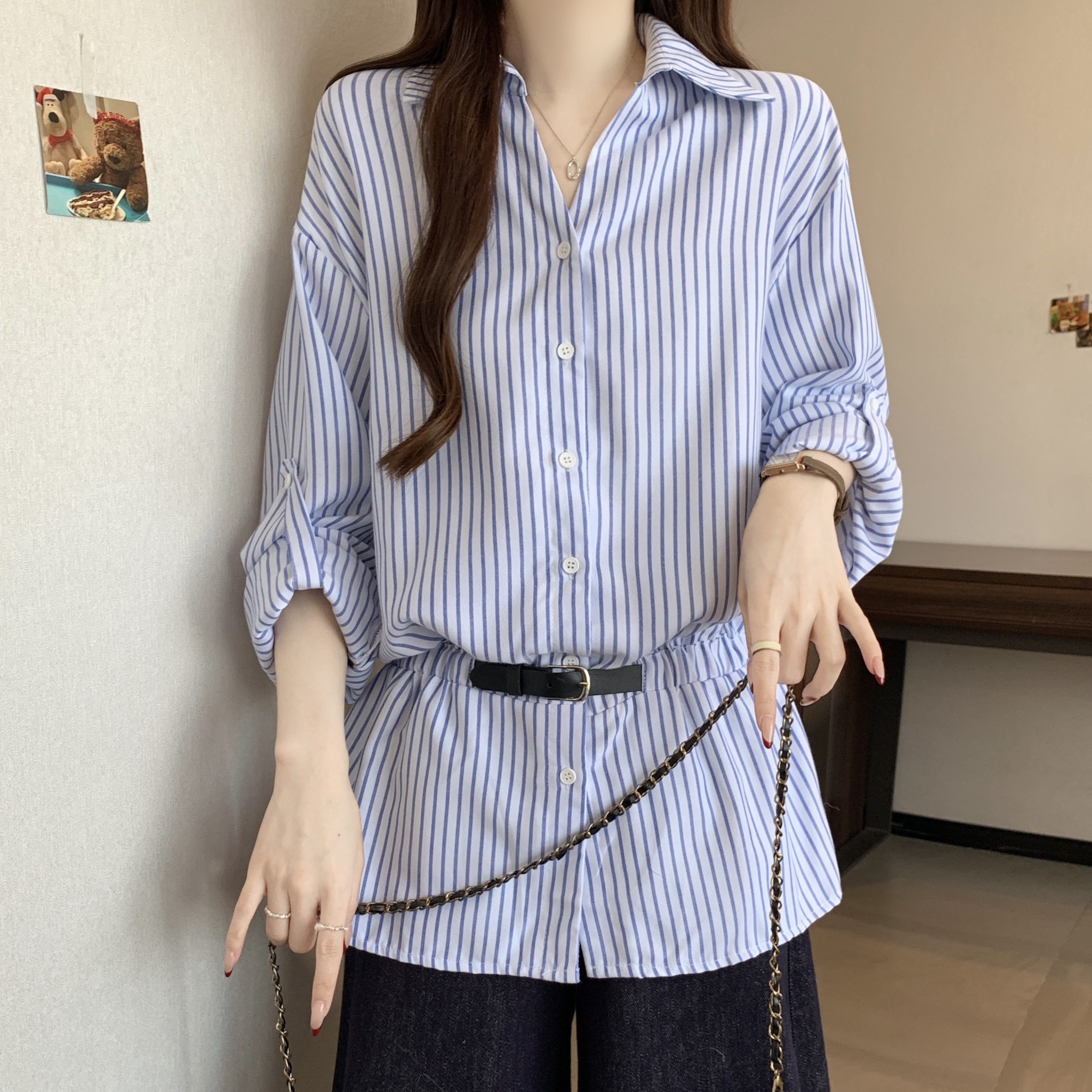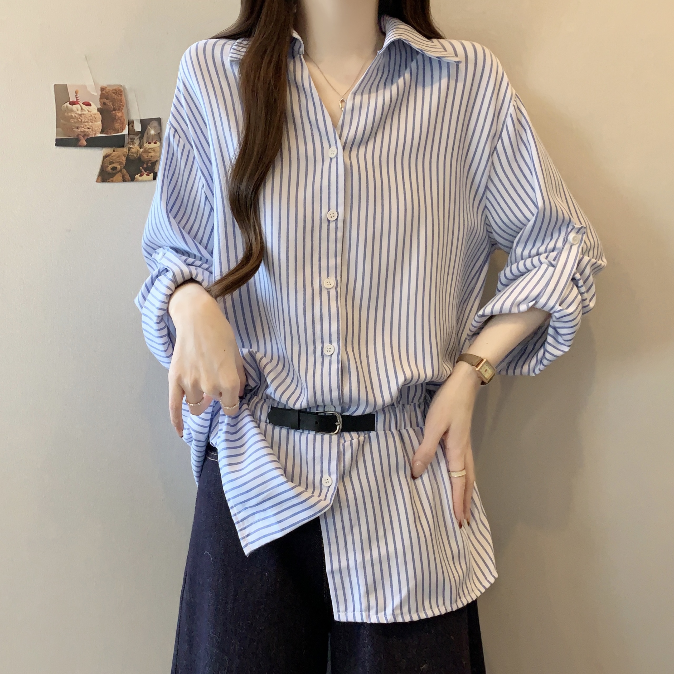 MY16151#大码女装新款韩系复古休闲百搭收腰显瘦条纹V领衬衫上衣女裝貨源服裝批發