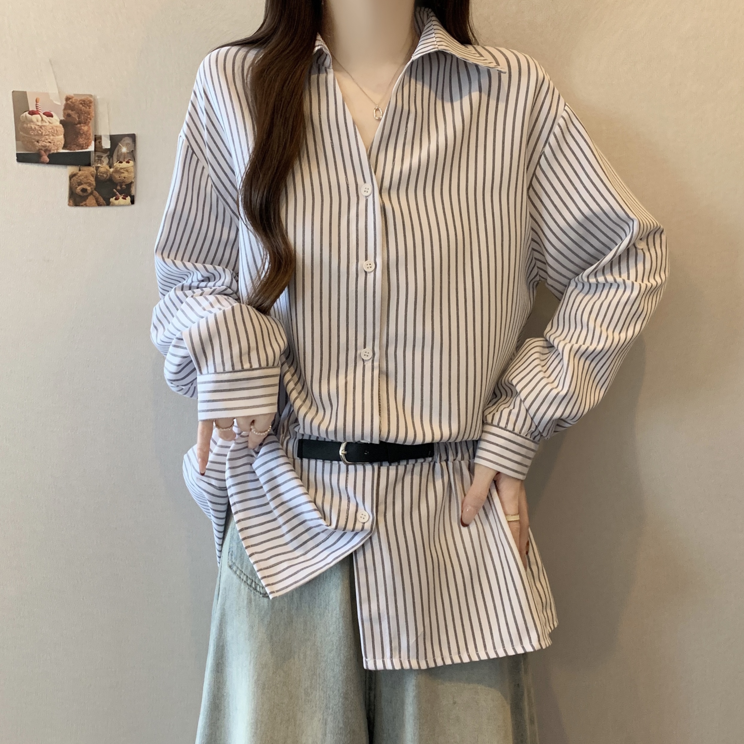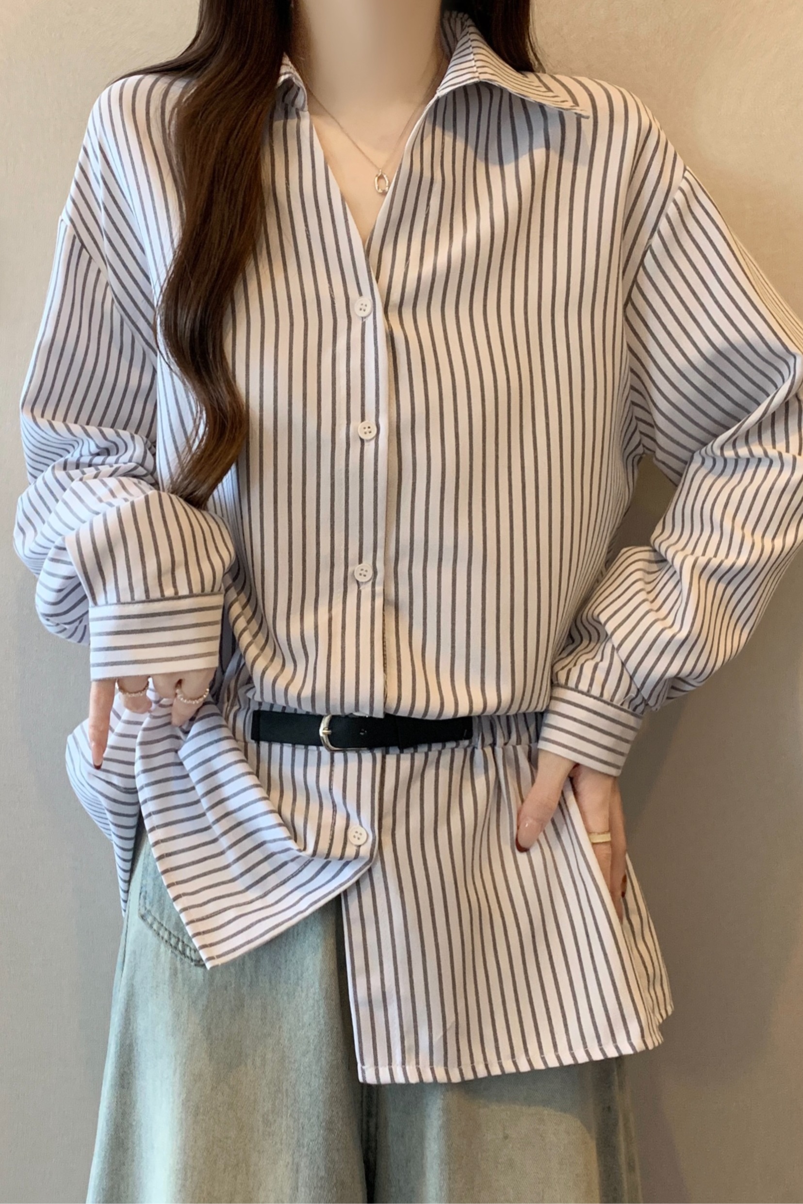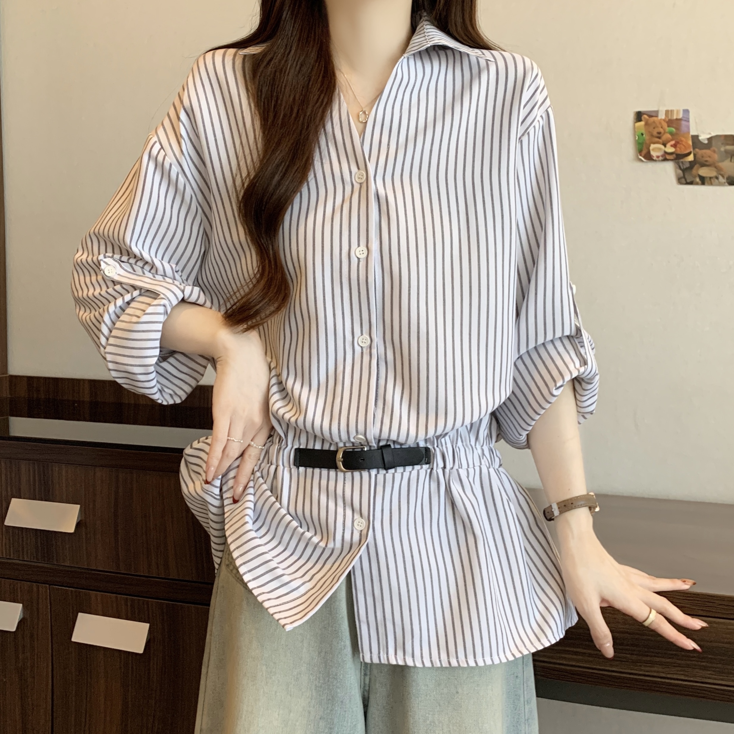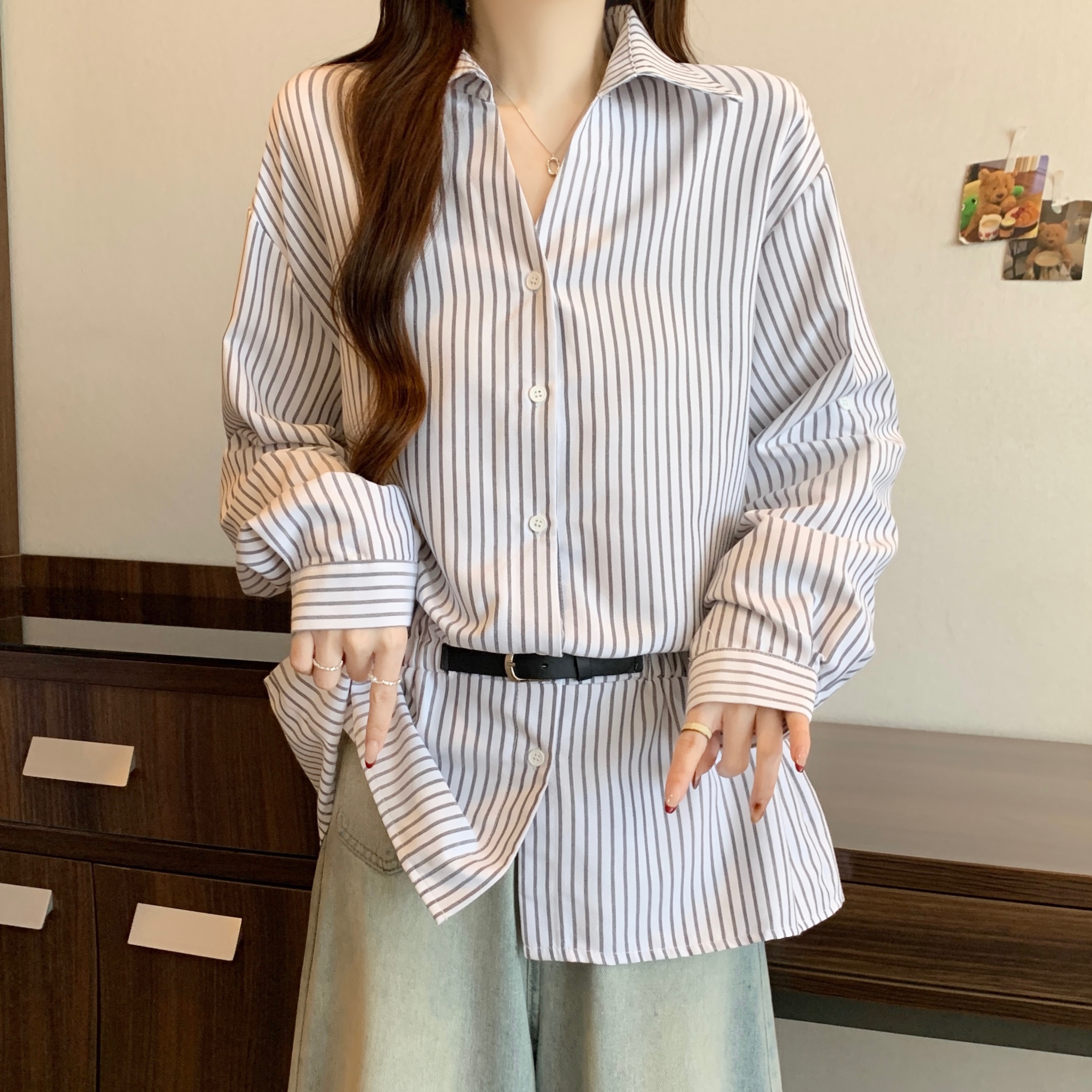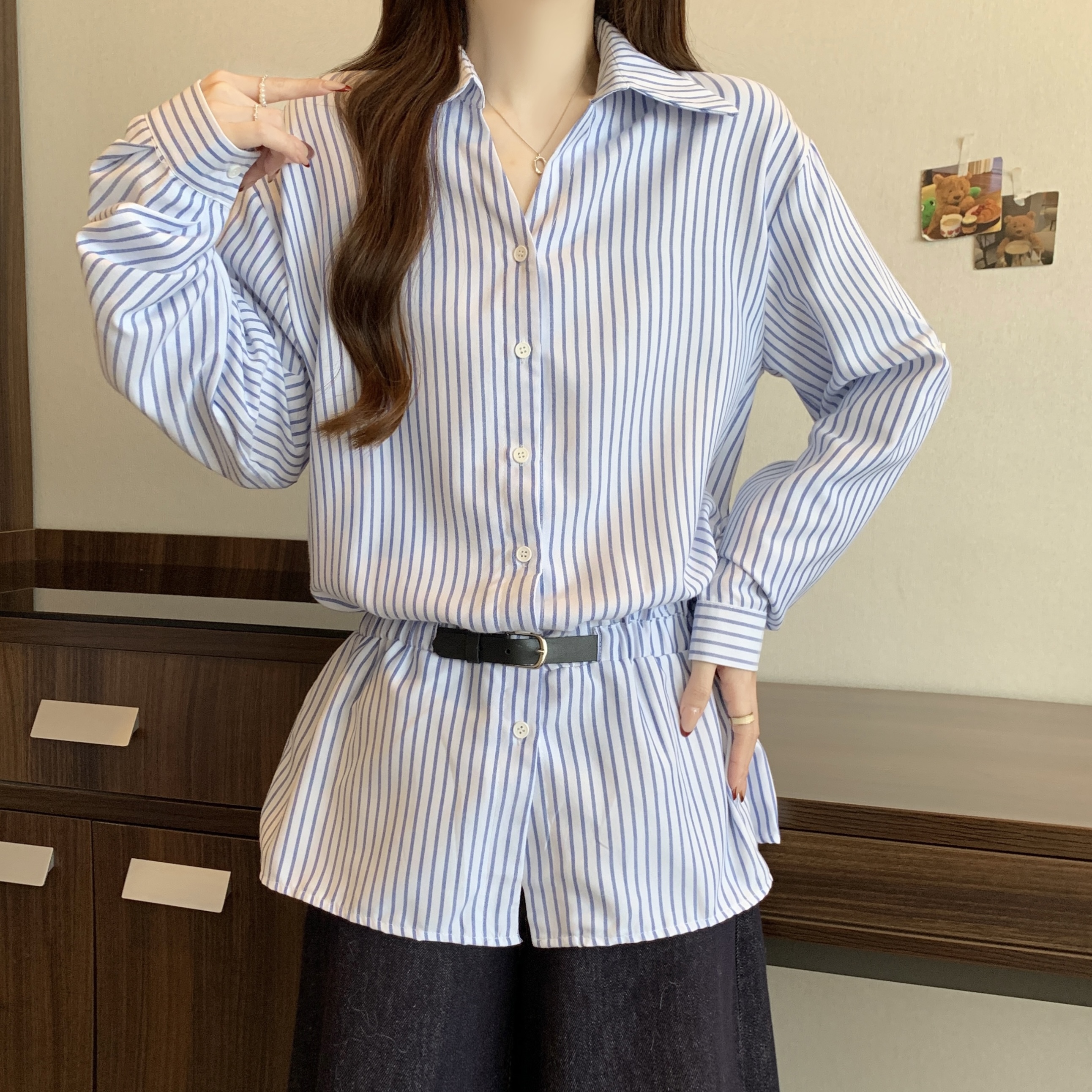 MY16151#大码女装新款韩系复古休闲百搭收腰显瘦条纹V领衬衫上衣女裝貨源服裝批發