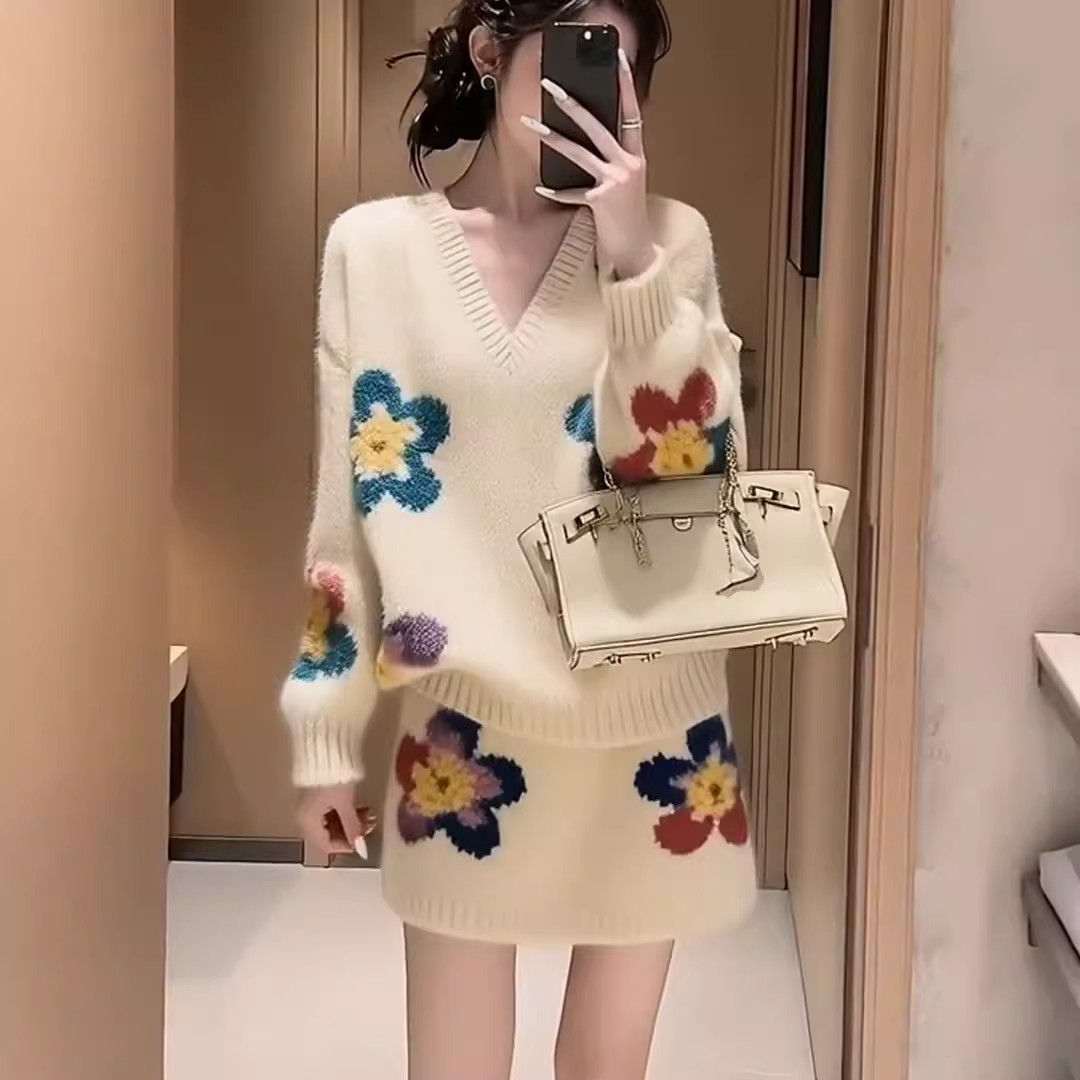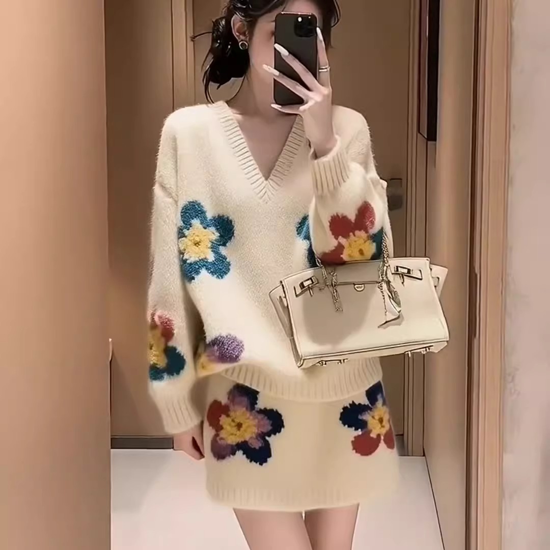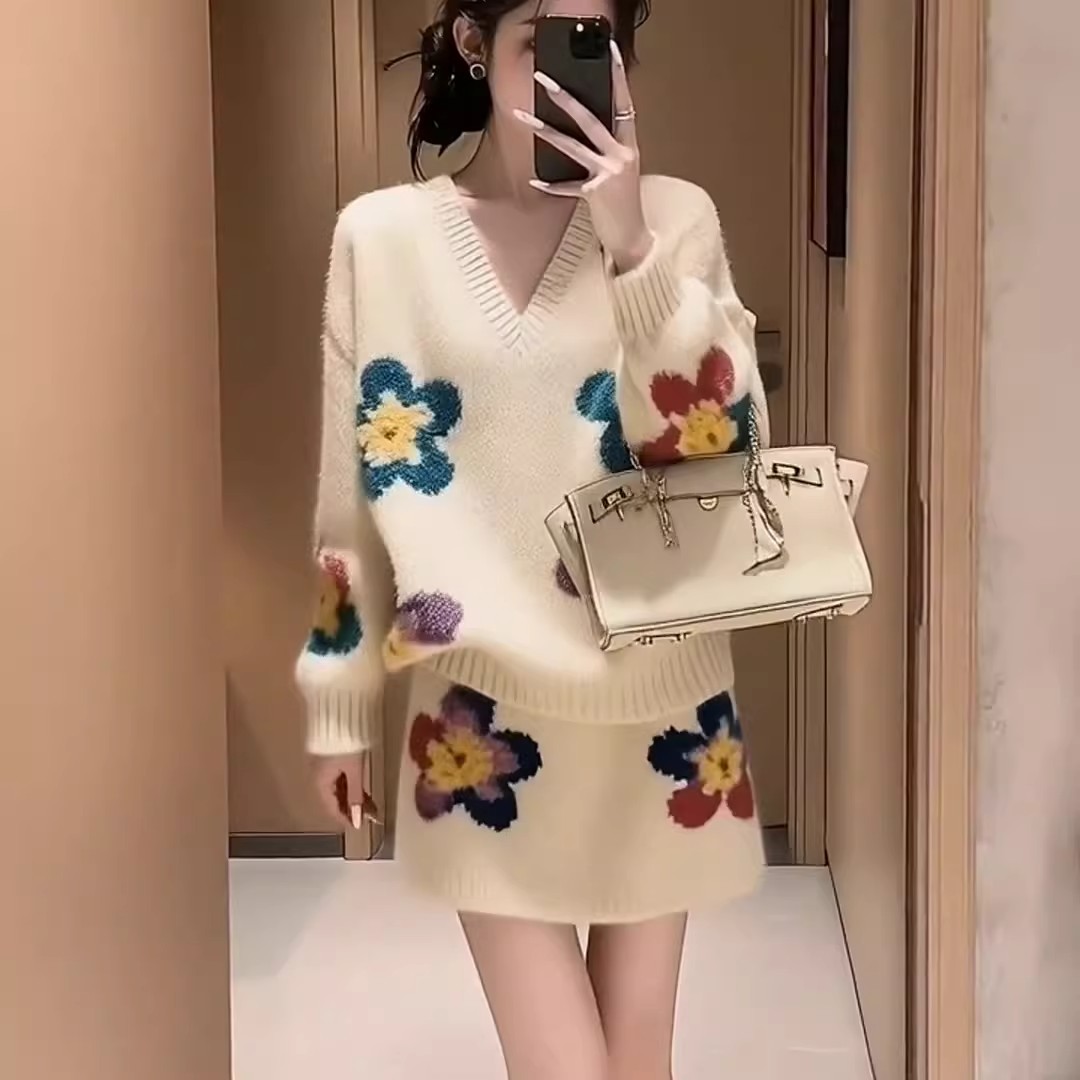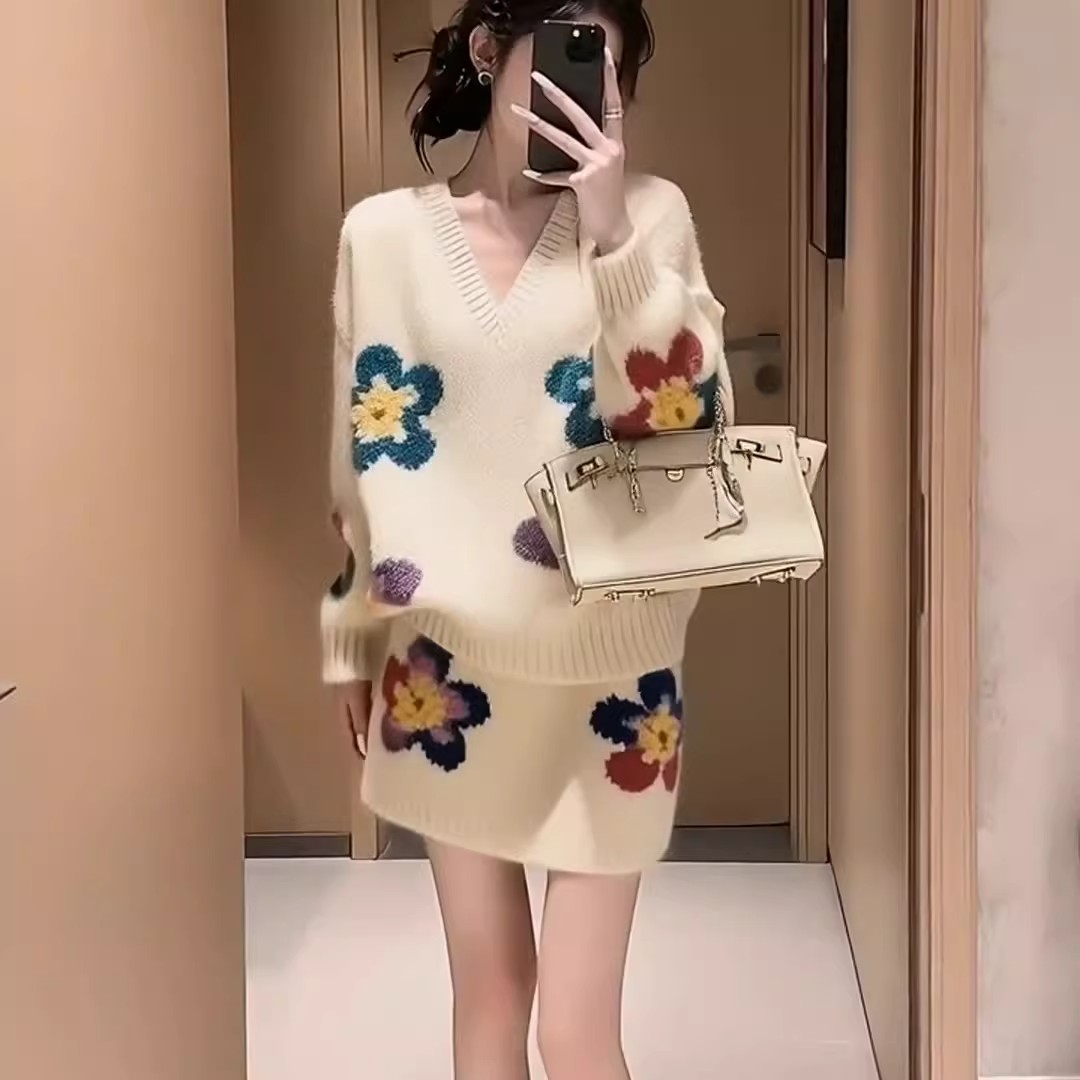 MY16153#搭配一整套装新款气质软糯辣妹花朵V领毛衣短裙高级女装女裝貨源服裝批發