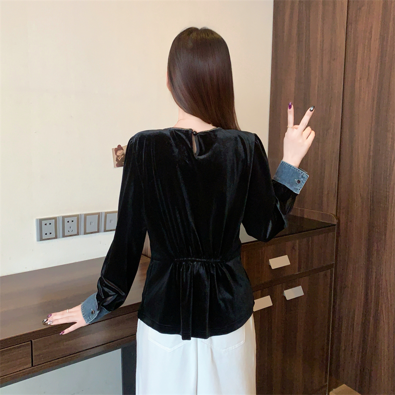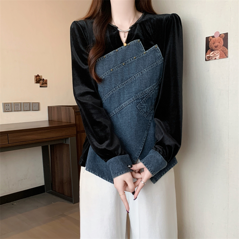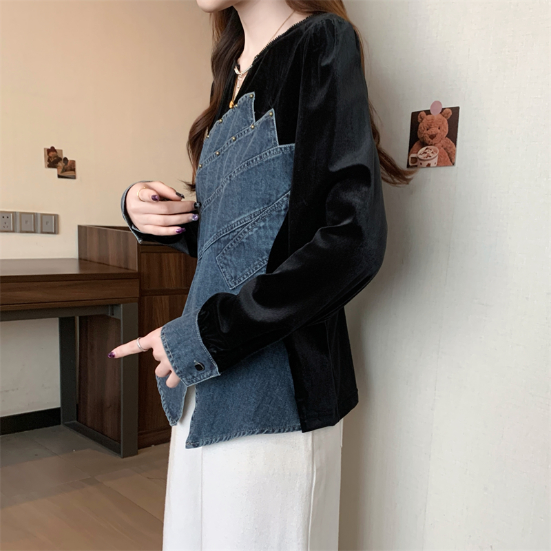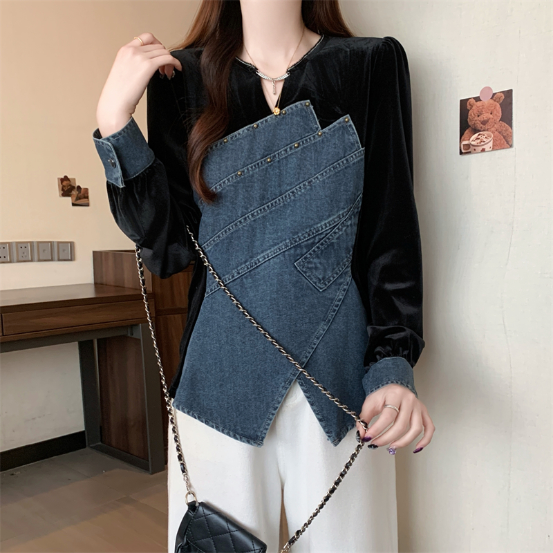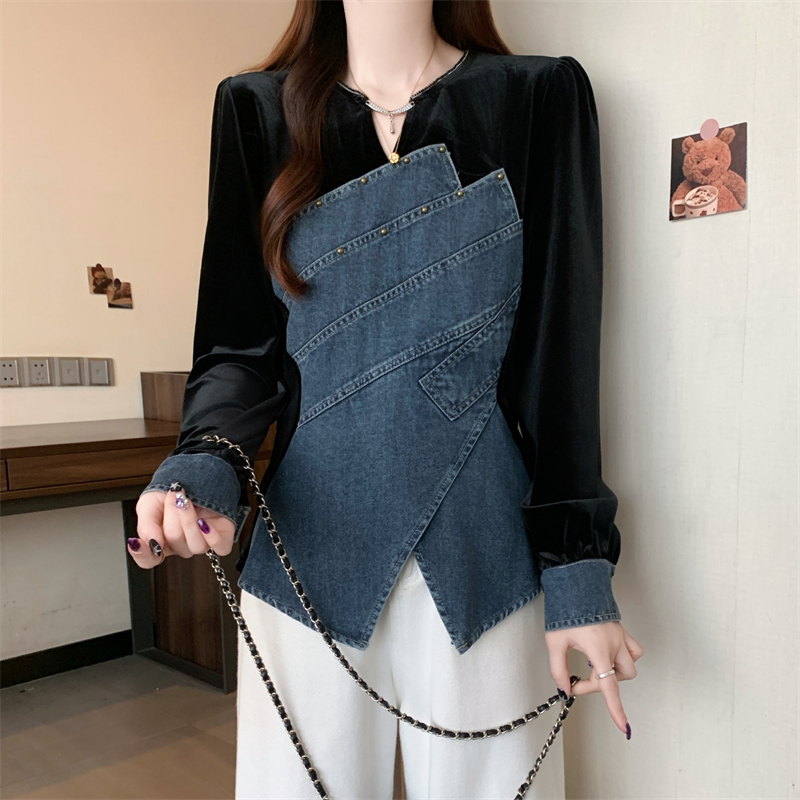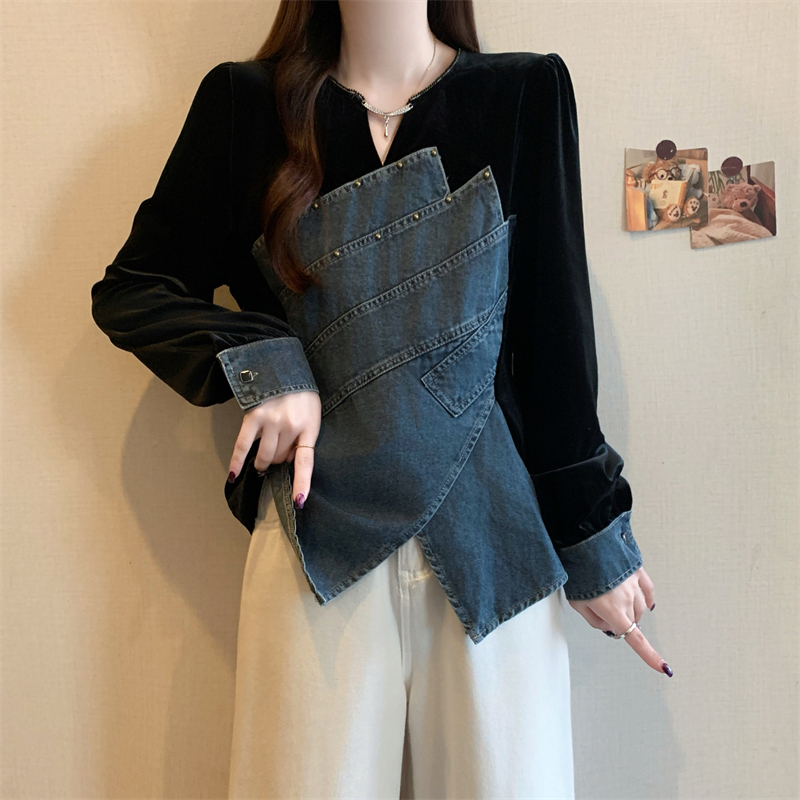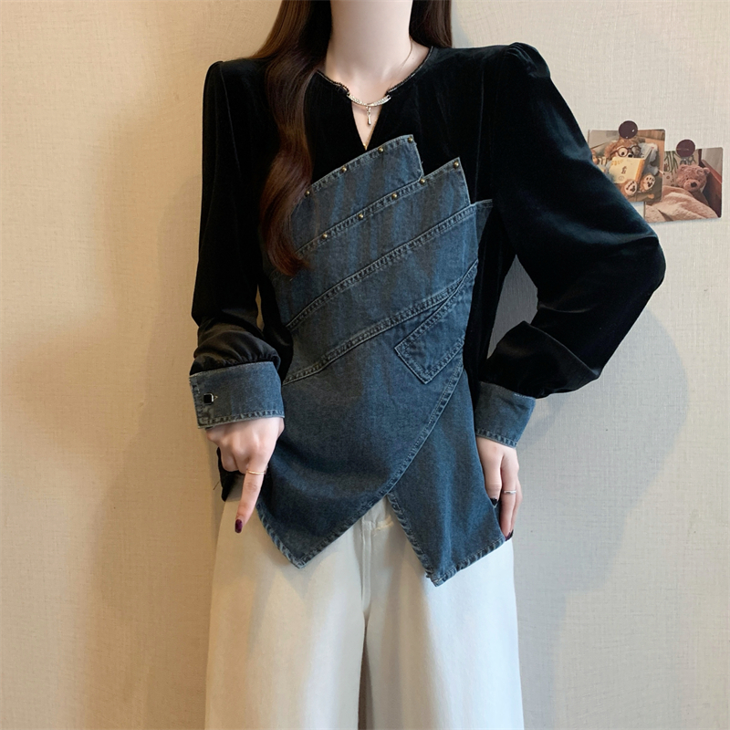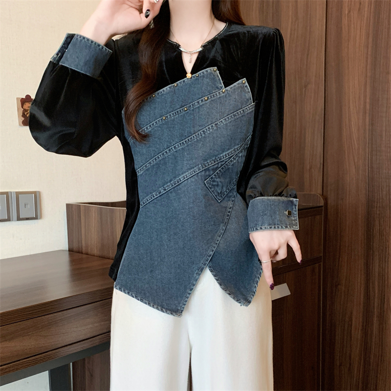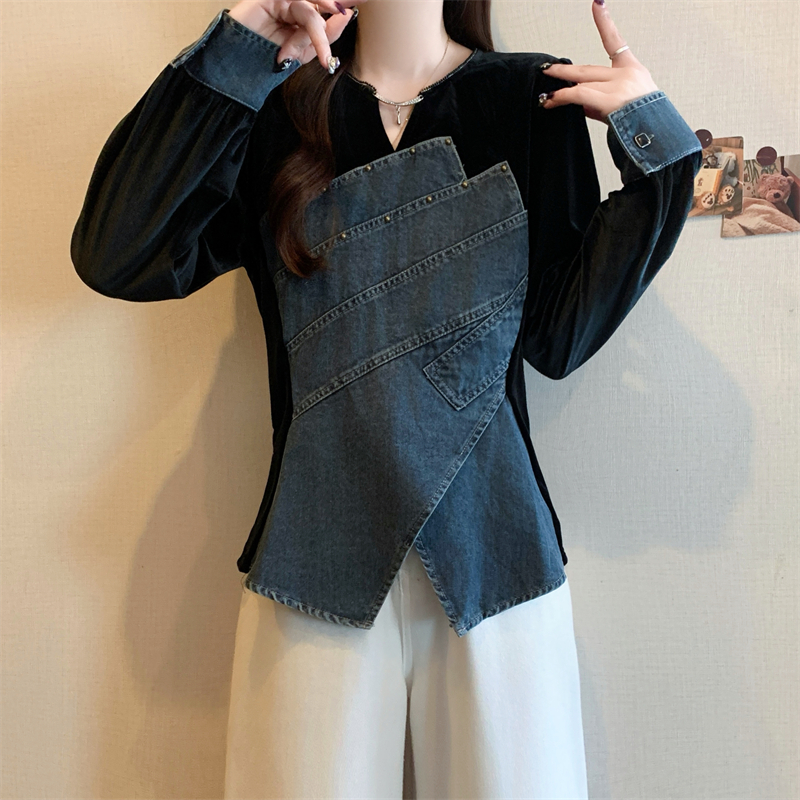 MY16154#胖大码女装时尚设计感不规则牛仔拼接上衣百搭女裝貨源服裝批發