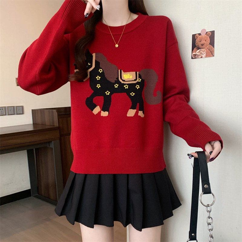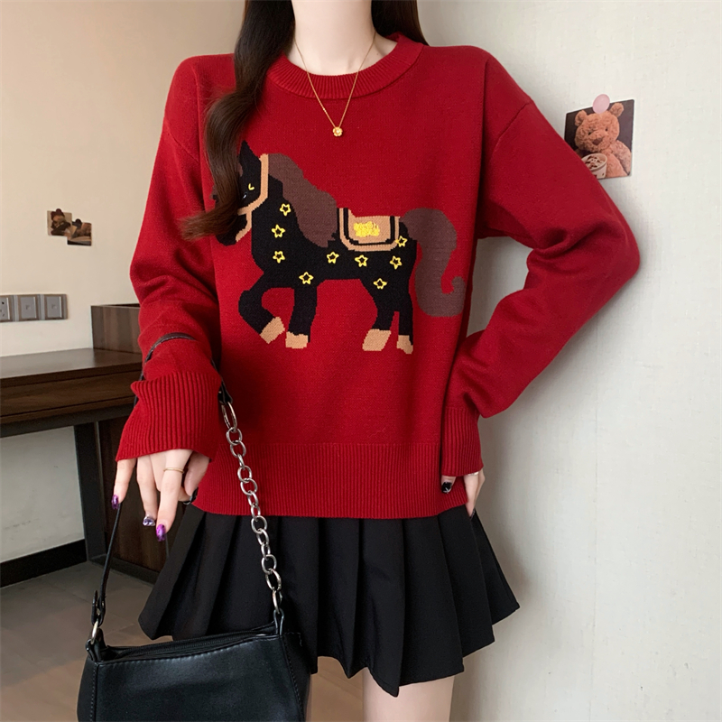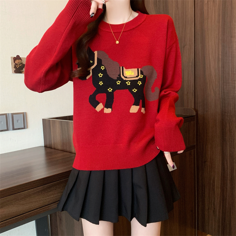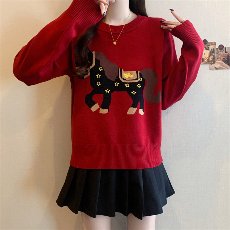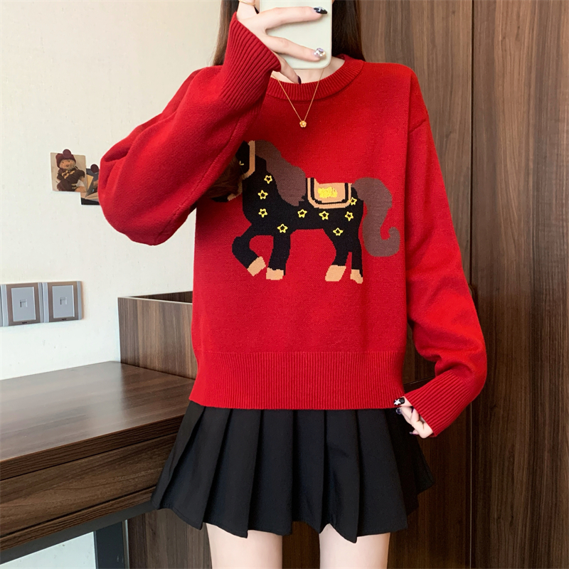 MY16155#本命年红小马提花毛衣圣诞节韩系慵懒风好看显瘦上衣女裝貨源服裝批發