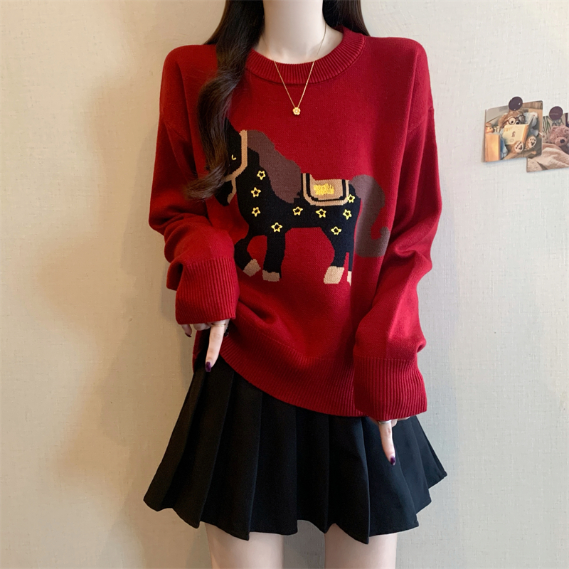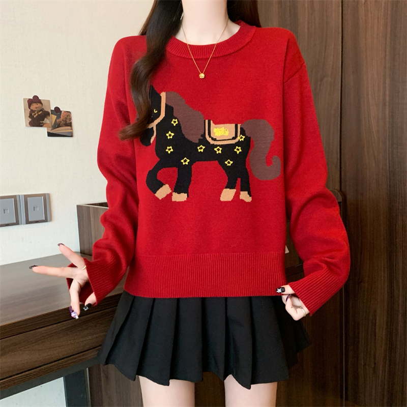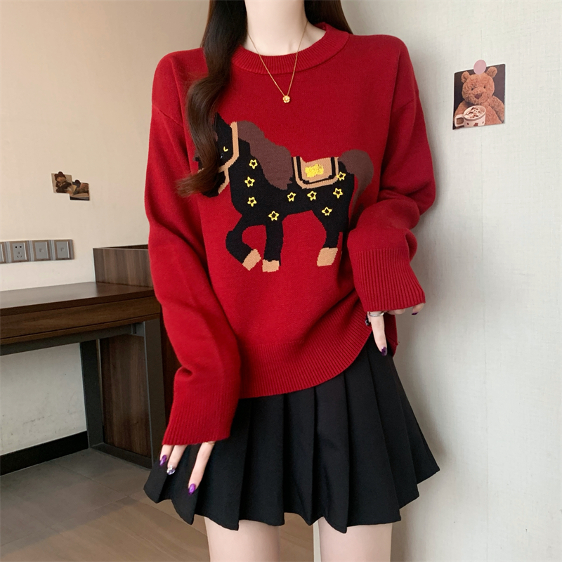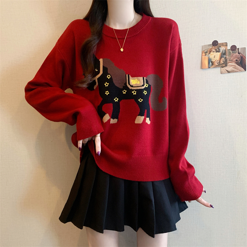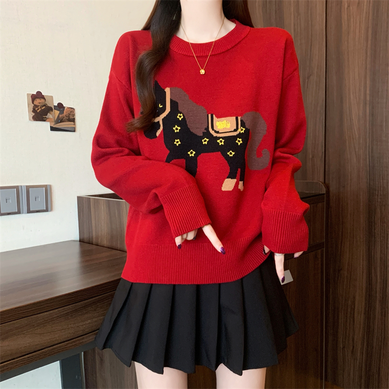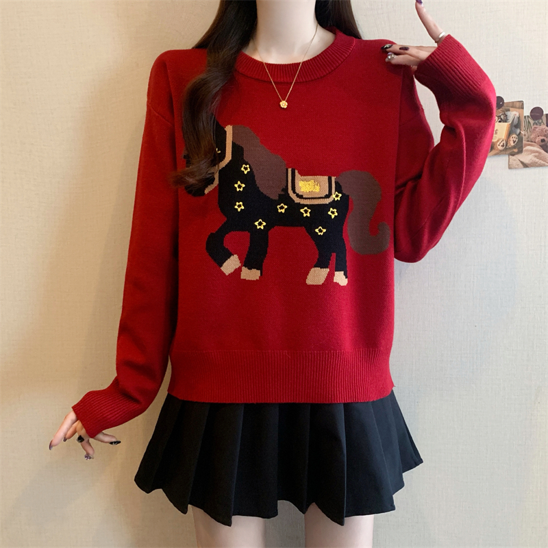 MY16155#本命年红小马提花毛衣圣诞节韩系慵懒风好看显瘦上衣女裝貨源服裝批發