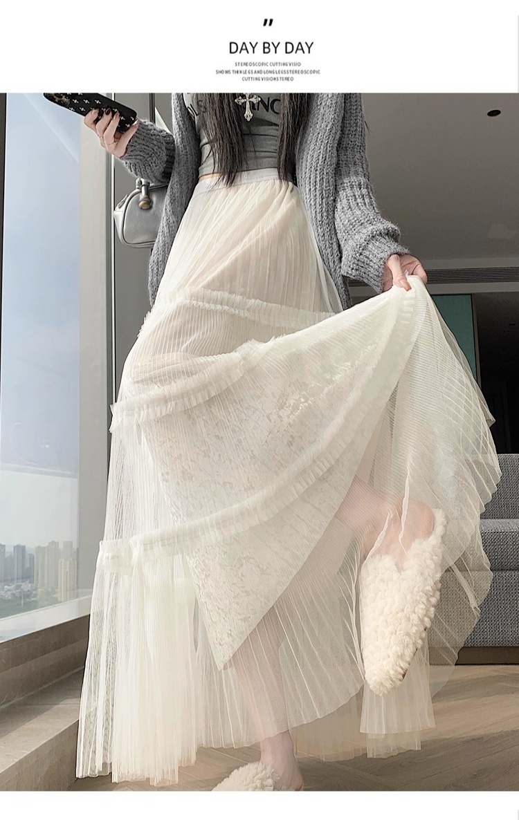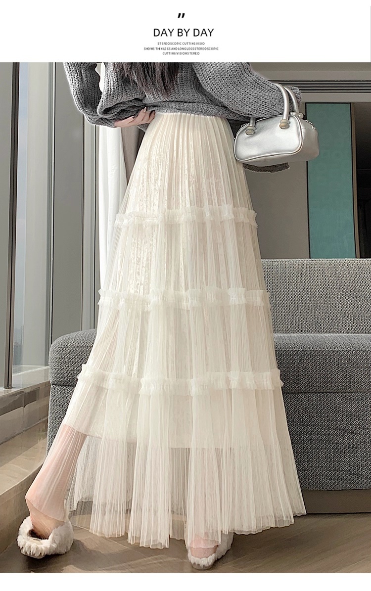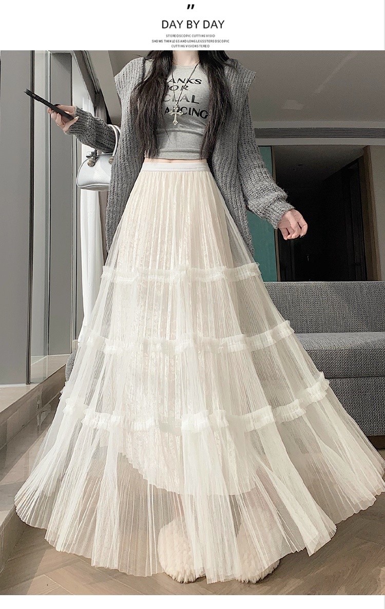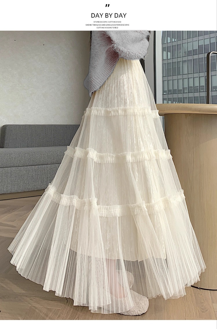 MY16163# 气质减龄大摆网纱蛋糕裙 高腰遮肉显瘦A字百褶裙韩版皱褶花边裙女裝貨源服裝批發