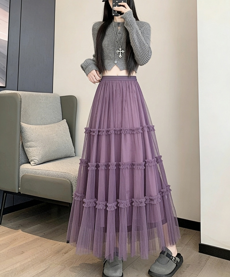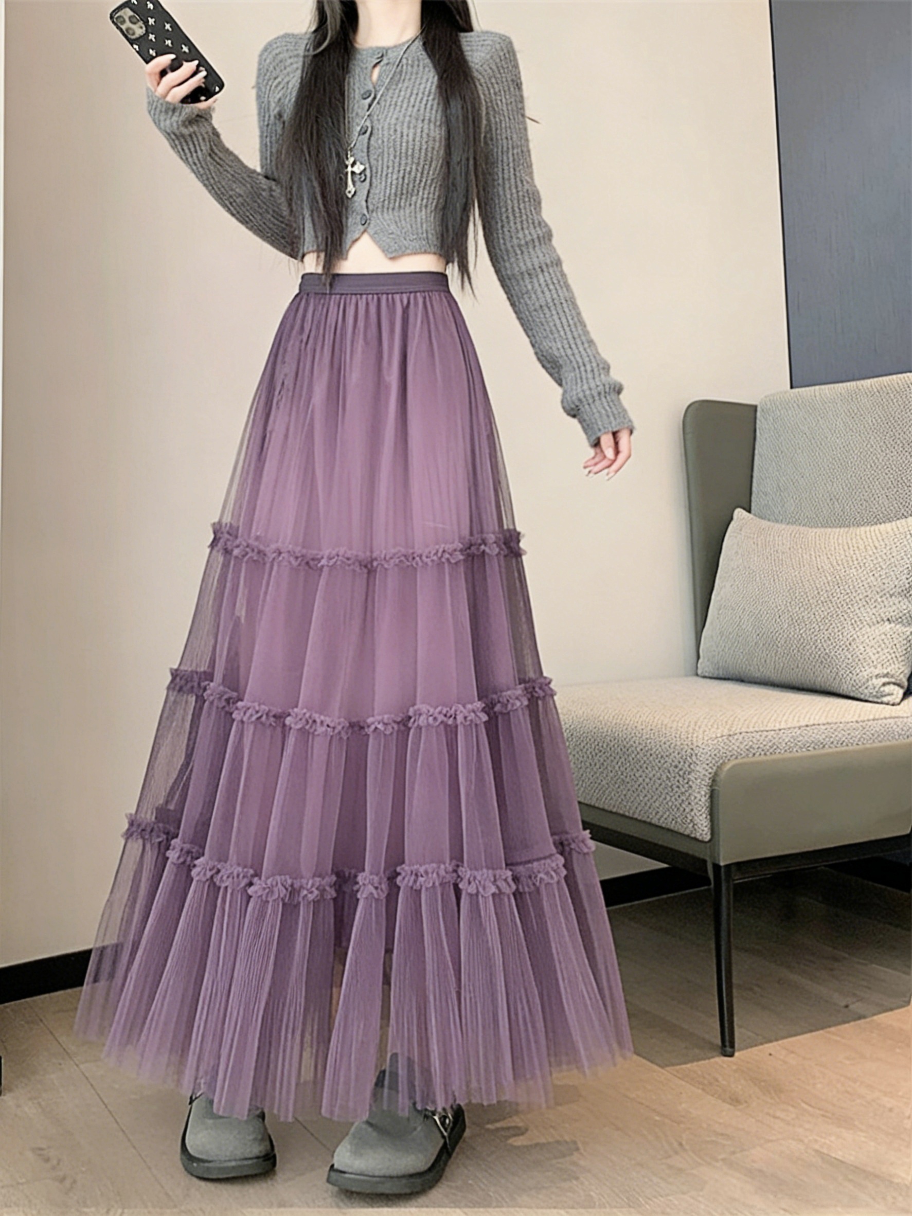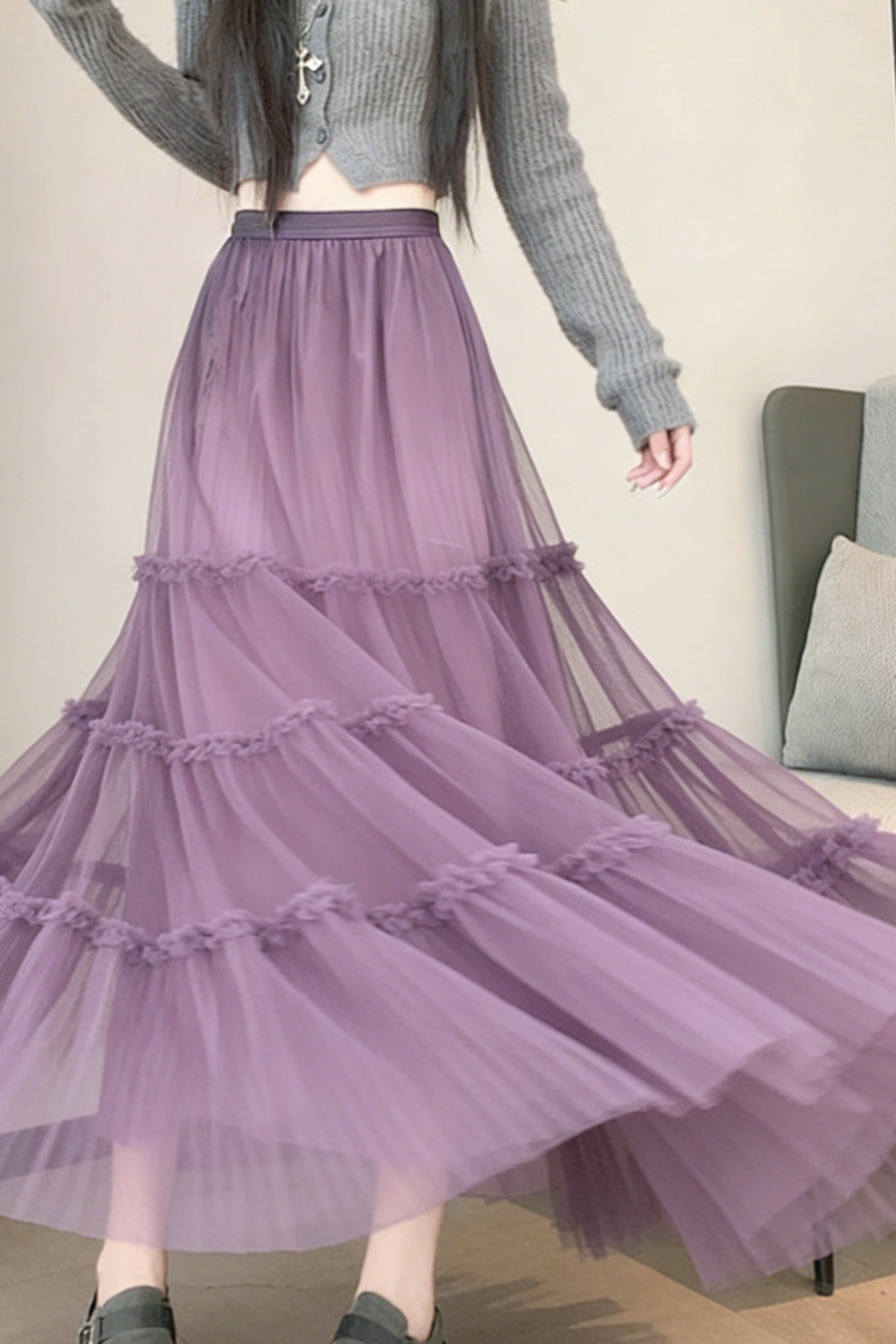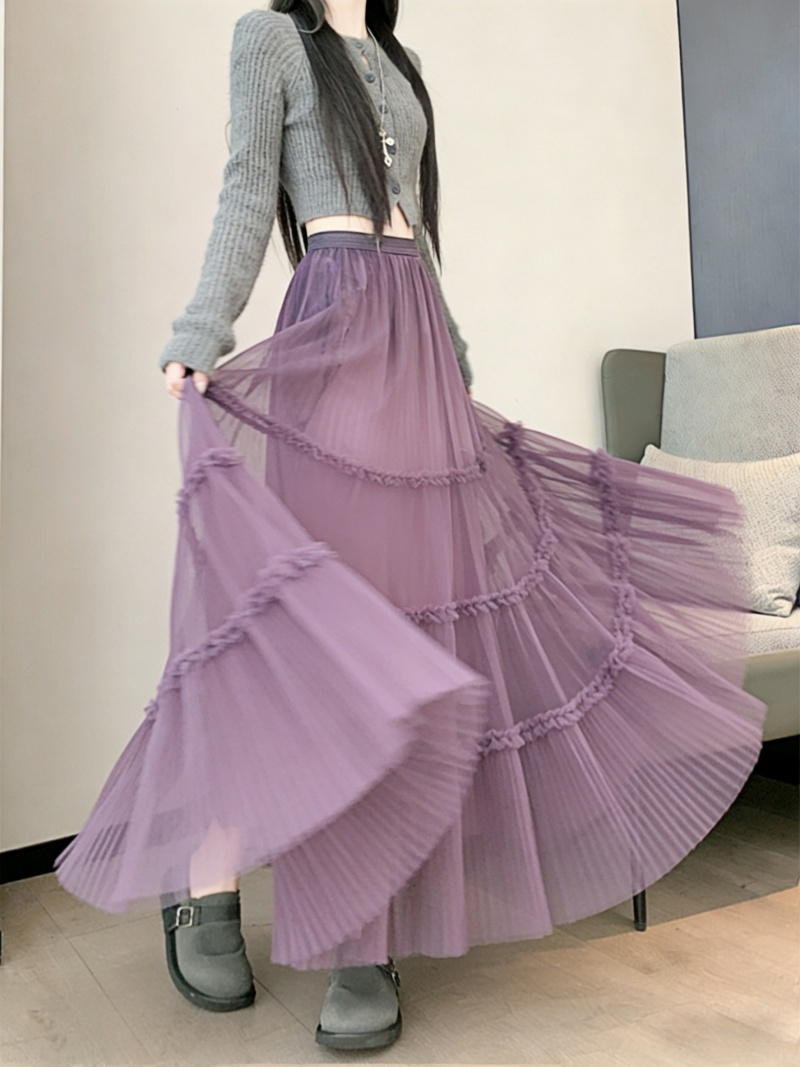 MY16163# 气质减龄大摆网纱蛋糕裙 高腰遮肉显瘦A字百褶裙韩版皱褶花边裙女裝貨源服裝批發