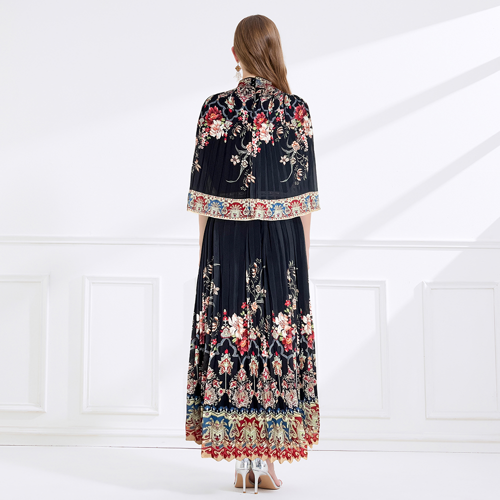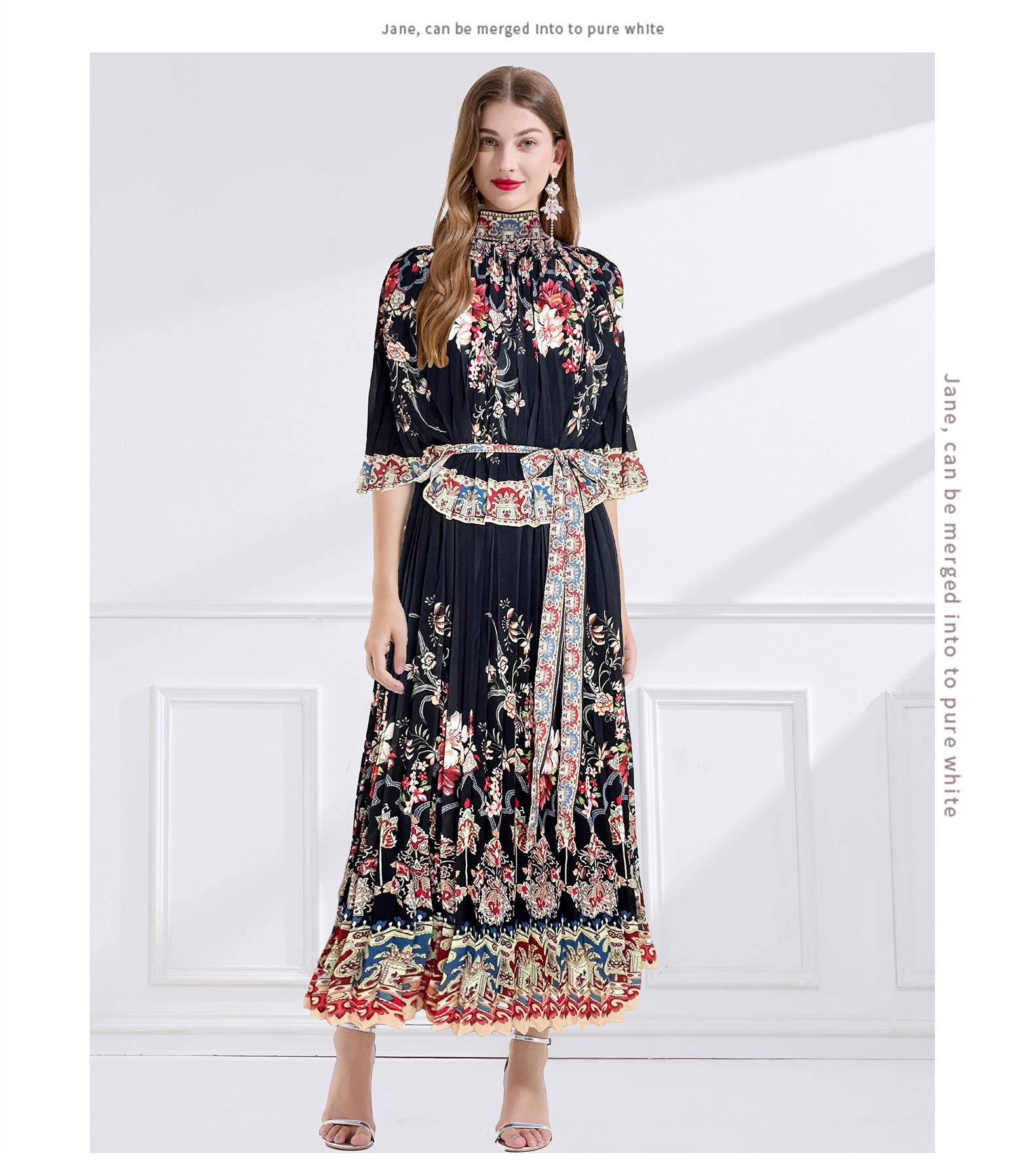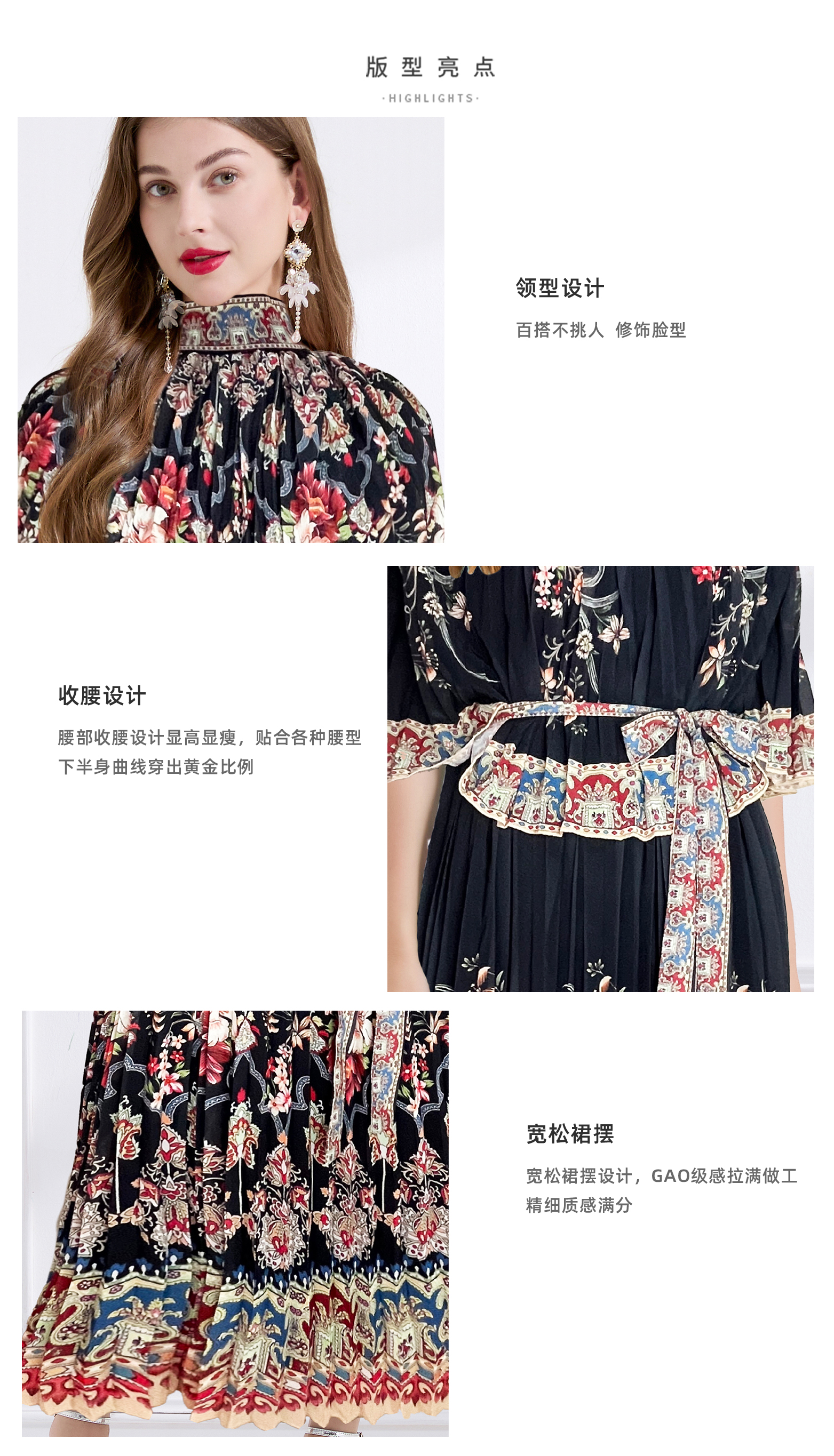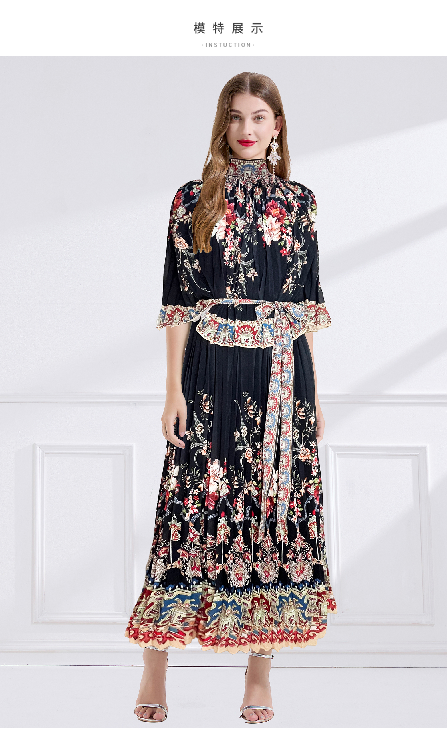 BY9191#度假风夏款雪纺立领印花百褶系带荷叶边长裙
